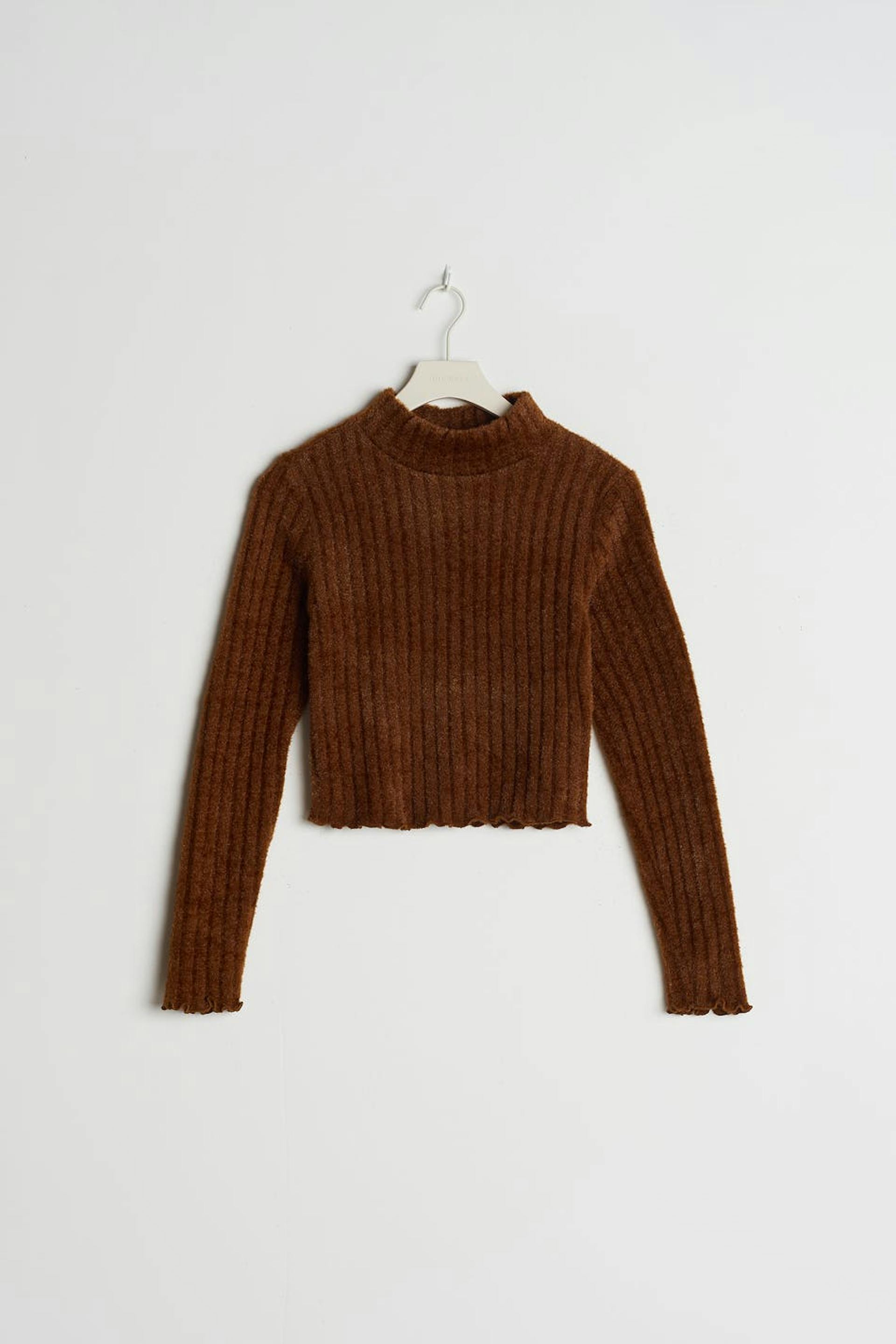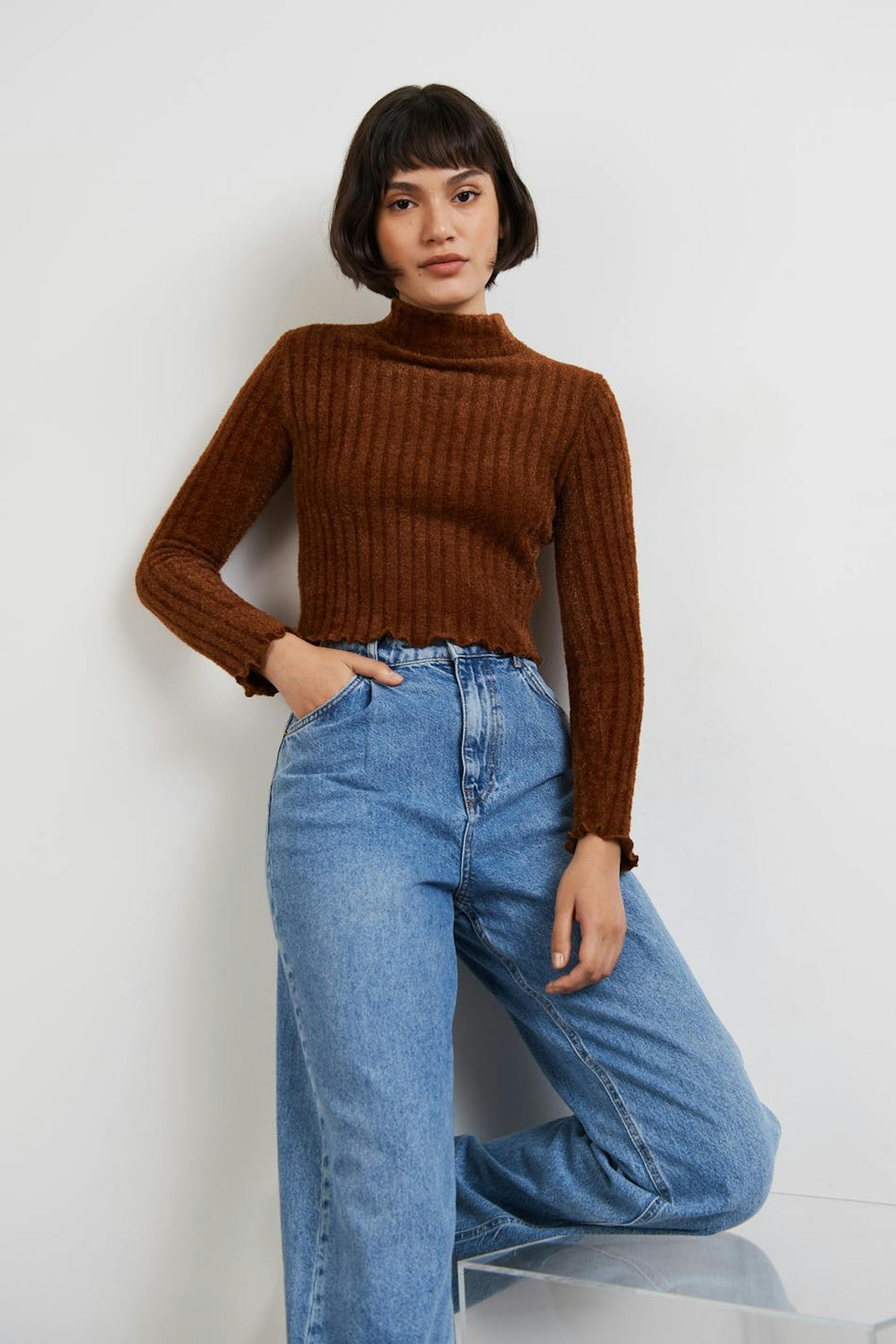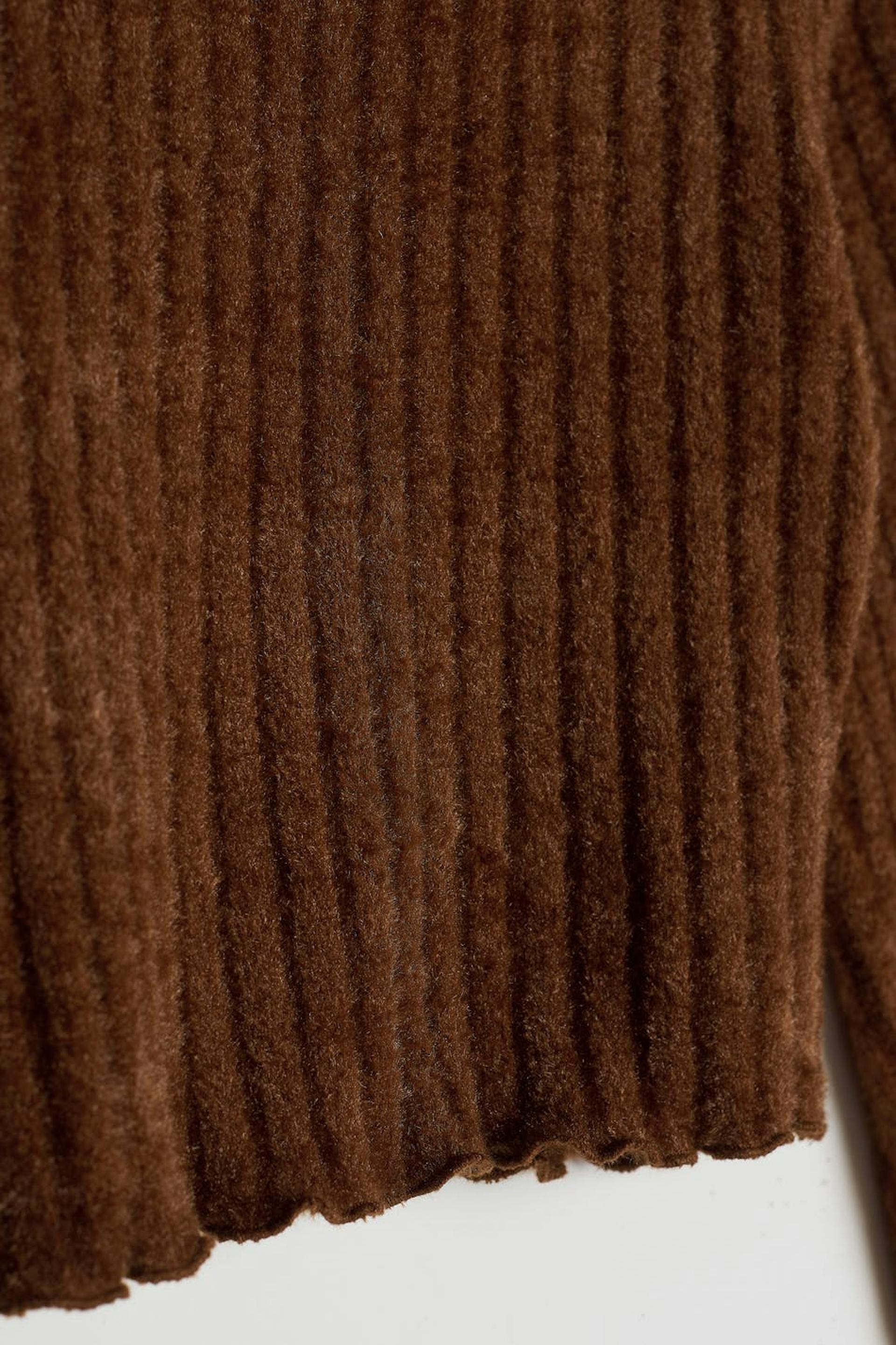 Roll-neck with a regular fit. The jumper is brown and has a soft, ribbed quality. It has a turtleneck, a cropped length and small frills on the sleeve ends and at the bottom hem.
