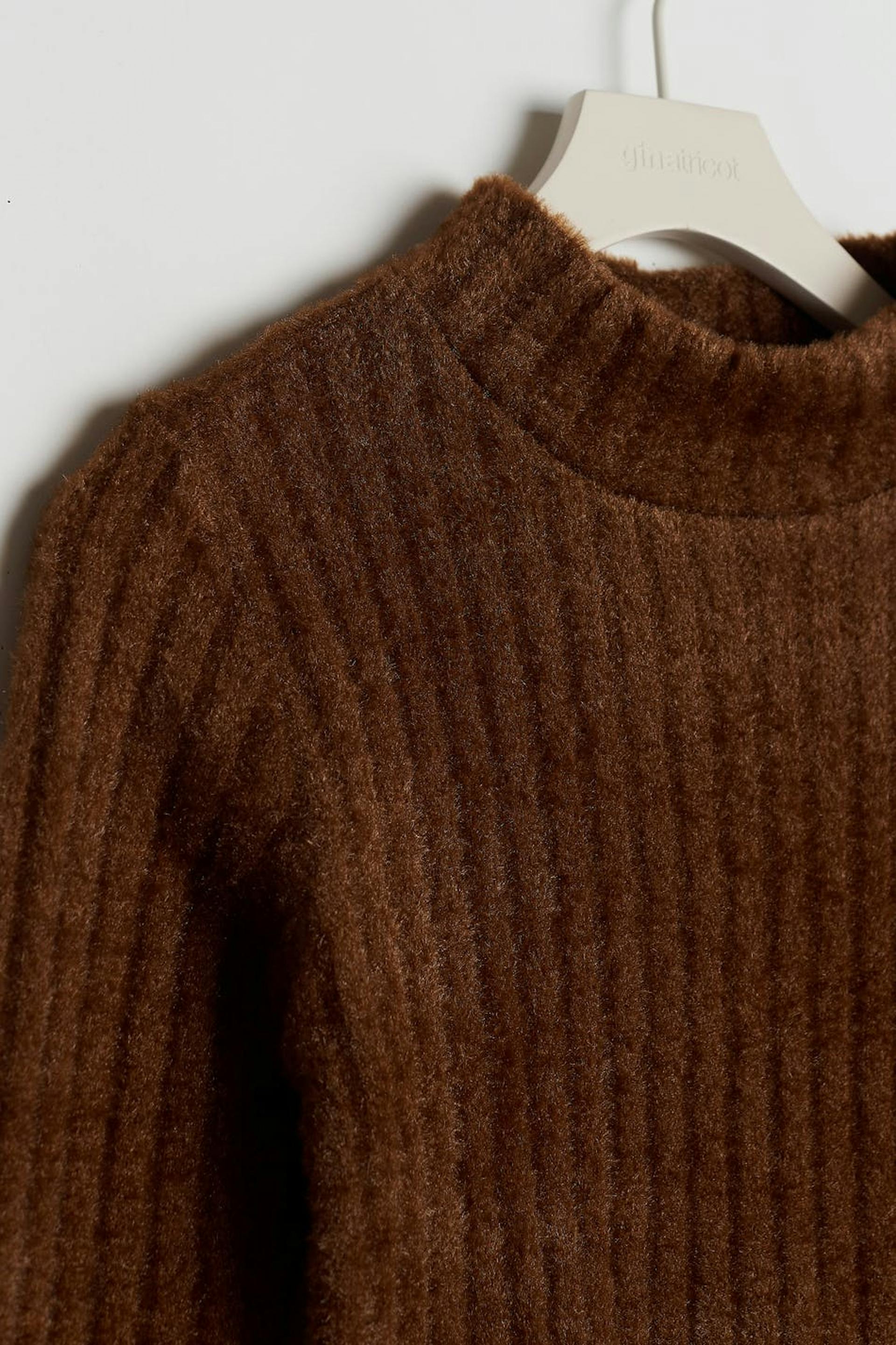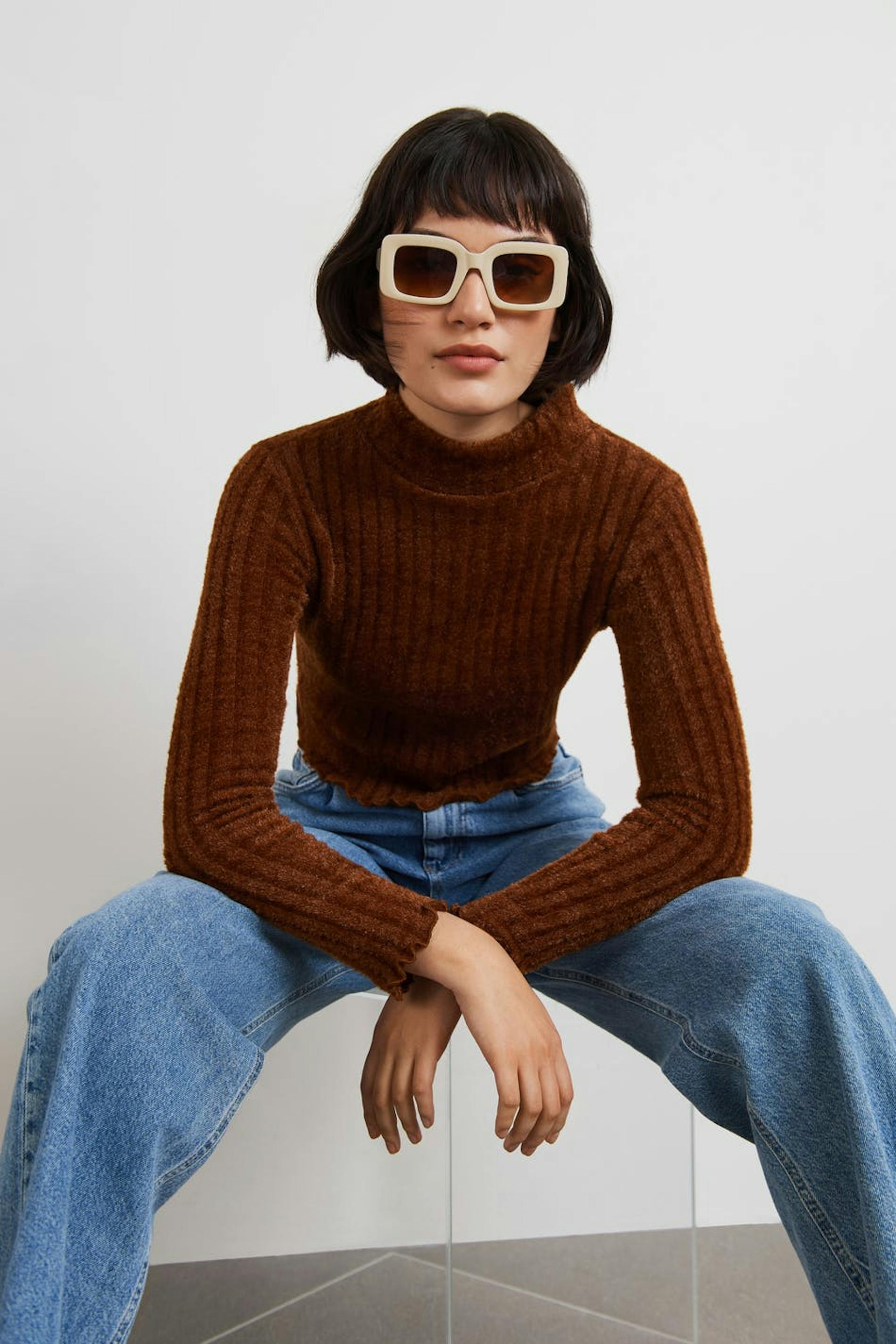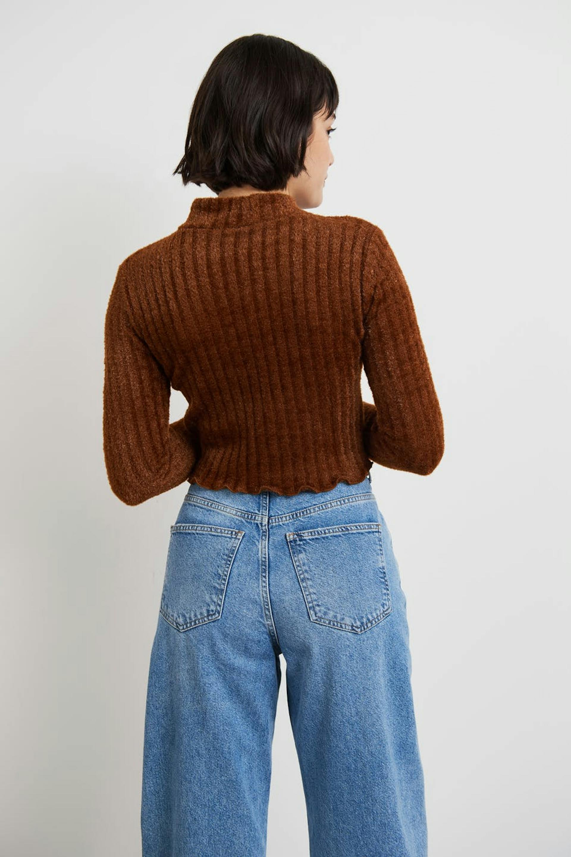 Roll-neck with a regular fit. The jumper is brown and has a soft, ribbed quality. It has a turtleneck, a cropped length and small frills on the sleeve ends and at the bottom hem.