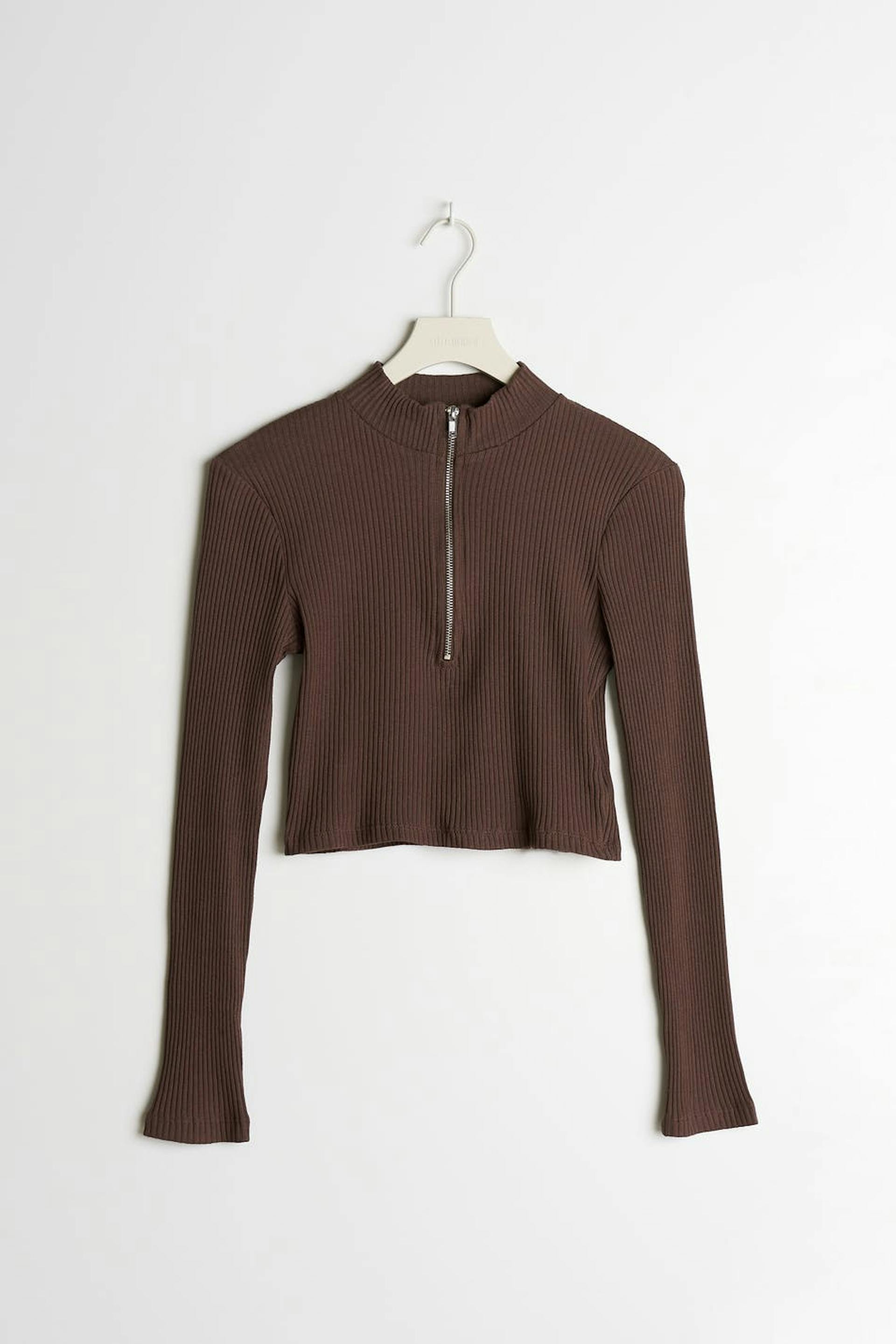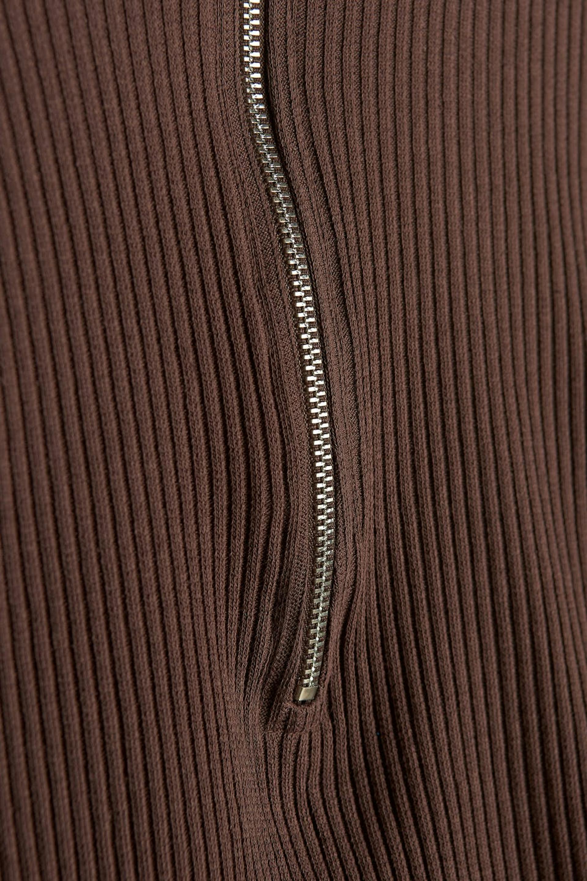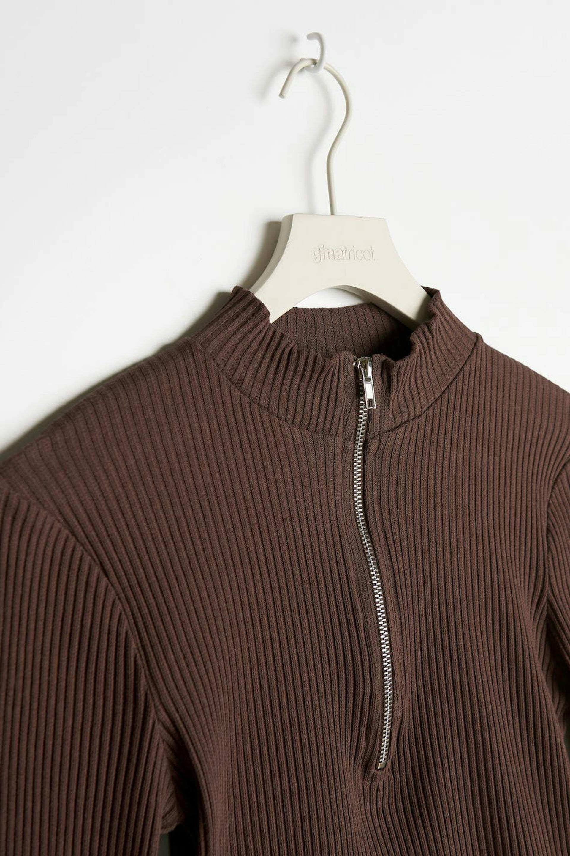 Ribbed roll-neck with fitted fit. The jumper is brown and has a high neck. It has long sleeves and a half-up zip at the top.