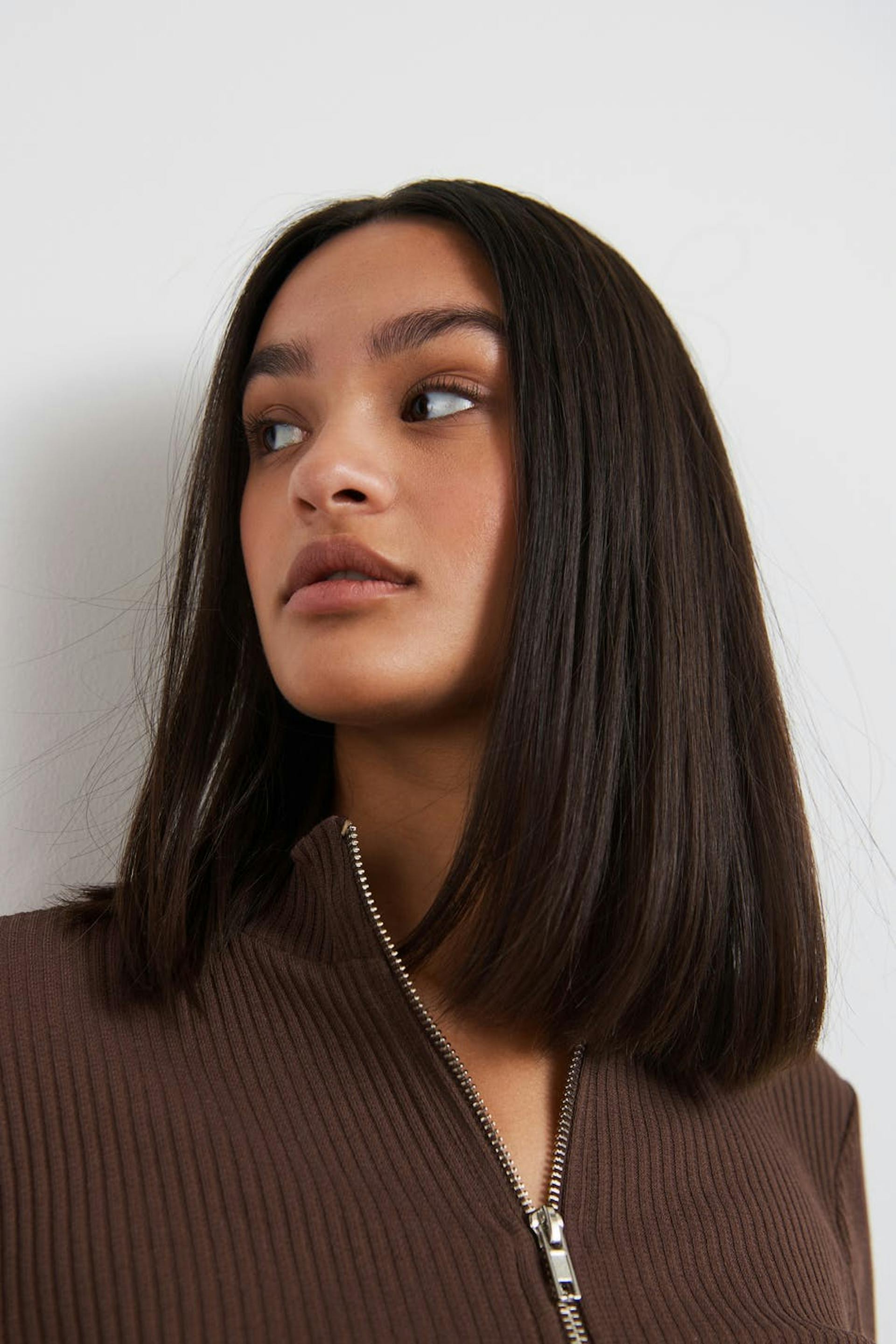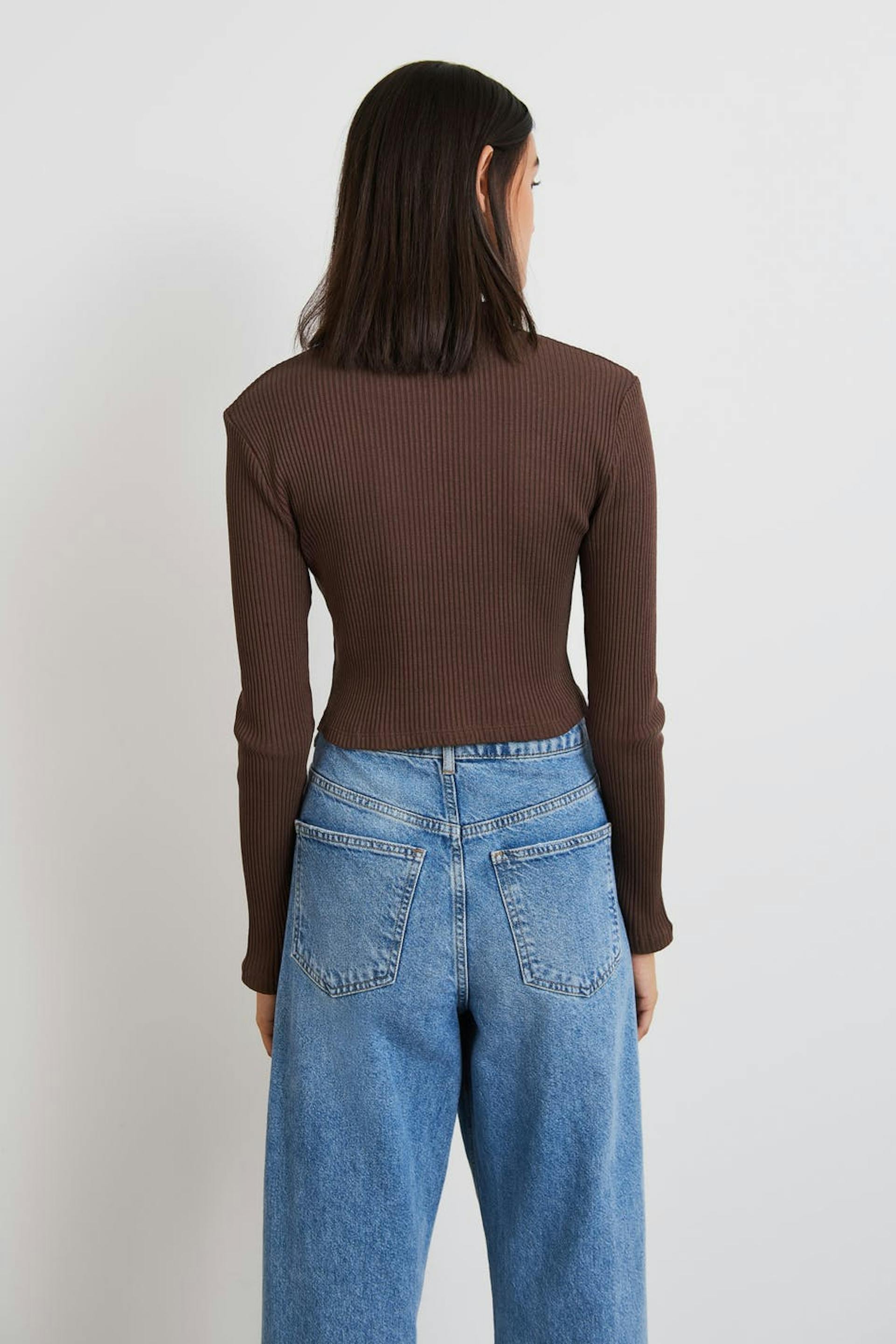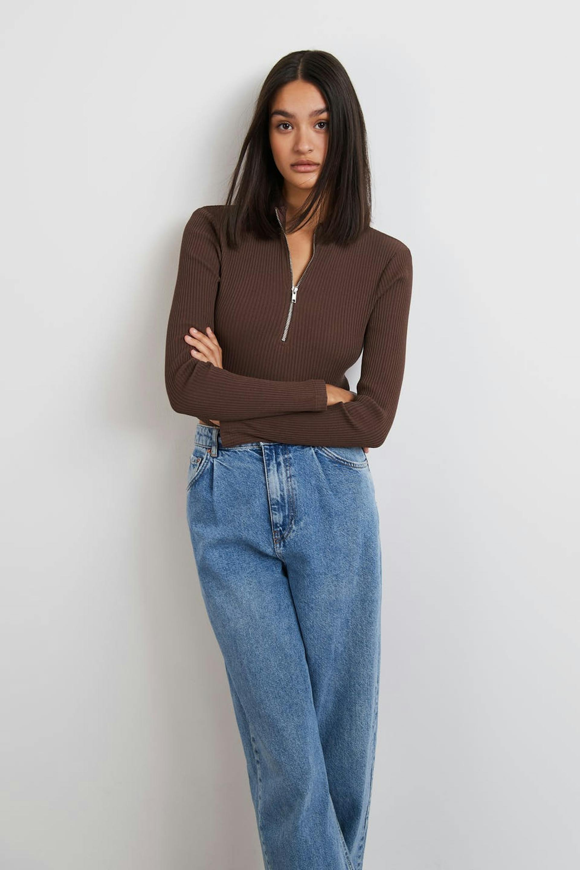Ribbed roll-neck with fitted fit. The jumper is brown and has a high neck. It has long sleeves and a half-up zip at the top.