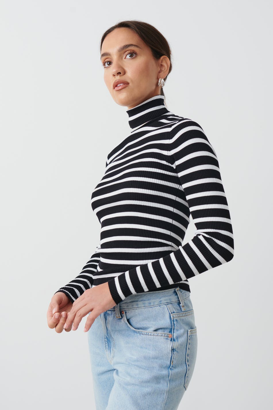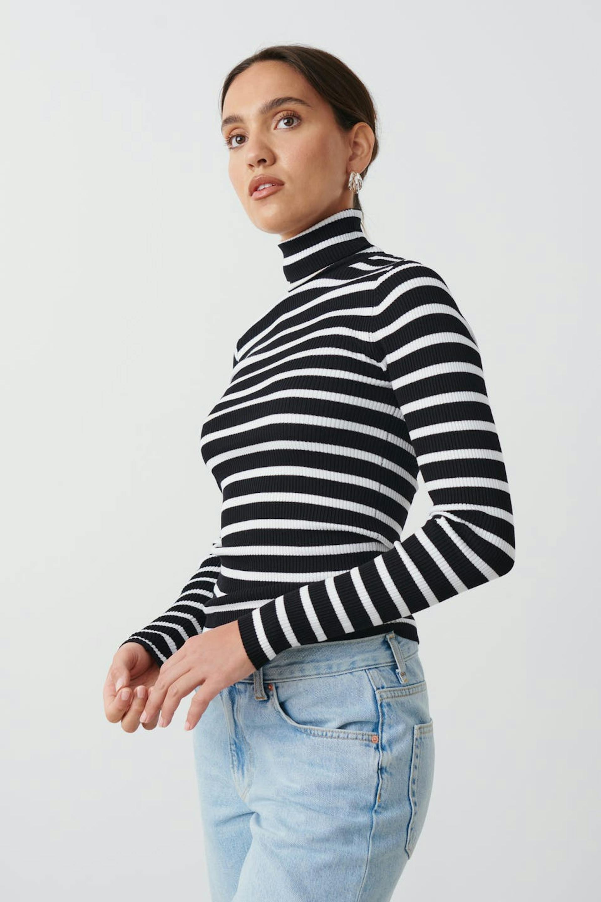 Striped top with turtleneck. The top is black, white and knitted. It has figure-hugging fit, long sleeve and ribbed quality.