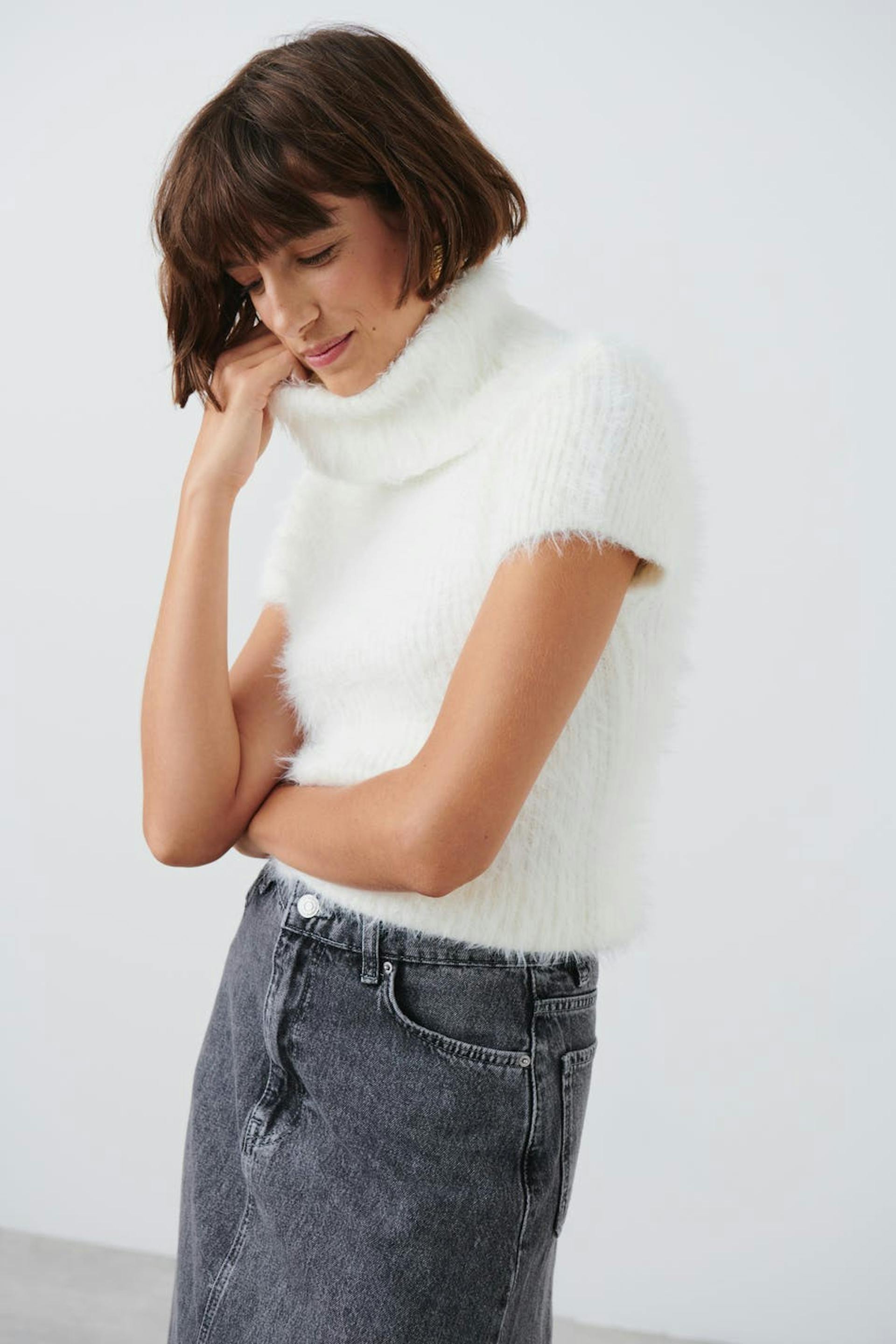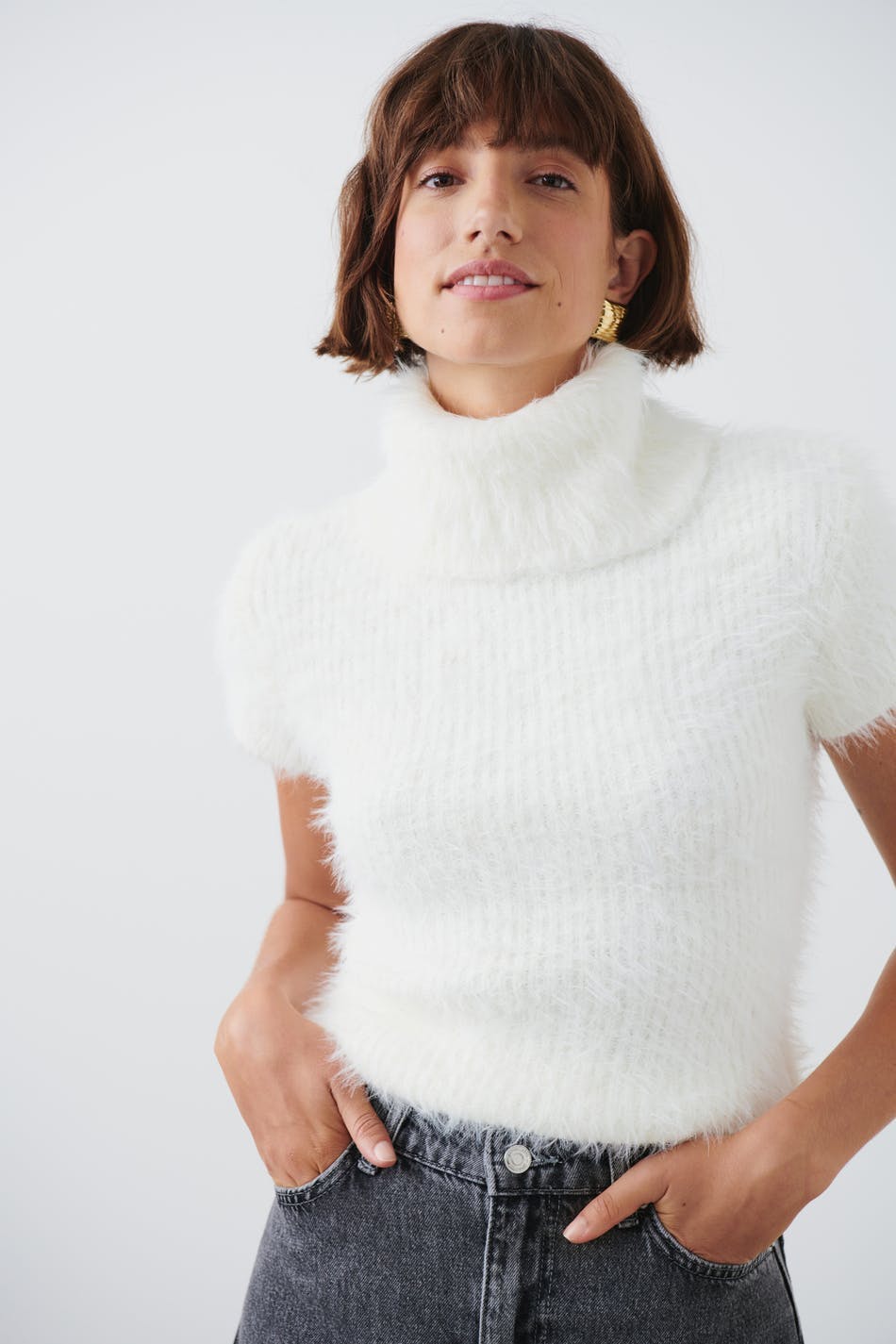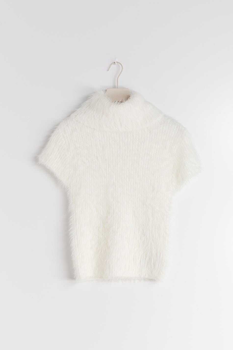 Short-sleeved turtleneck top with fluffy quality. The top is white and has high collar.