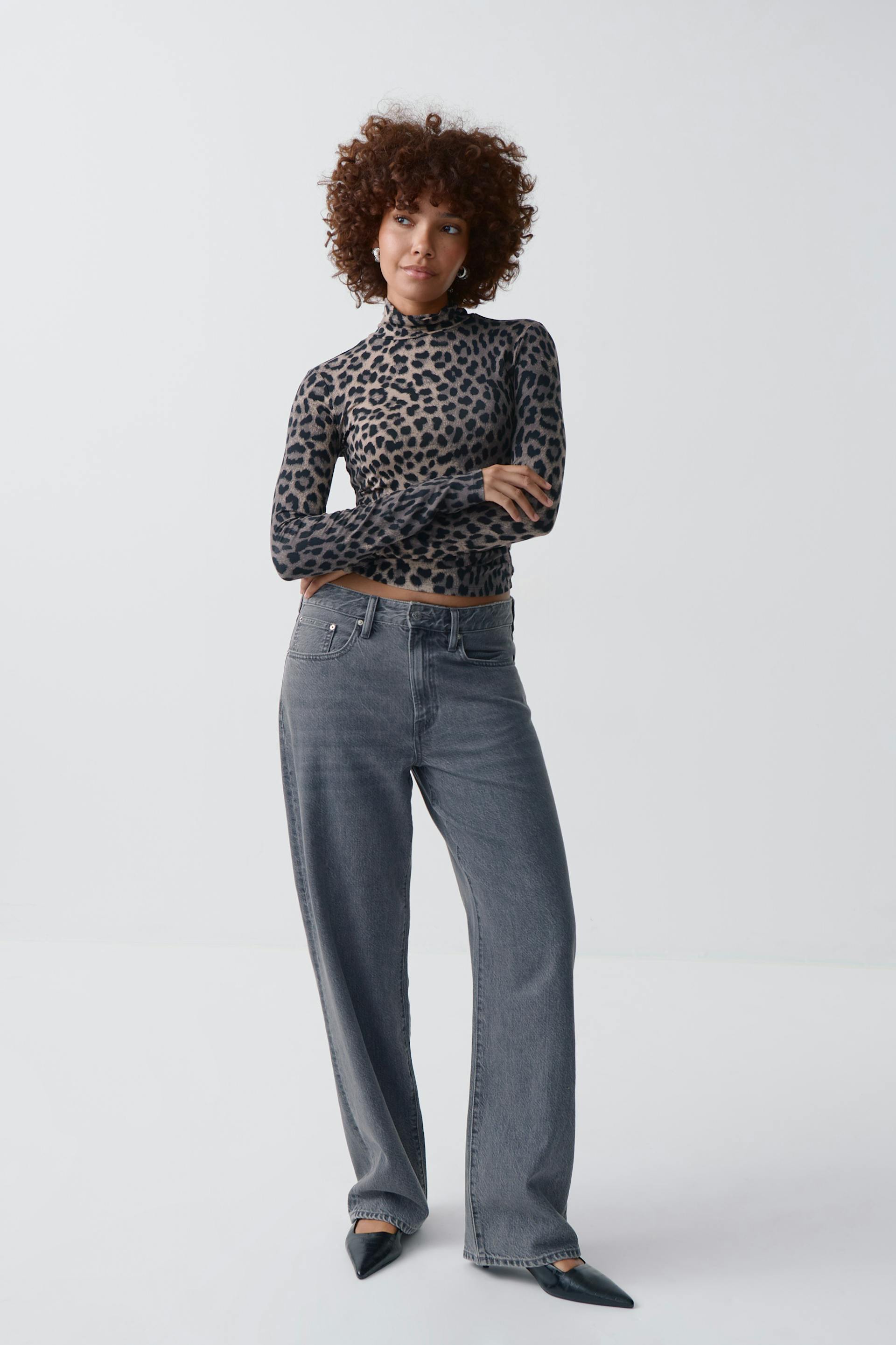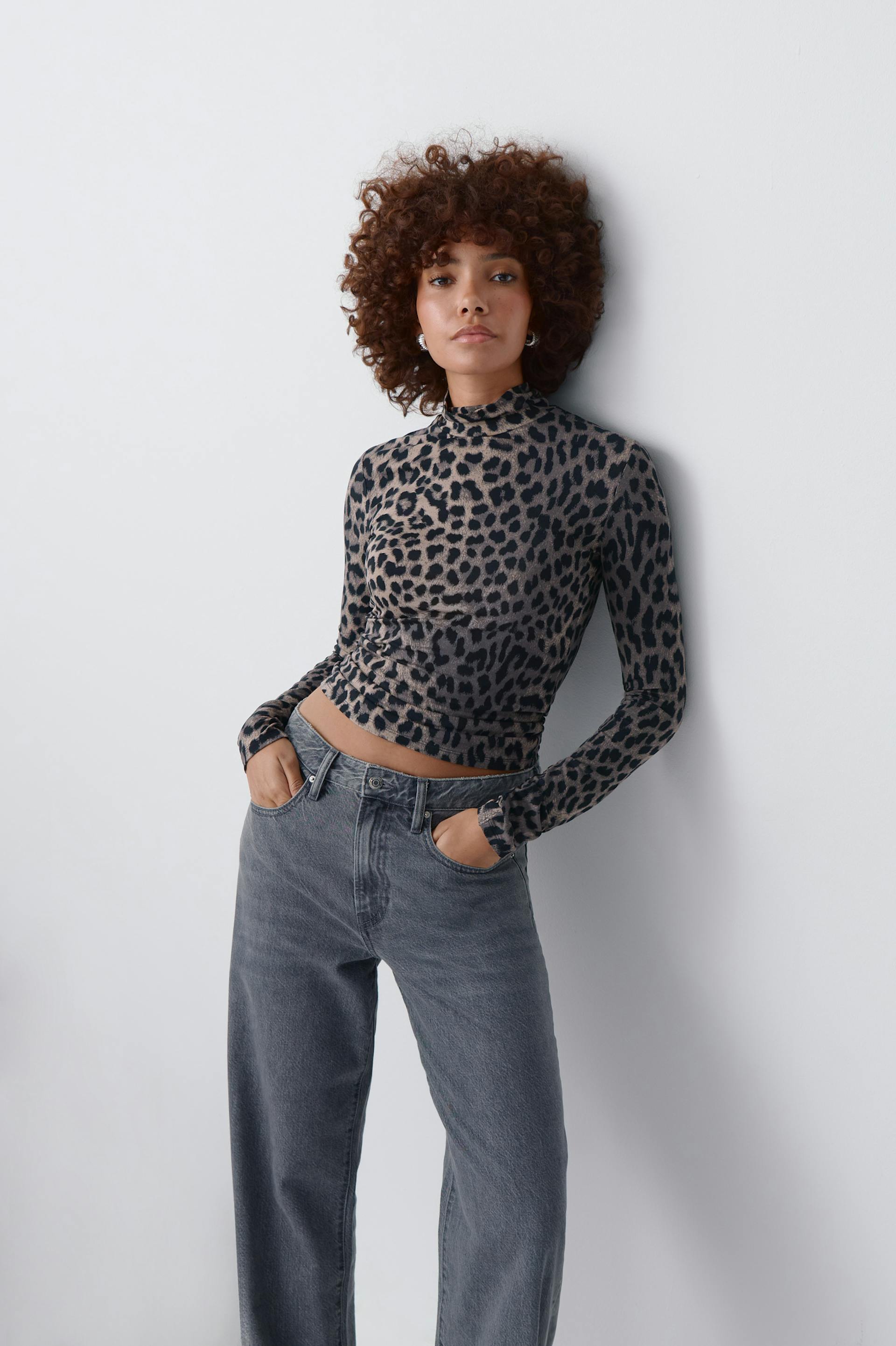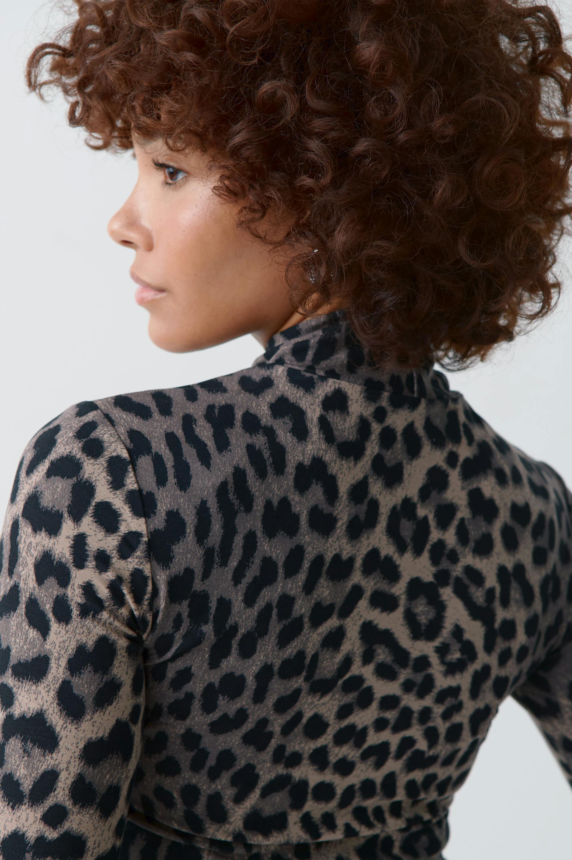 Leopard patterned turtleneck top in soft viscose with figure-hugging fit. The top is brown and long-sleeved and has high neck.
