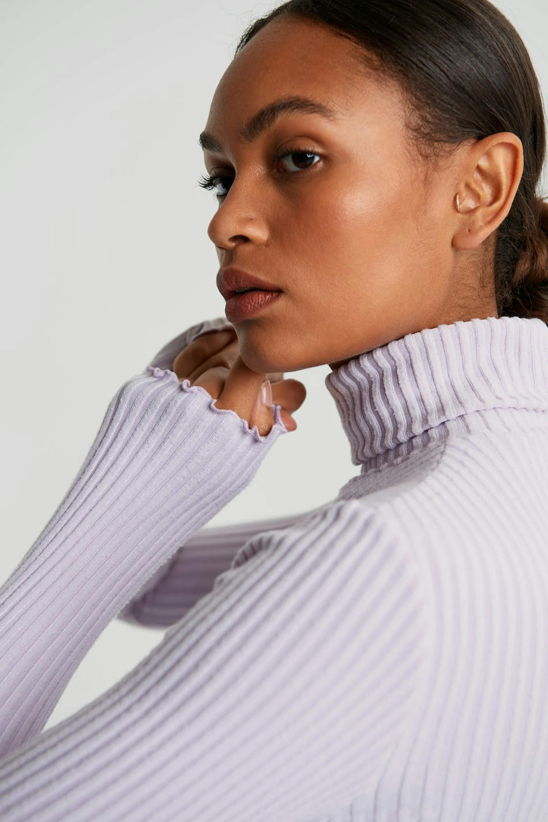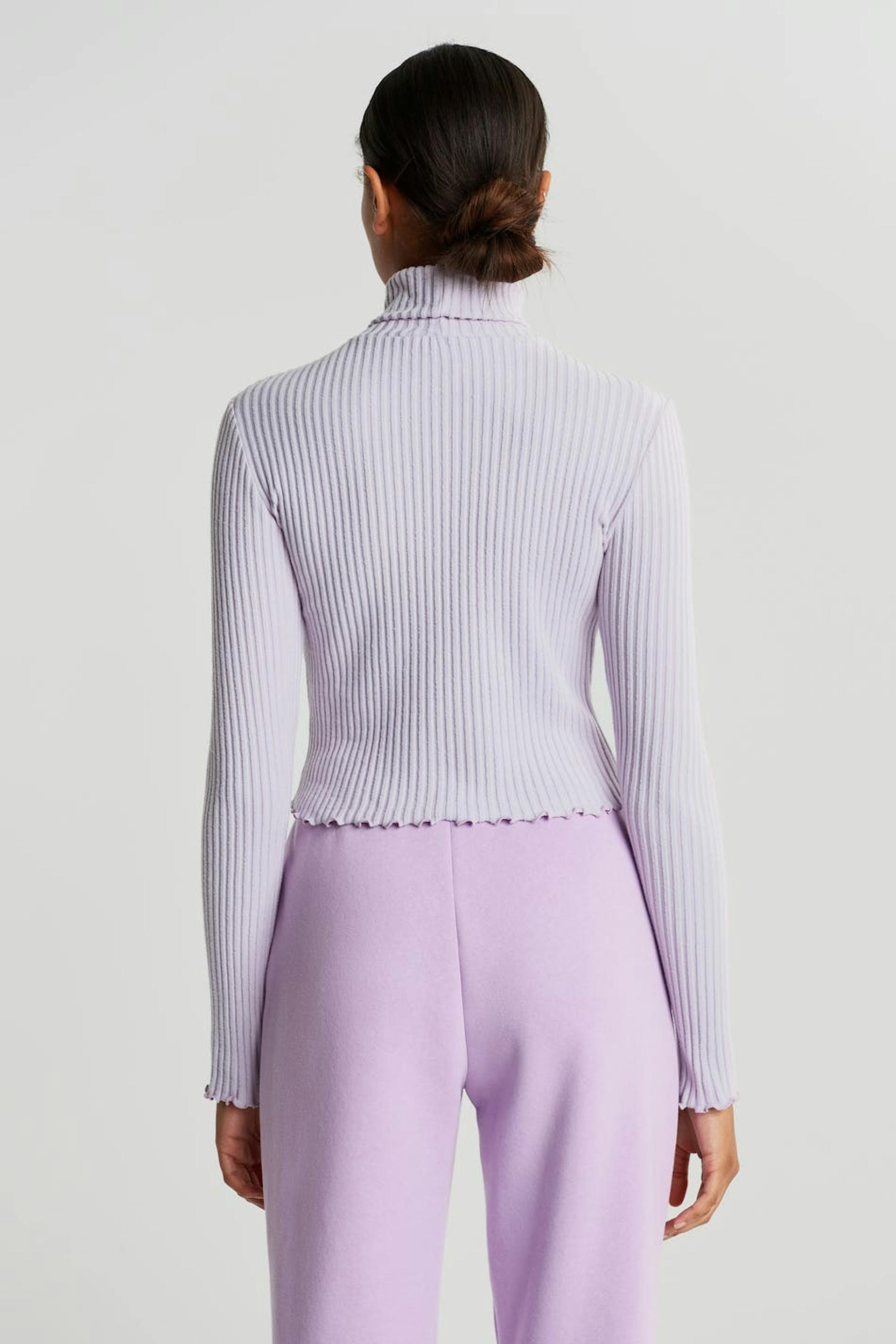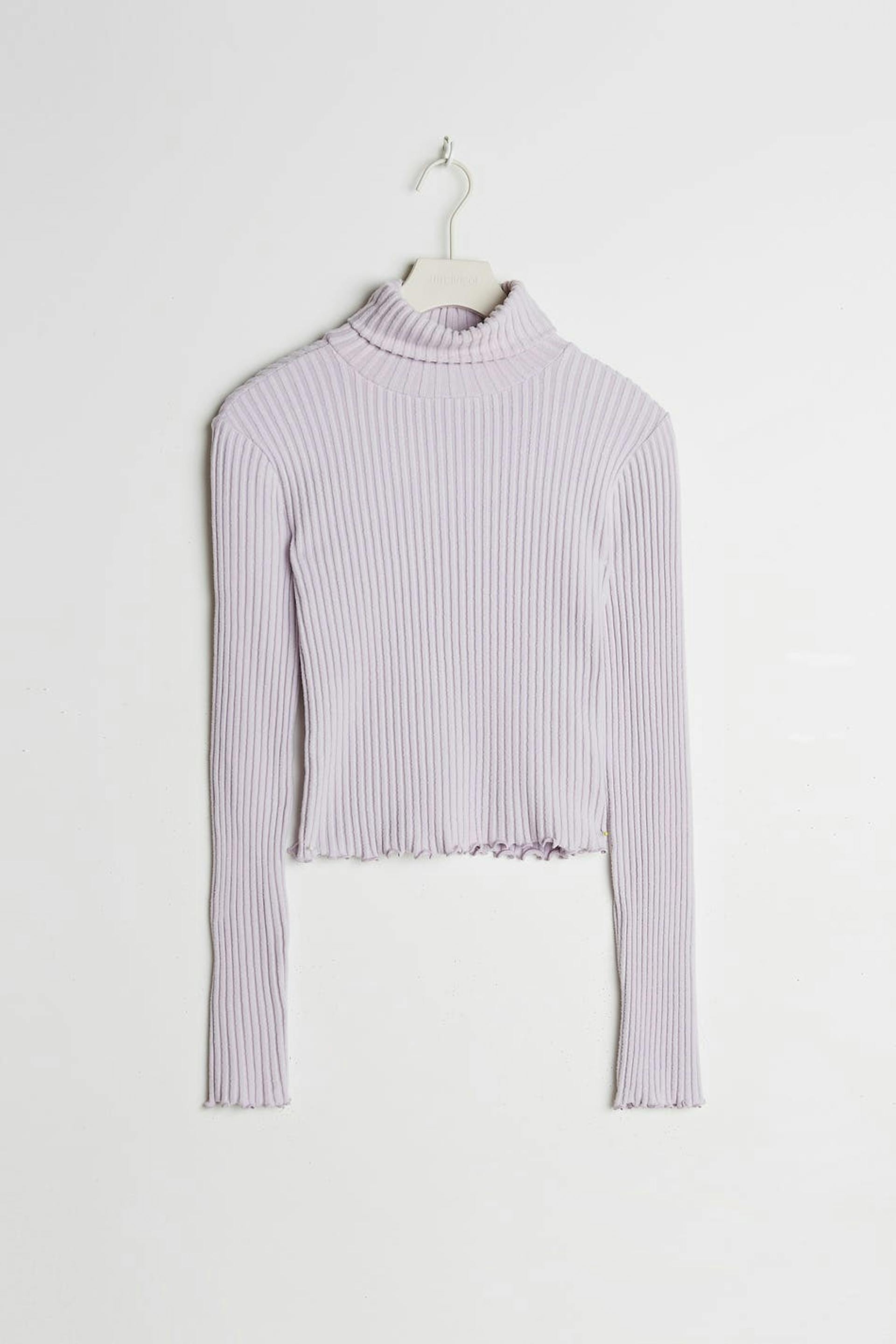 Soft roll-neck with a regular fit. The jumper is purple, short and ribbed. It has a fitted fit.