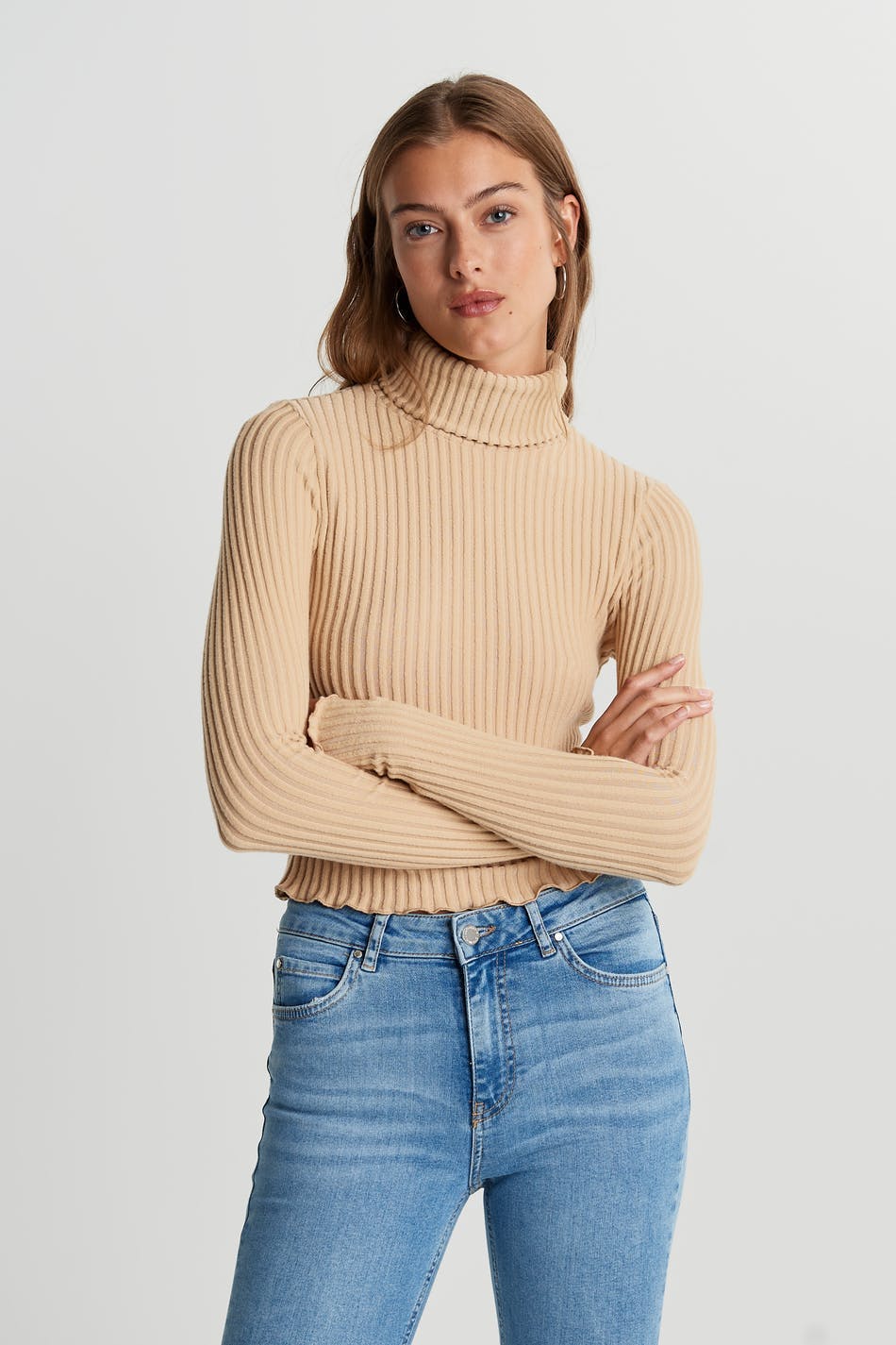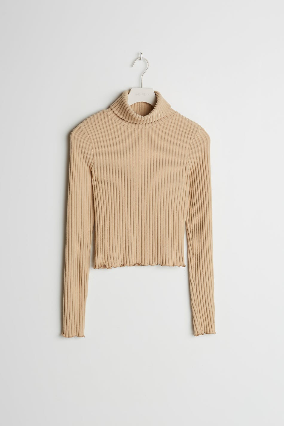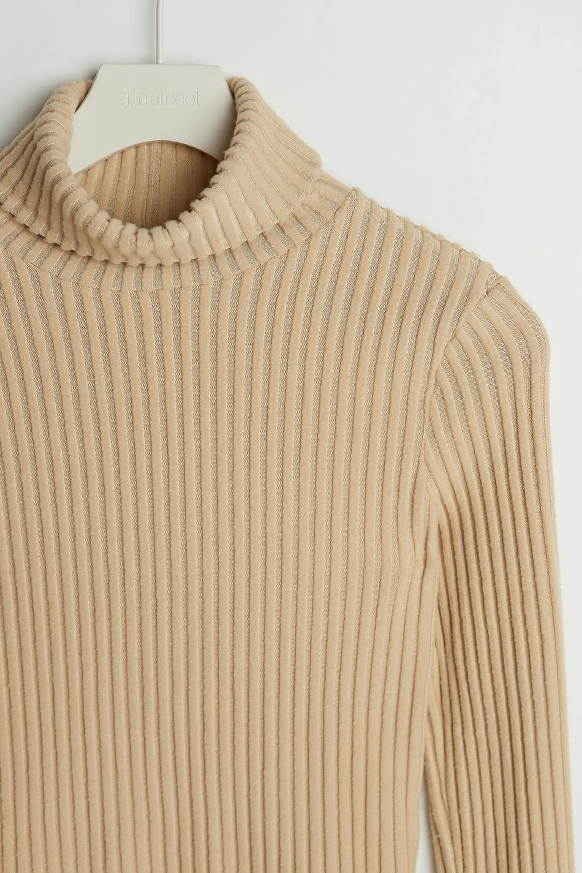 Soft roll-neck with a fitted fit. The jumper is beige, short and ribbed.