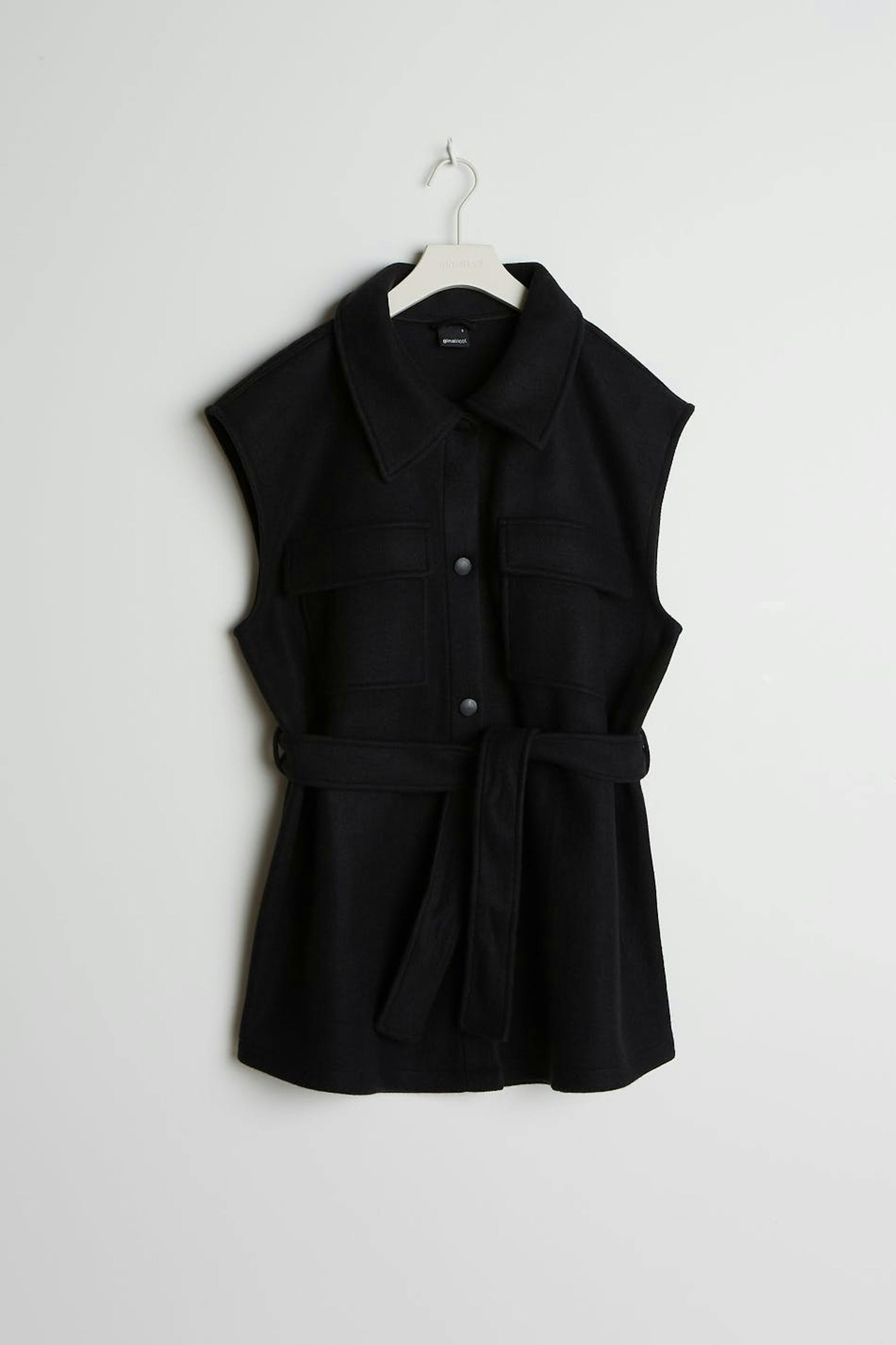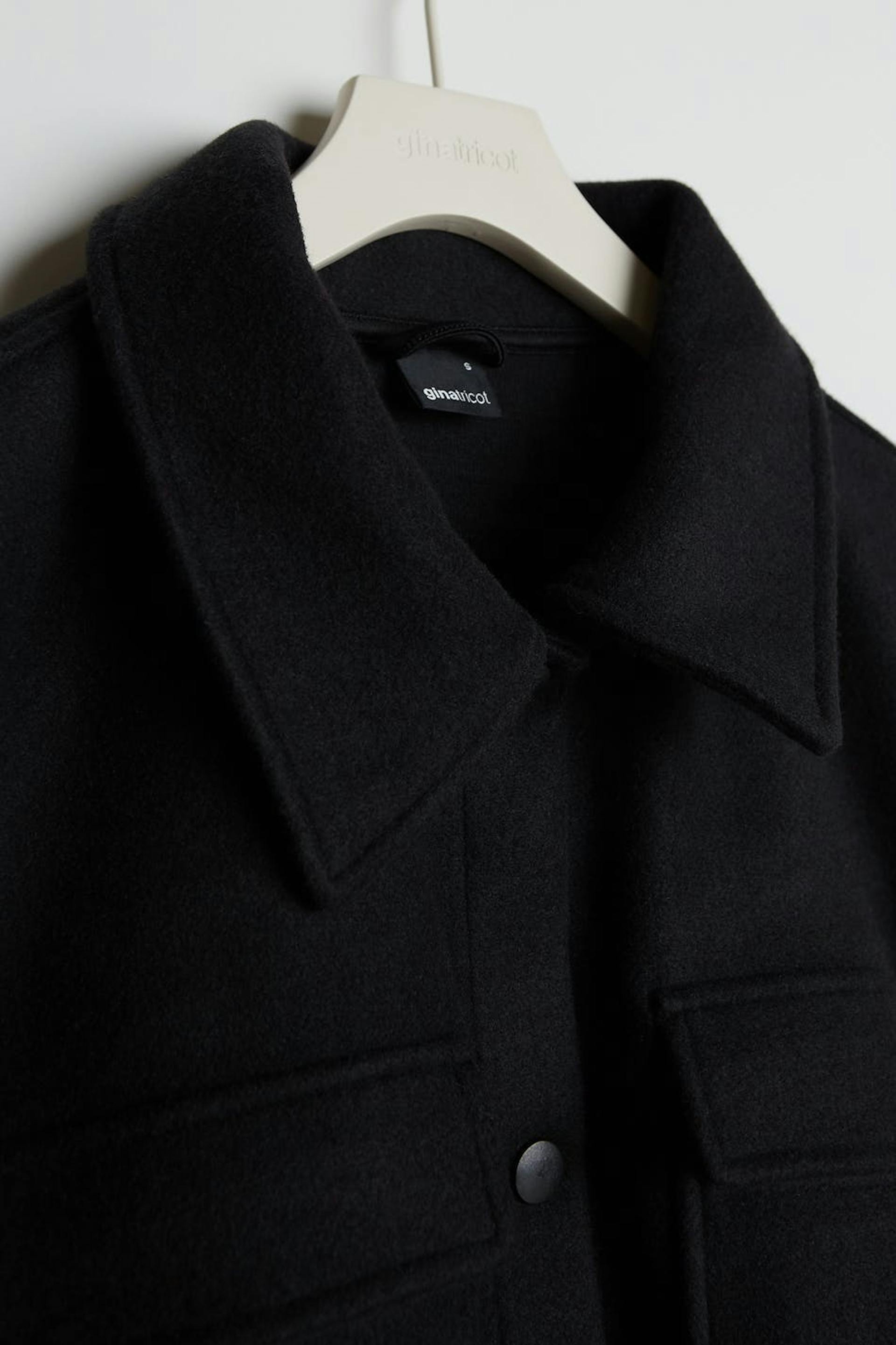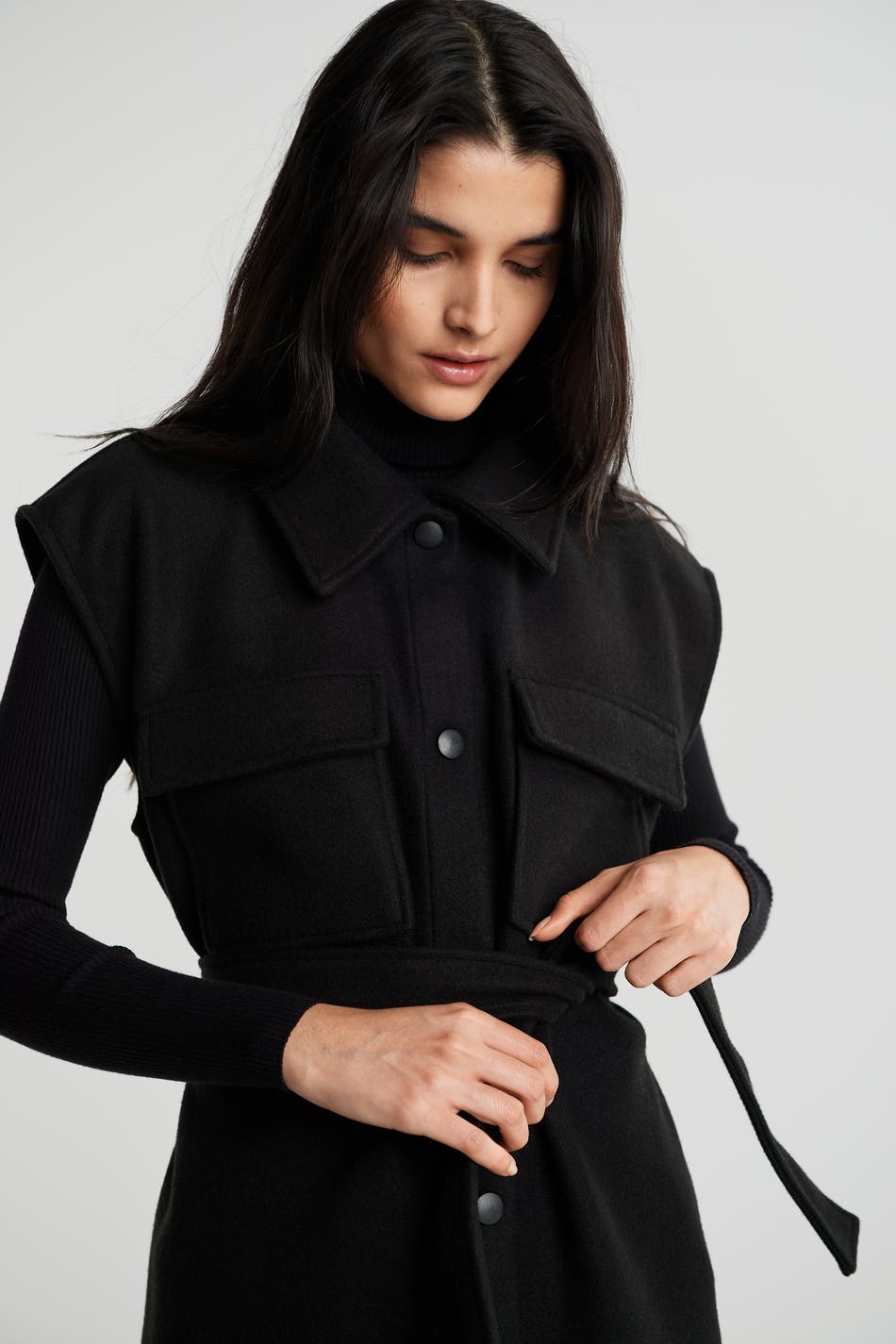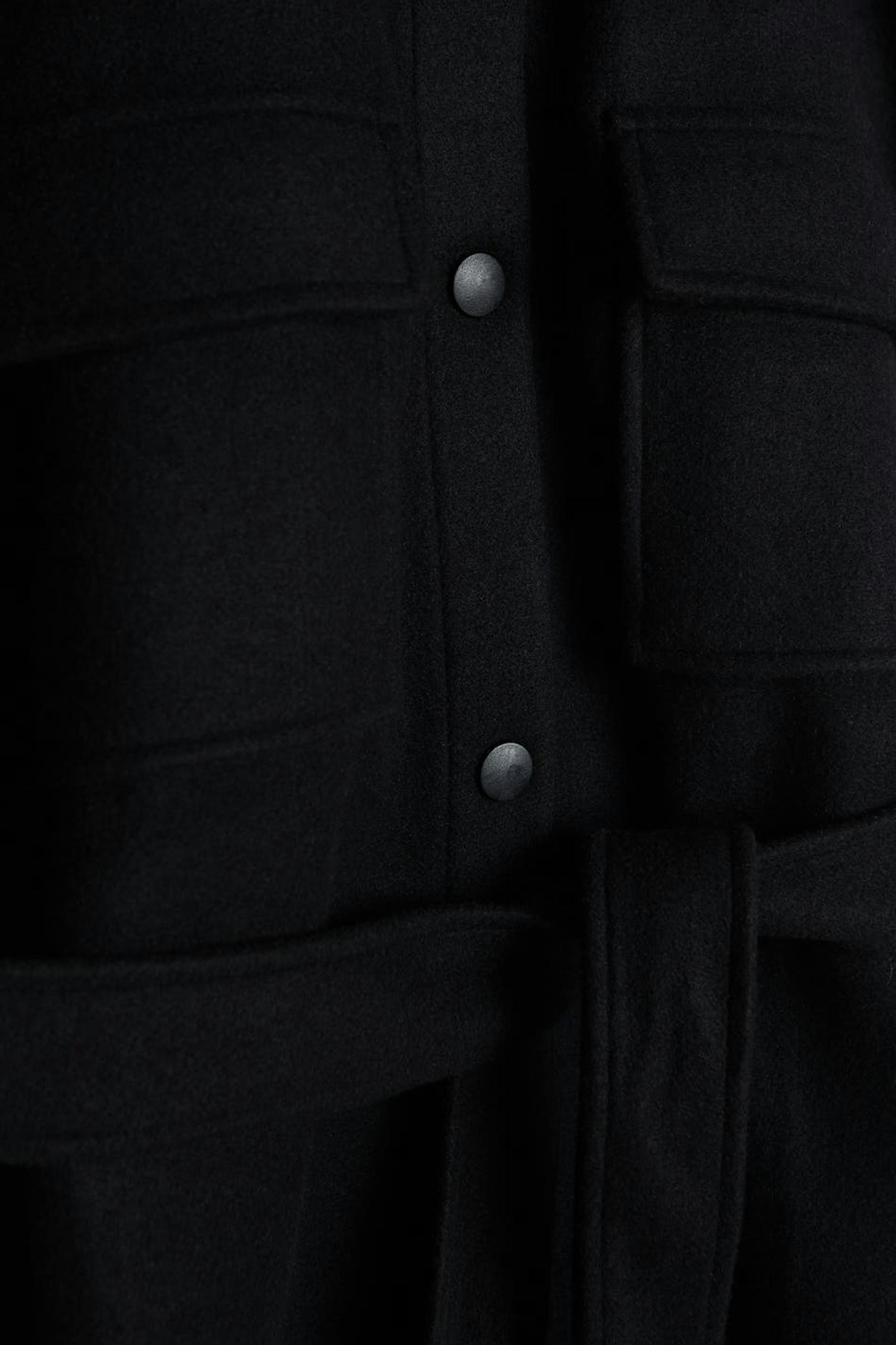 Jumper with an oversize fit. The jumper is black and has a button placket at the front. It is made of jersey and has a belt tie at the waist and chest pockets.