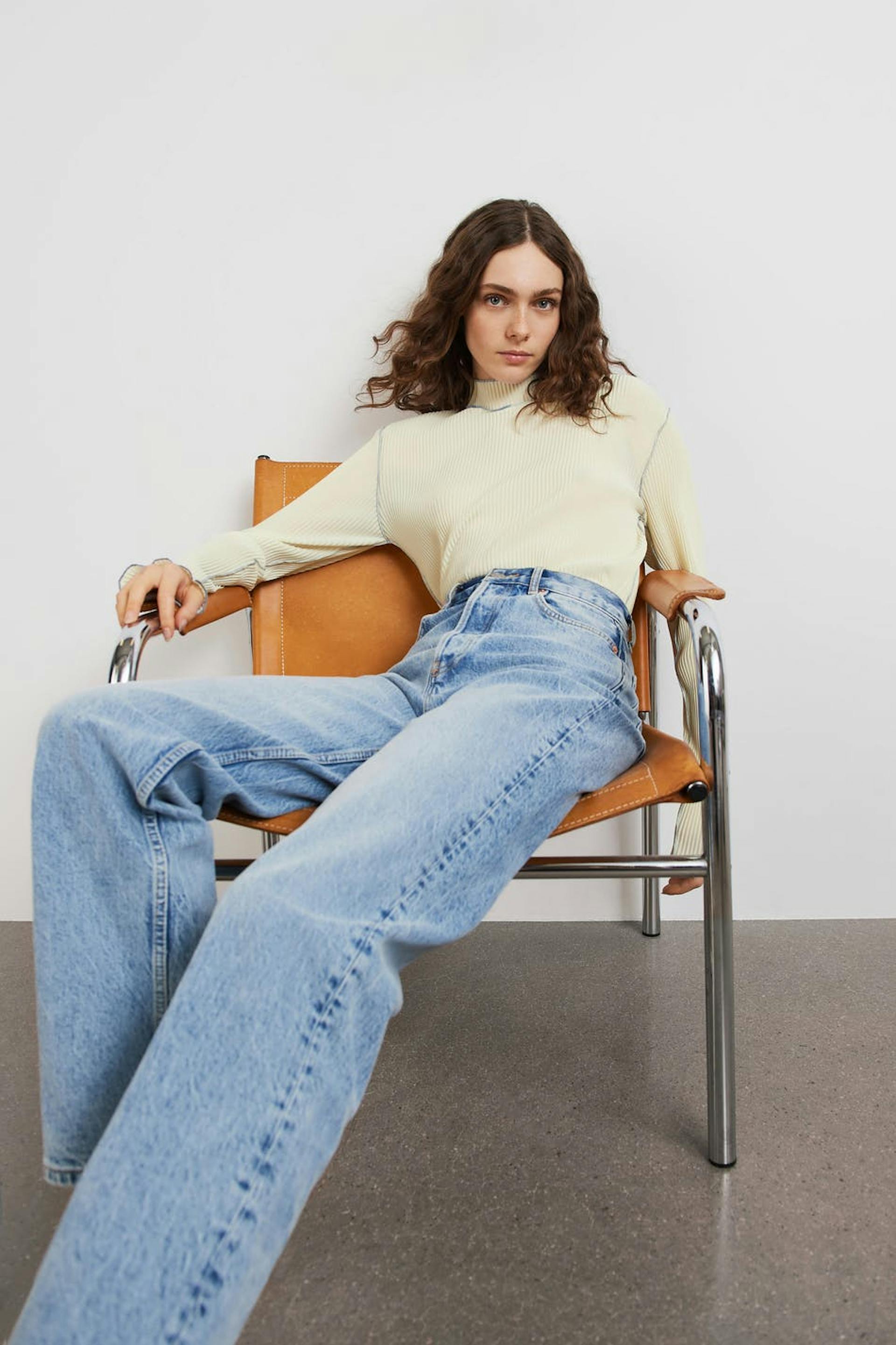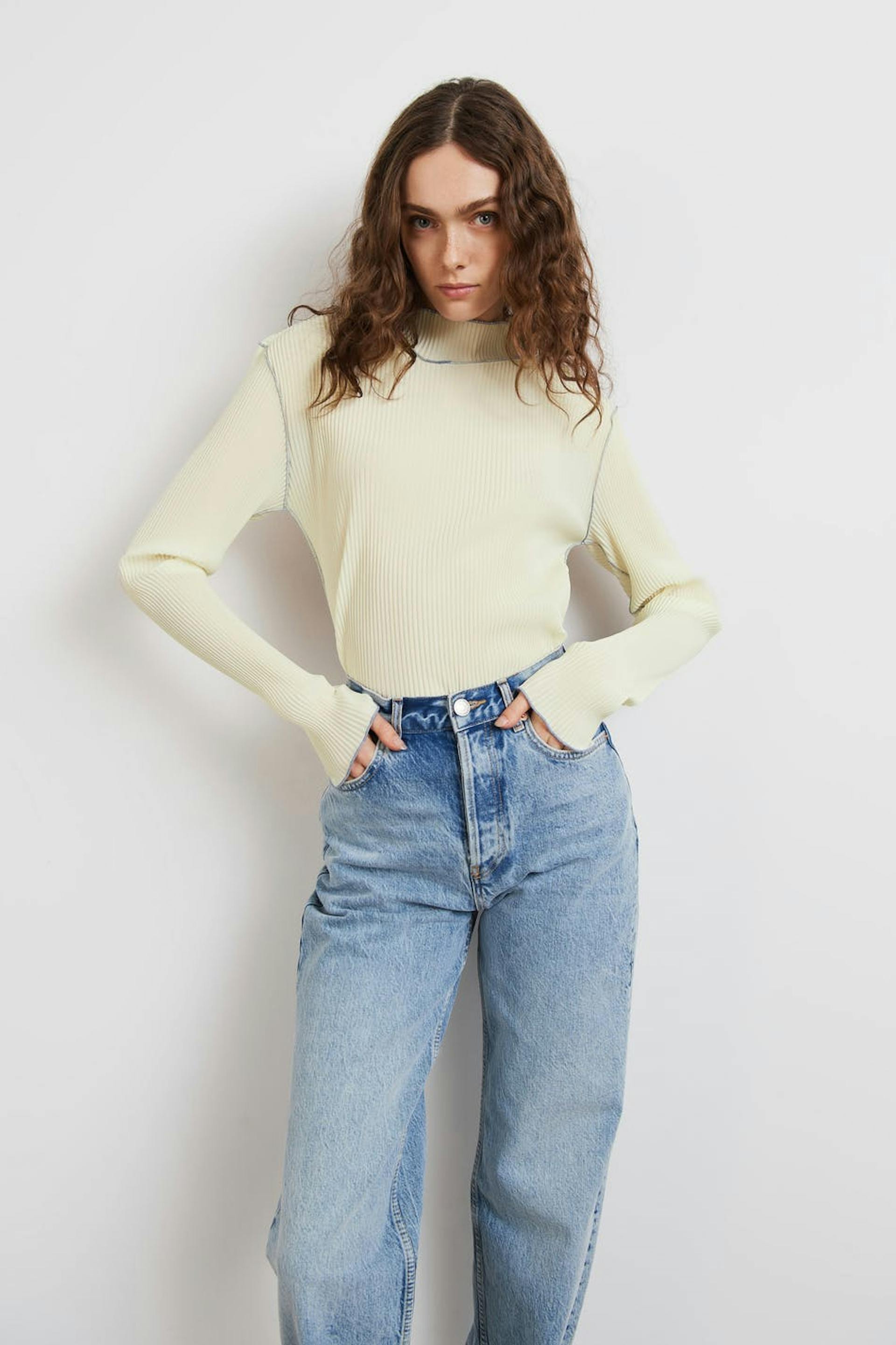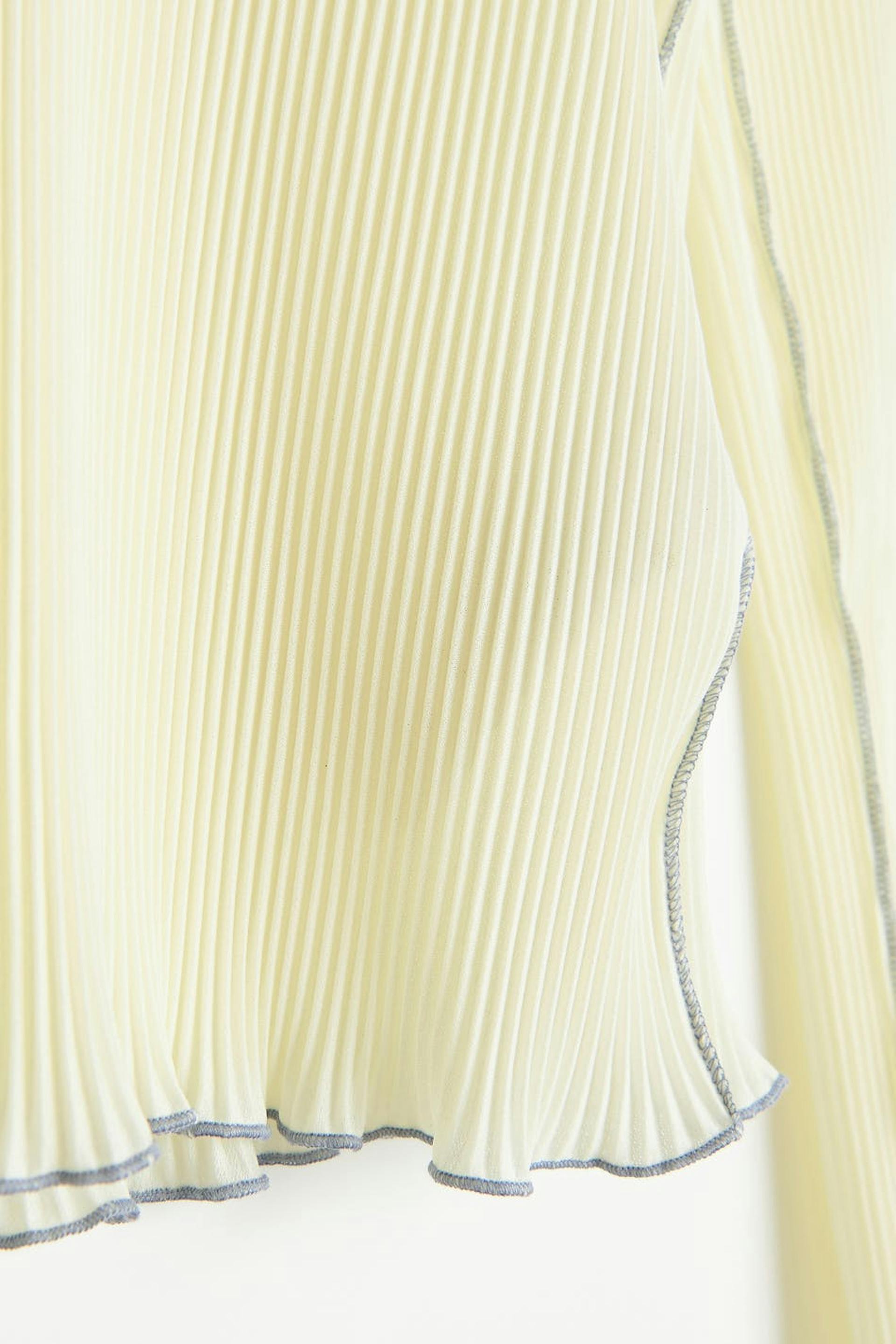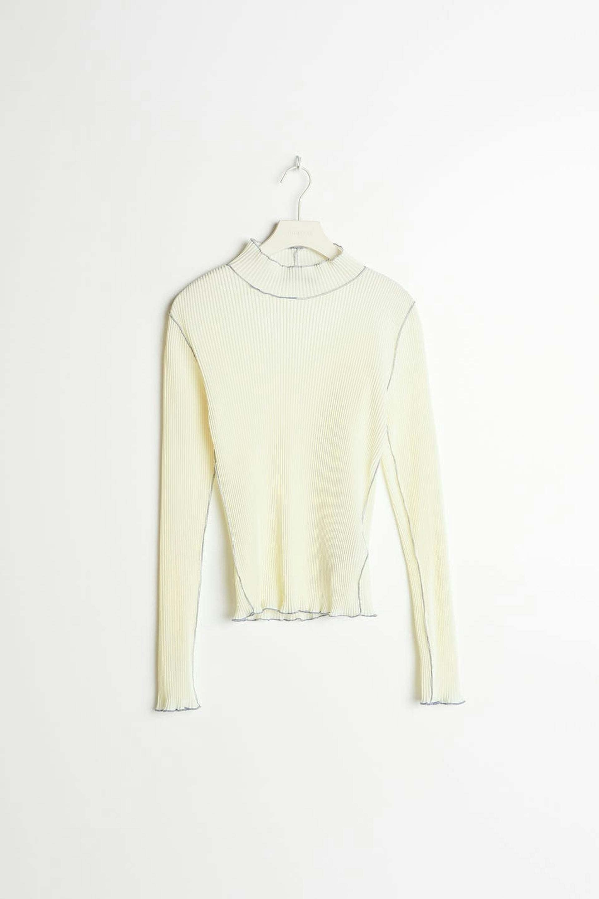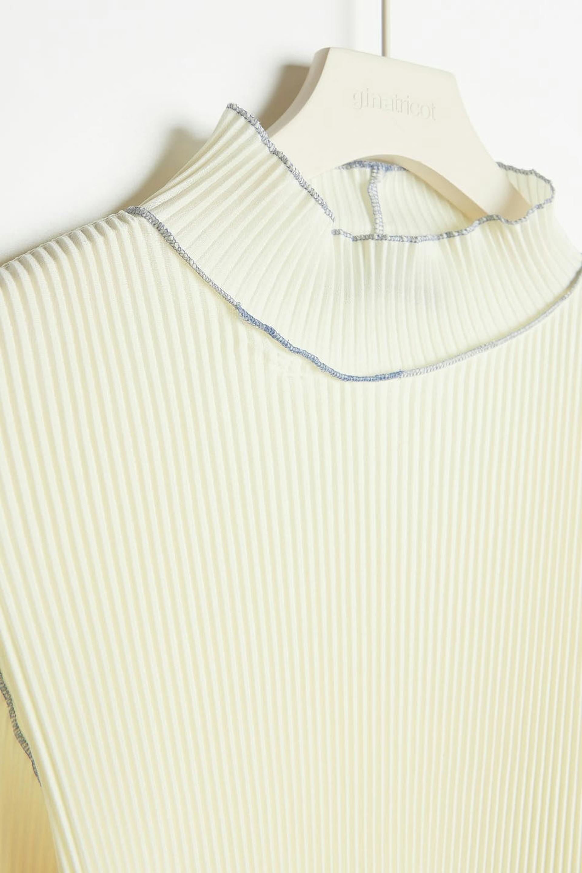 In pleated jersey top with turtleneck. The top is white and has a normal fit. It has long sleeves and small frills on the collar and at the bottom hem.
