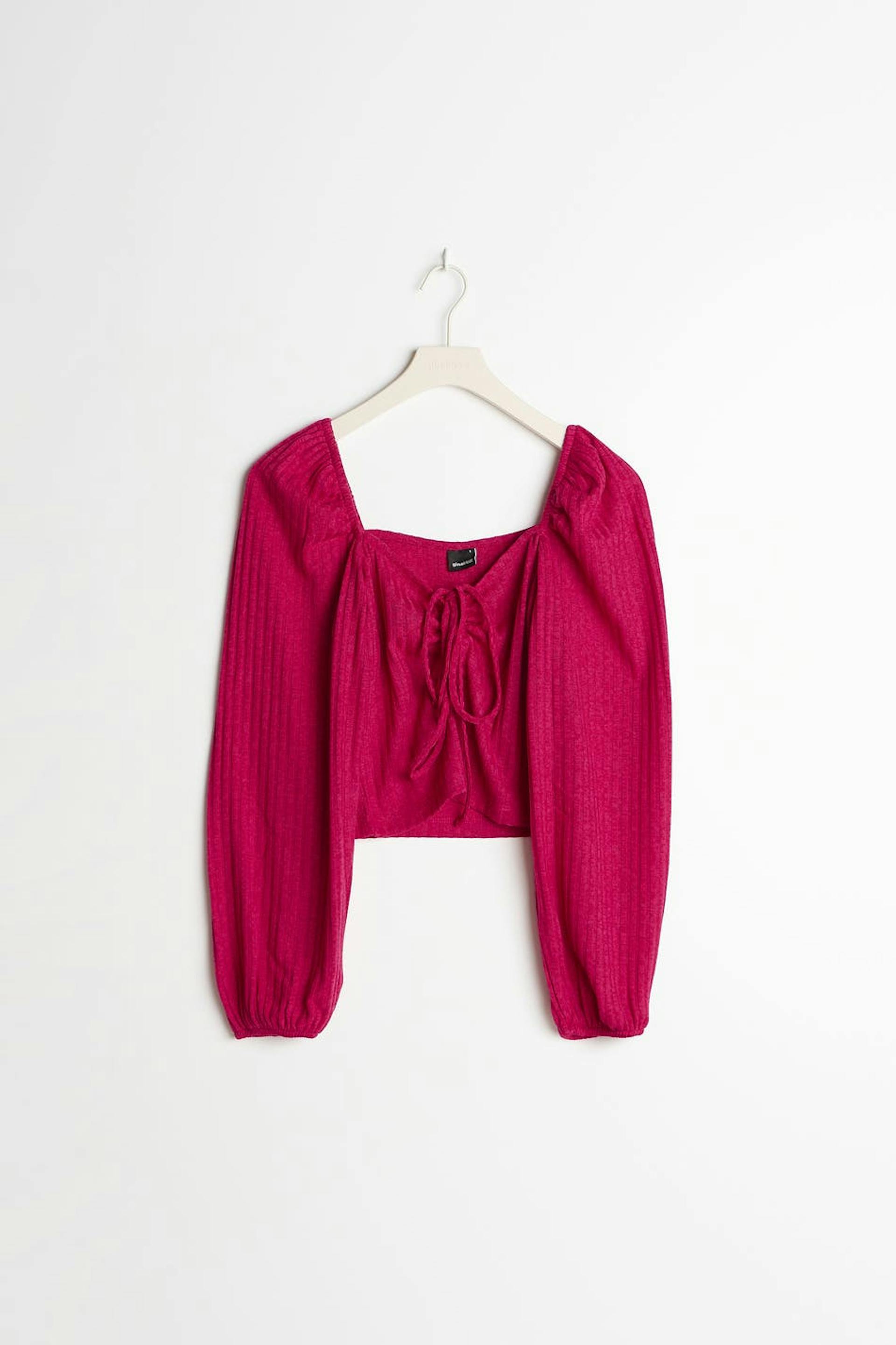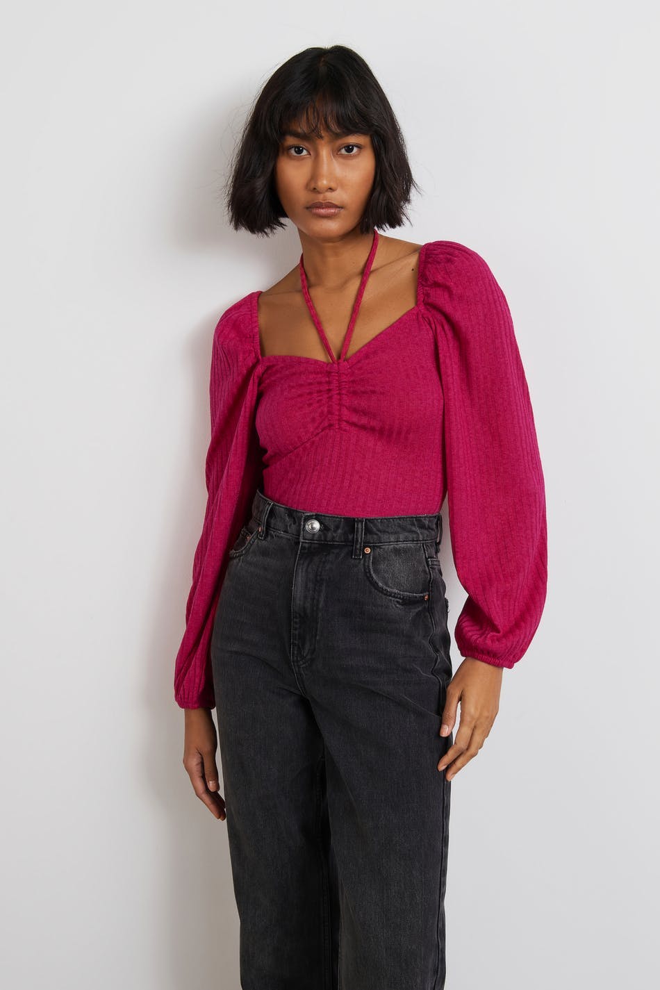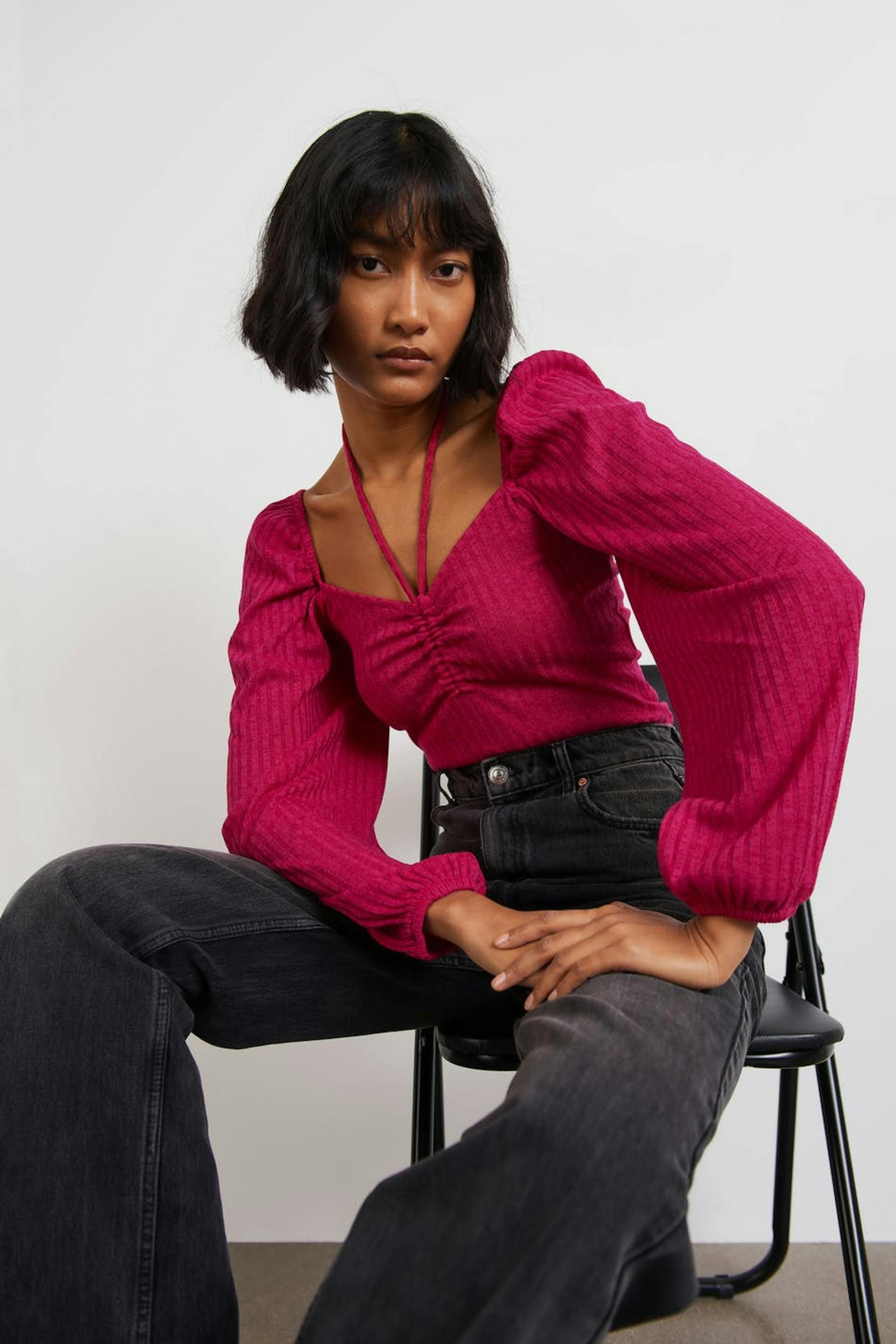 Long-sleeved top with puff sleeves. The top is pink and has ruched details at the front. It has a normal fit, elasticized cuffs and halterneck straps with self-tie. Can be tied in different ways.