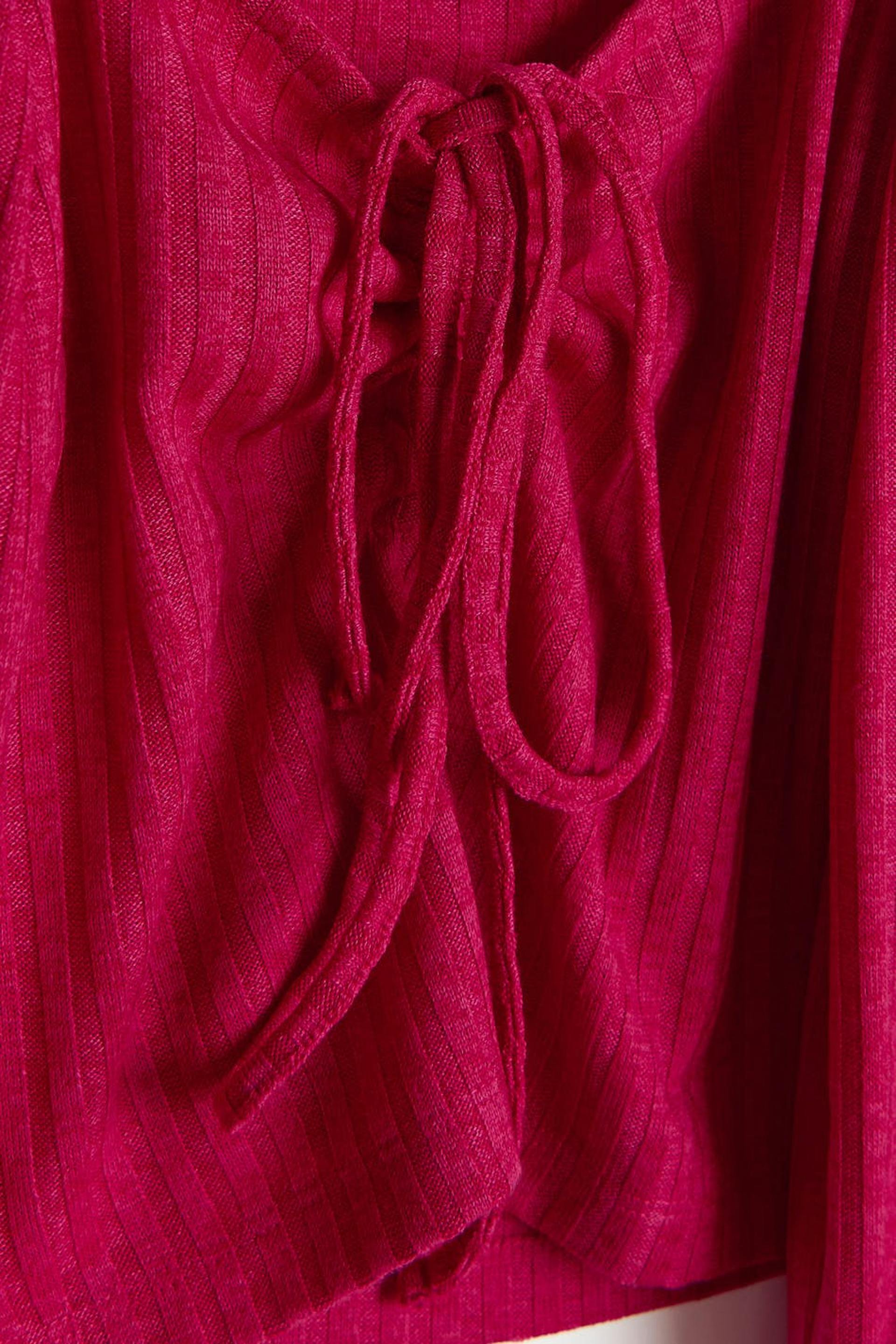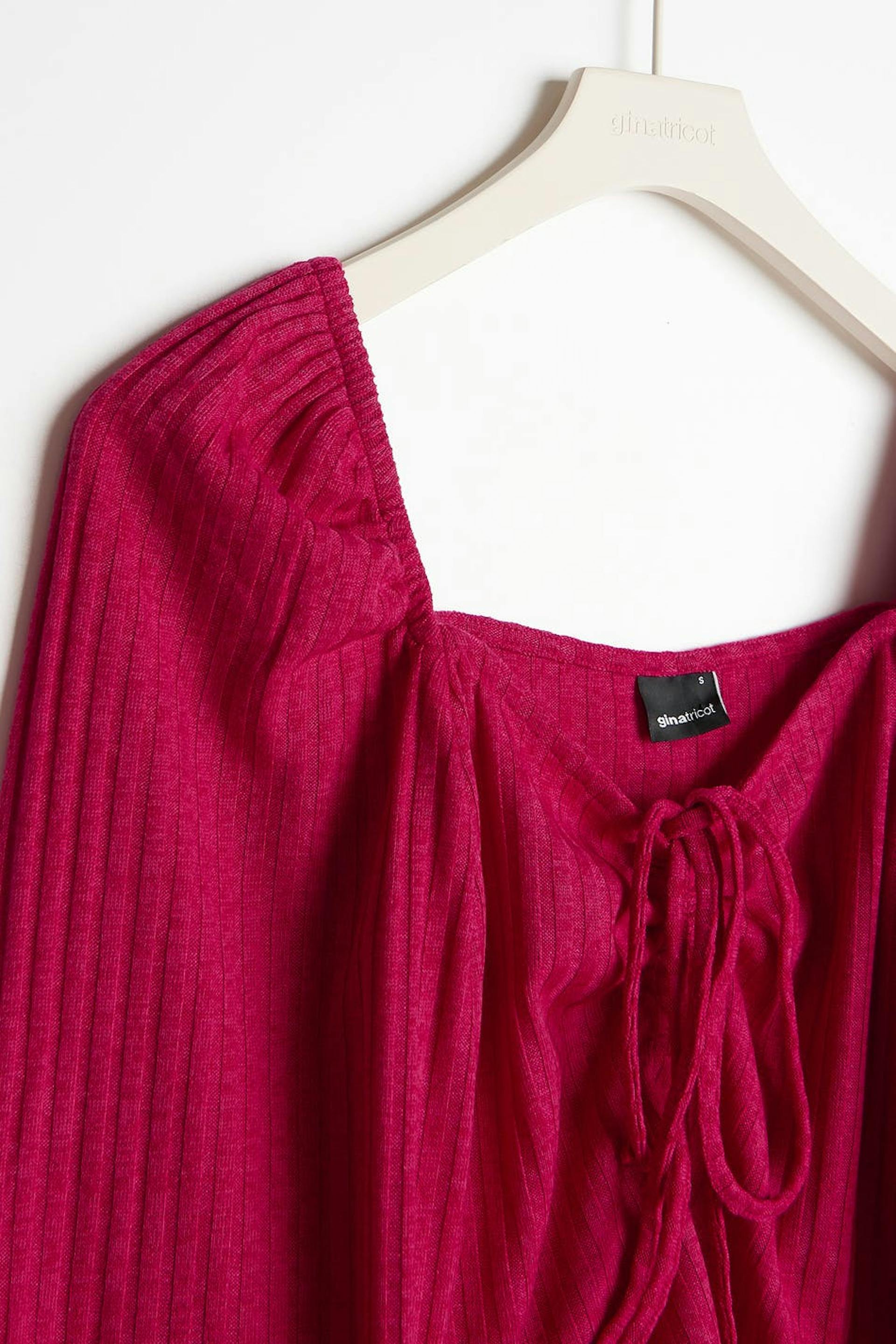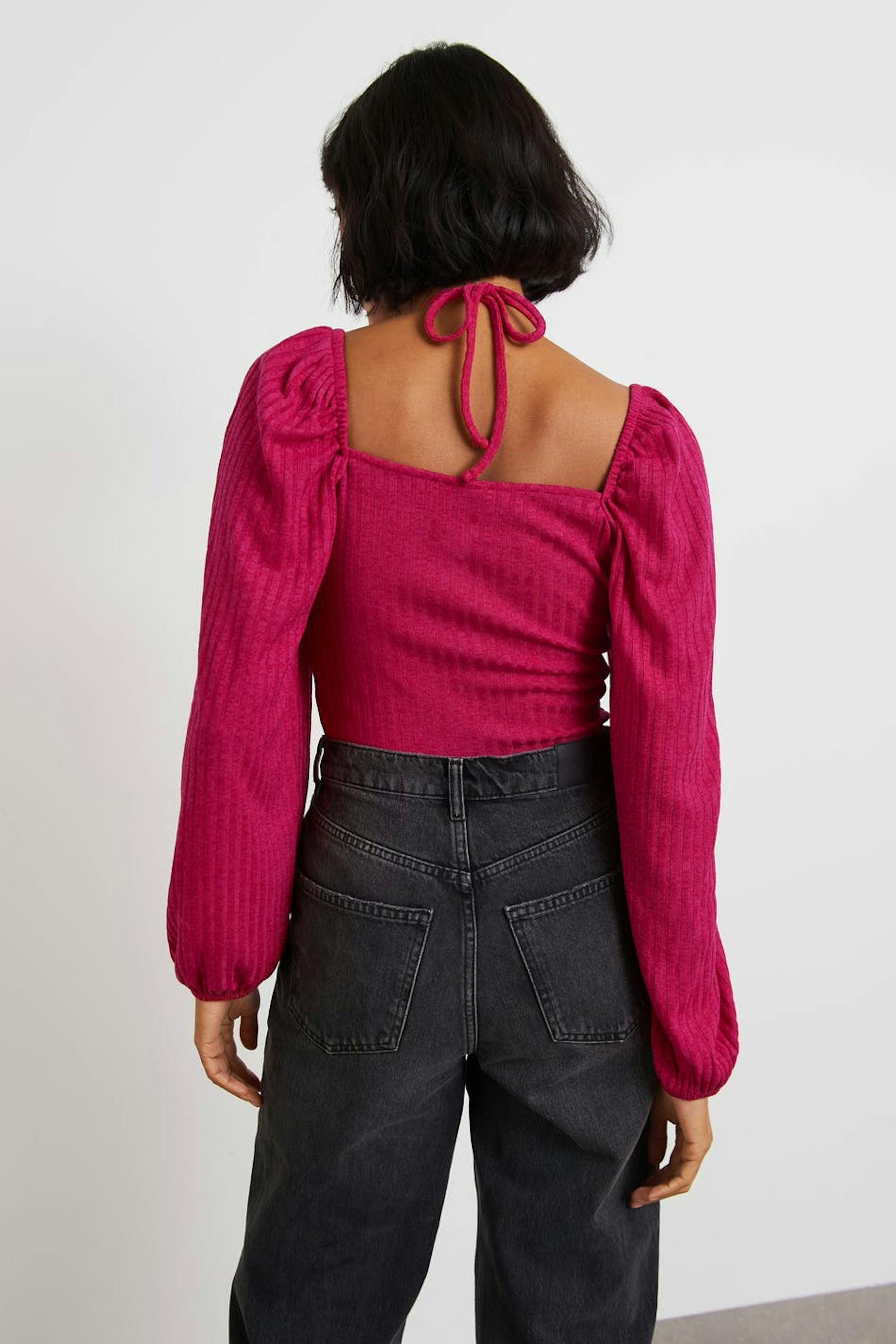 Long-sleeved top with puff sleeves. The top is pink and has ruched details at the front. It has a normal fit, elasticized cuffs and halterneck straps with self-tie. Can be tied in different ways.