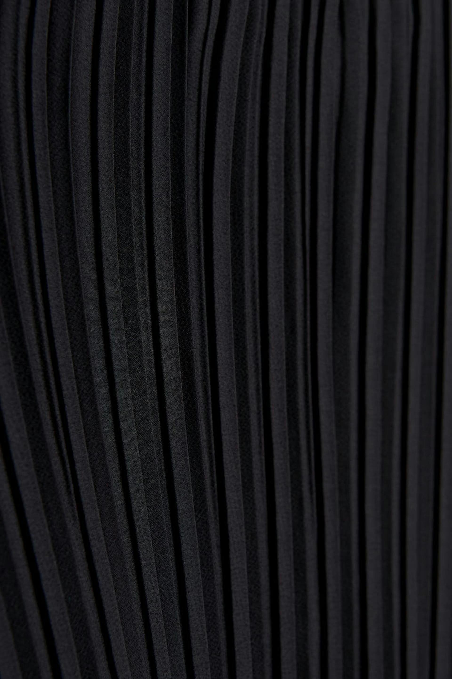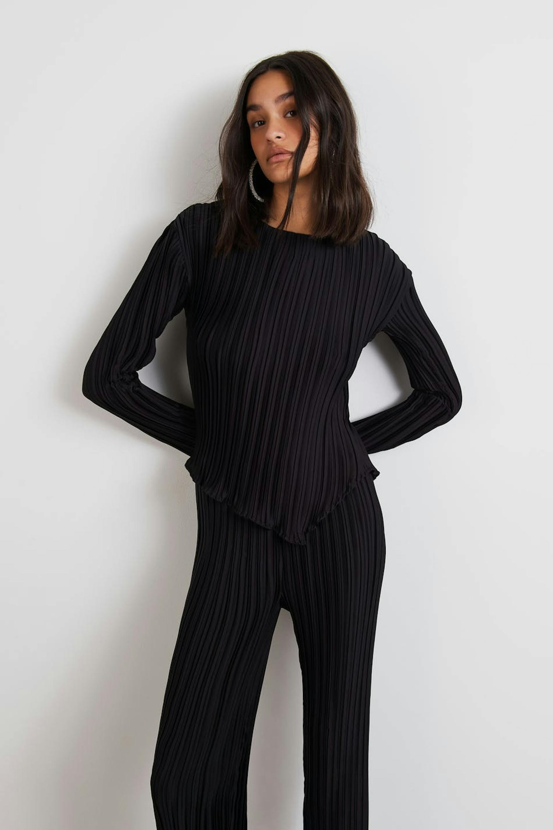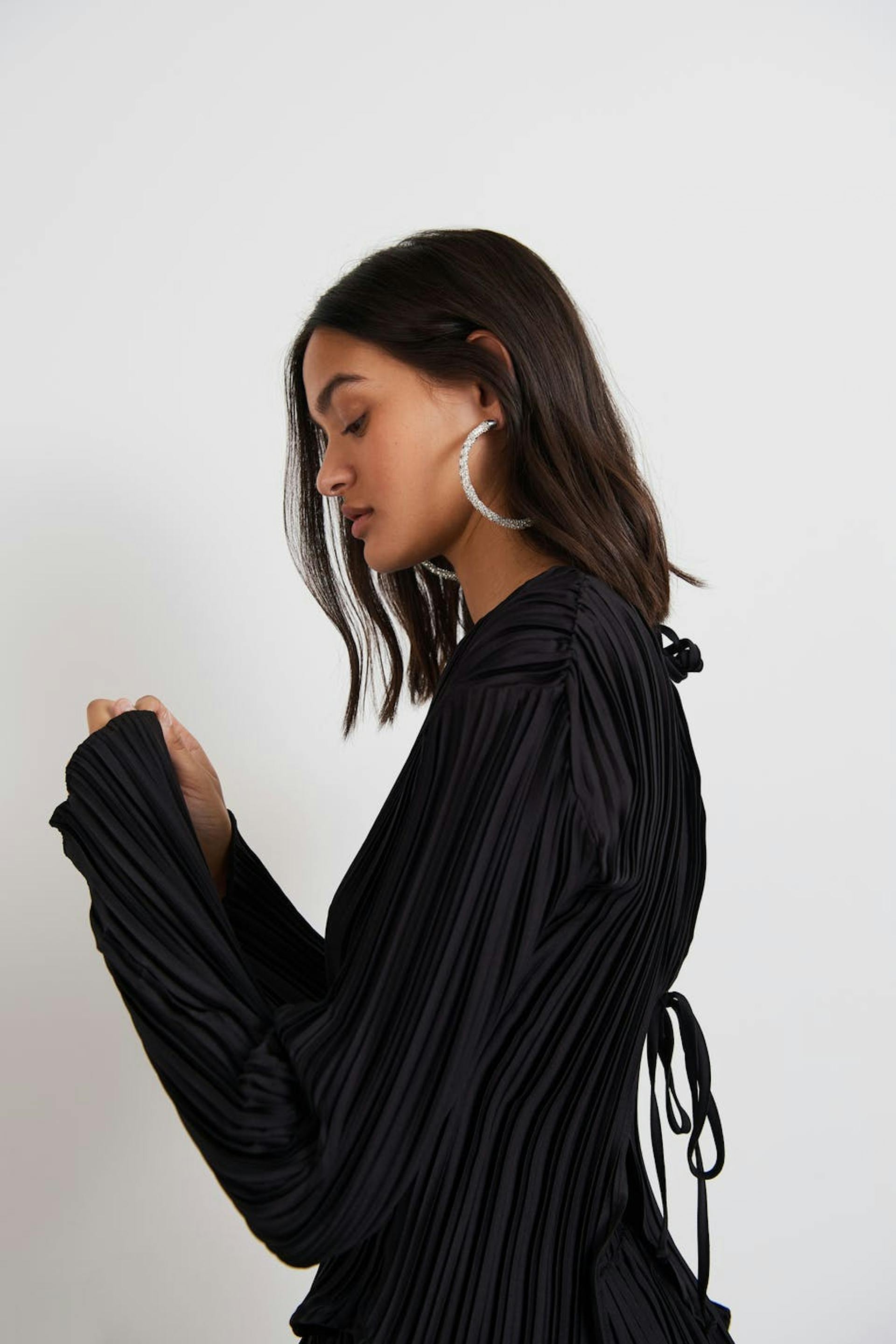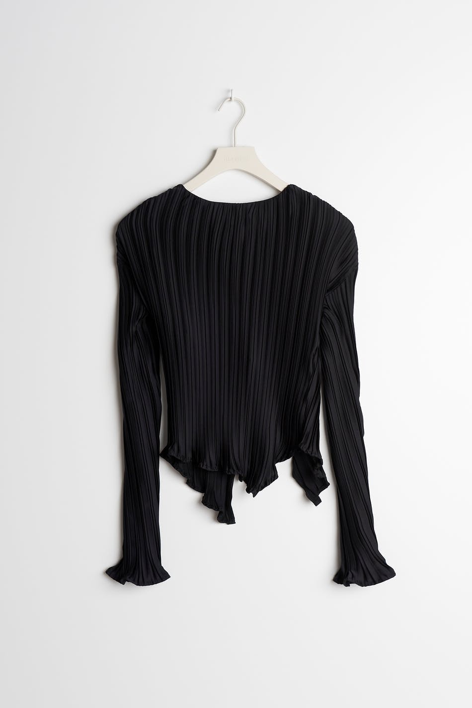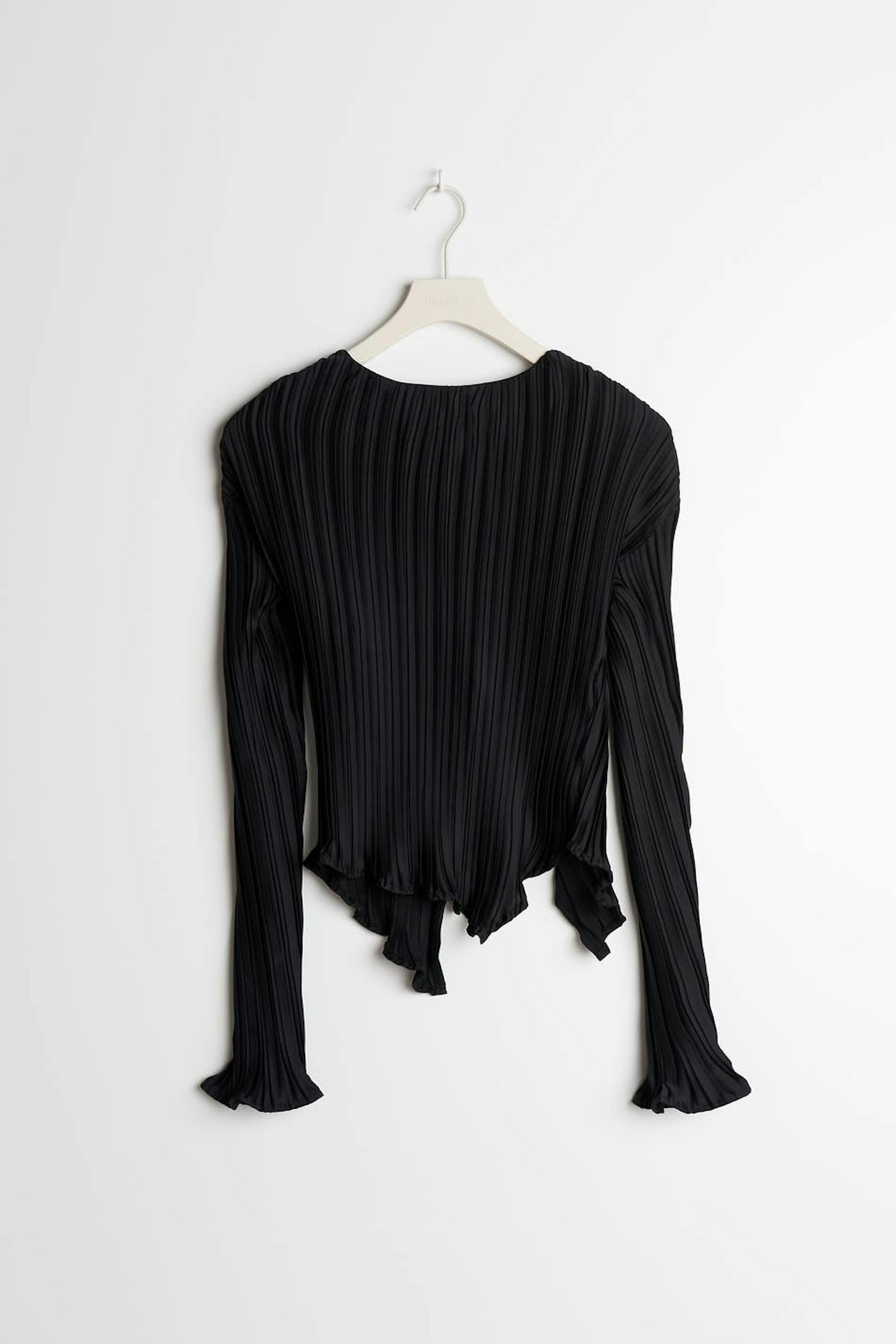 Pleated top with loose-fitting style. The top is perfect for the party, black and long-sleeved. It has satin material, tie knot details in the back and an asymmetrical hem.
