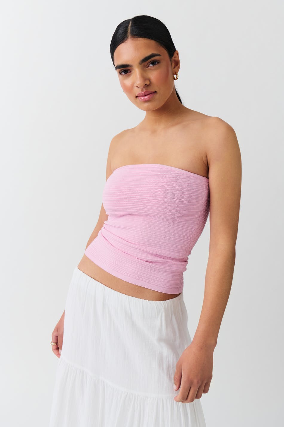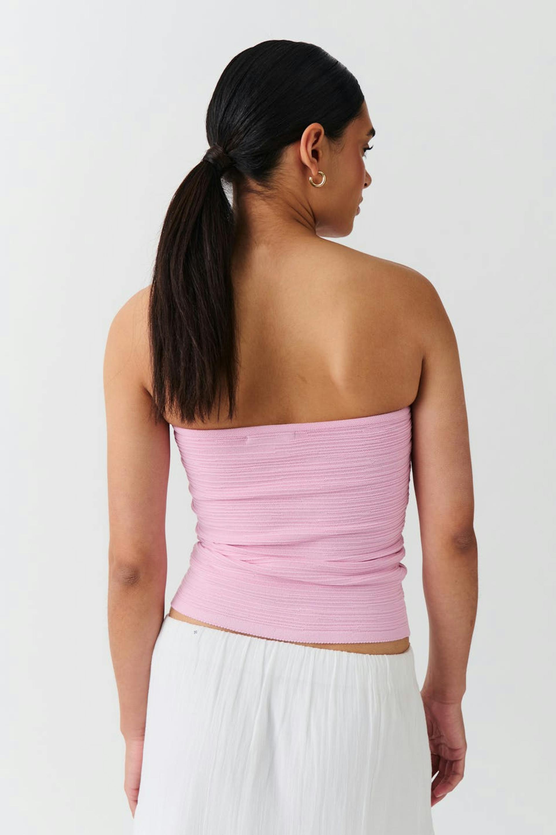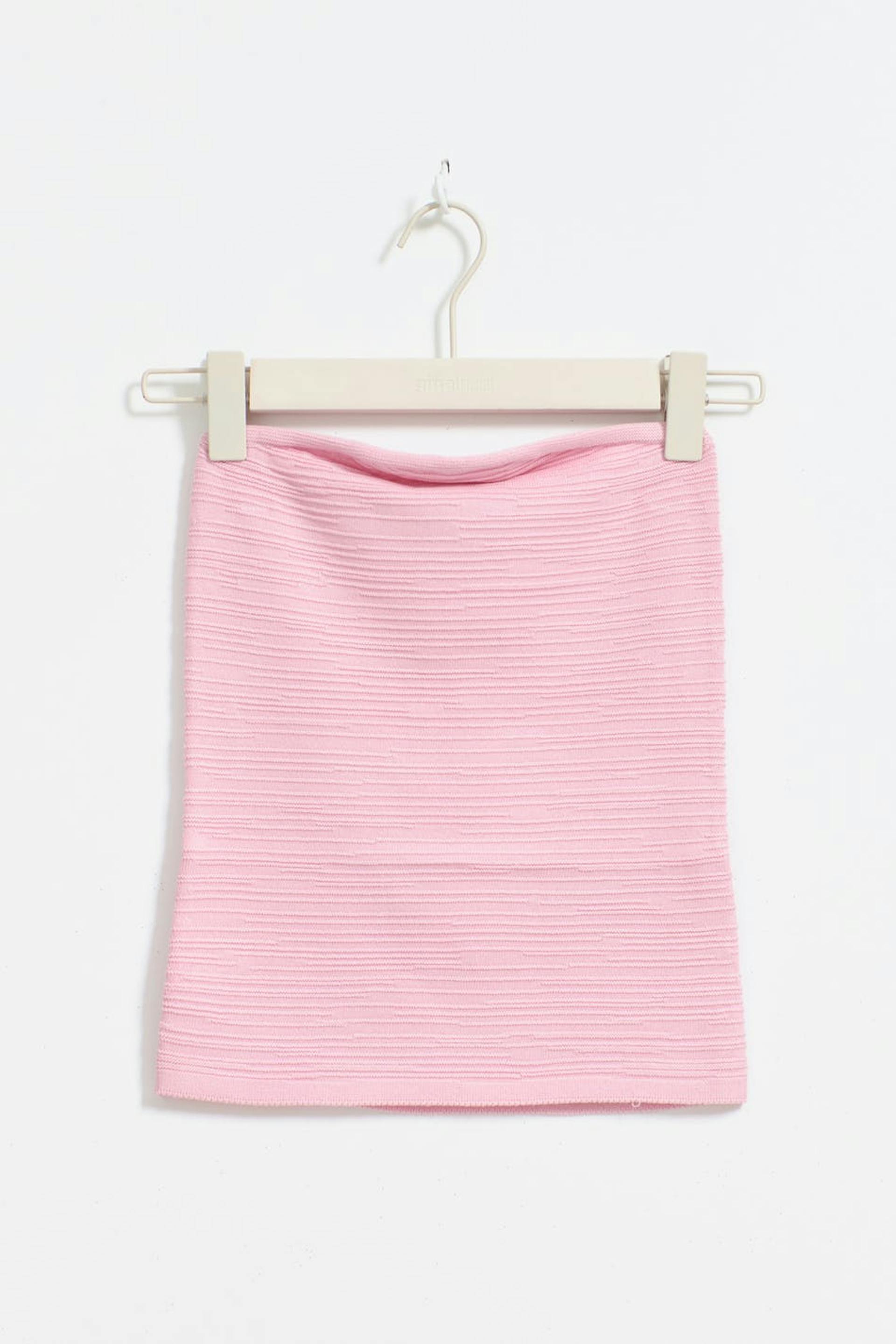 Knitted tube top with figure-hugging fit. The top is pink and has structured material. It has regular length.