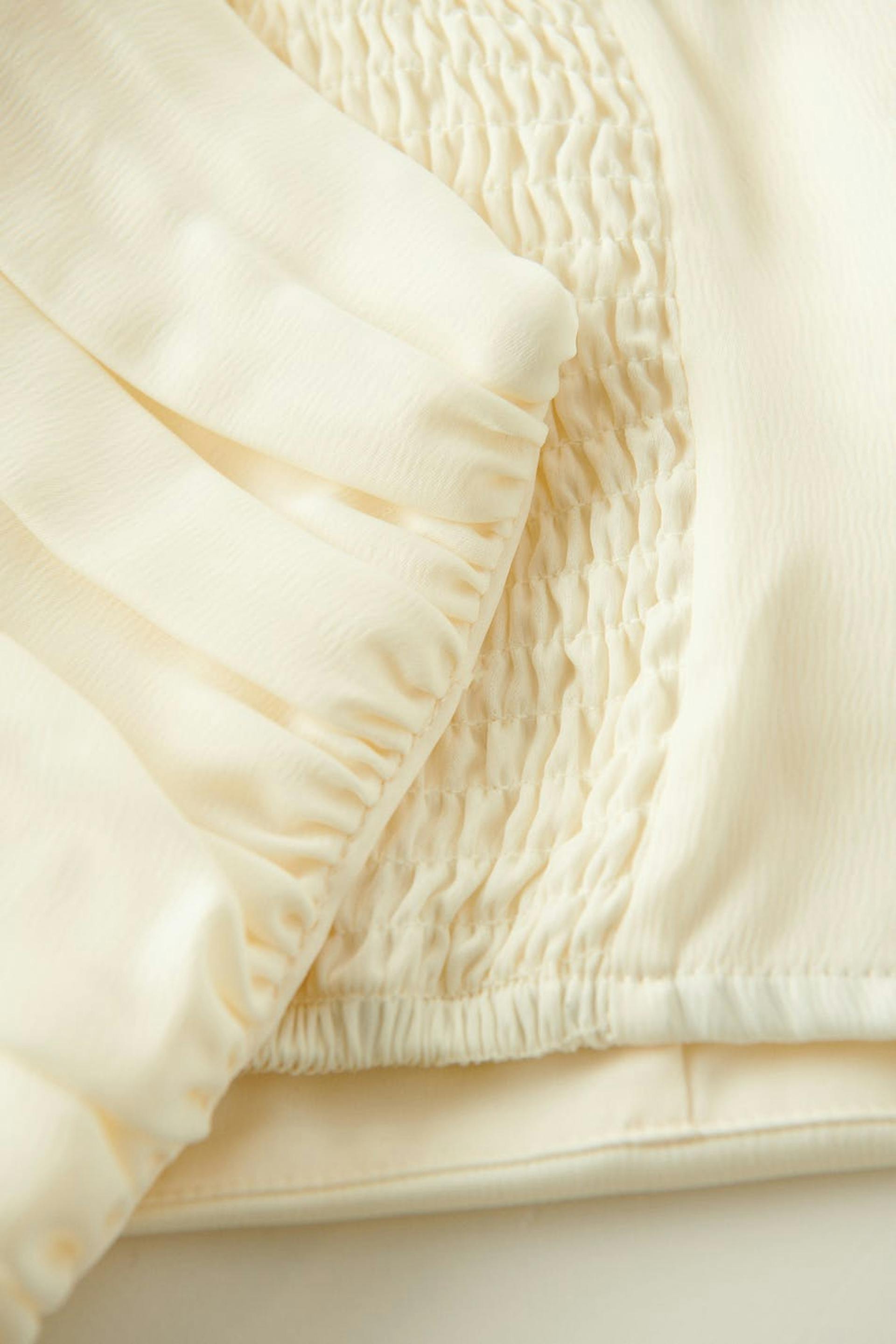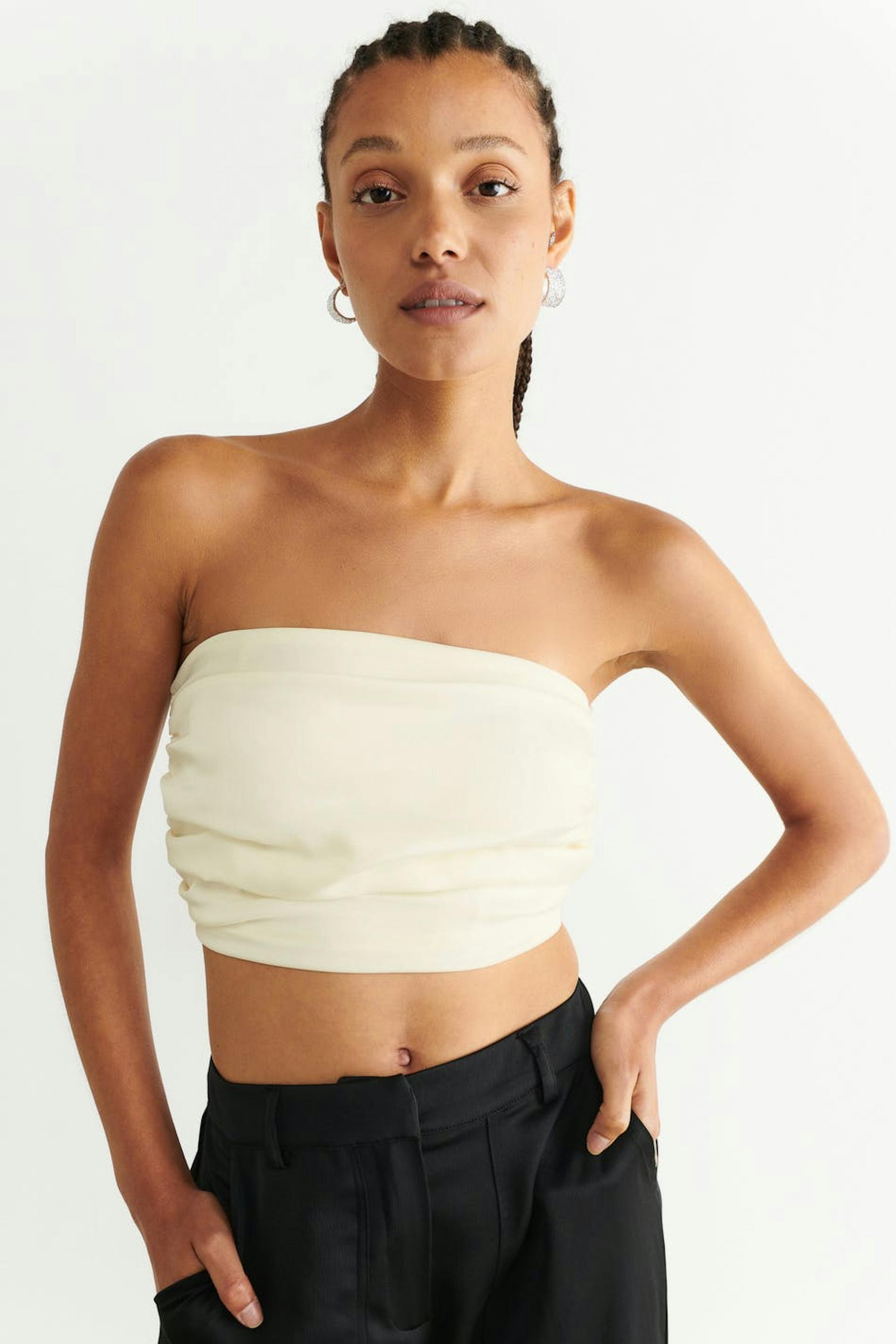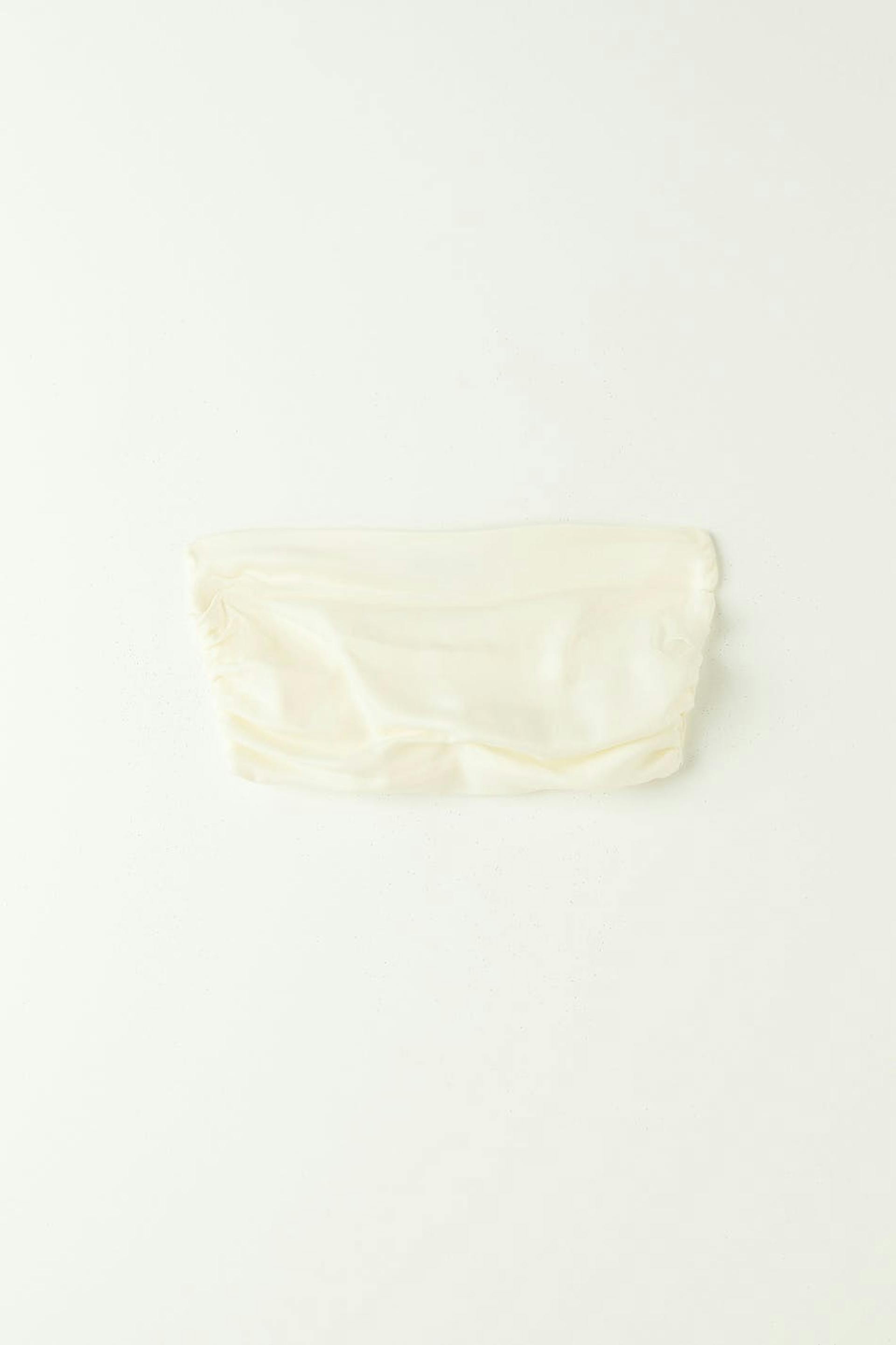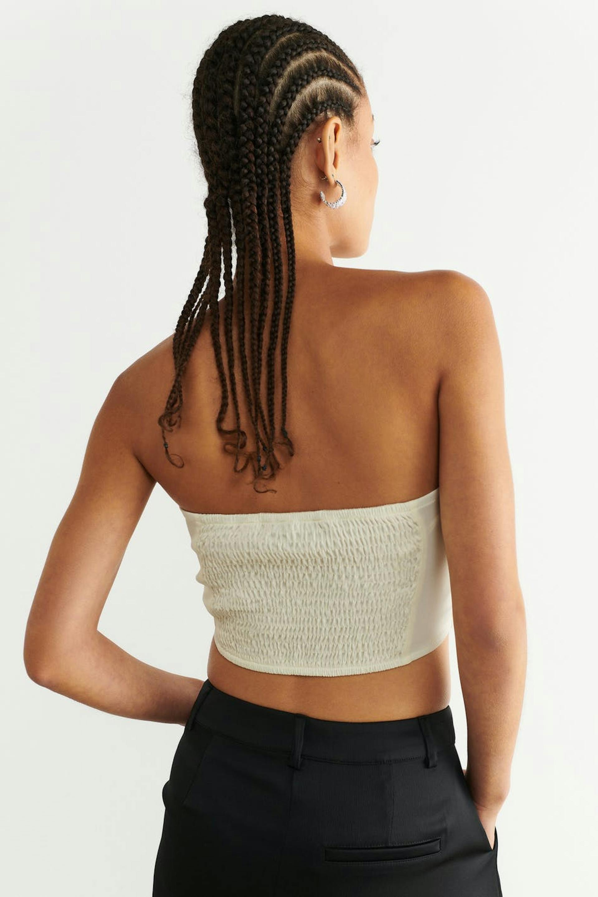 Tube top in satin with pleated design. The top is white and has fitted fit with smocking in the back.