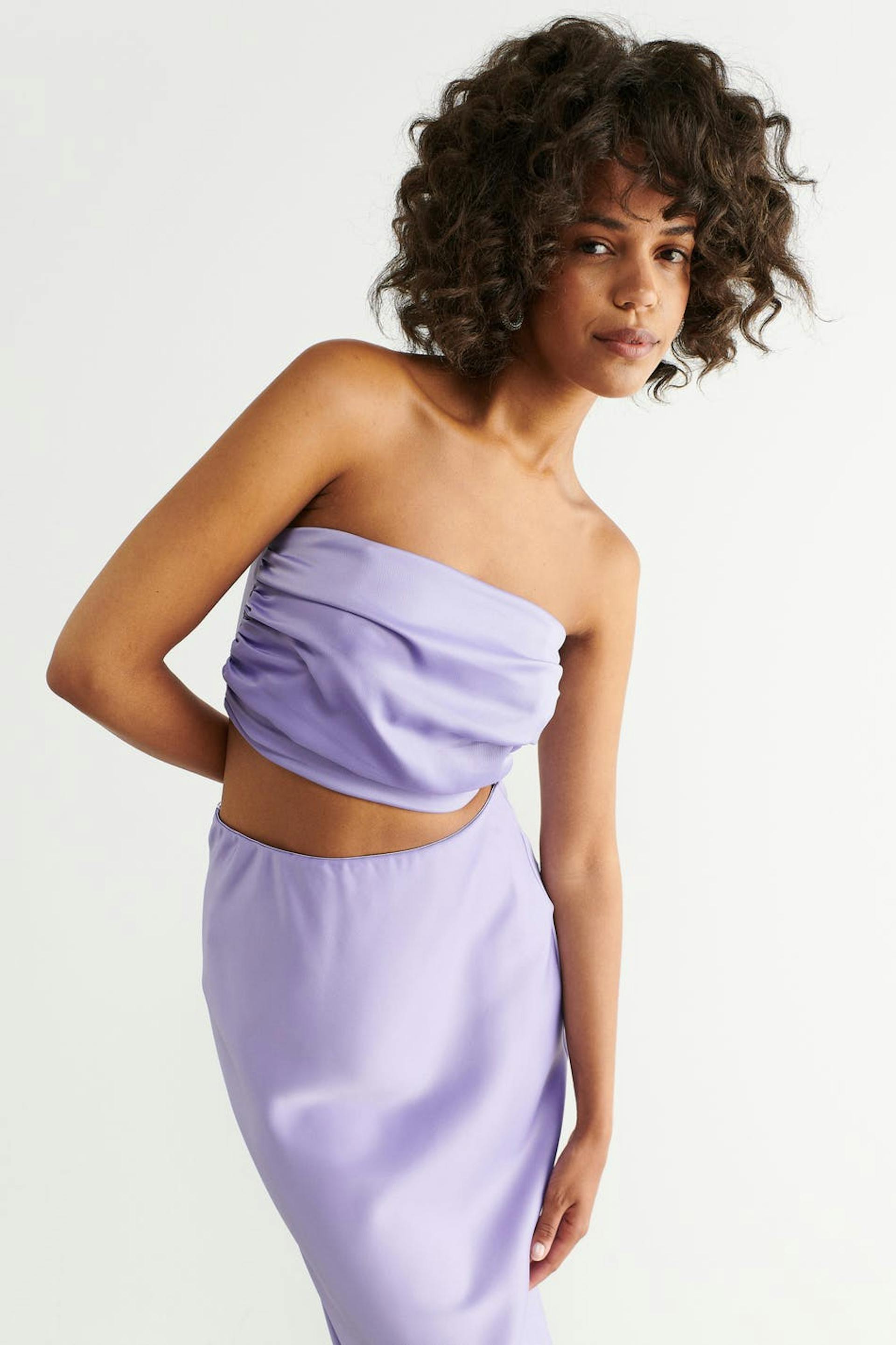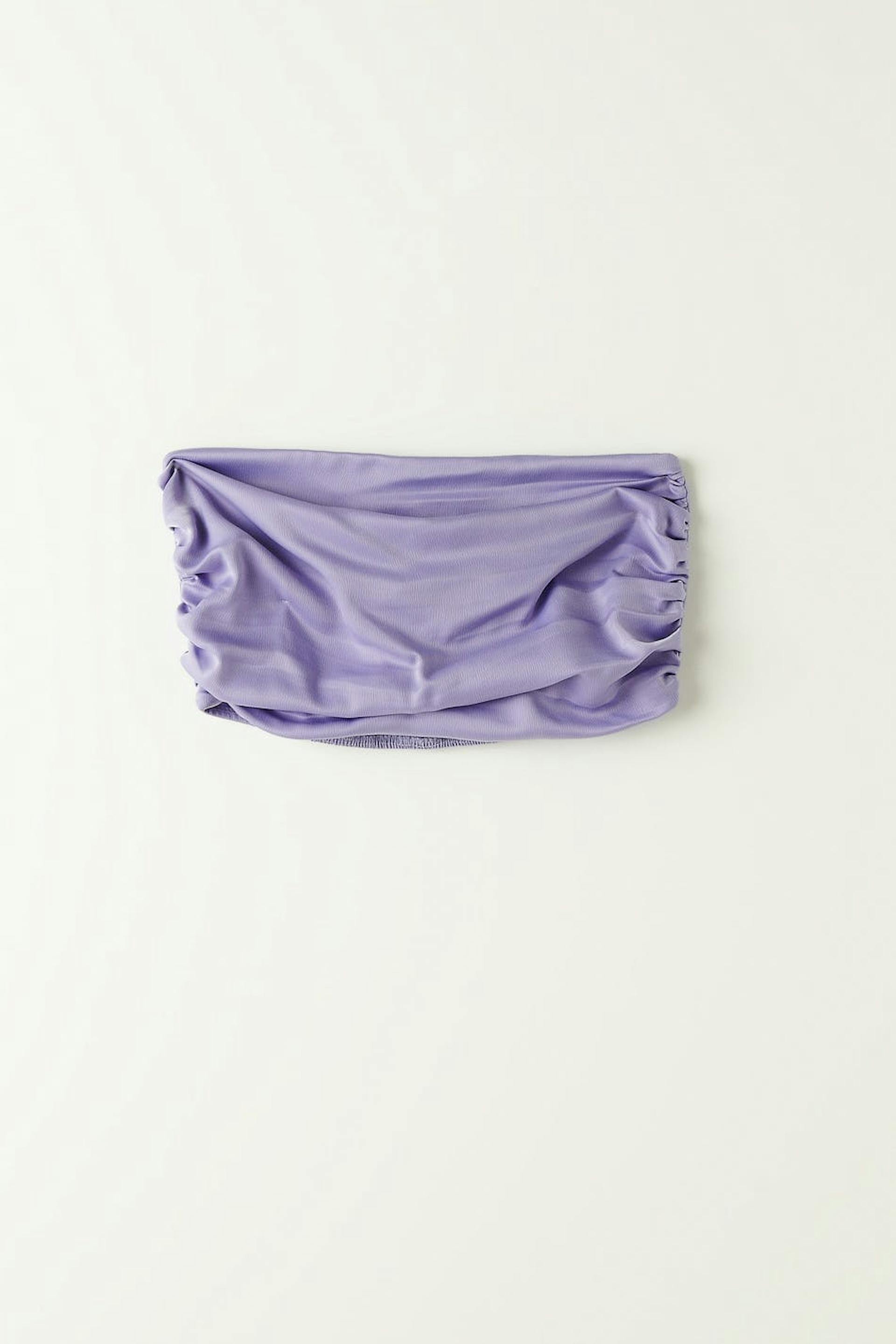 Tube top in satin with pleated design. The top is light purple and has fitted fit with smocking in the back.