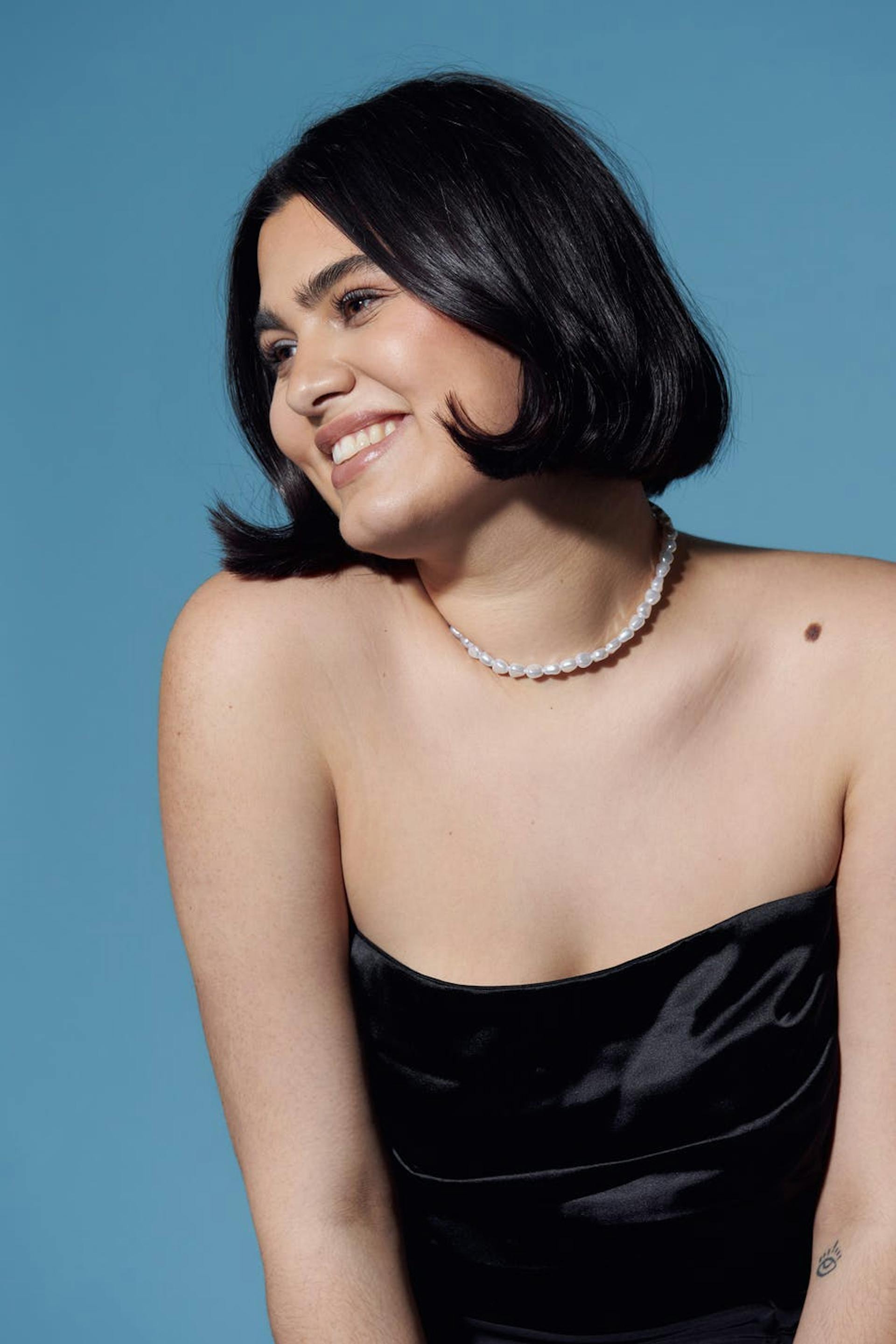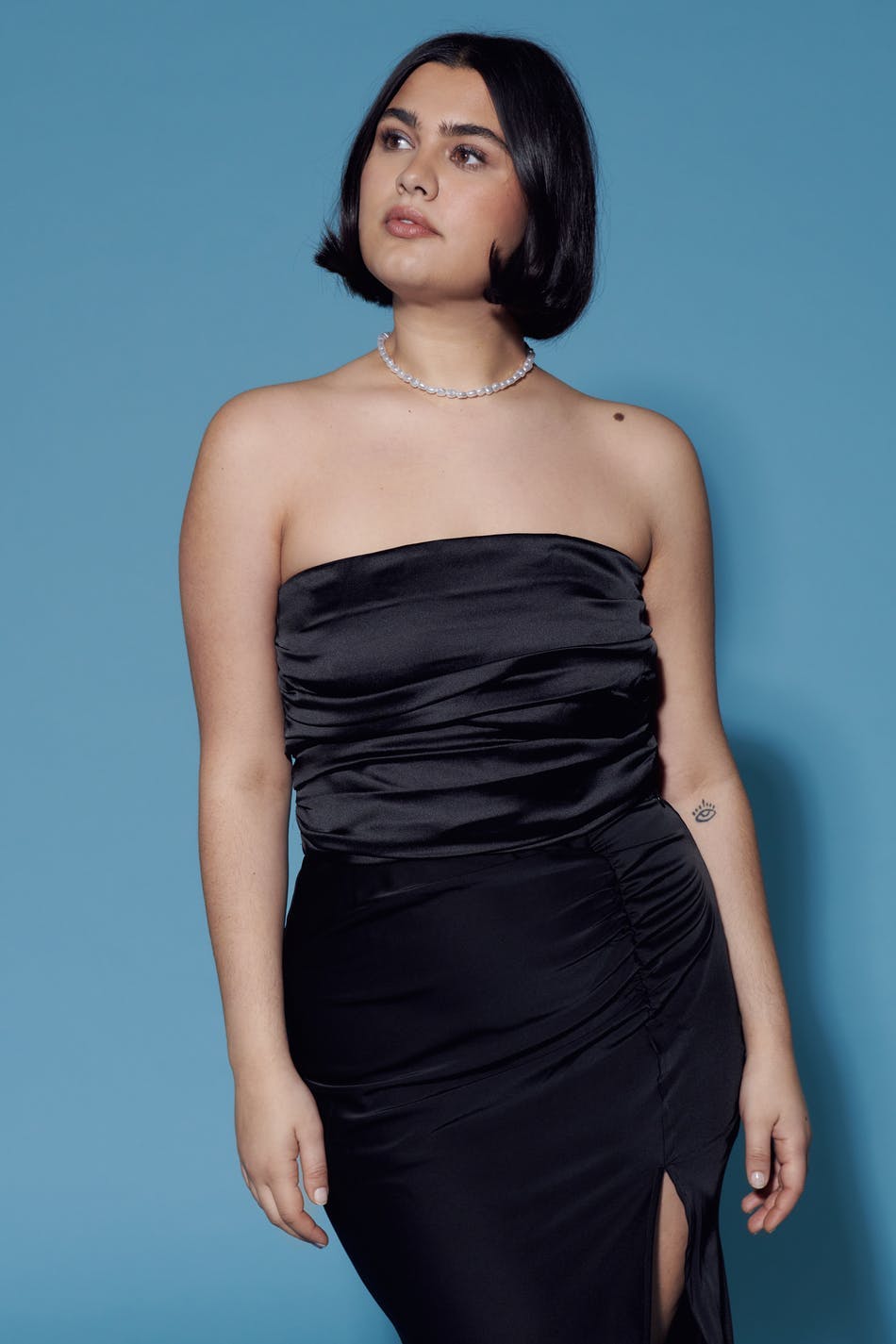Tube top in satin with pleat at the front. The top is black and has figure-hugging fit. It has zip in the side seam and smocking at the back.