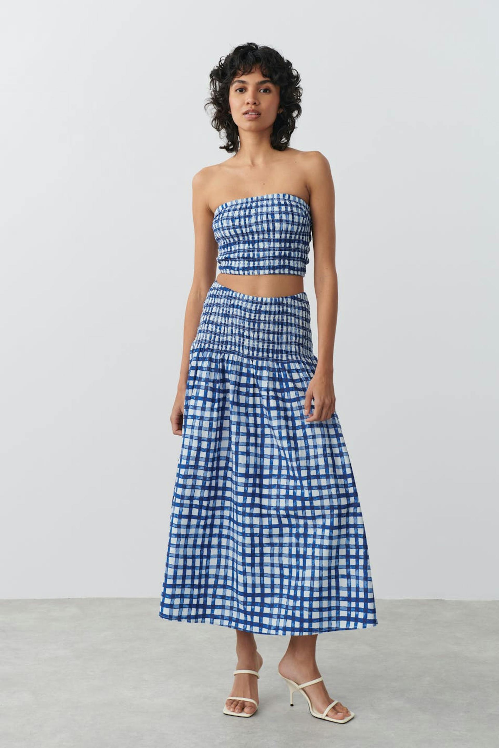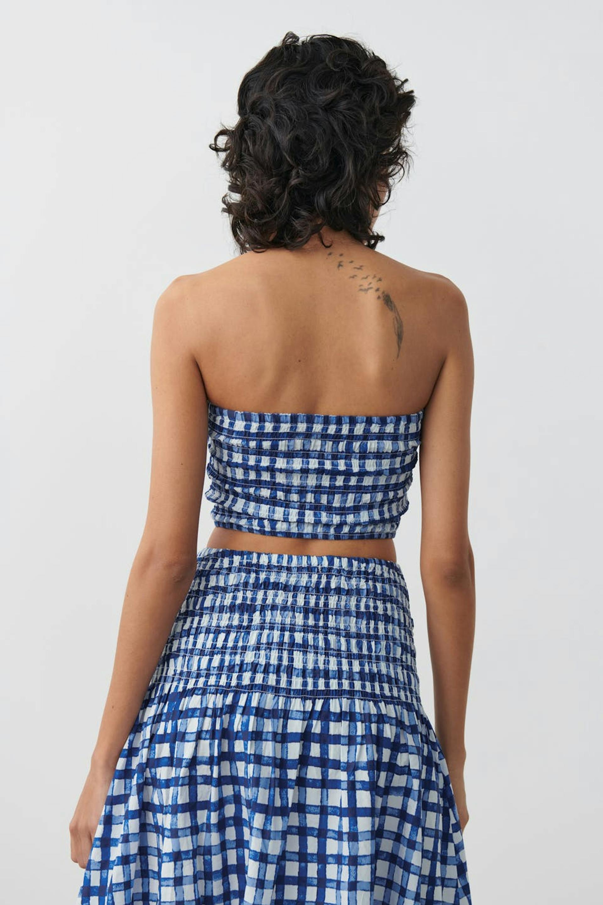 Smocked tube top with checked pattern. The top is blue and cropped and has sleeveless design.