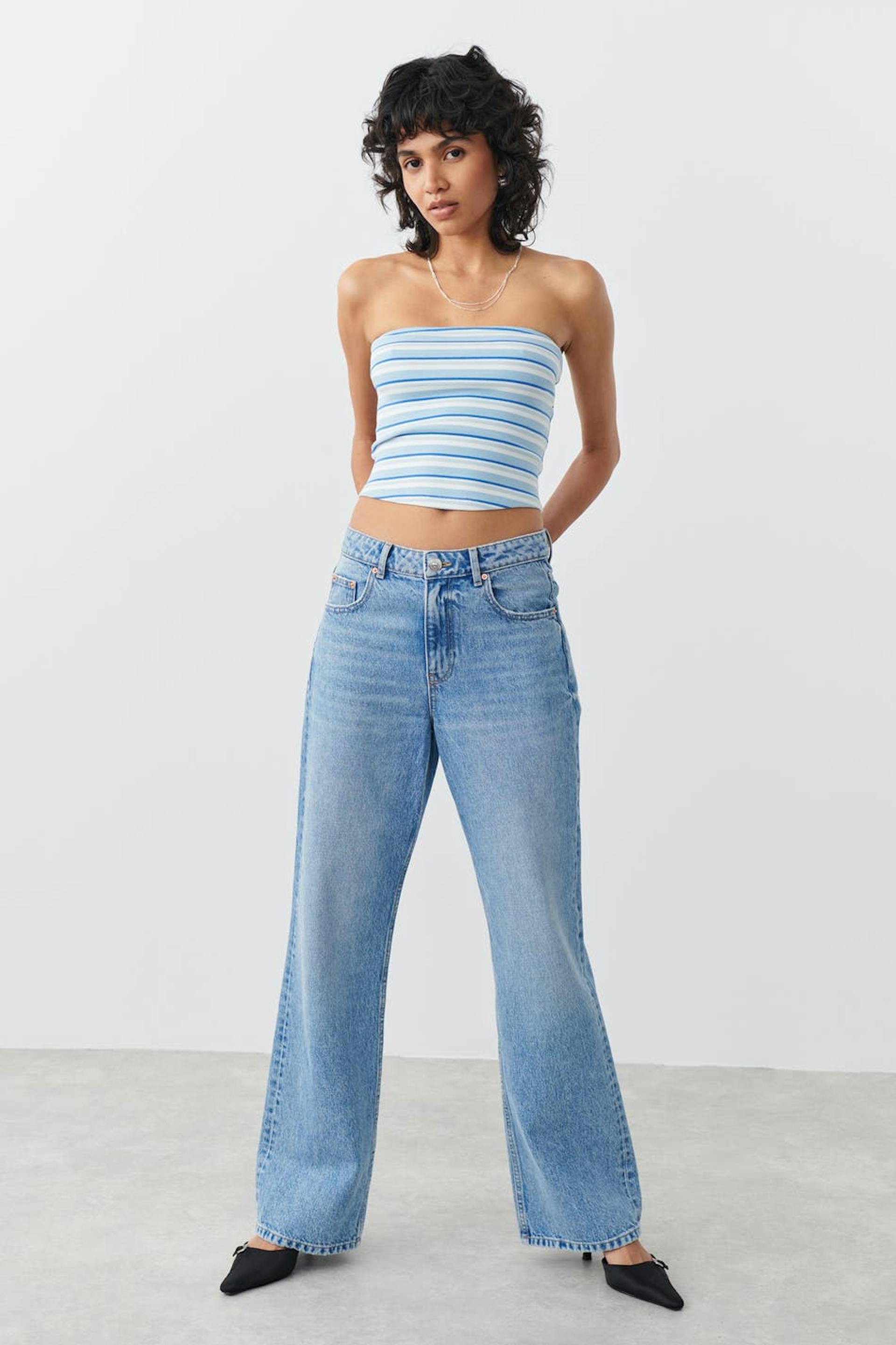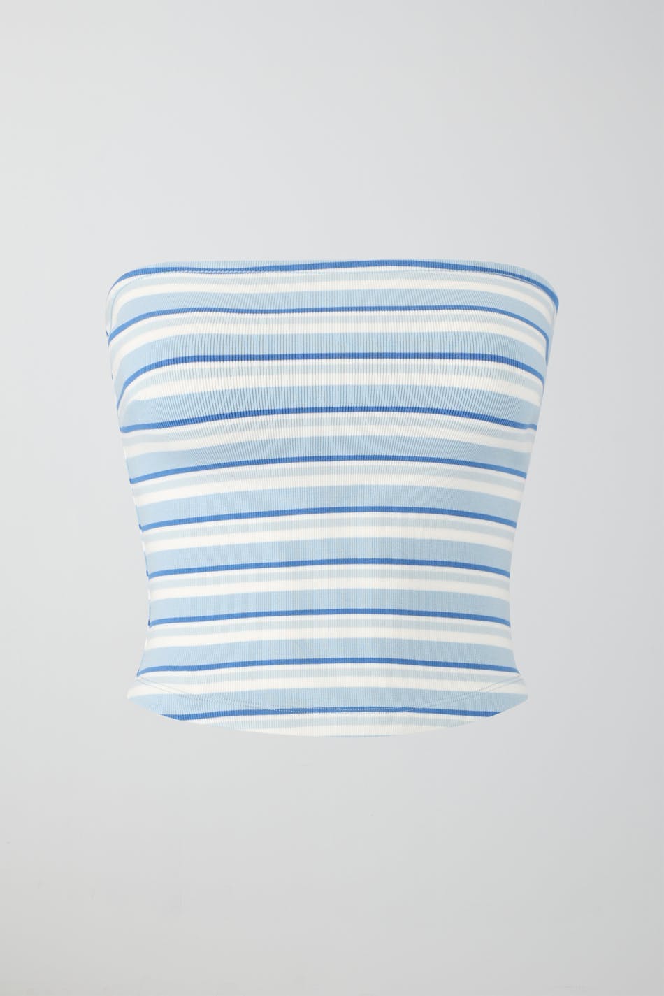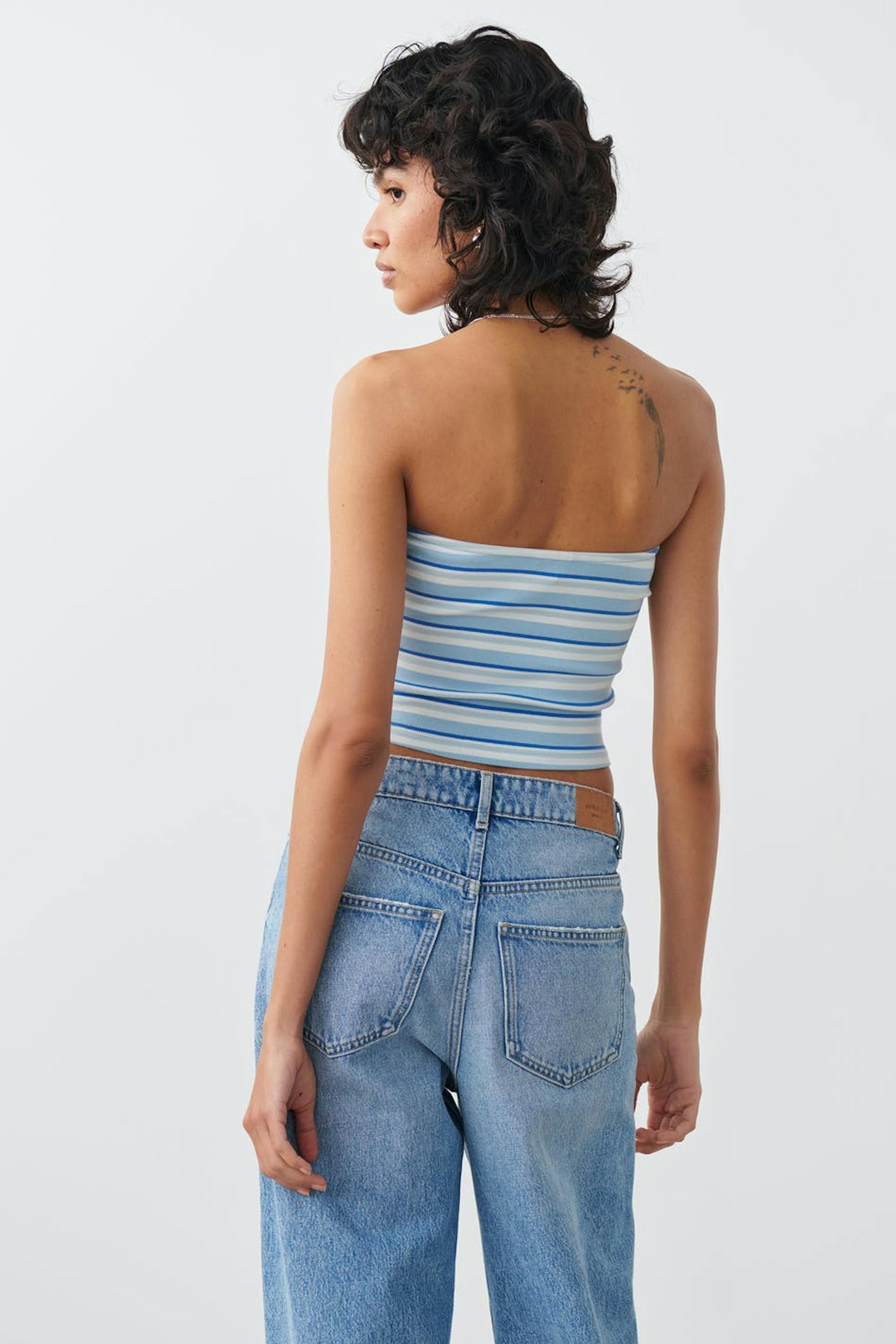 Striped tube top in jersey with figure-hugging fit. The top is blue, white and ribbed. It has cropped length.