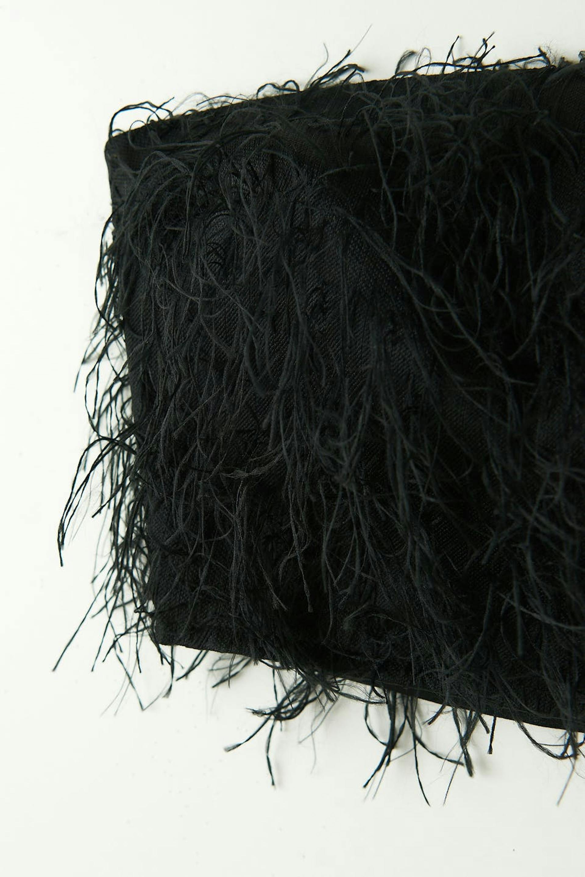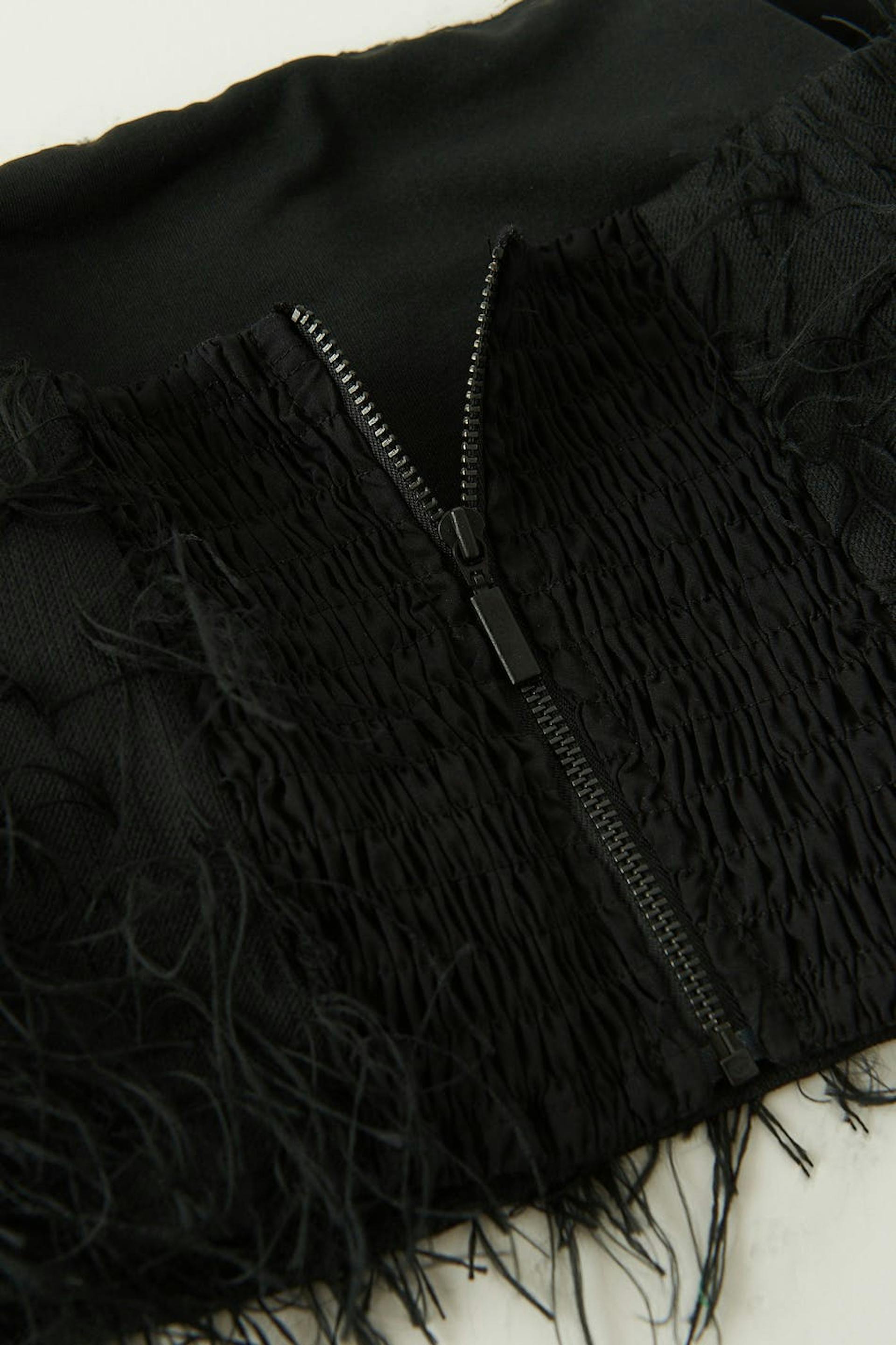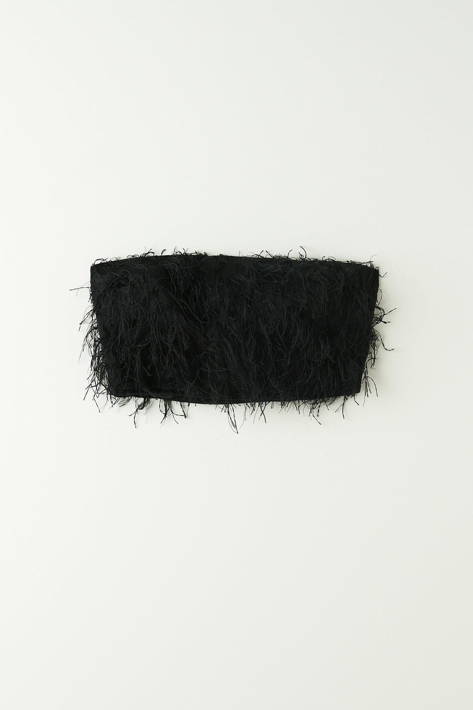 Tube top with feather details. The top is black and has a fitted, non-stretch fit. It has zip in the back and a cropped length.