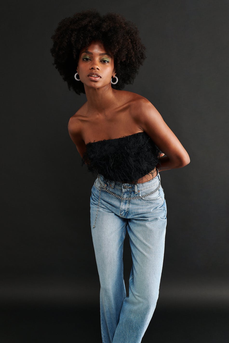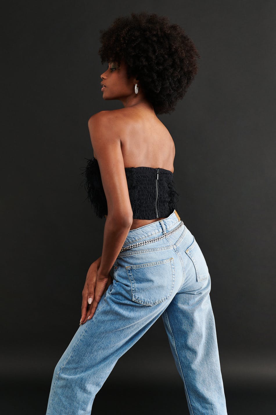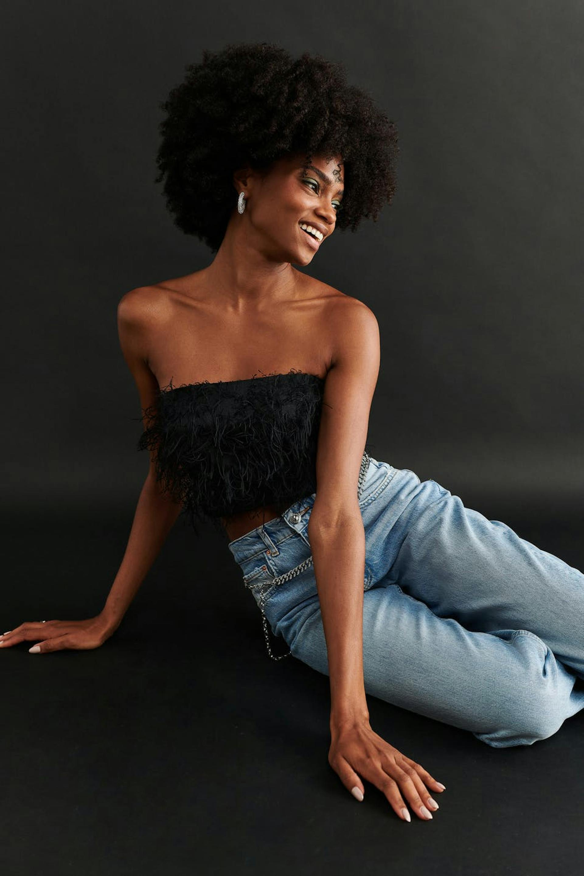 Tube top with feather details. The top is black and has a fitted, non-stretch fit. It has zip in the back and a cropped length.