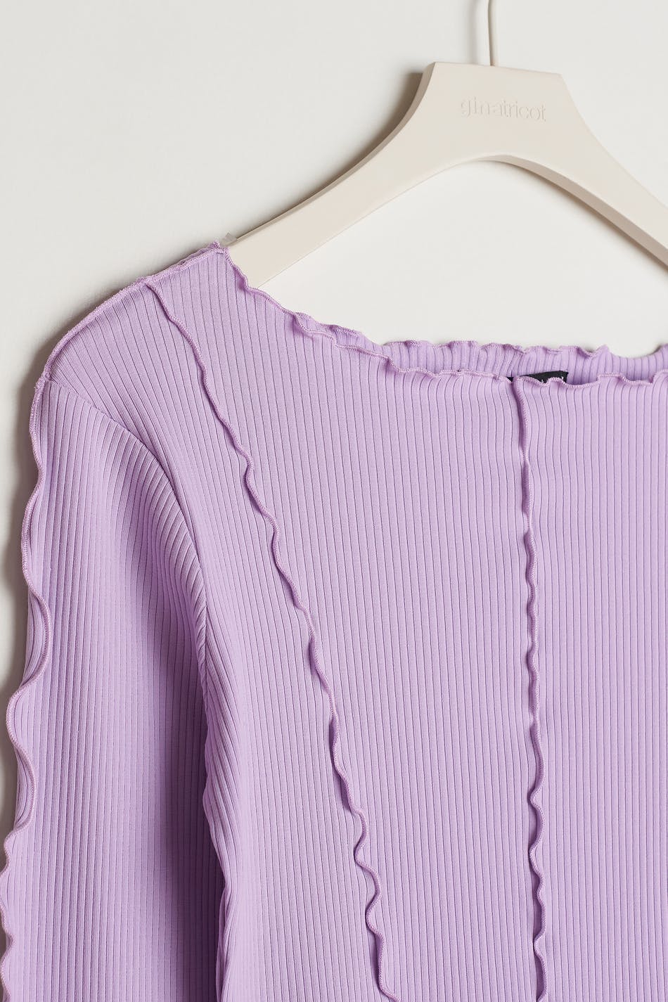 Ribbed top with a fitted fit. The top is purple and long-sleeved and has a boat neck at the top. It has small, decorative ruffle details at the front and at hem.