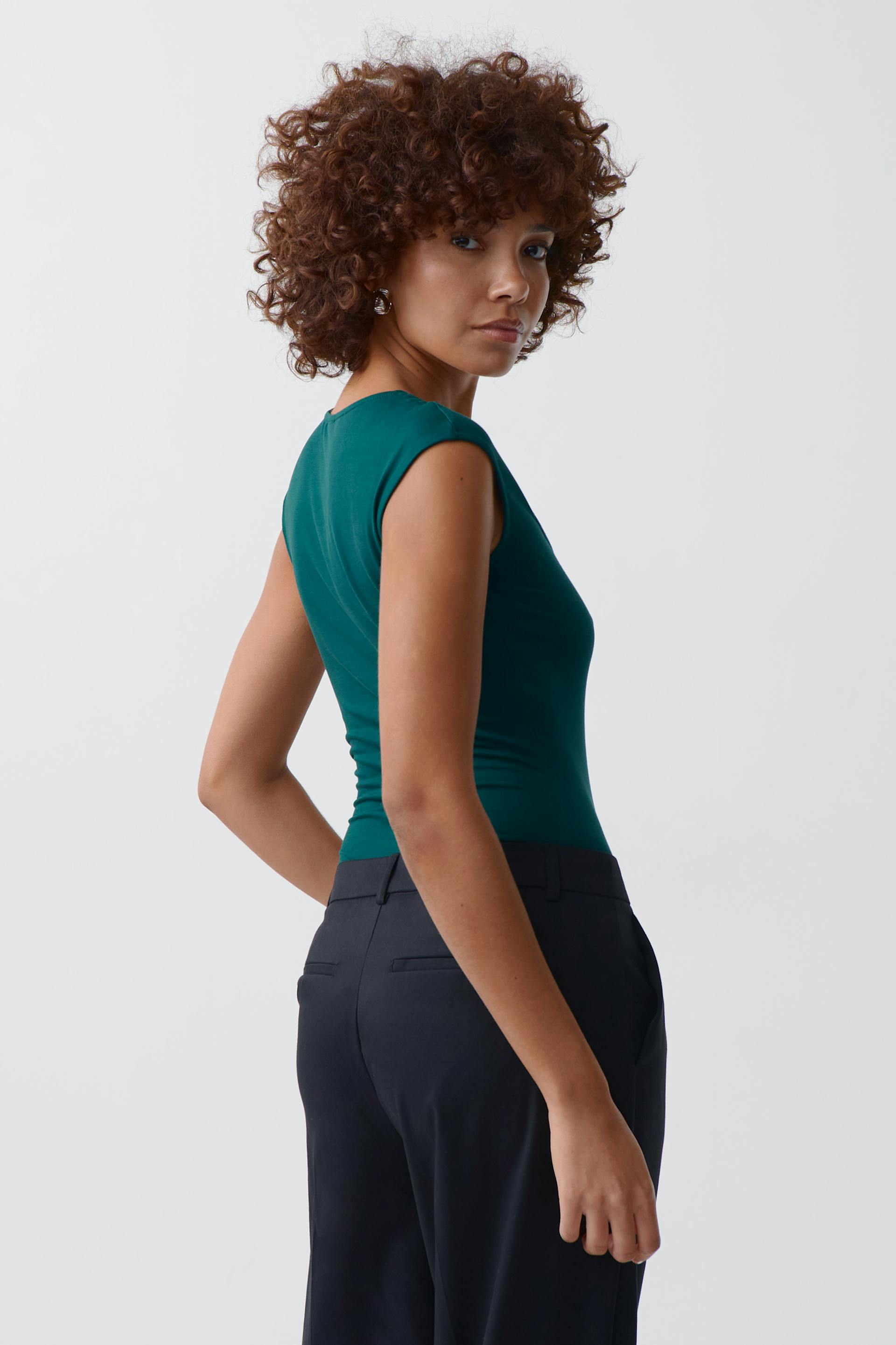 Sleeveless bodysuit in soft viscose with square neckline. The bodysuit is green and has buttoning at the crotch. It has figure-hugging fit and stretchy quality.