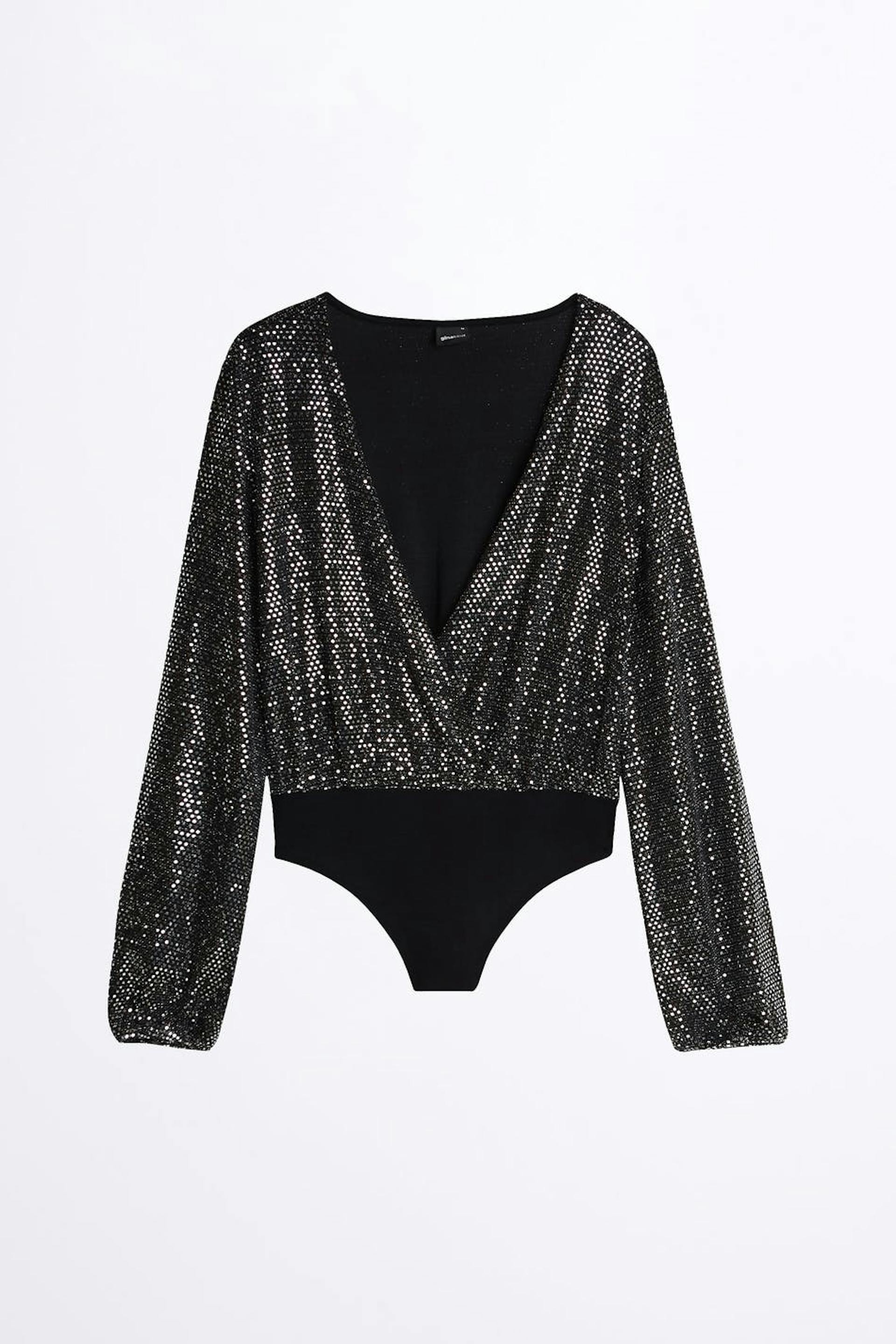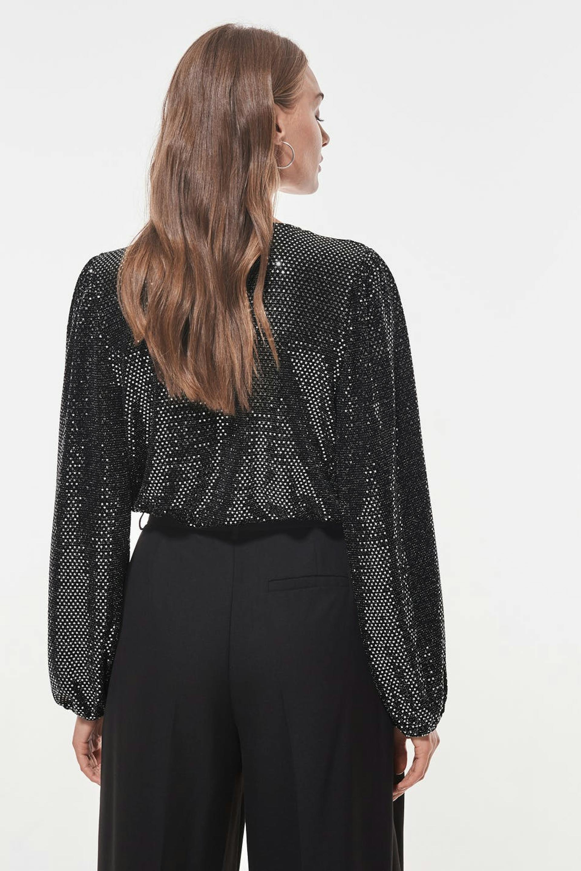 Jersey body with silver sequinces. Wrap at front and puffed sleeves Supplier: Pick & Choose AB Production unit: Giga tekstil san ve Dis tic Ltd sti