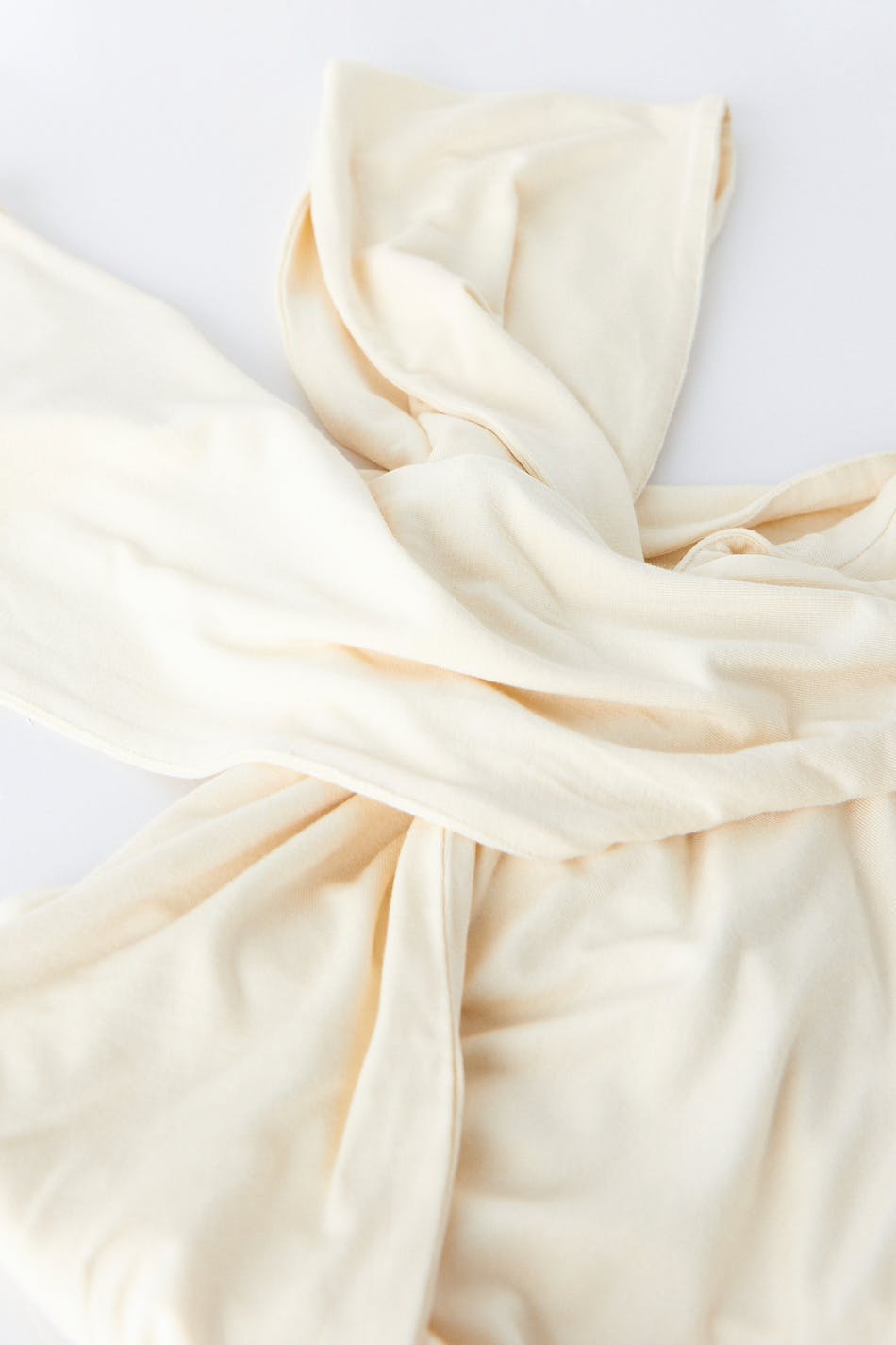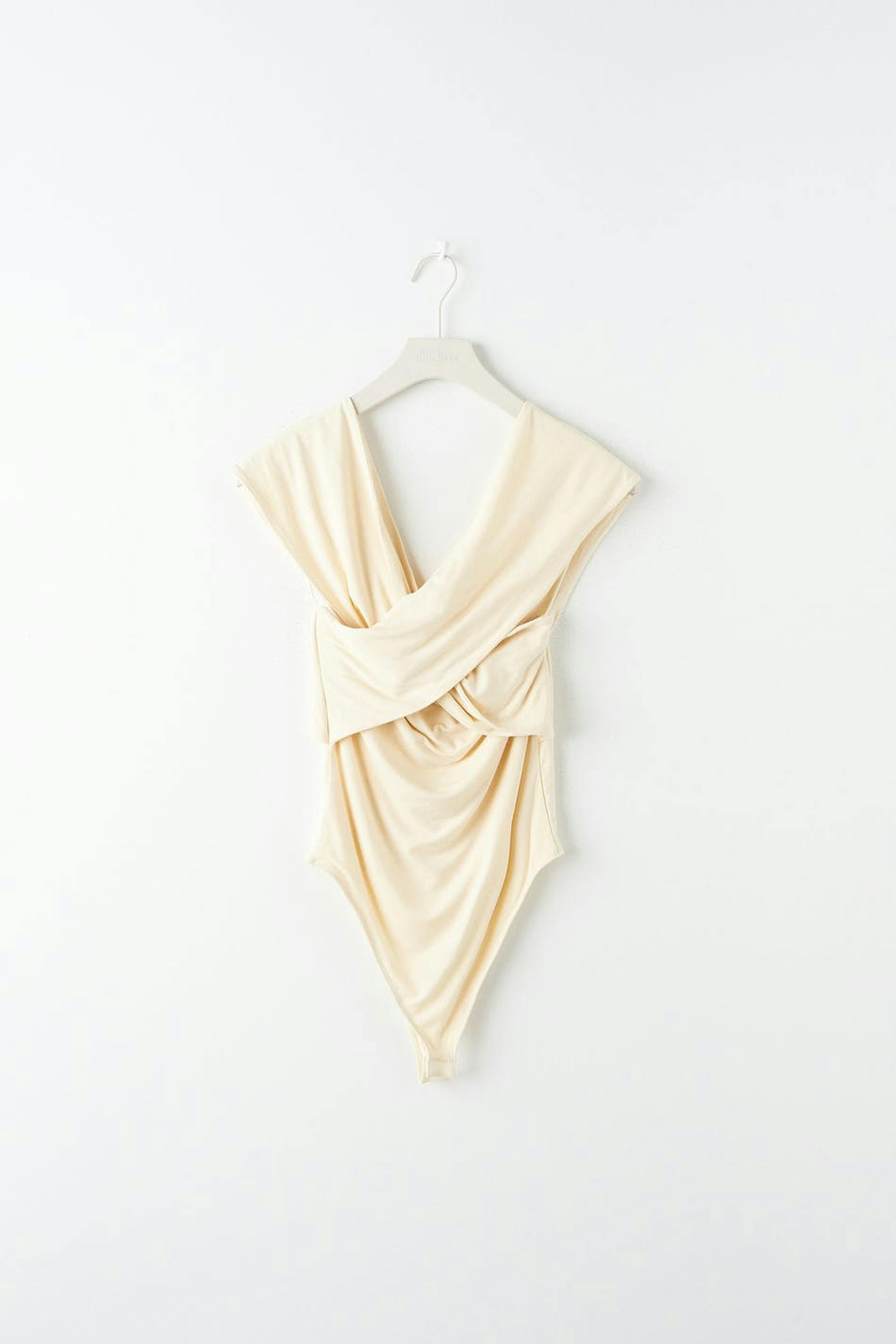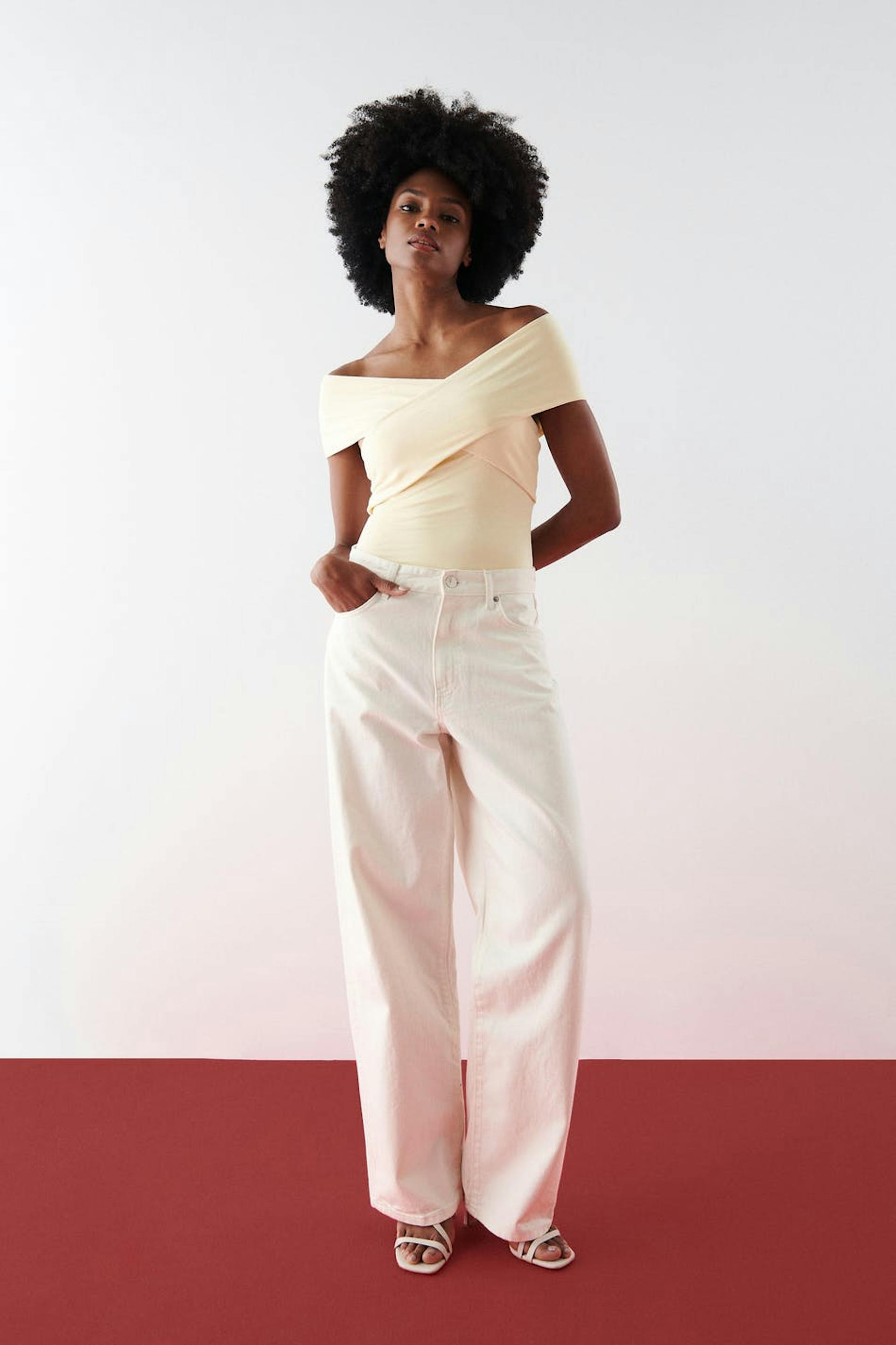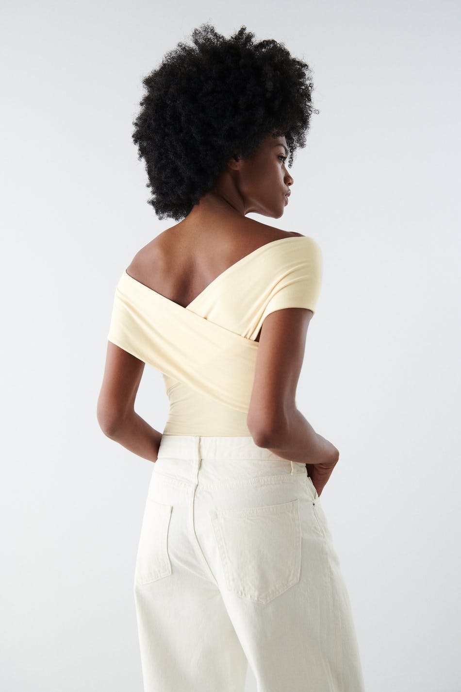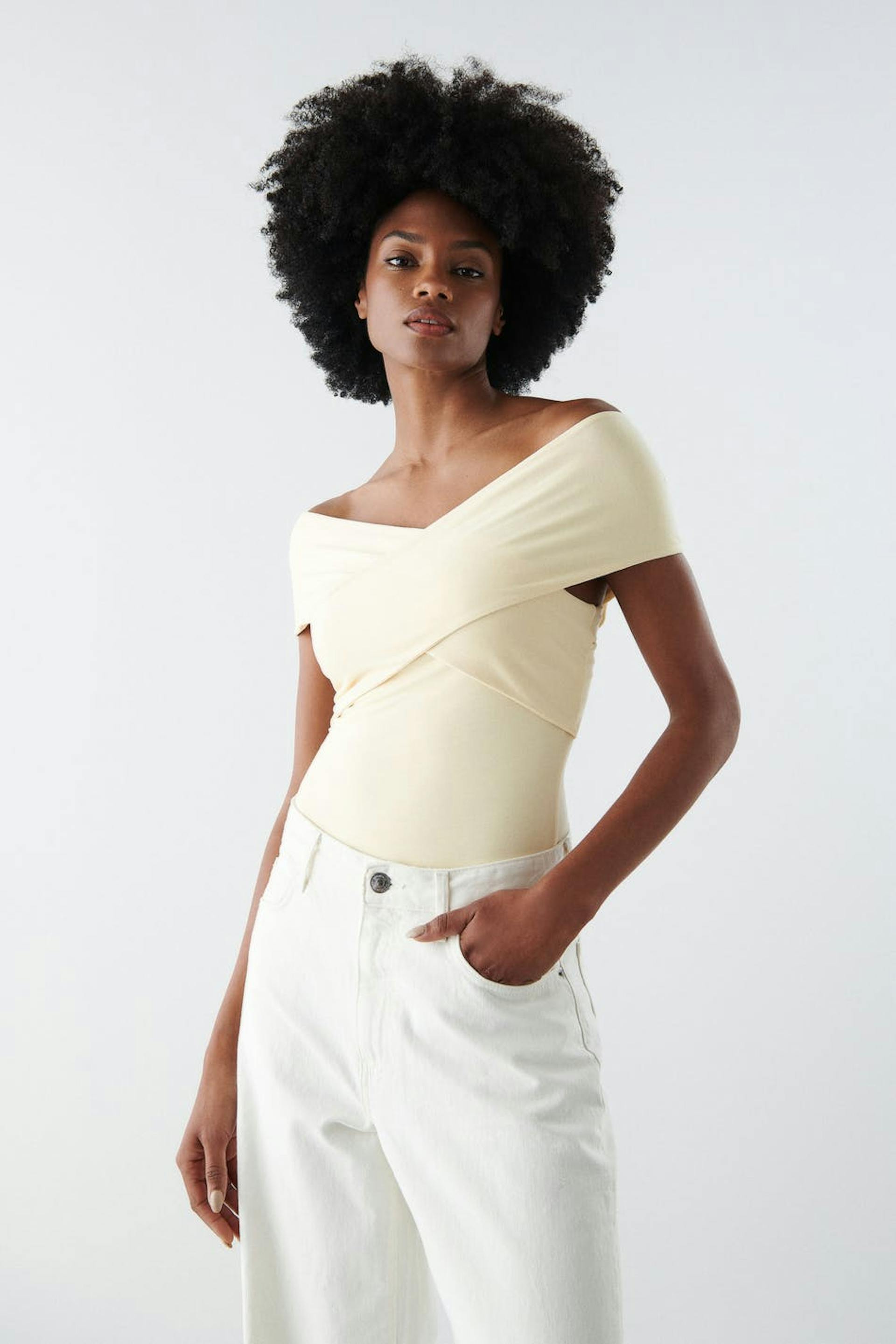 Hanna MW X Gina Tricot. Body in CIRCULOSE® viscose with wrap design. The body is yellow and has a fitted fit. It has a button placket at the crotch.