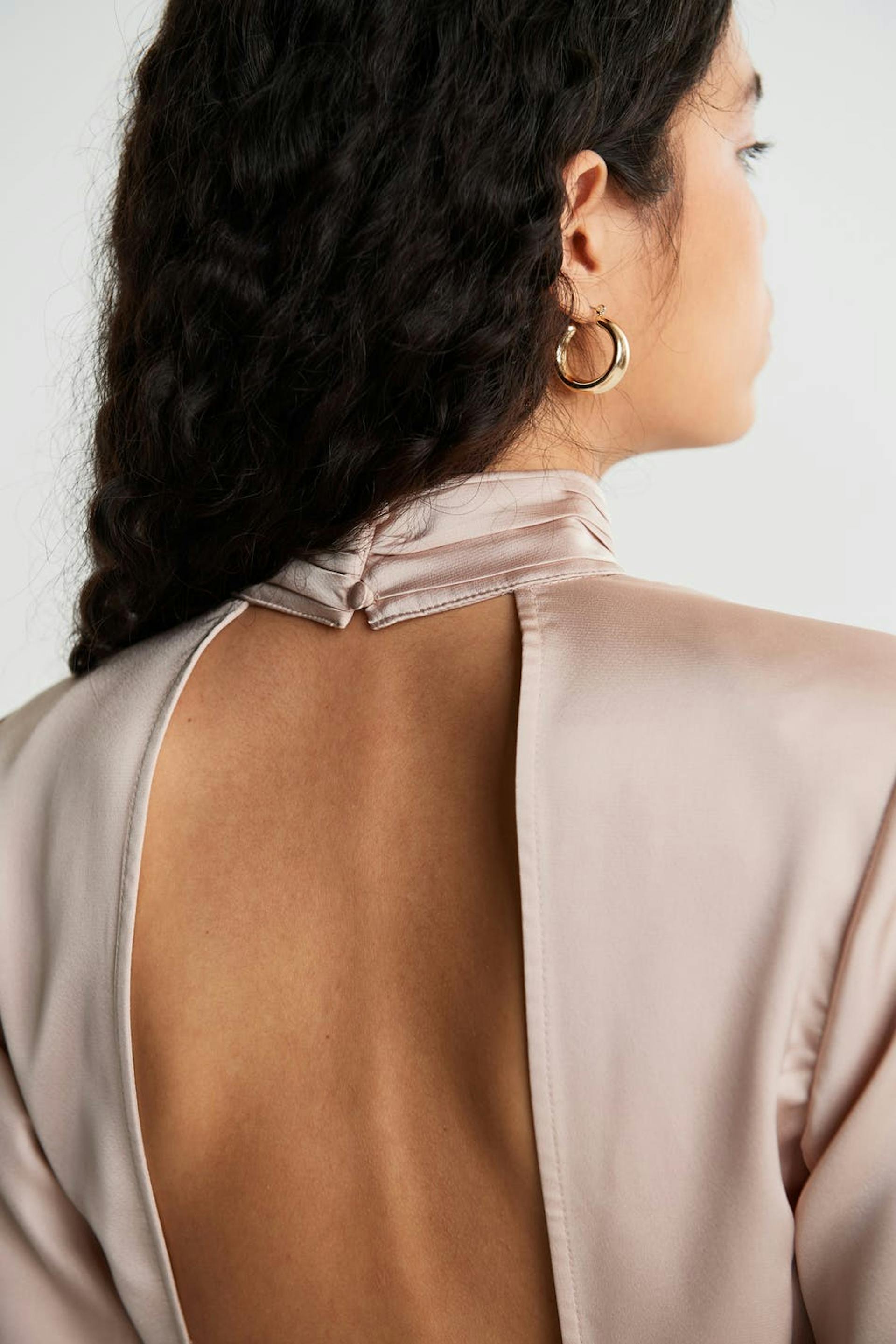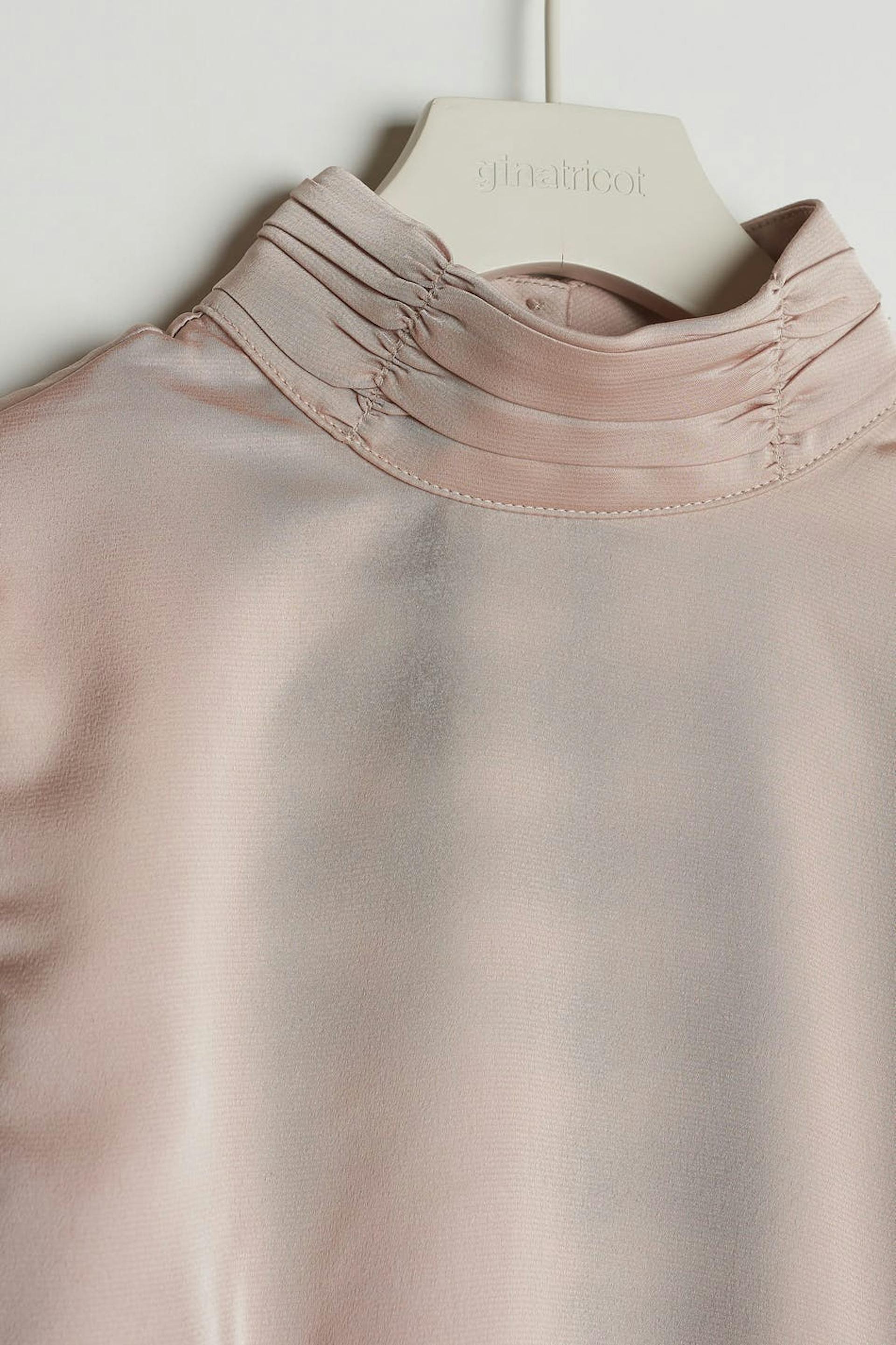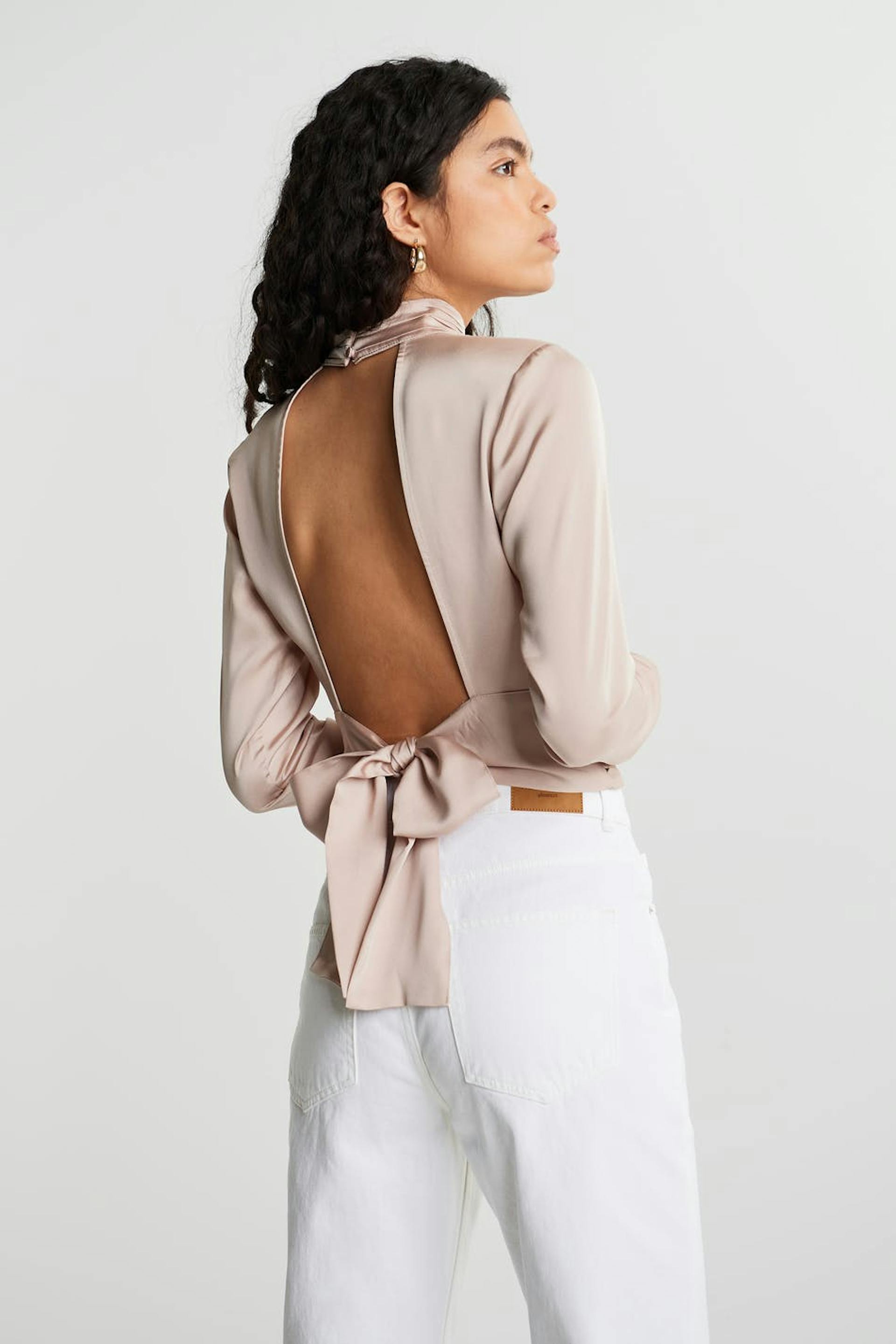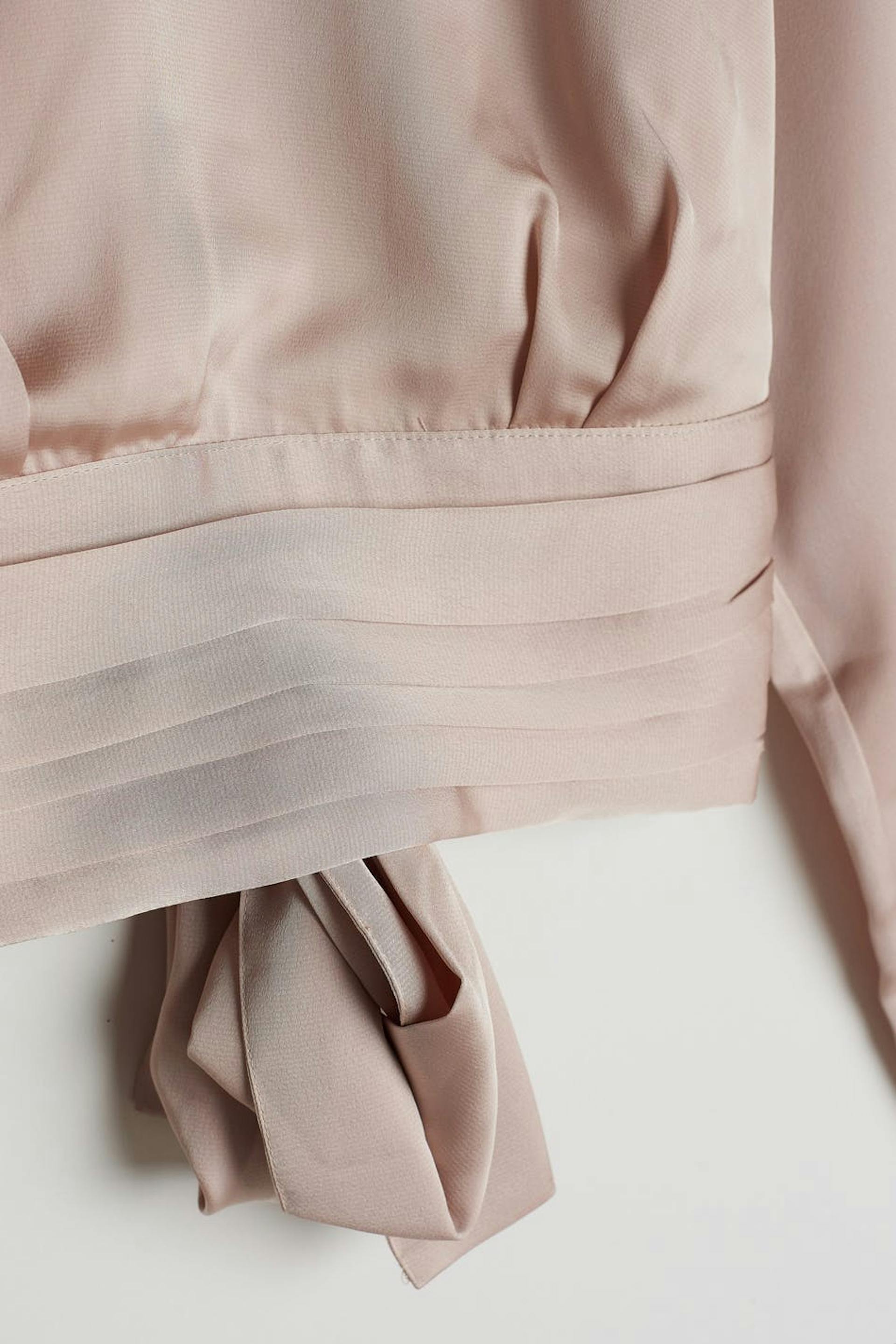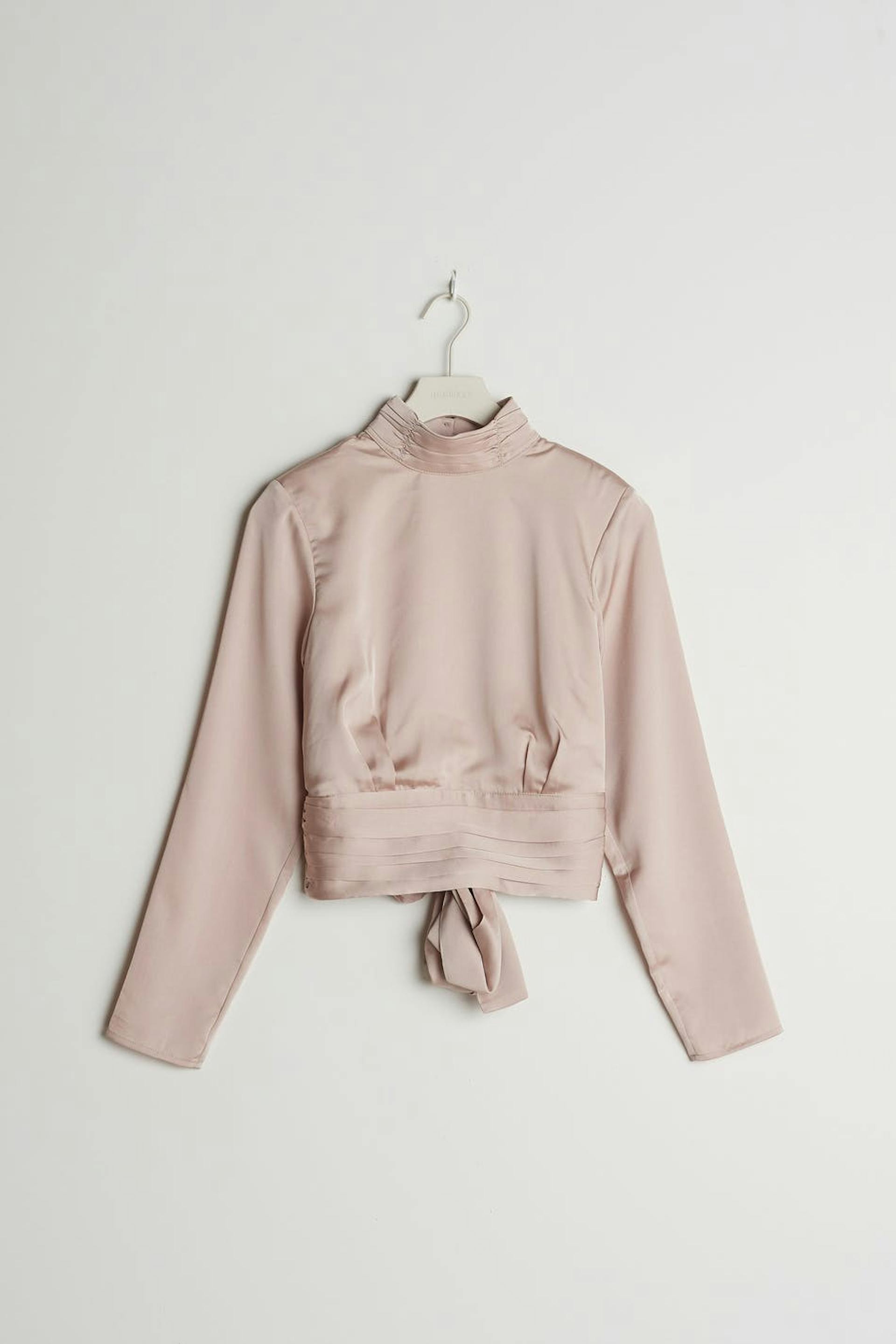 Long-sleeved top with an open back design. The top is perfect for the party and light pink and has a self-tie at the back. It has a high neckline with button placket at the neck and ruched details on the neckline and at the waist.