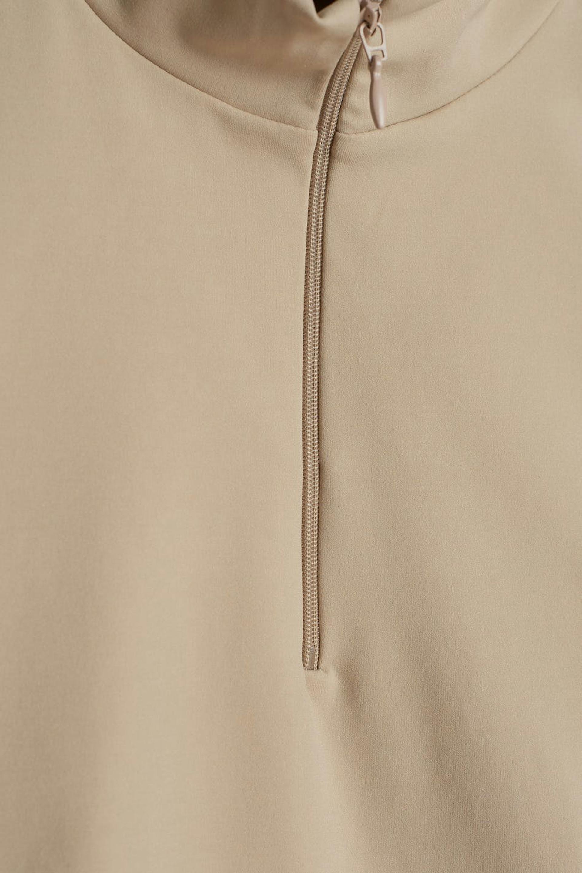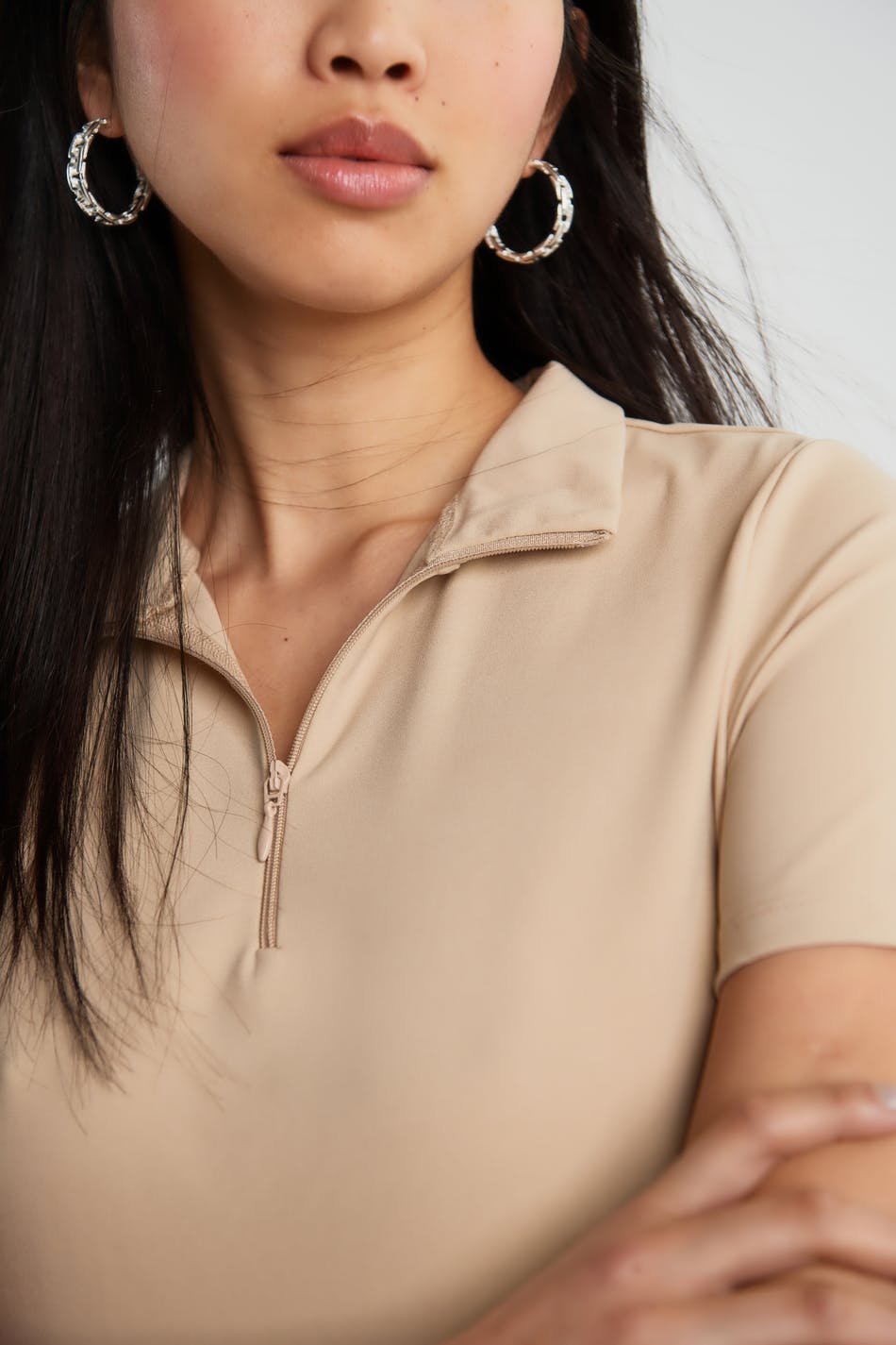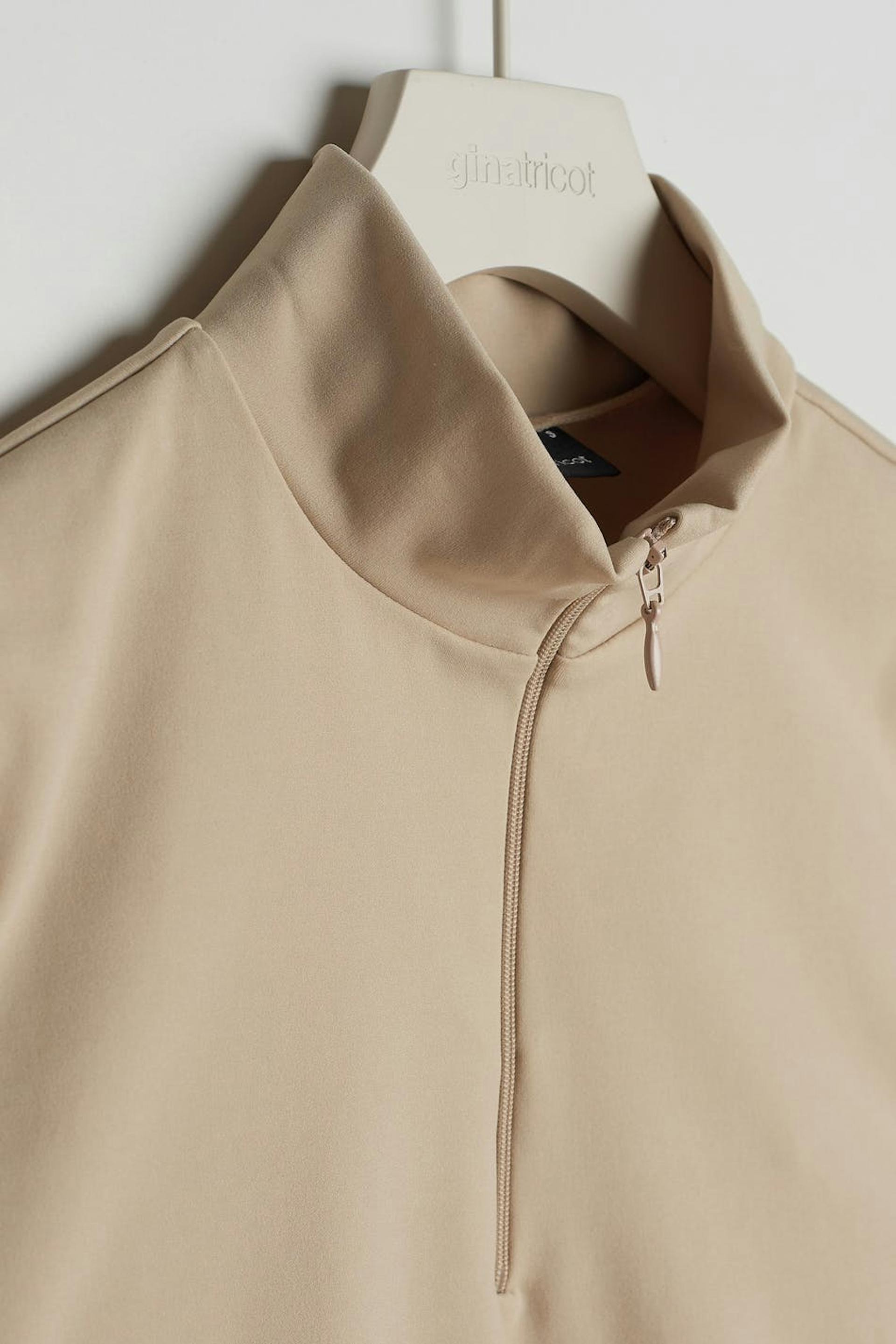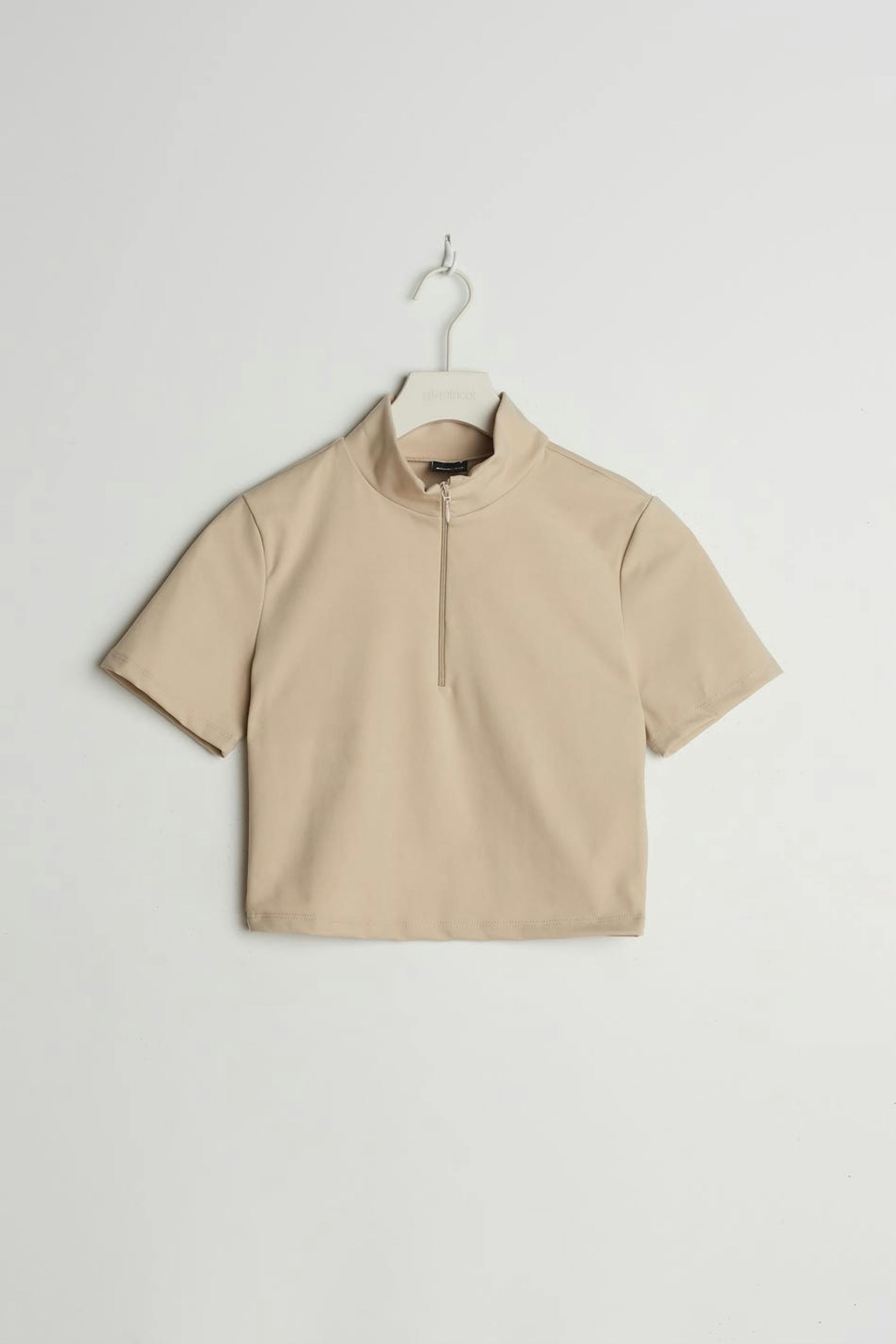 Cropped top with a fitted fit. The top is beige and has short sleeves. It is made of jersey and has a zip to the neck and a collar.