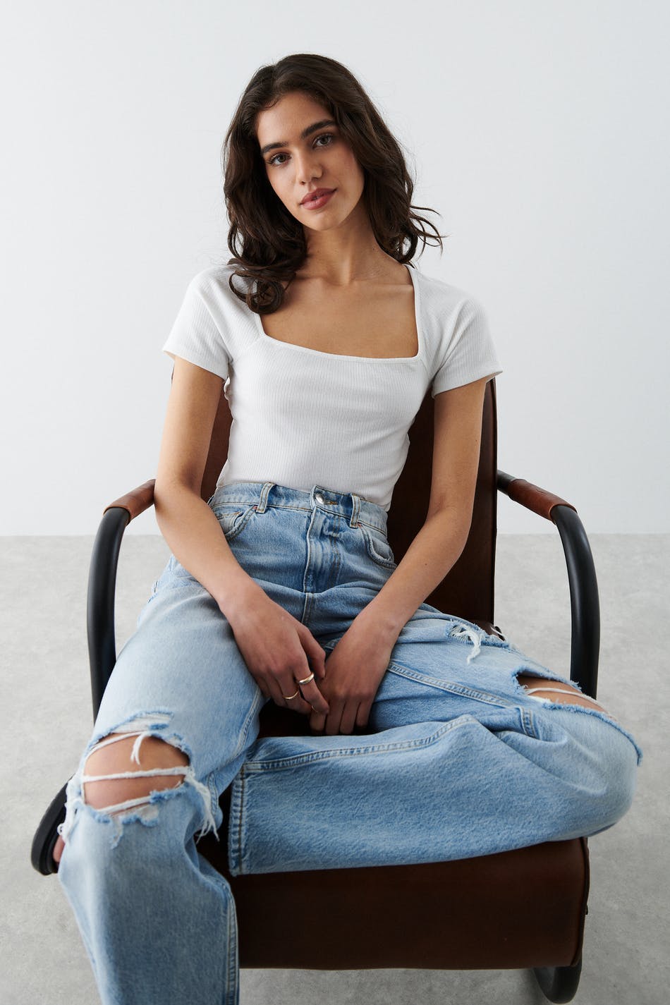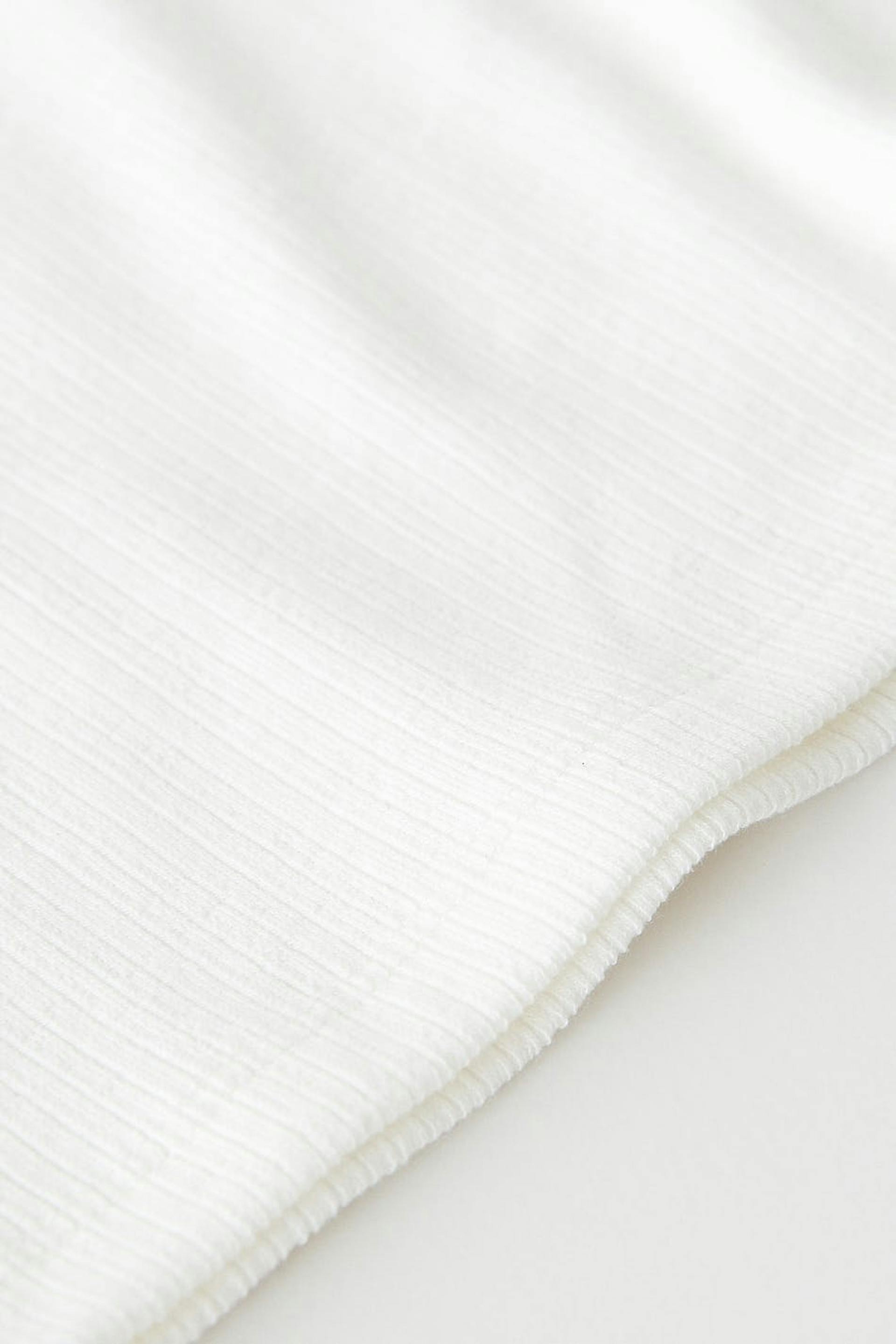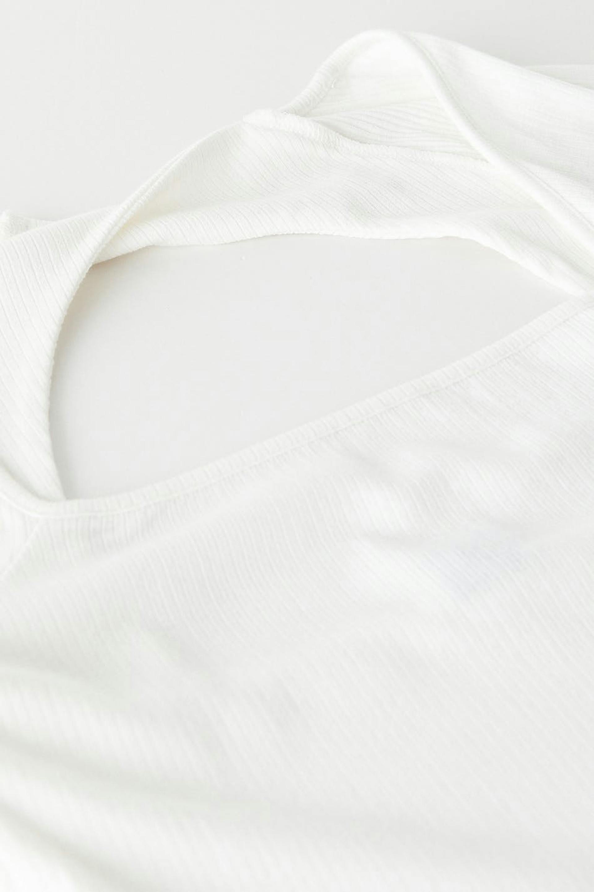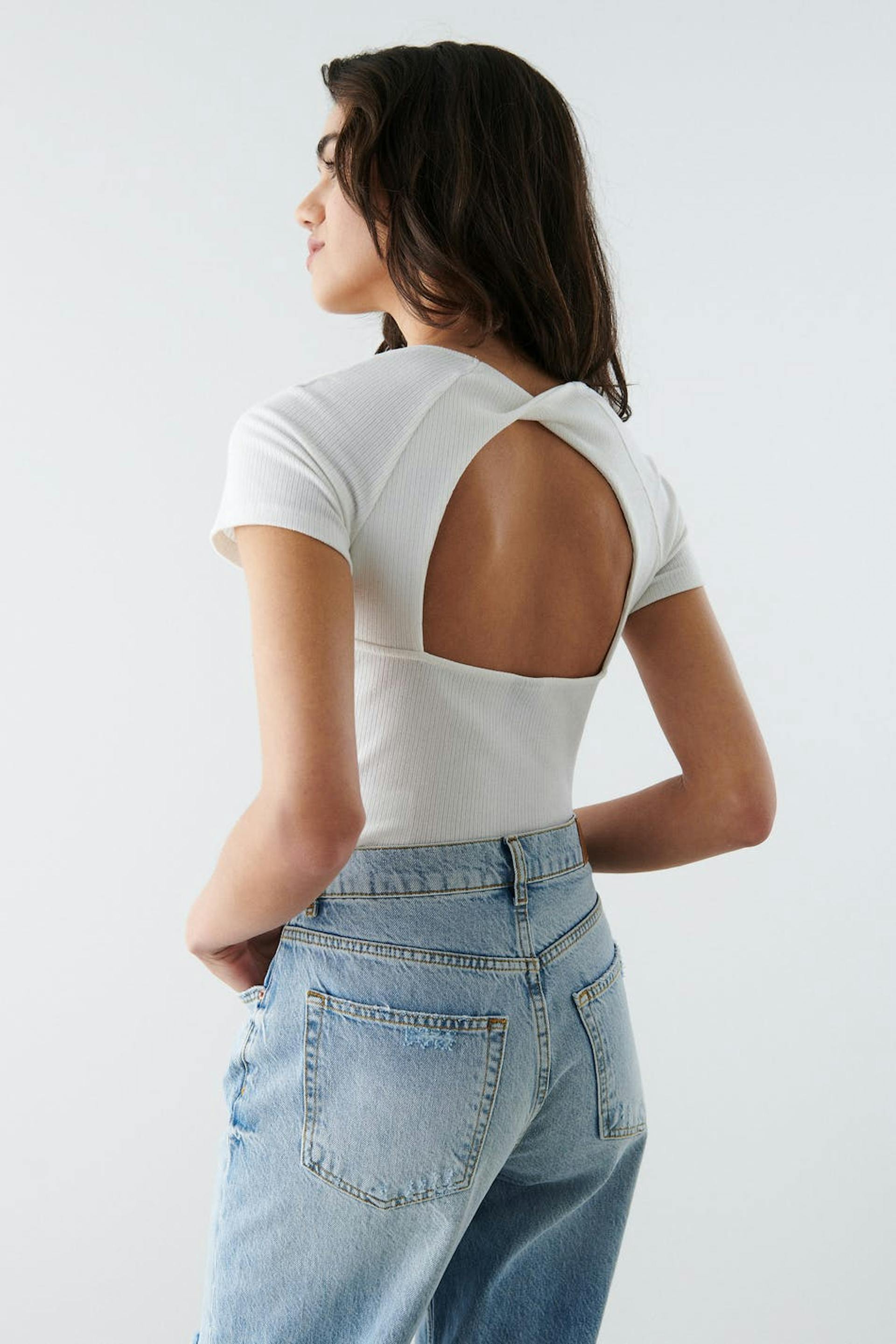 Short-sleeved top in jersey with square neckline at the front. The top is white and ribbed and has open back design with a twisted detail.