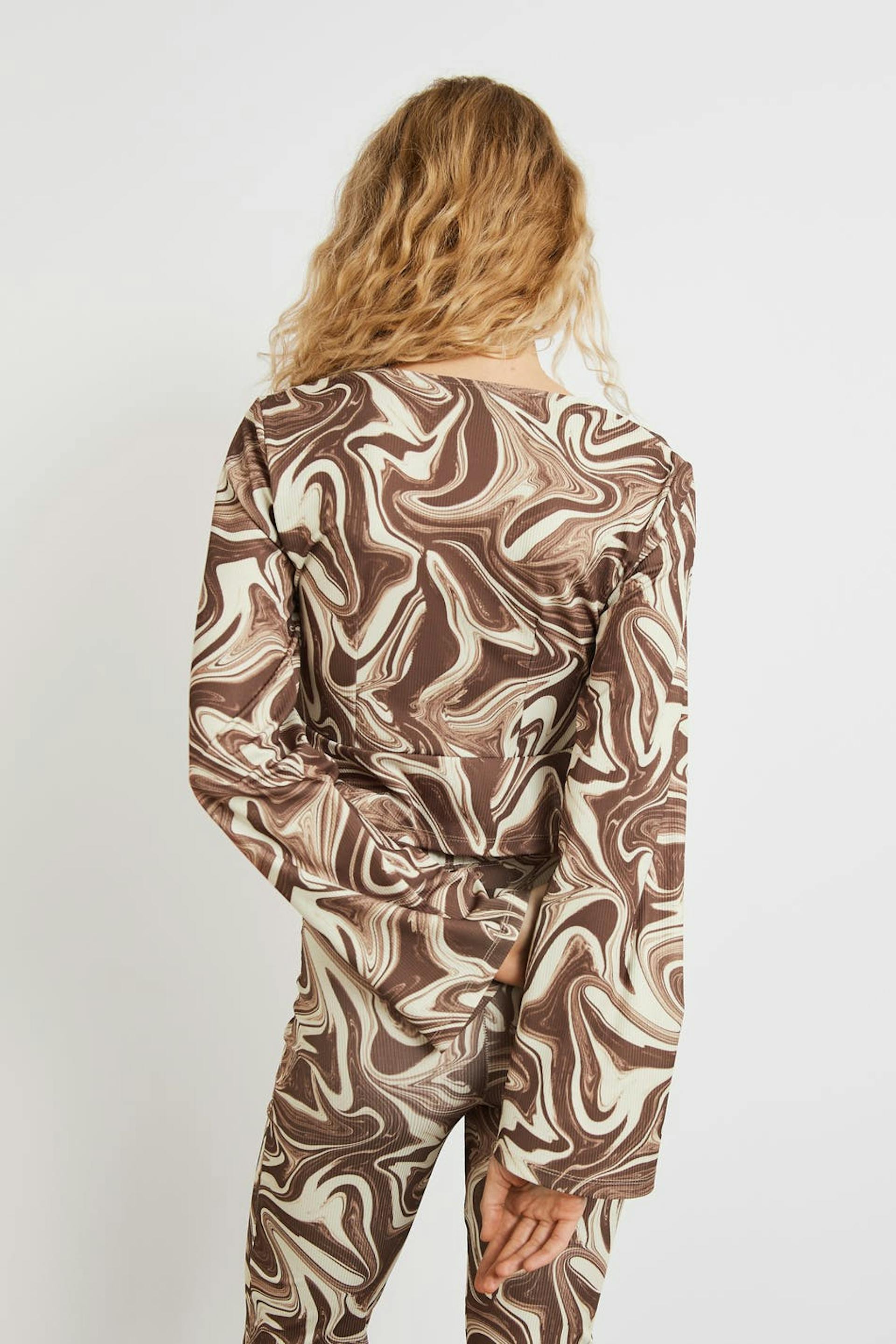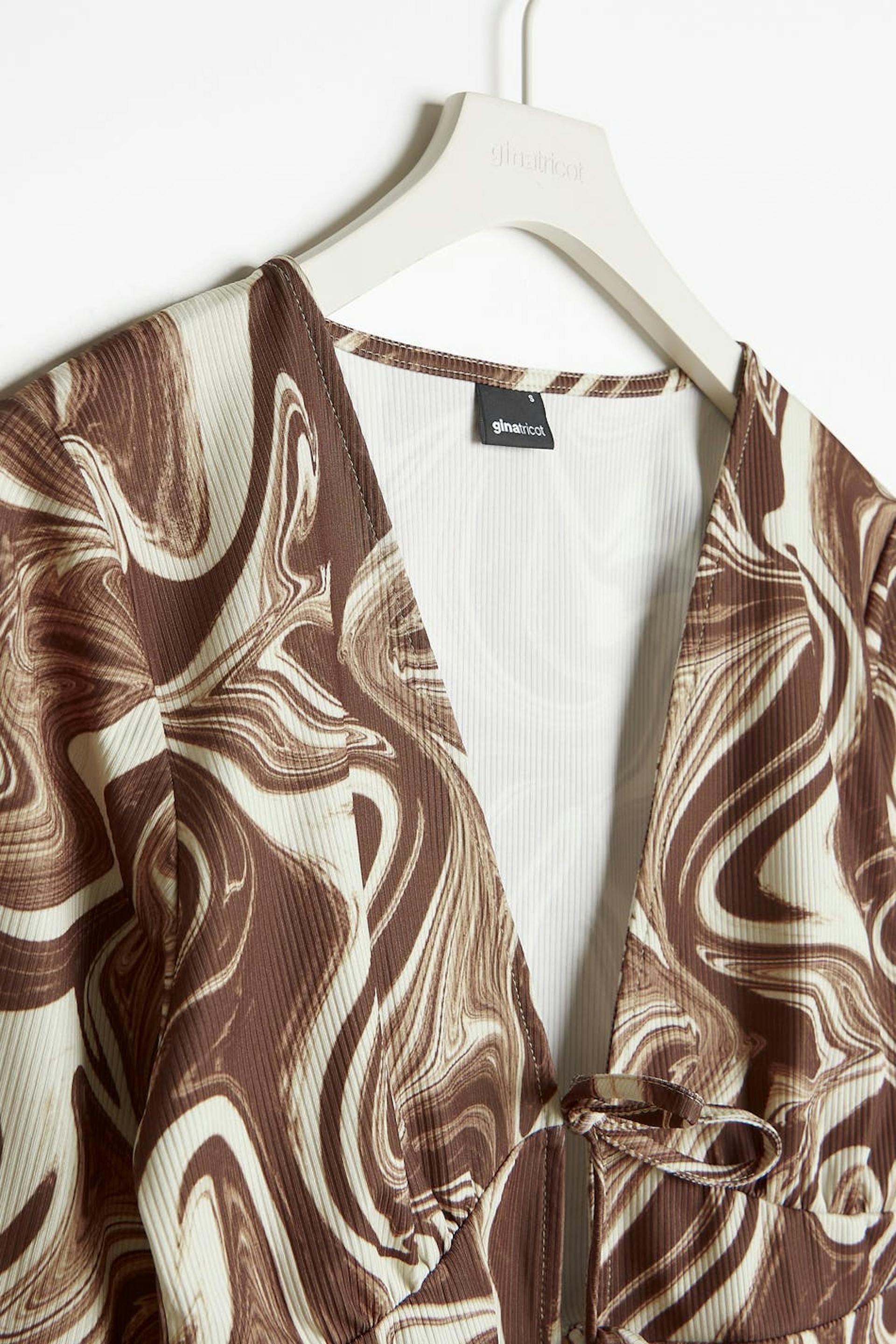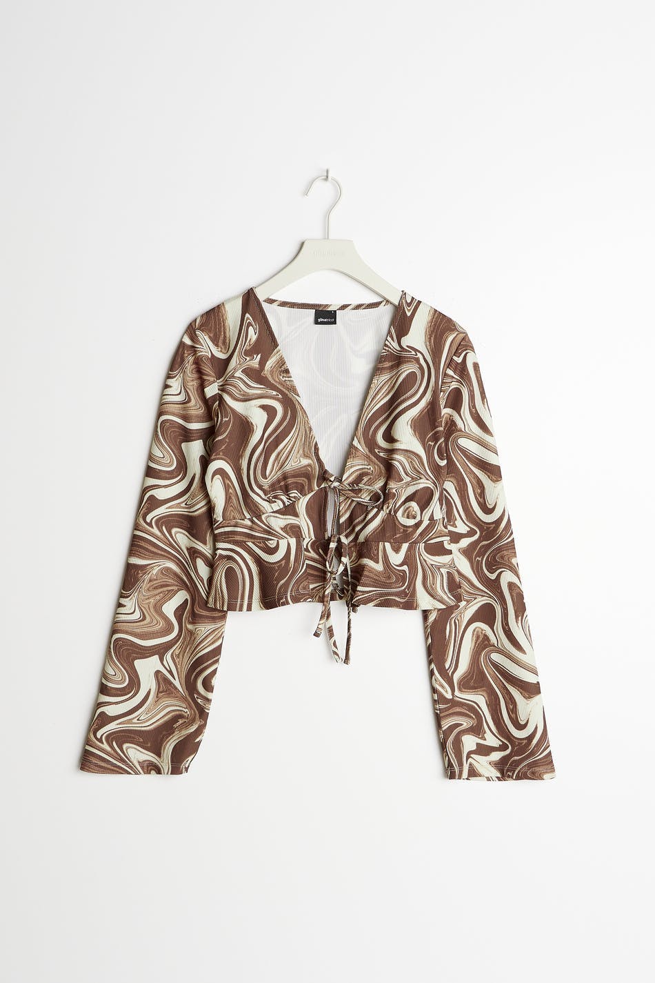 Jersey blouse with self-tie in front. The blouse is brown, swirl patterned and long-sleeved. It has a ribbed quality, V-neck, fitted fit, frills at the bottom hem and a short length.