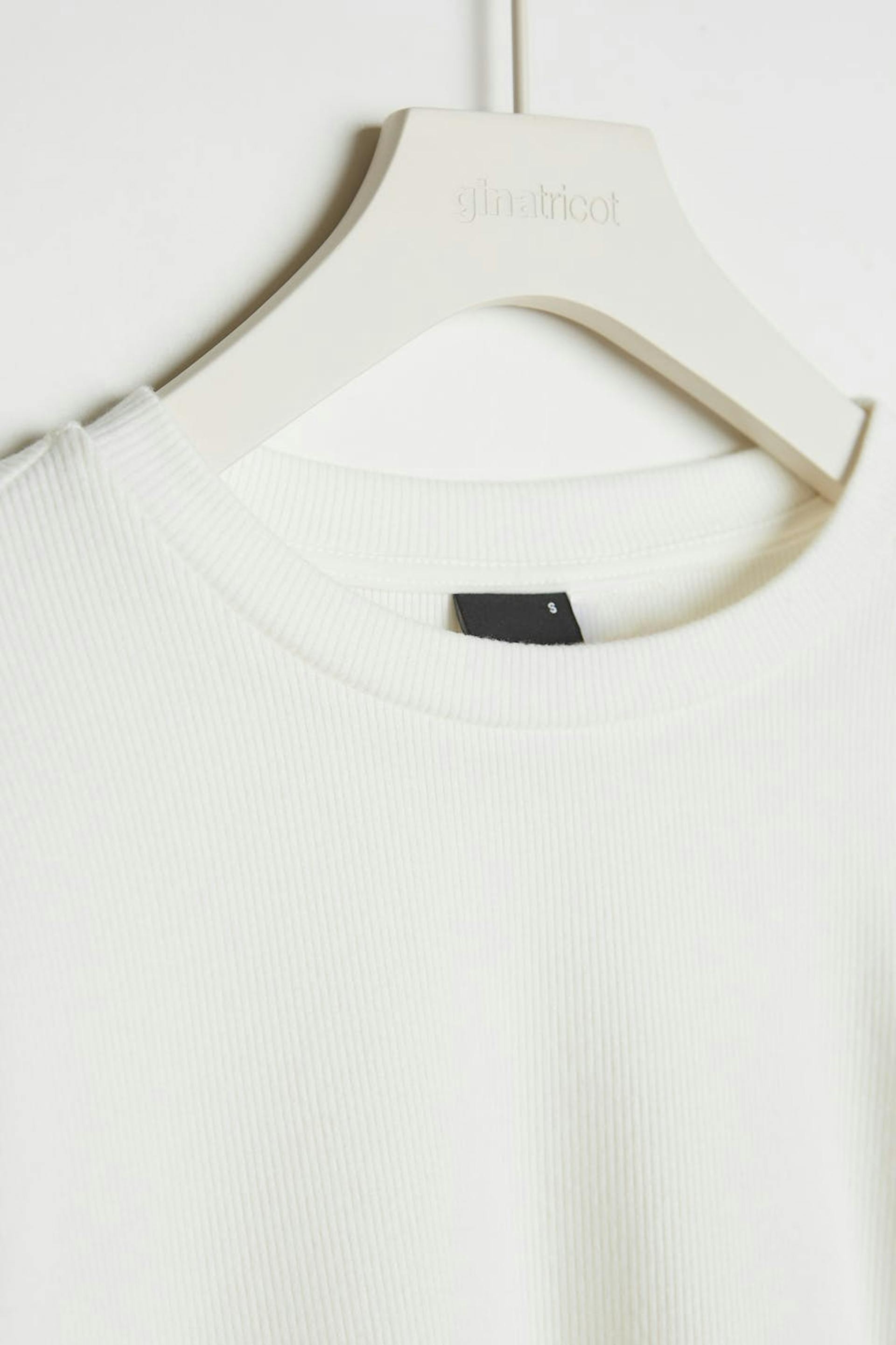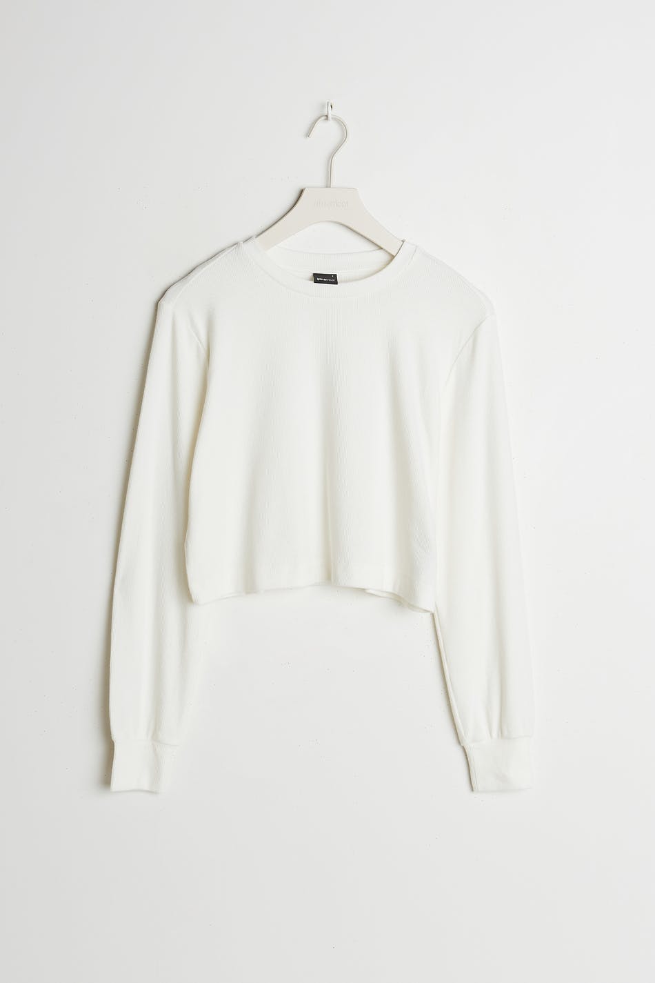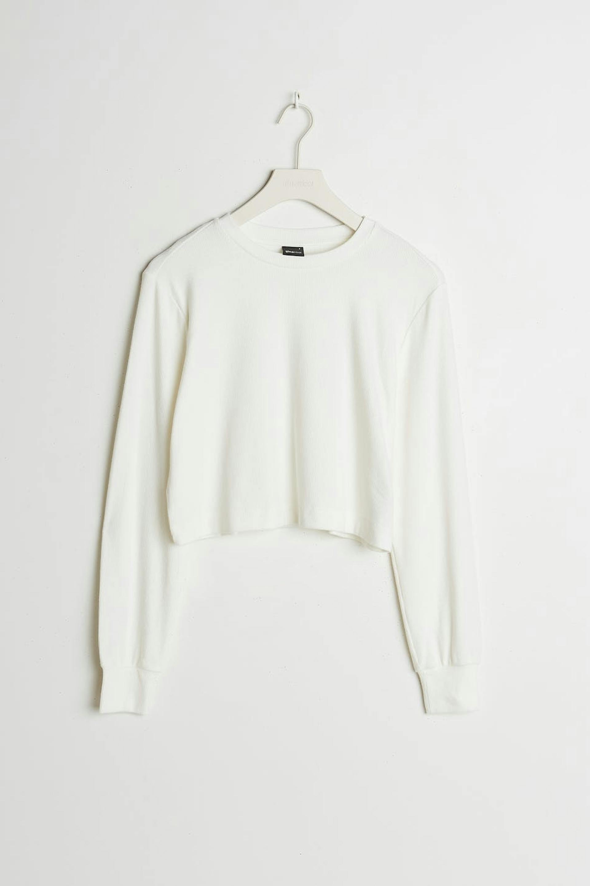 Cropped top. The top is beige, long-sleeved and rib-knit.