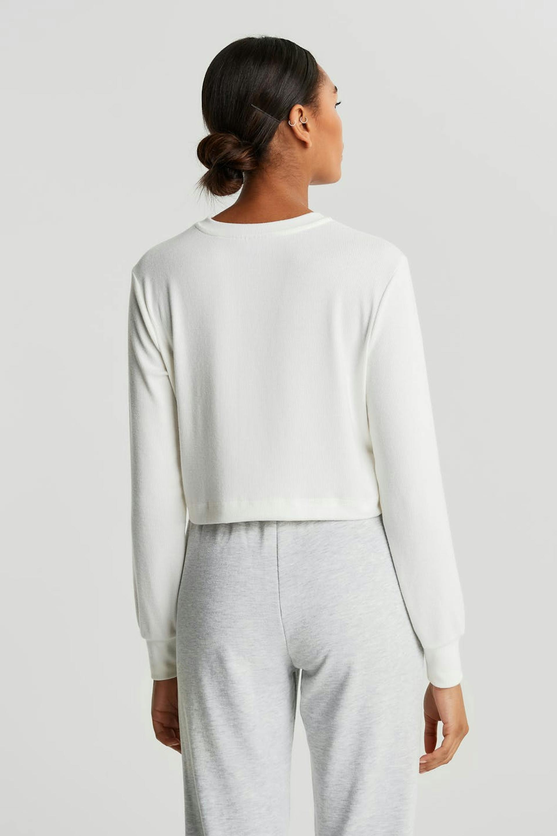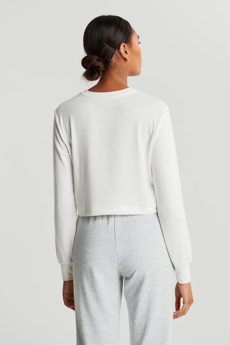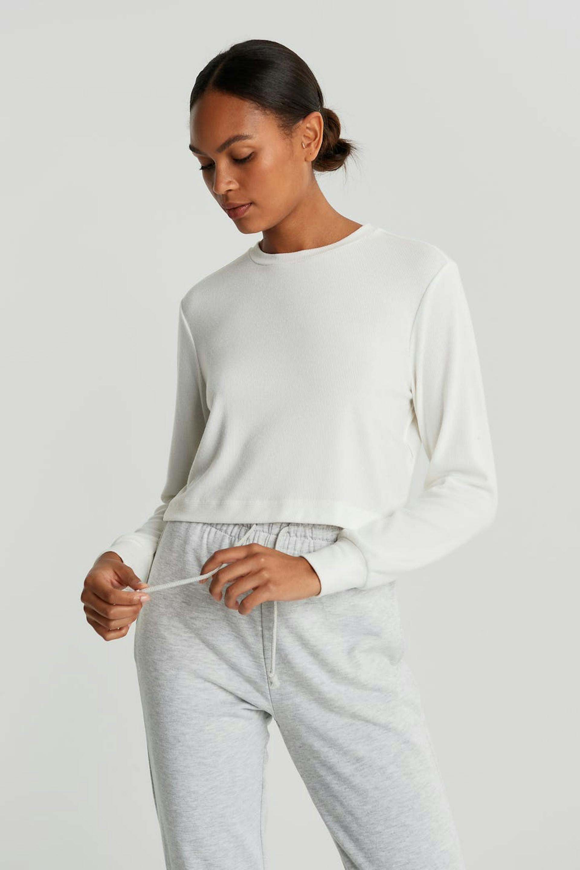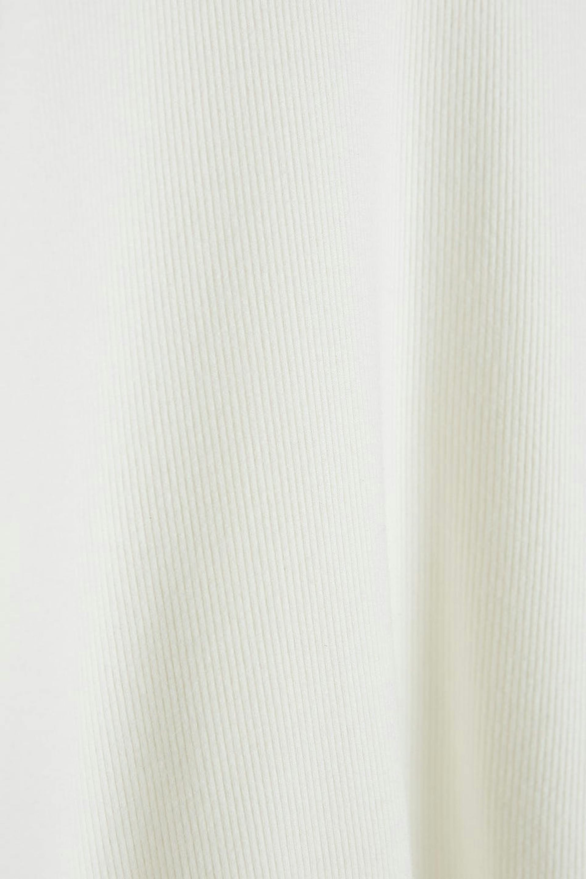 Cropped top. The top is beige, long-sleeved and rib-knit.