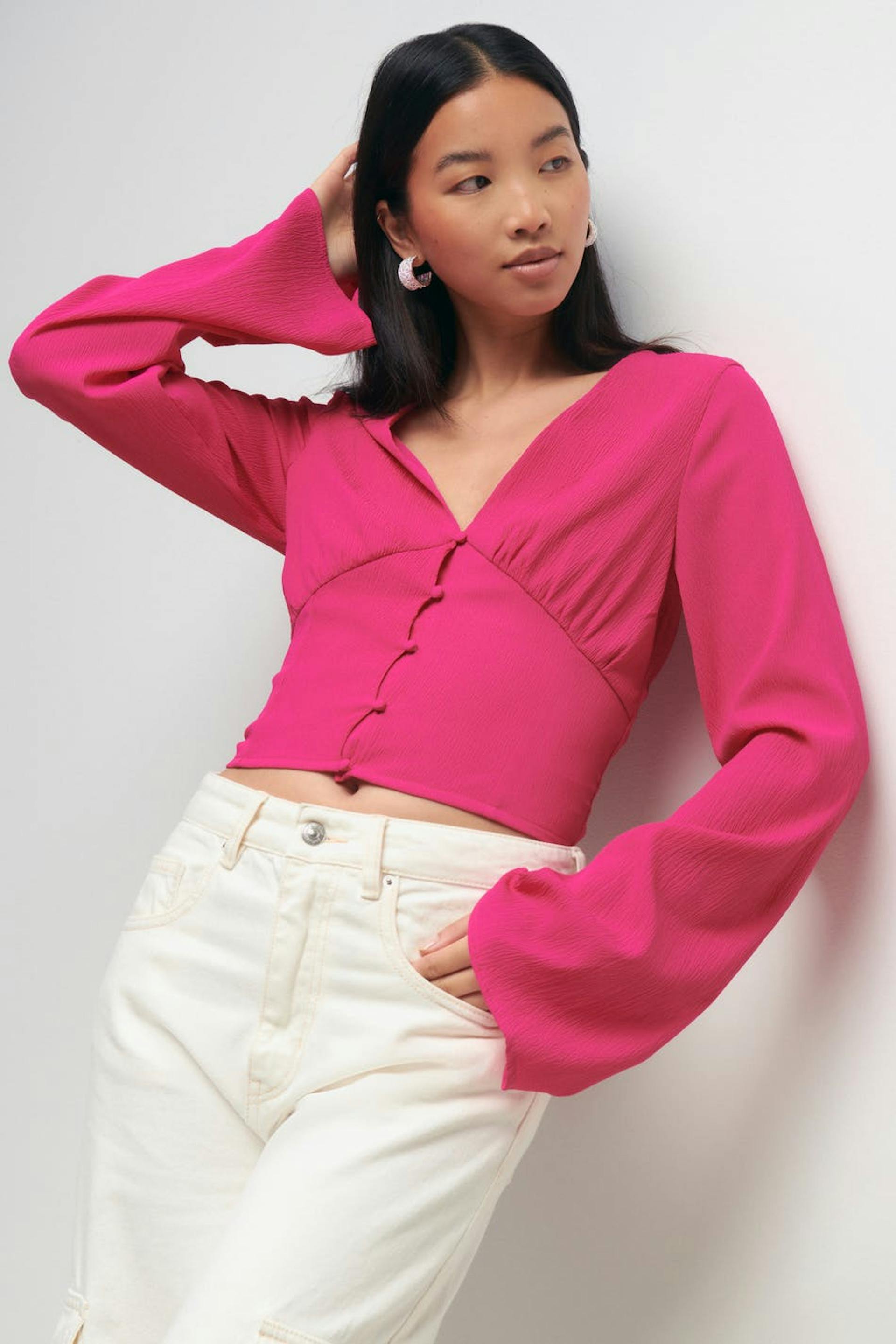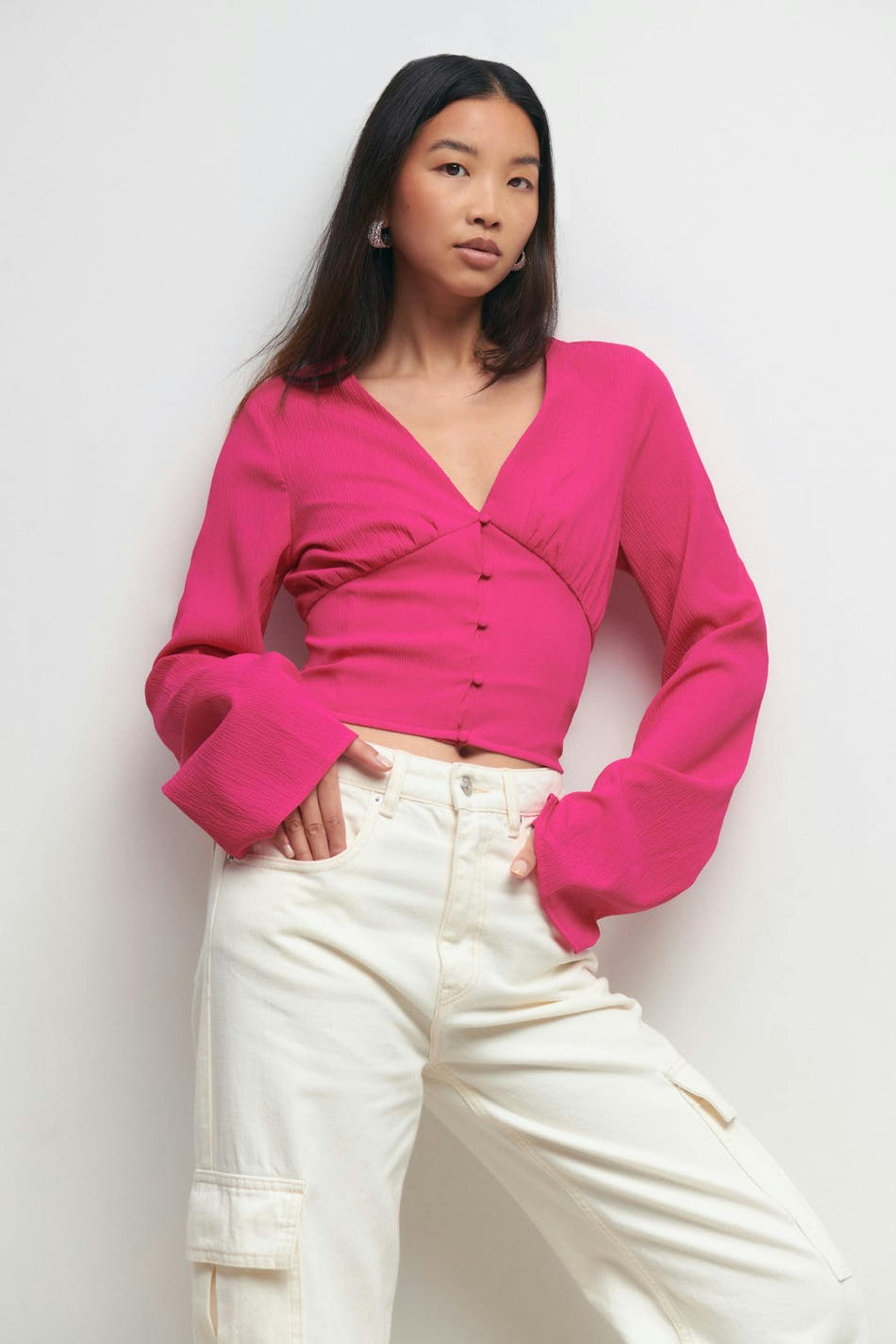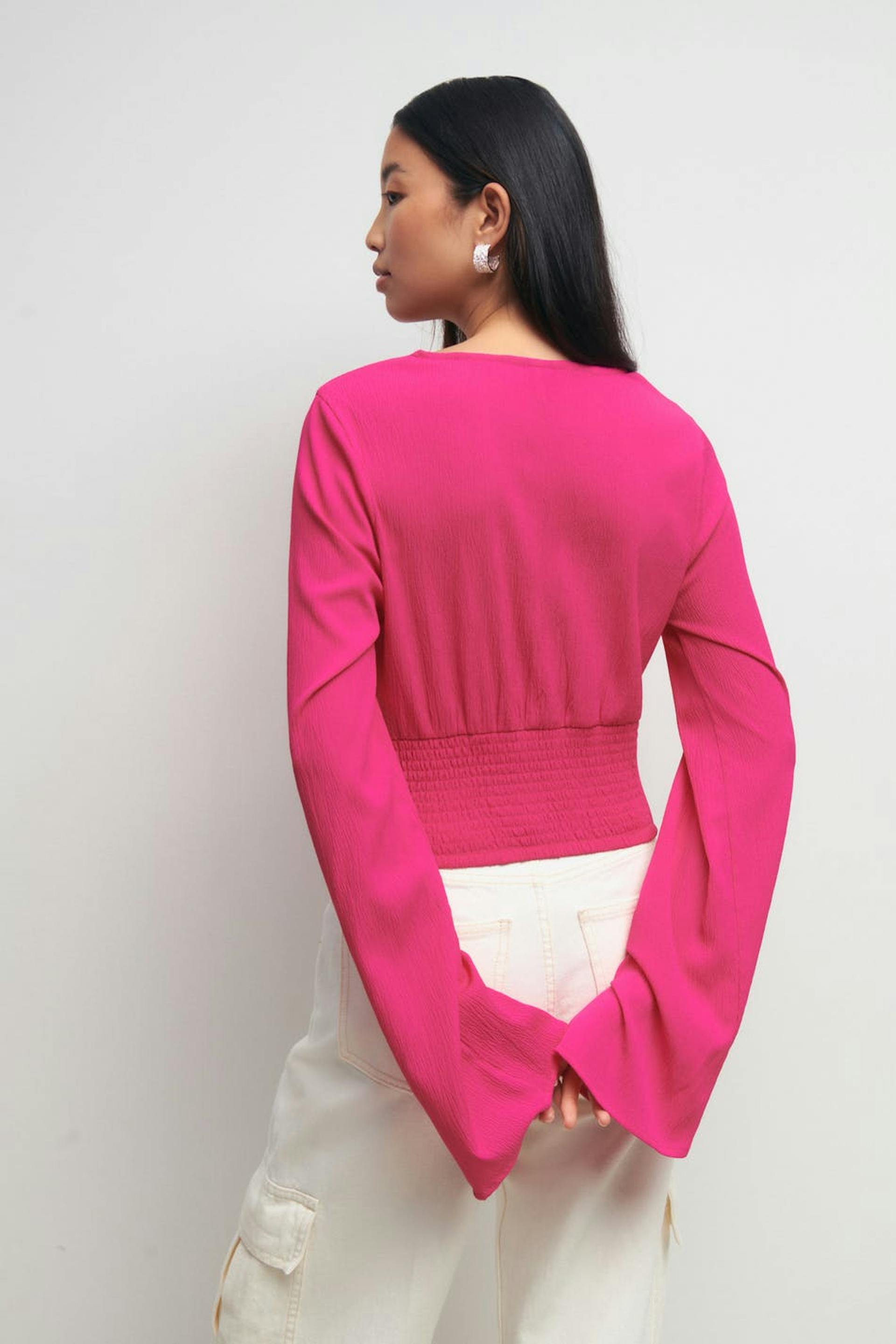 Long-sleeved corset top with ruched bust. The top is pink and has a crinkled material. It has a fitted fit, trumpet sleeves, plunge neckline, button closure in front and smocking at the back.