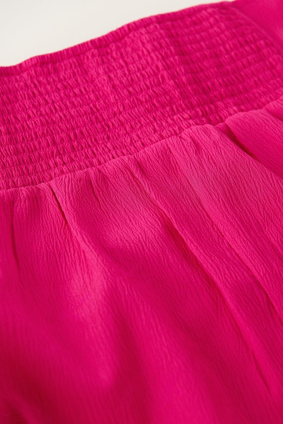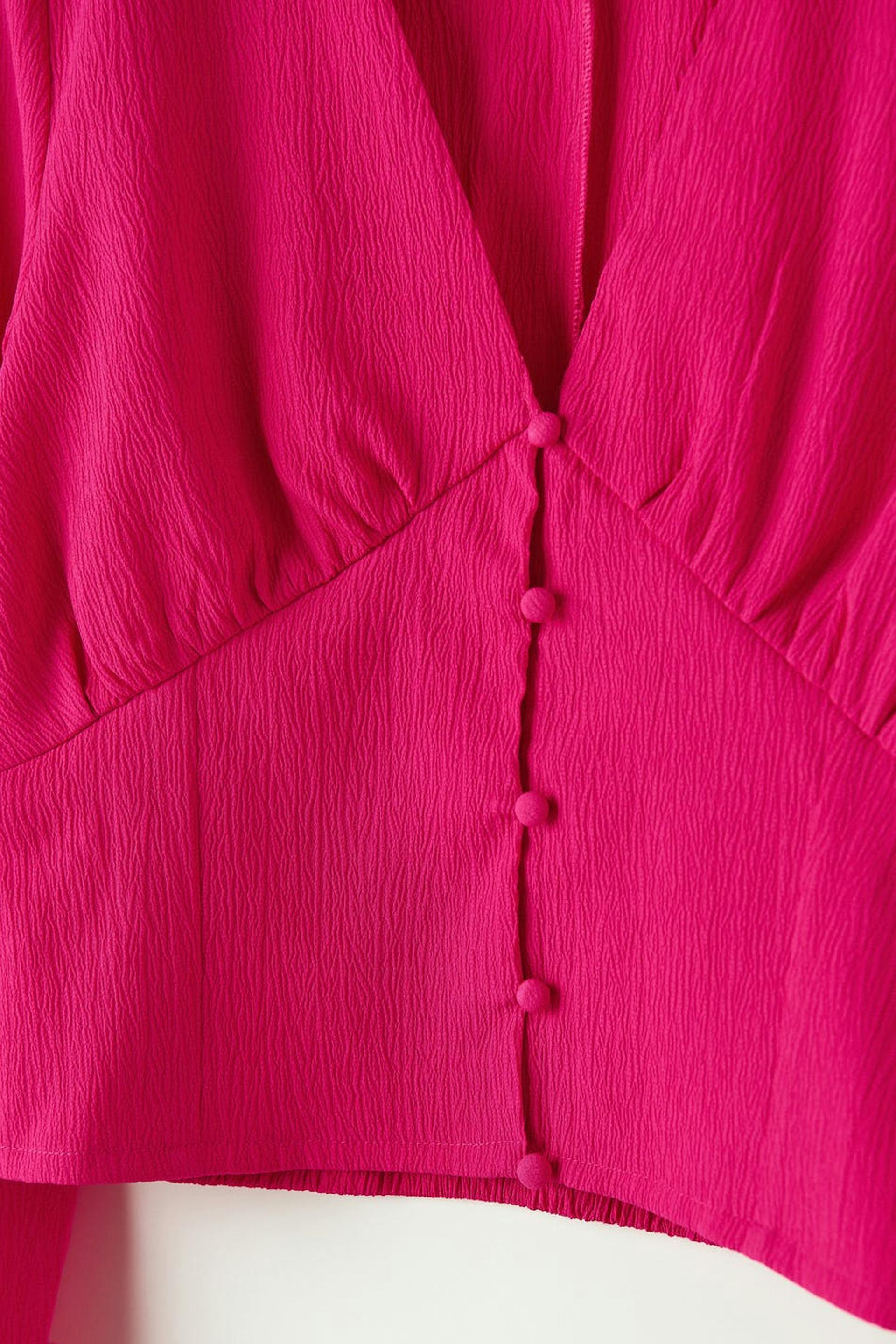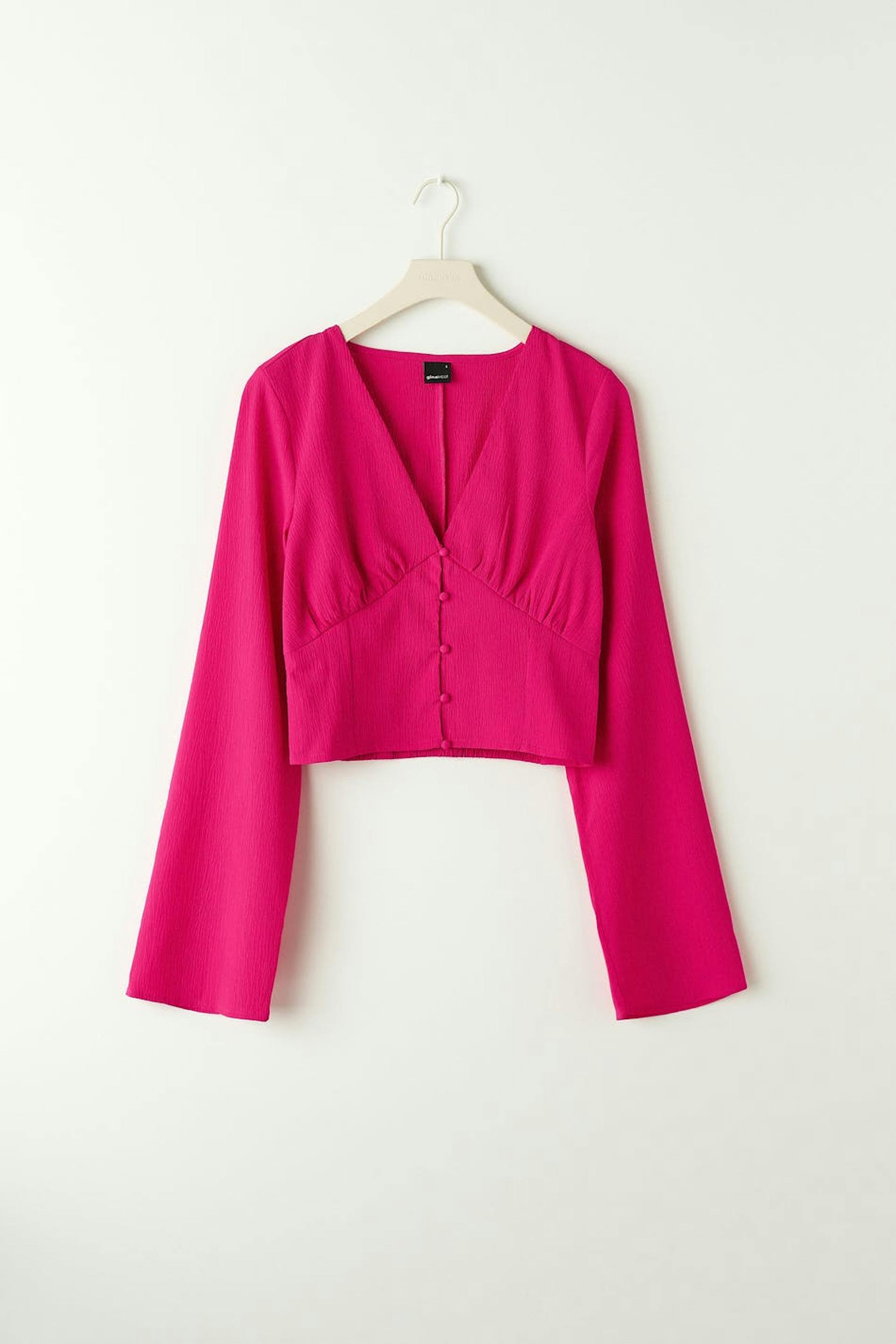 Long-sleeved corset top with ruched bust. The top is pink and has a crinkled material. It has a fitted fit, trumpet sleeves, plunge neckline, button closure in front and smocking at the back.
