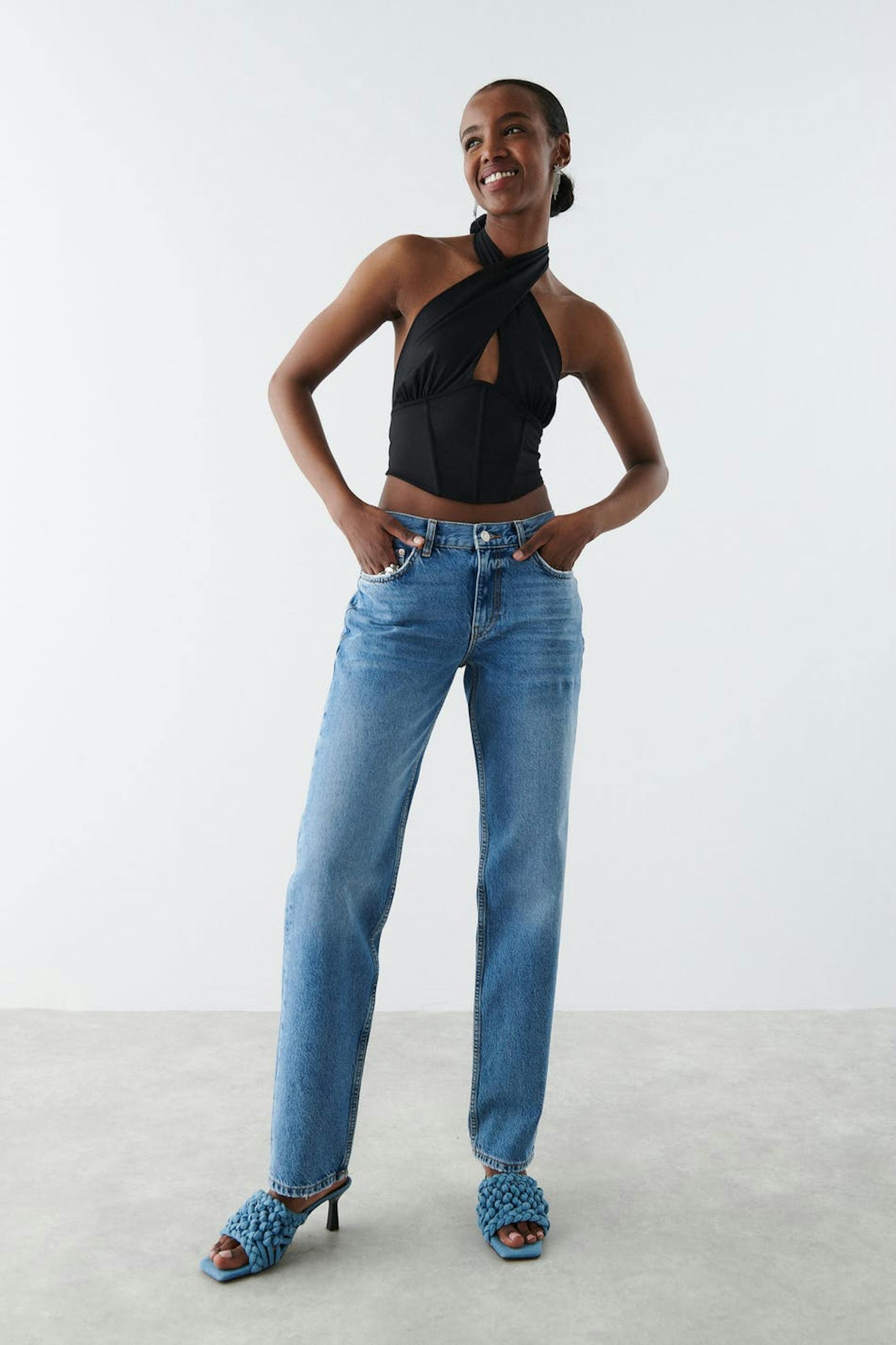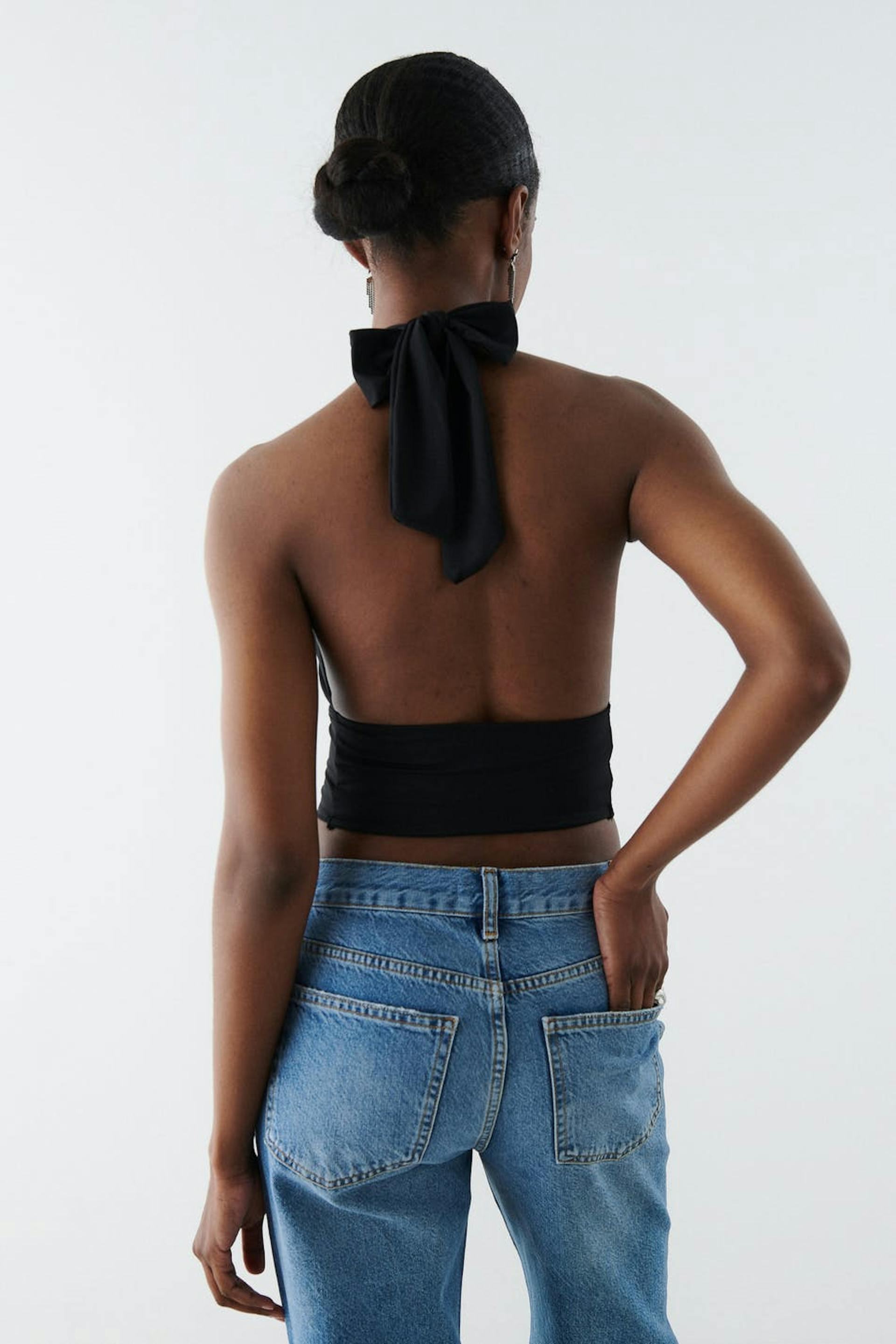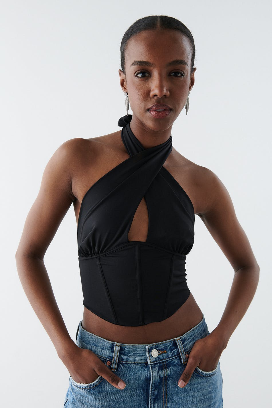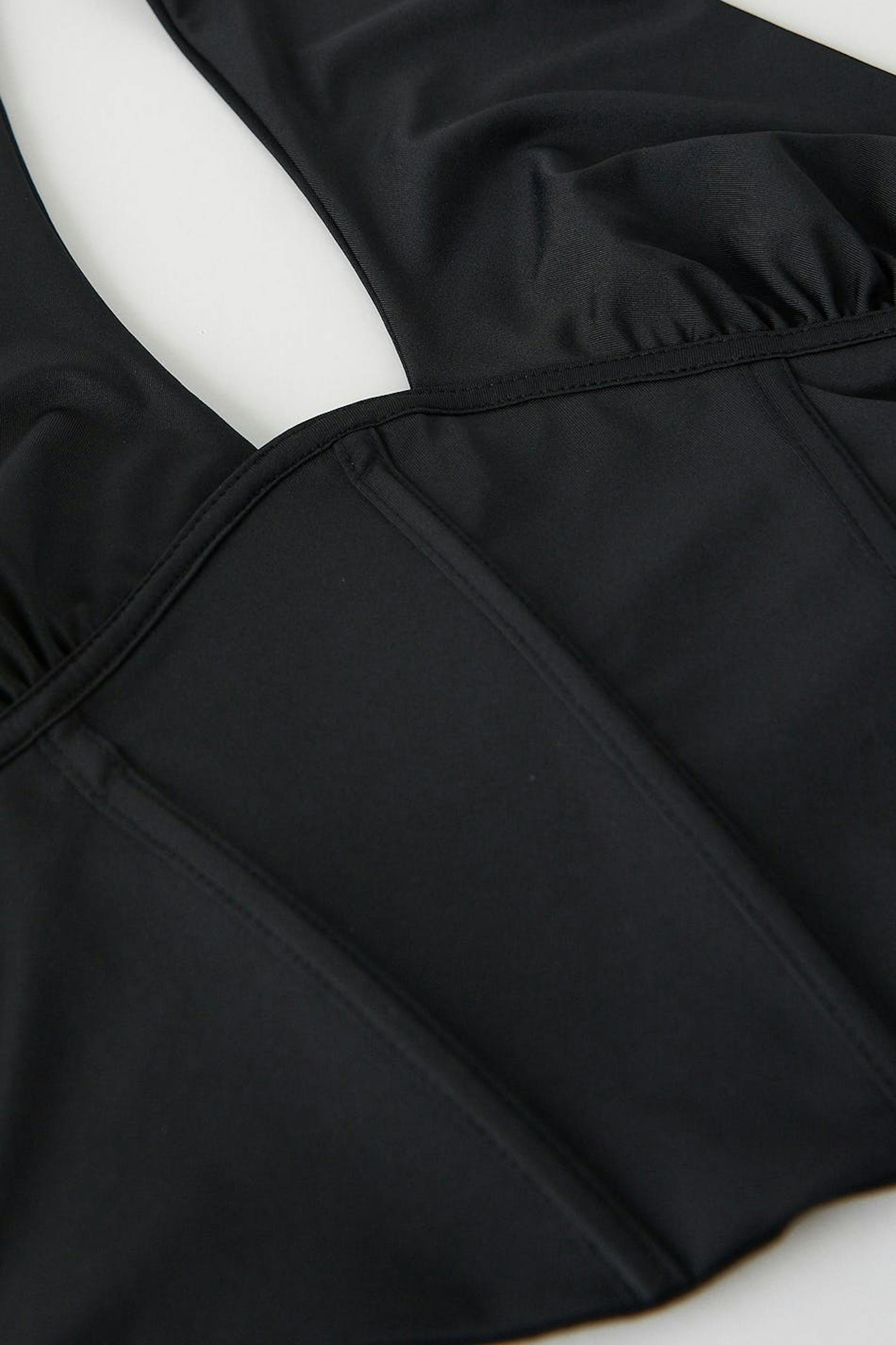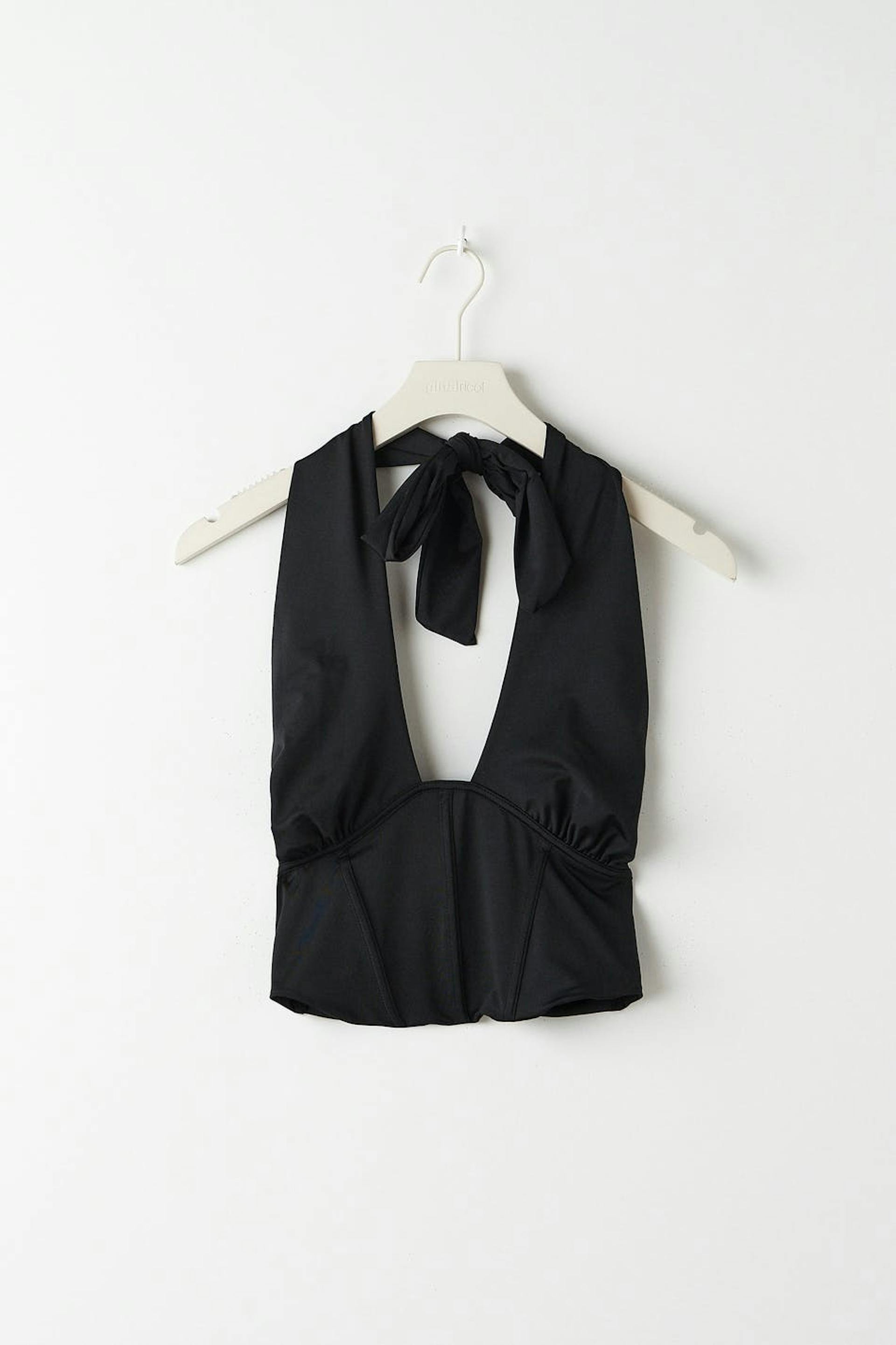 Corset top with open back. The top is perfect for the party and black and has crossover straps at the front. It has a figure-fit fit, boning at the front, a stretch fabric, cropped length, a seam detail below the bust and halterneck design with self-tie at neck.