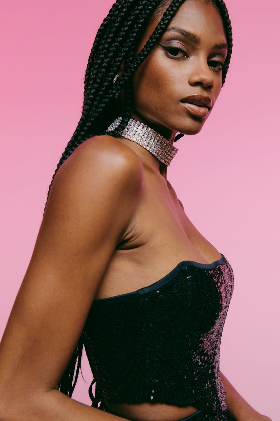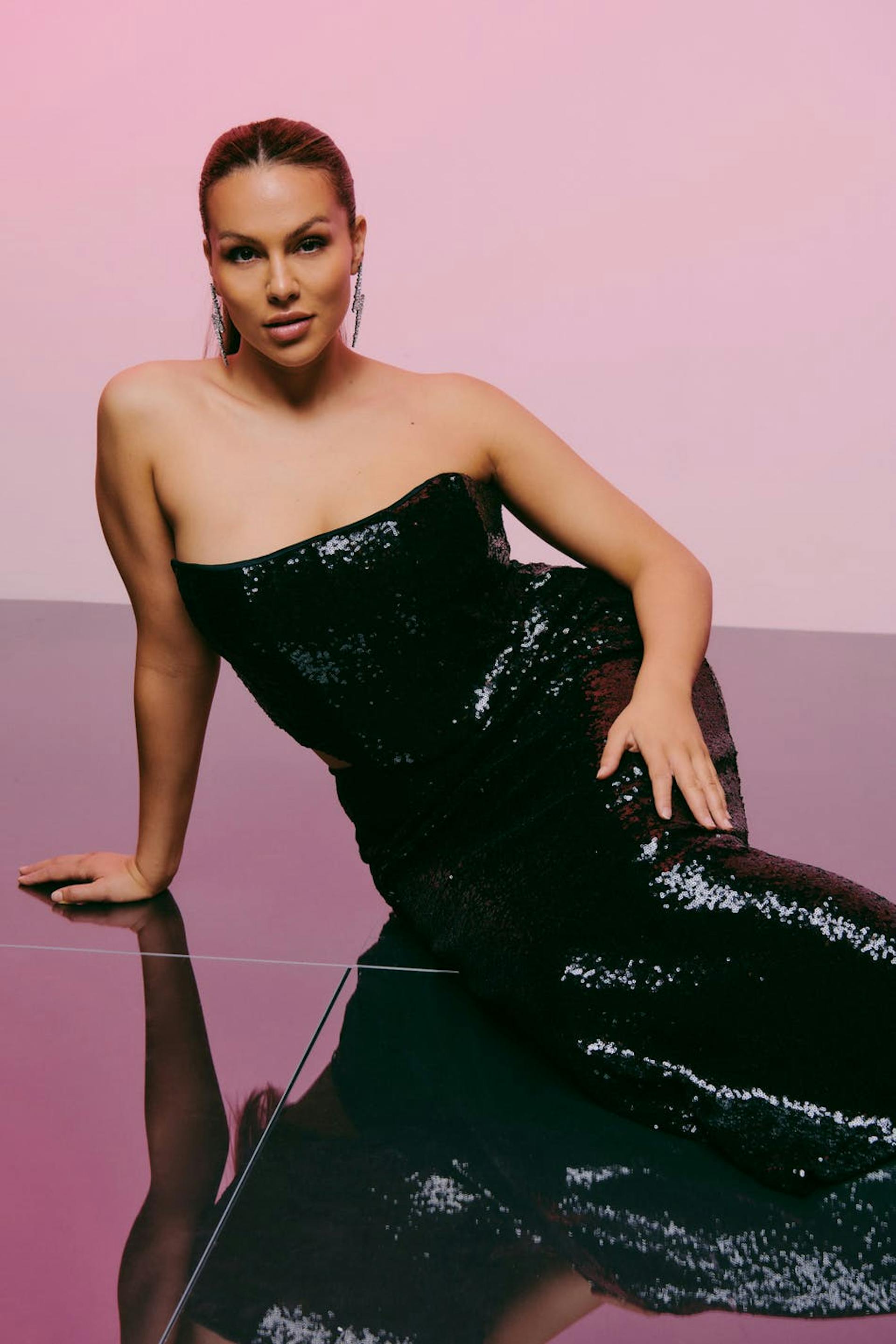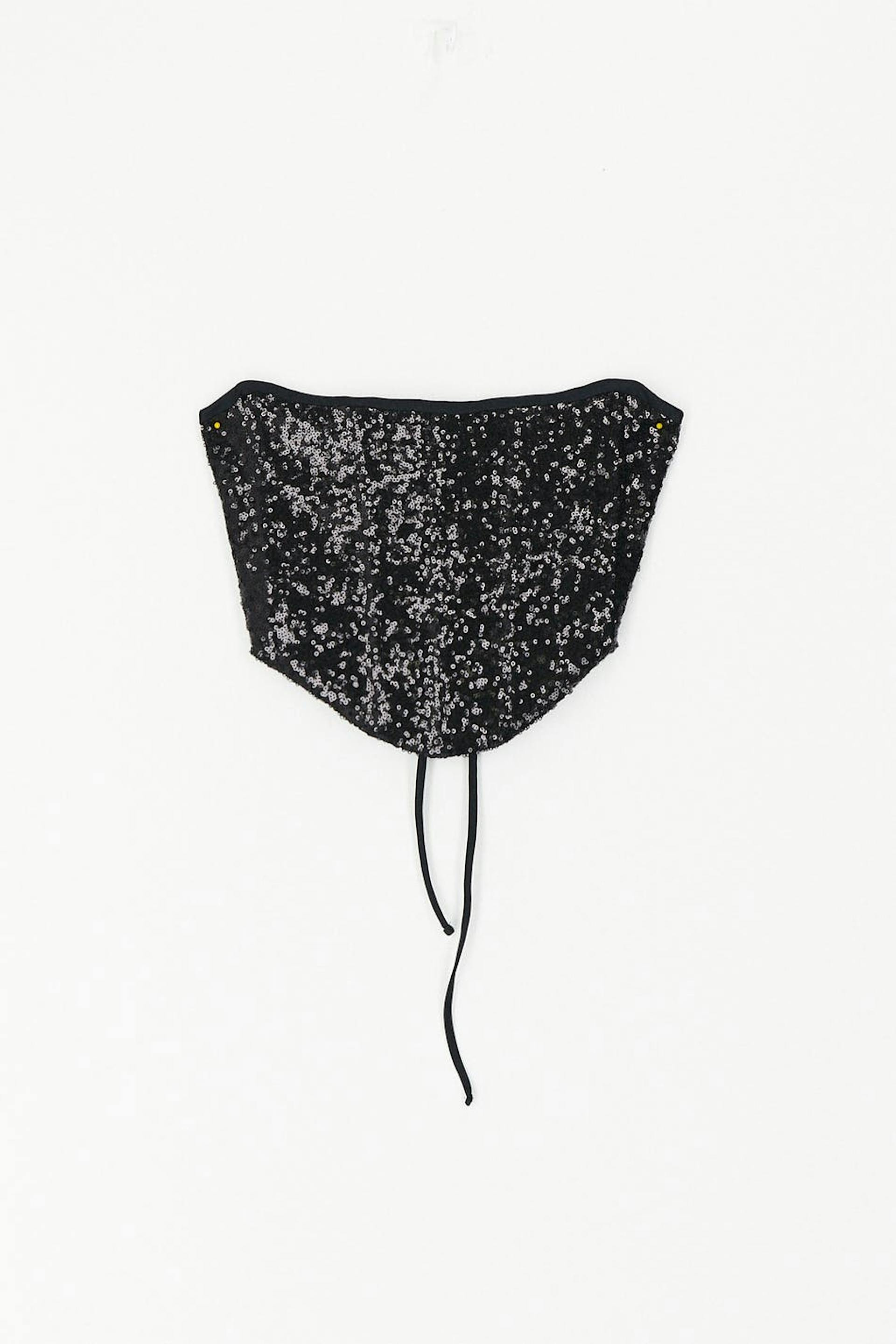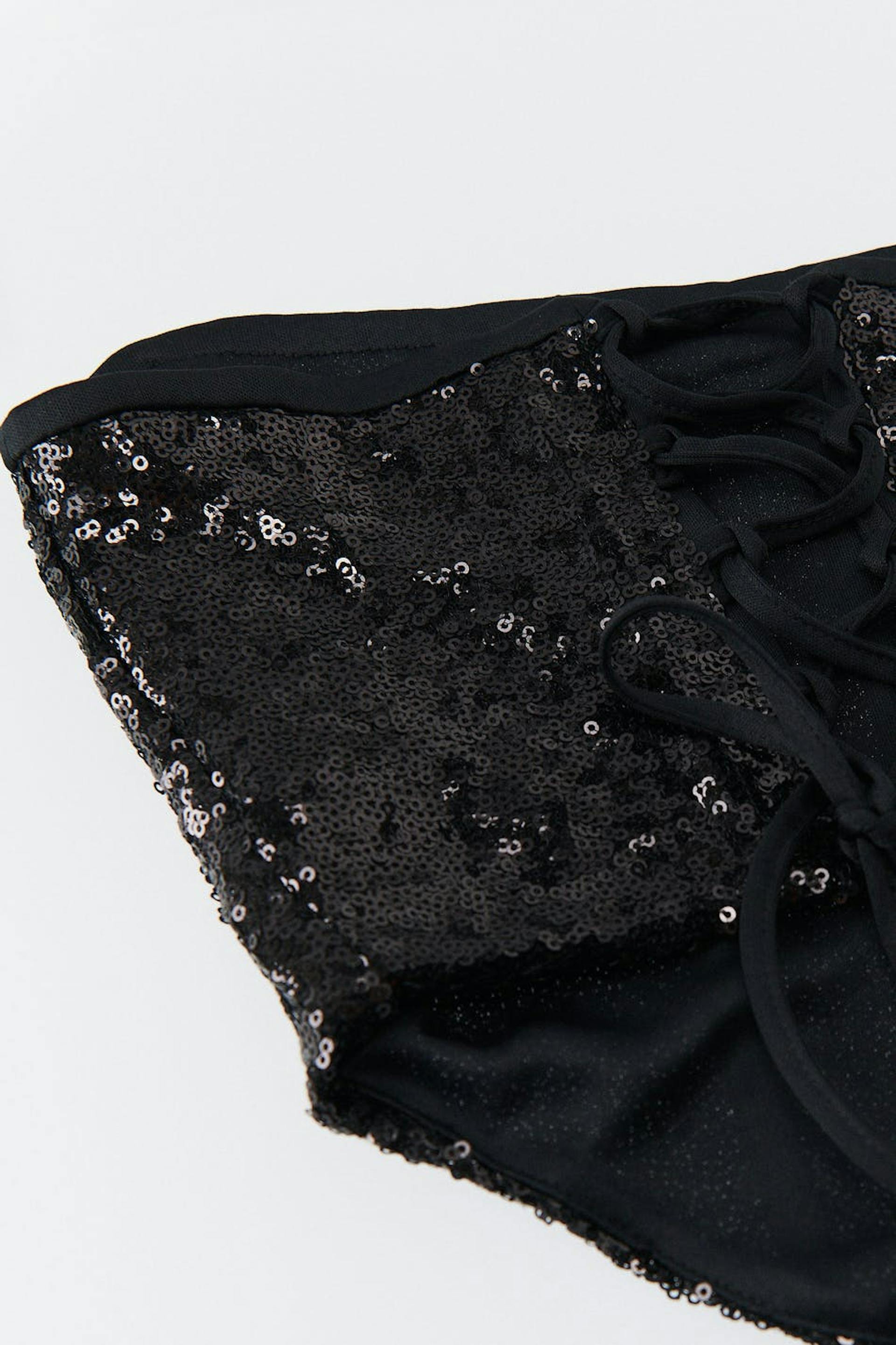 Corset top with paillettes. The top is black and has lacing in the back. It has cropped length and boning at the front and back for added support.