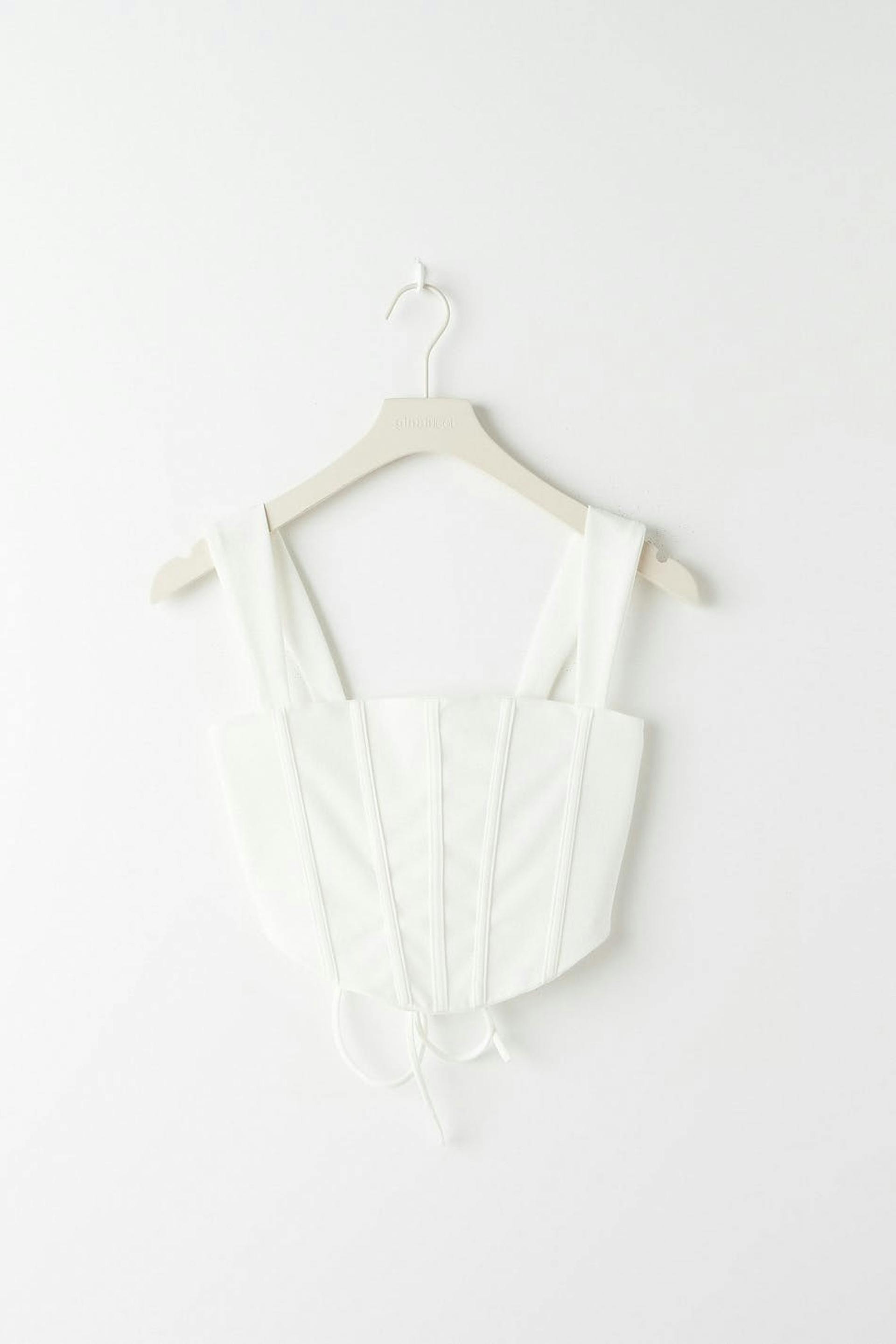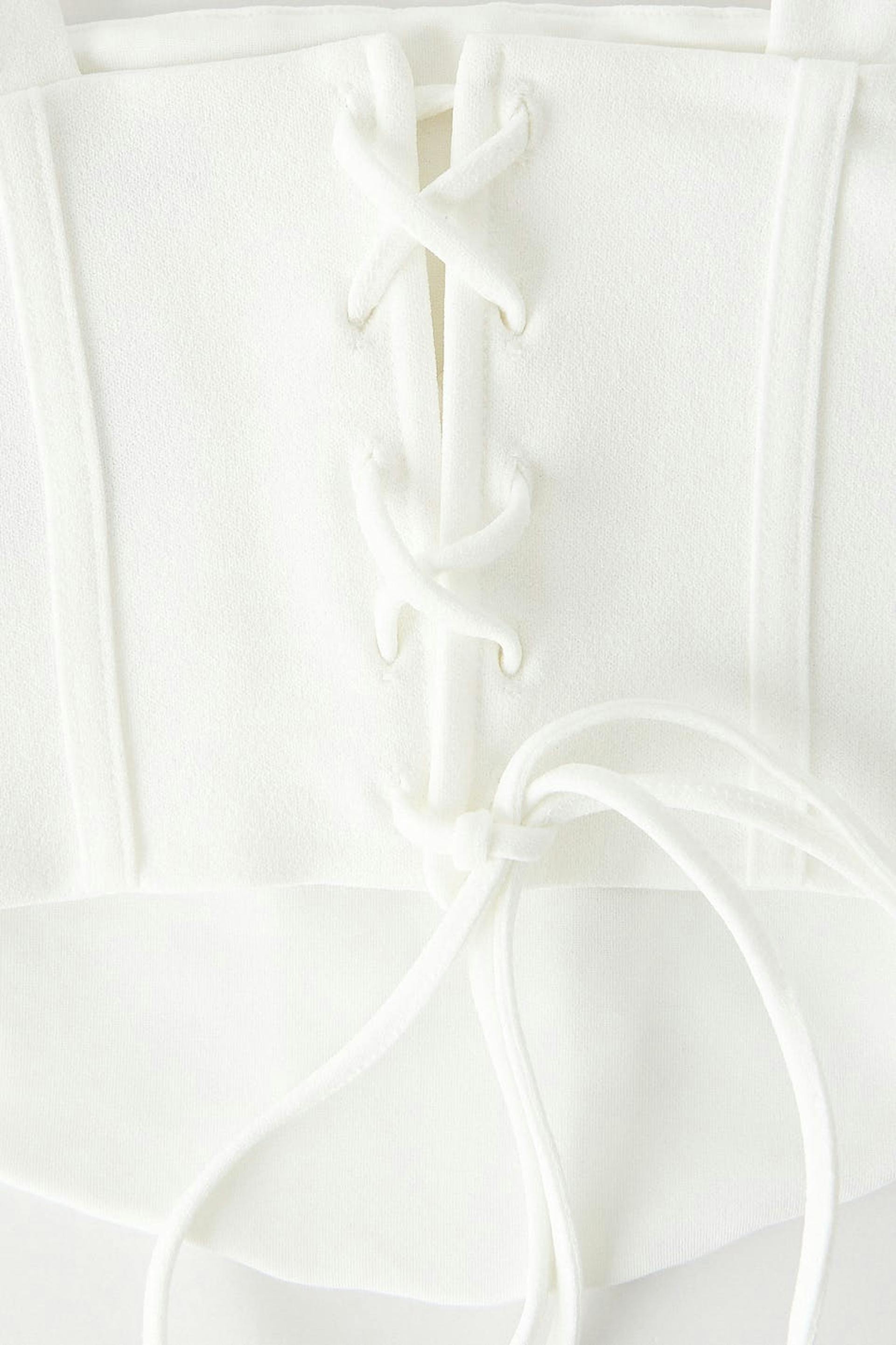 Corset top with lacing in the back. The top is perfect for the party and white and has wide shoulder straps. It has a cropped length, a stretch fabric and boning at the front and back for added support.