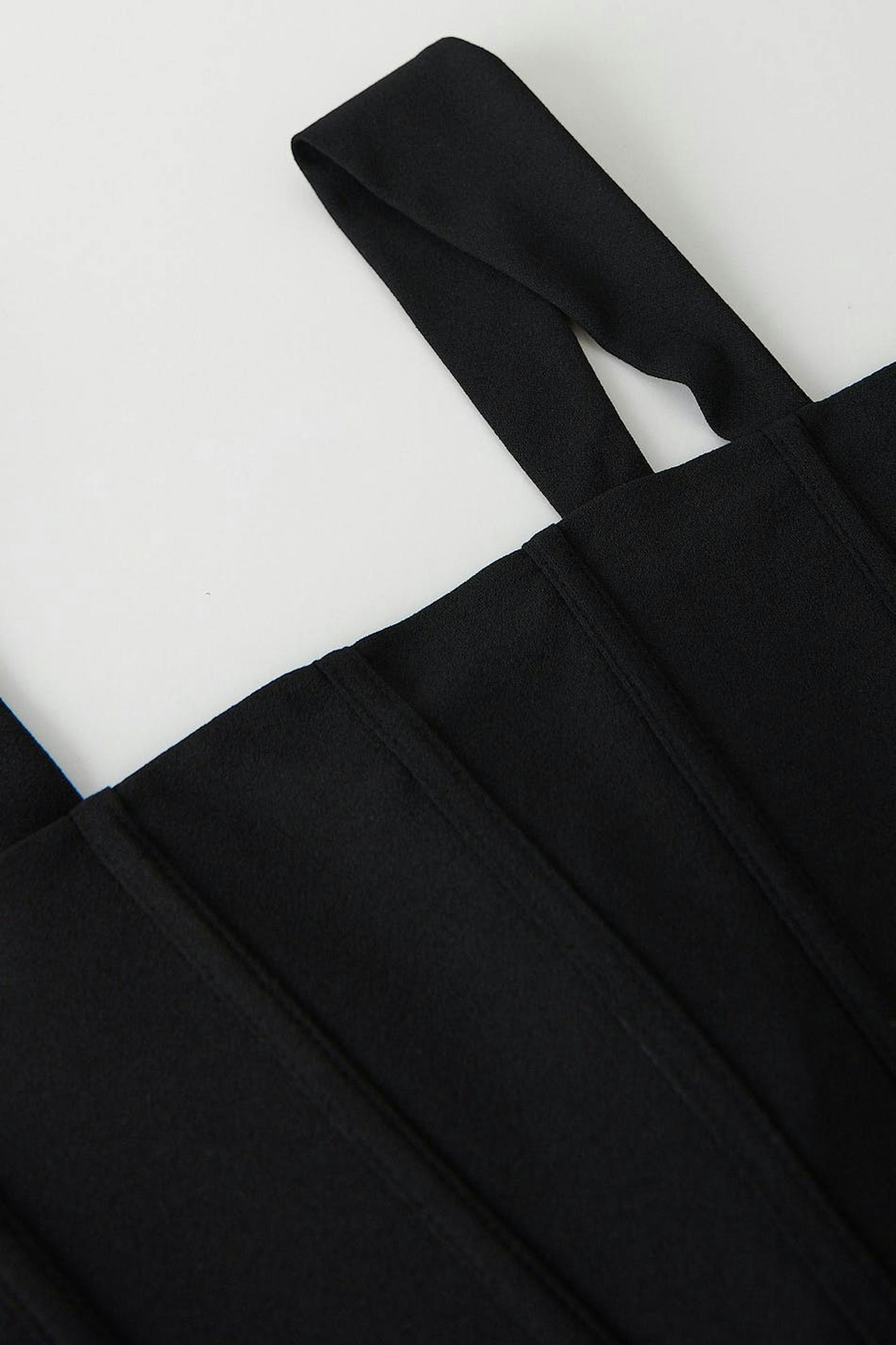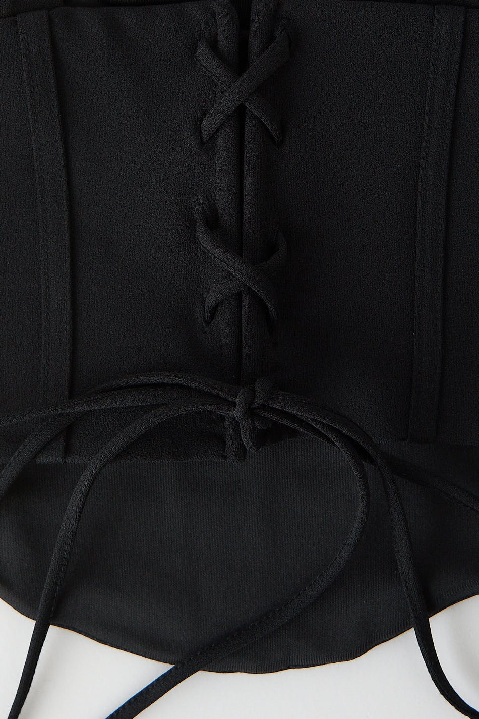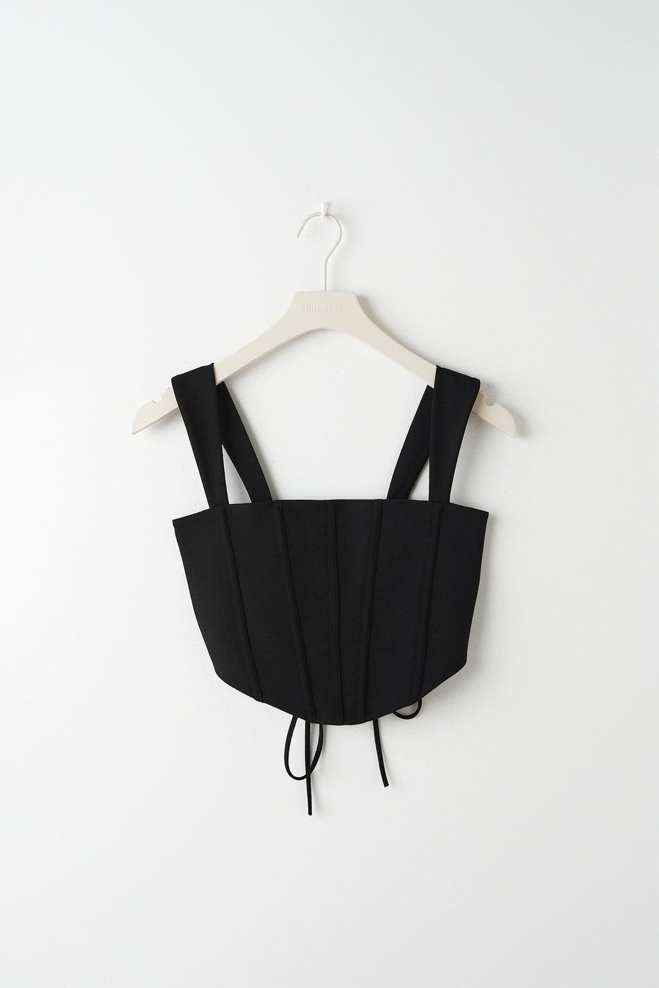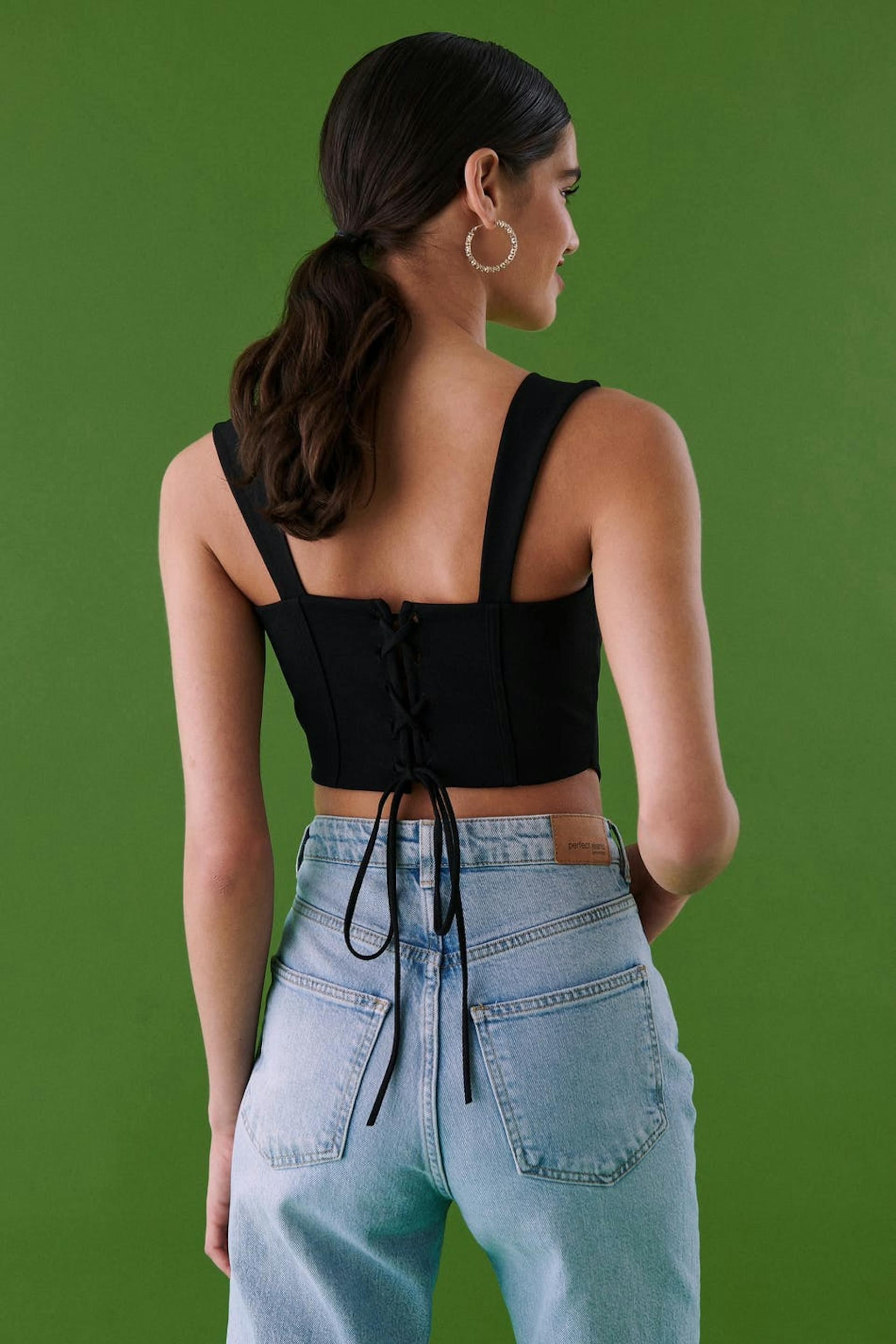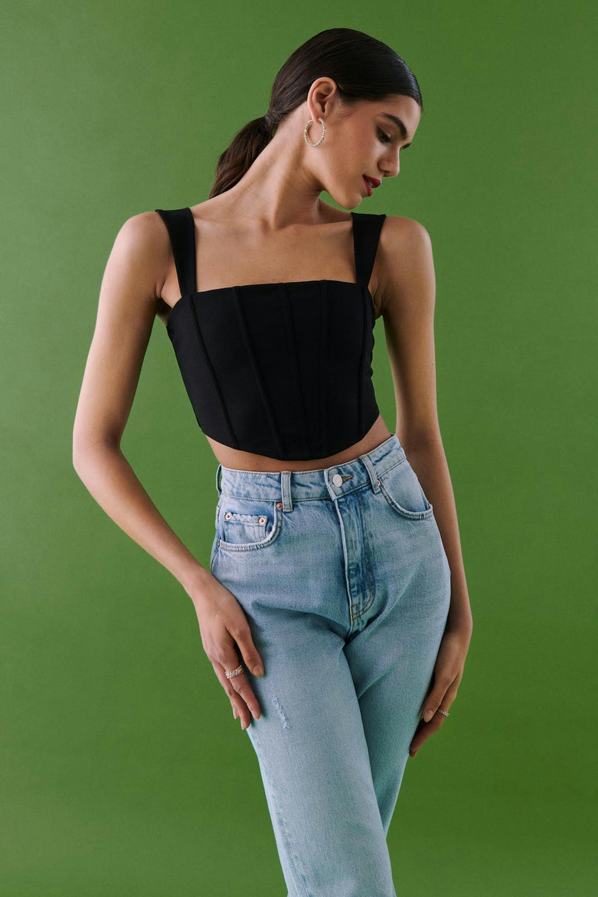 Corset top with lacing at the back. The top is black and has broad shoulder straps. It has a cropped length with a stretch fabric and boning at the front and back for added support.