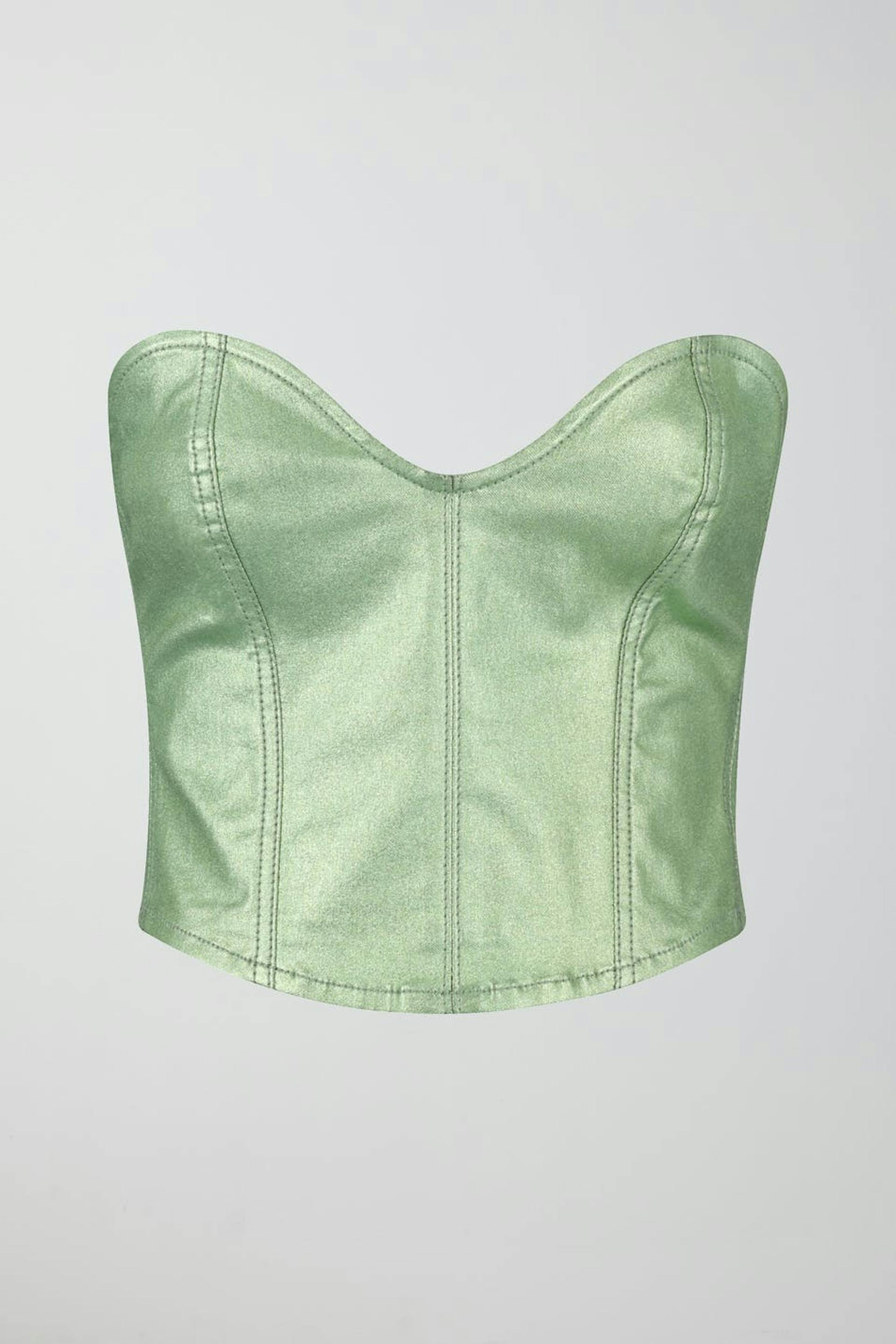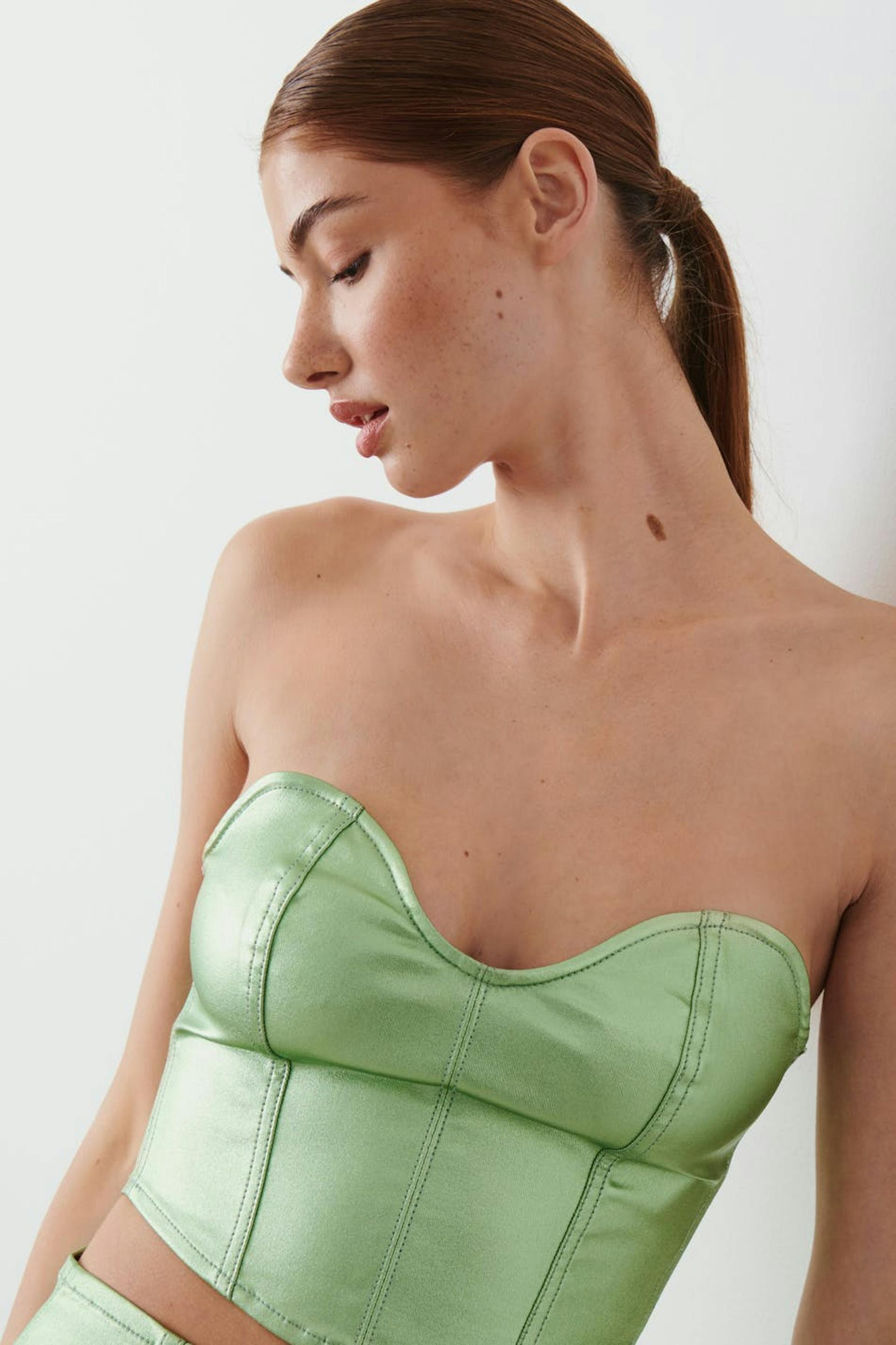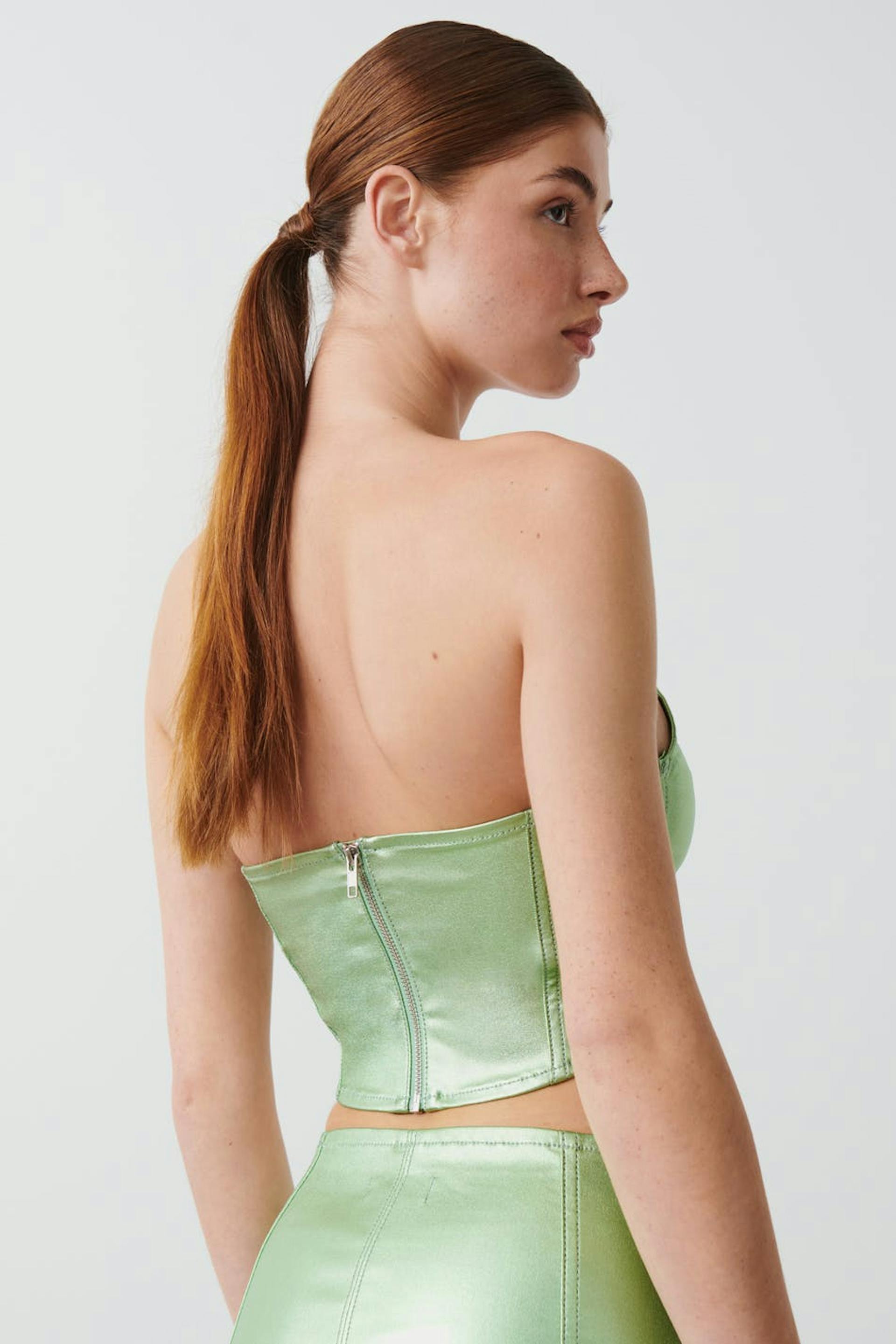 Coated corset with sweetheart neckline. The corset is green and has figure-hugging fit. It has a quality with superstretch, zip in the back and cropped length.