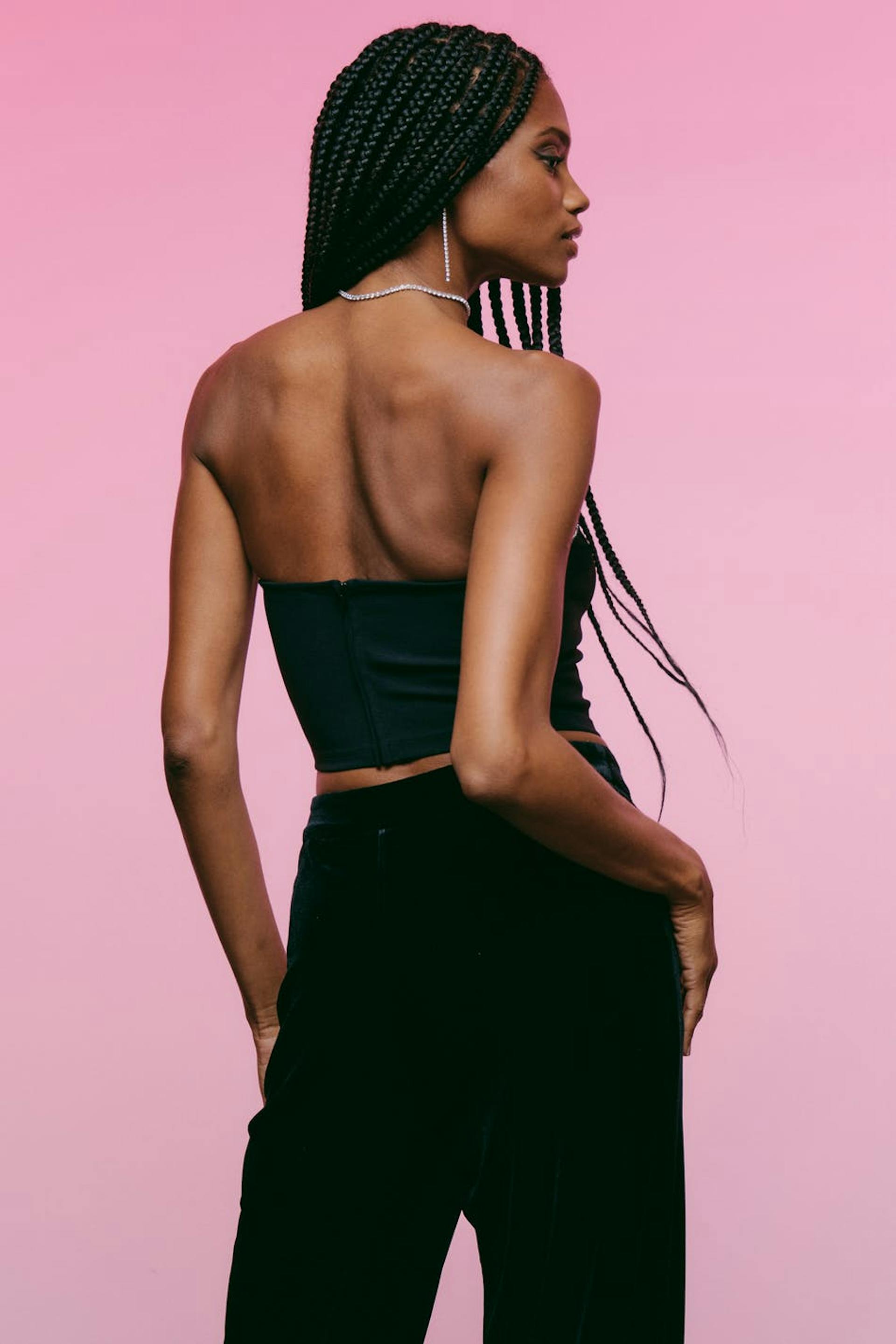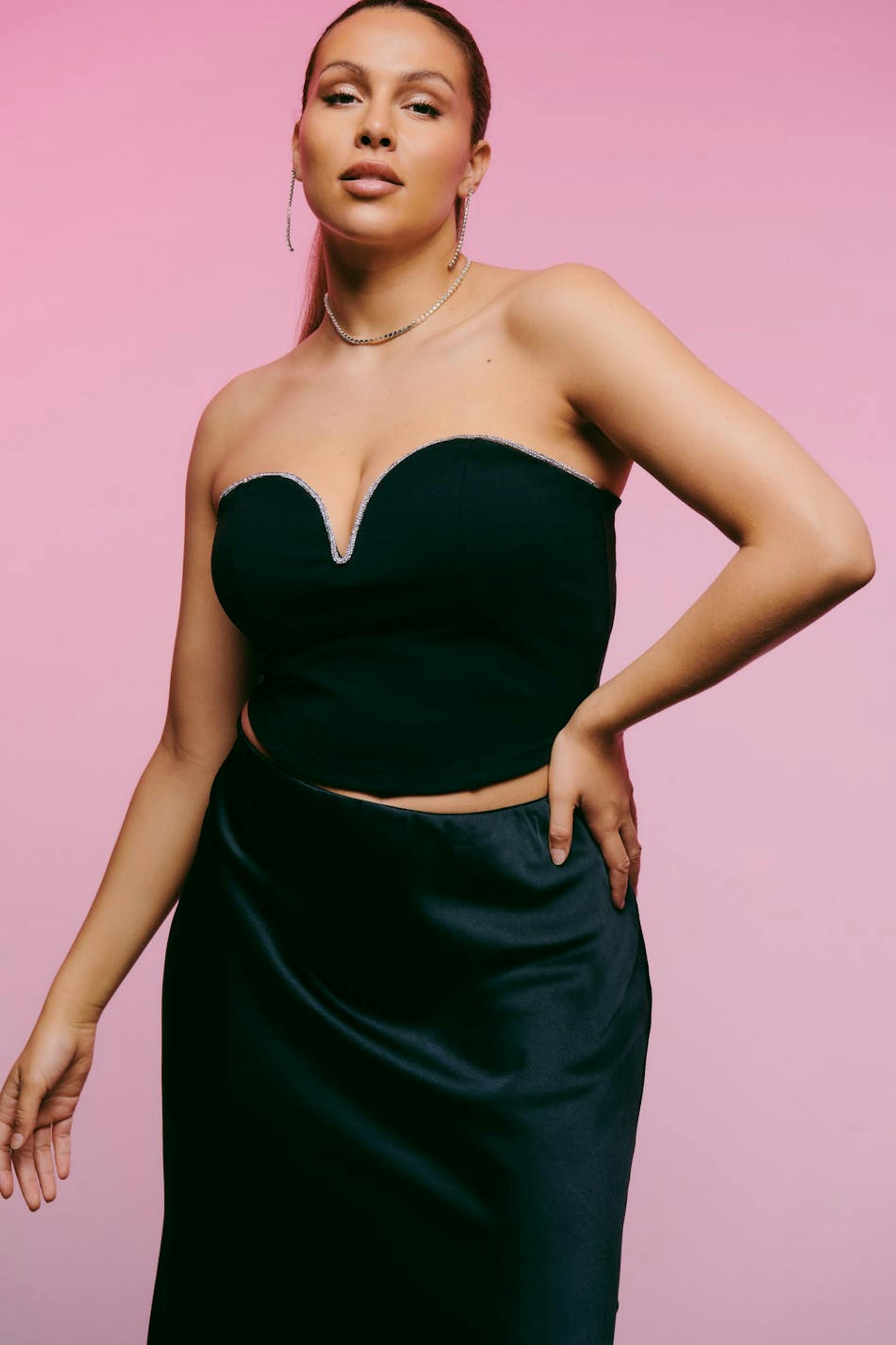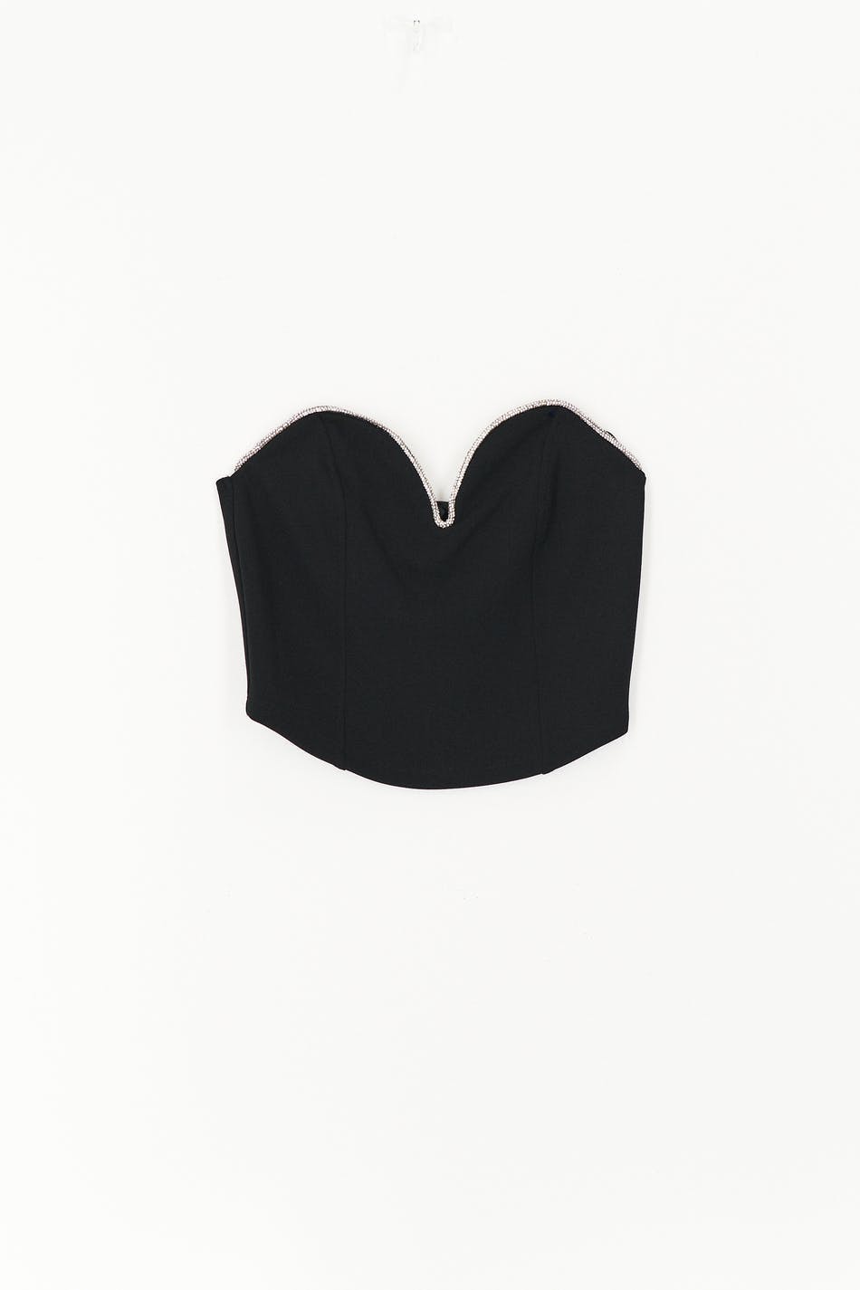 Bustier with zip in the back. The bustier is black and has deep neckline with rhinestone embellishment.