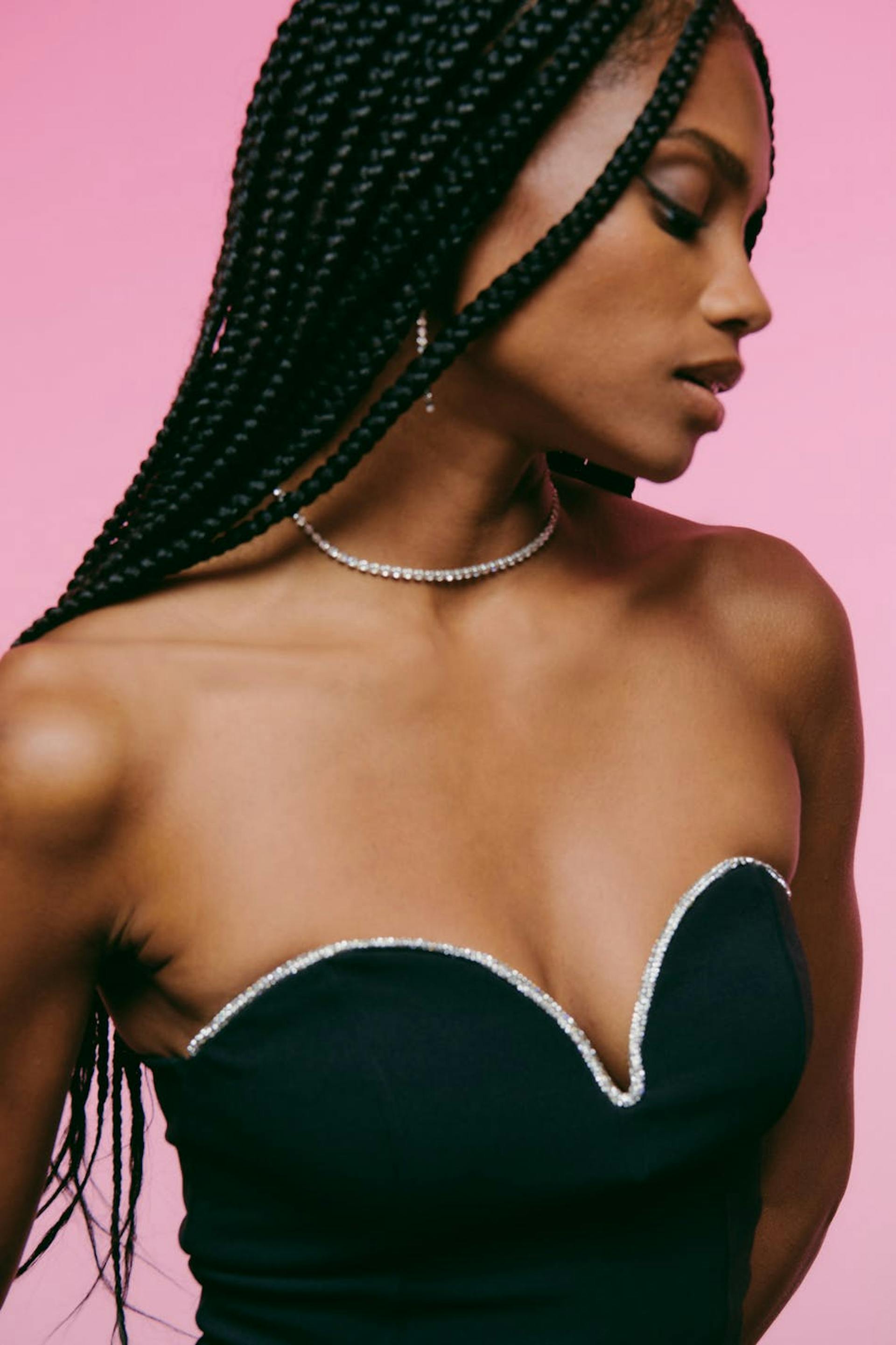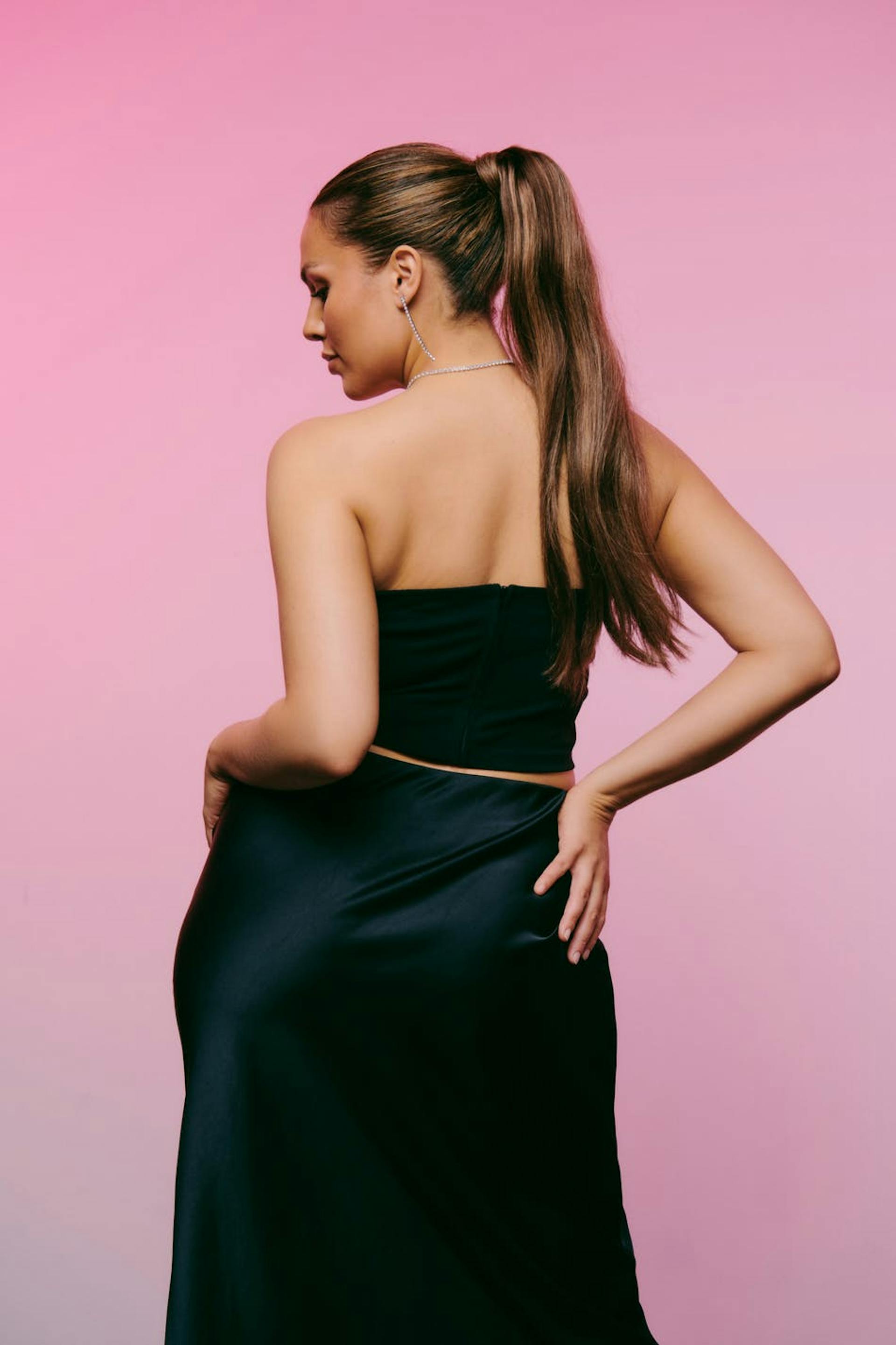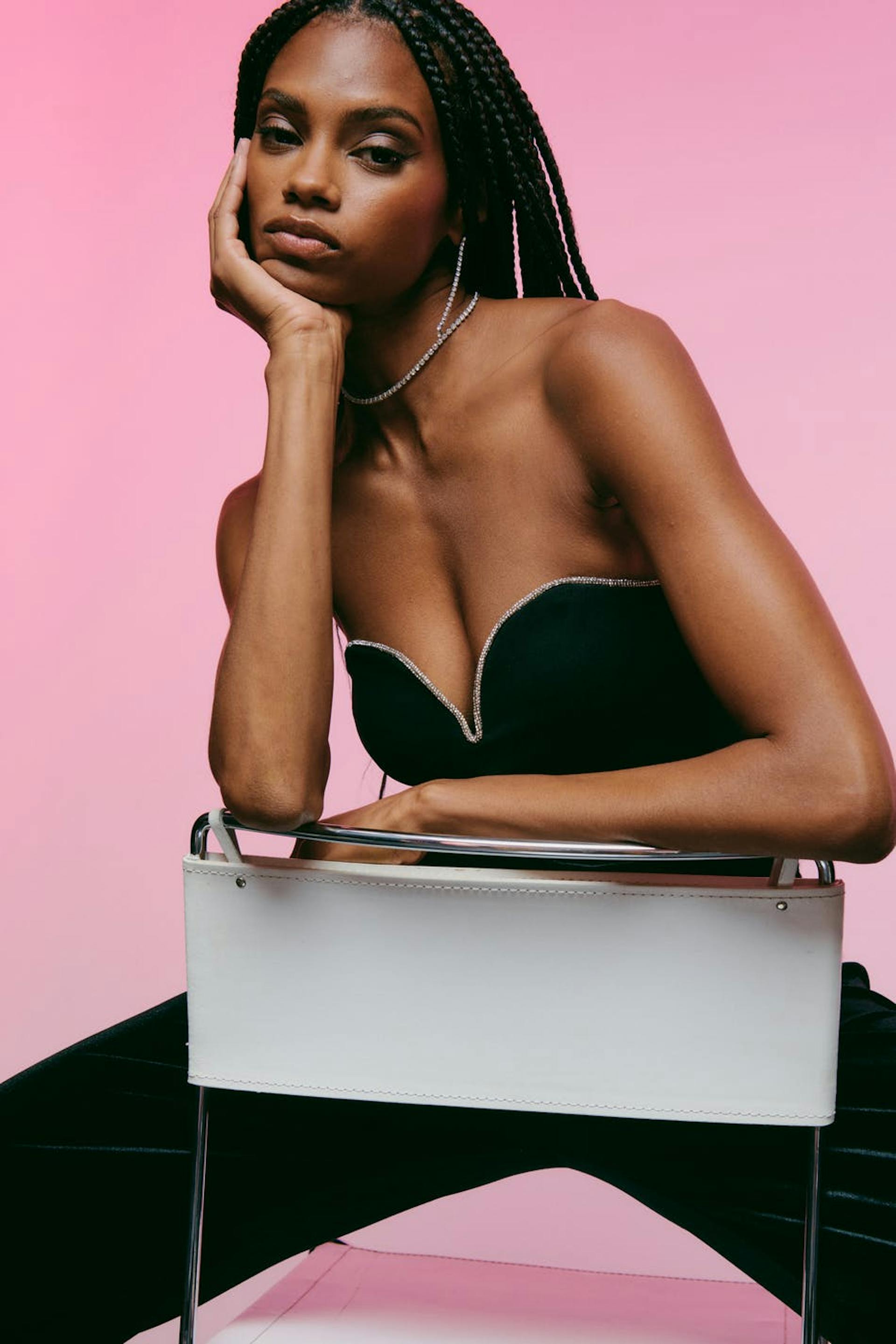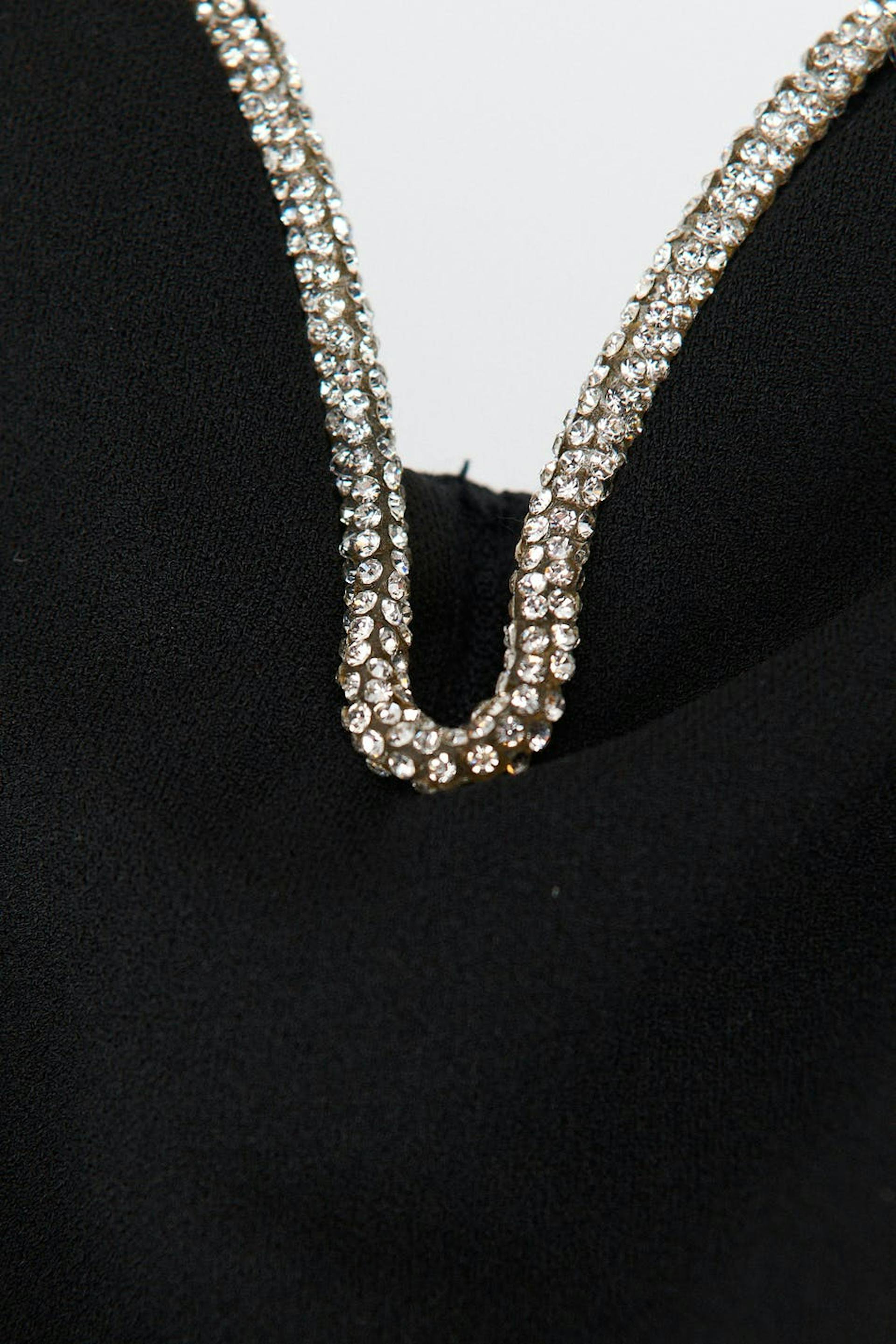 Bustier with zip in the back. The bustier is black and has deep neckline with rhinestone embellishment.