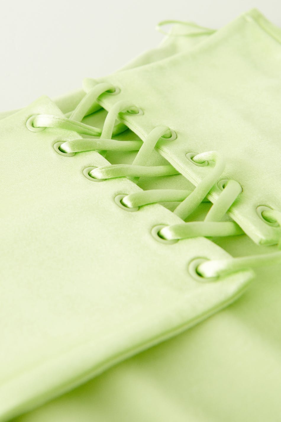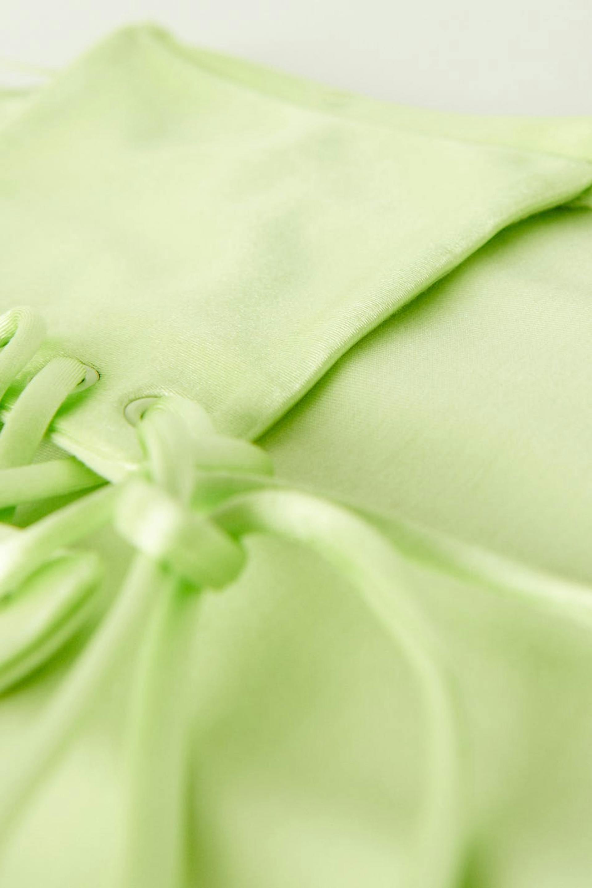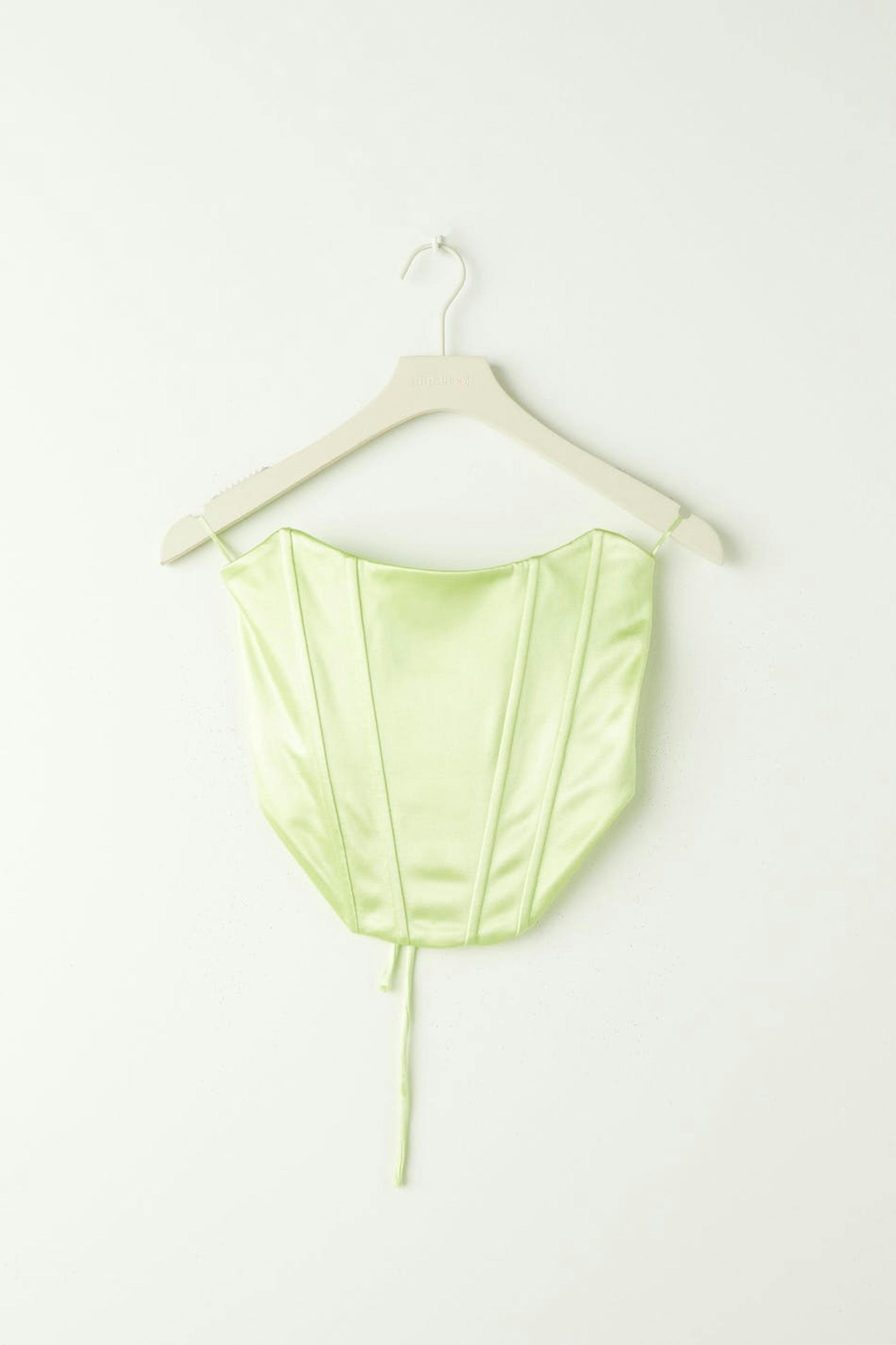 Corset with lacing in the back. The corset is green and has a normal fit. It has a stretchy quality in jersey and boning at the front for added support.