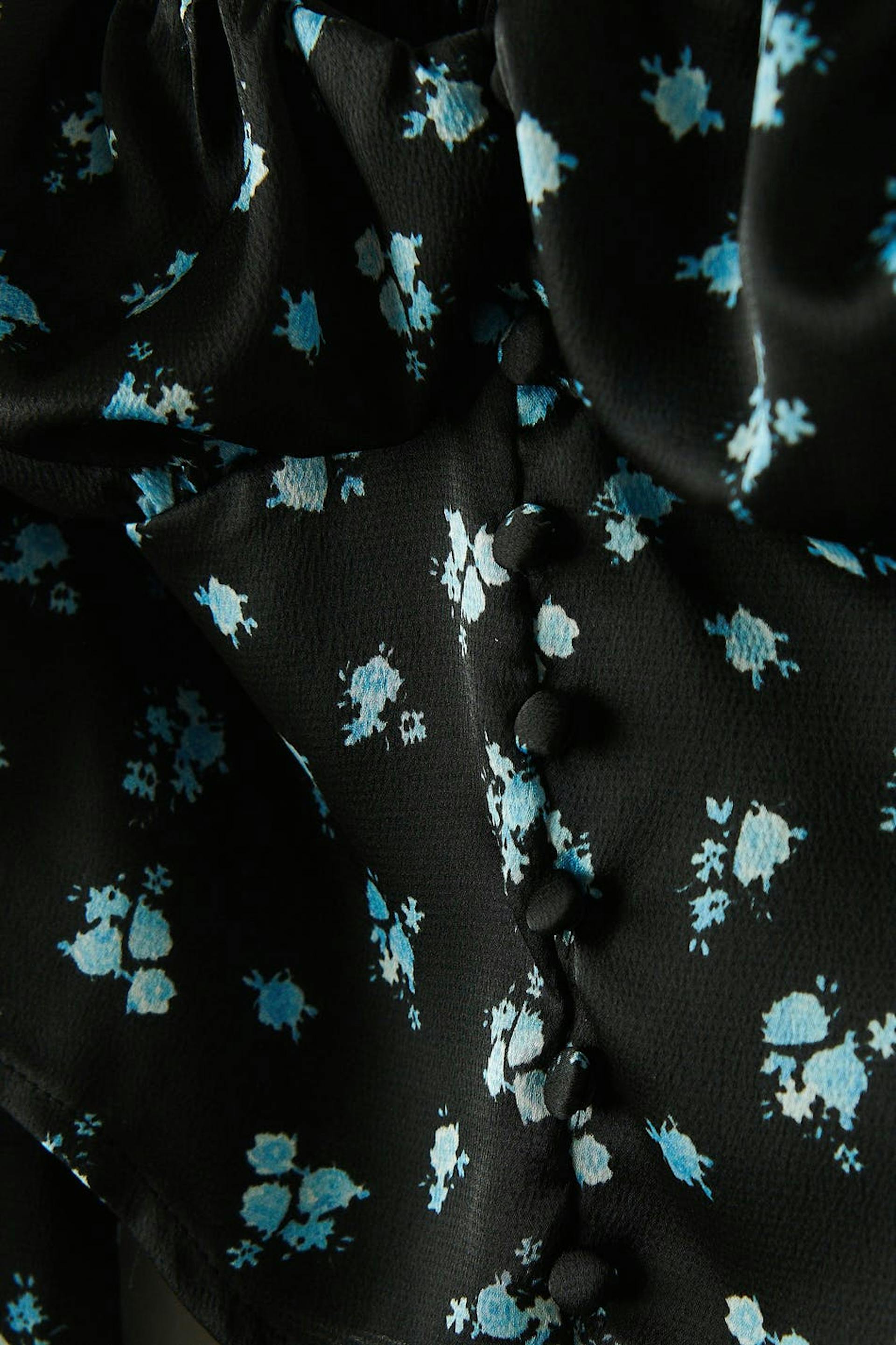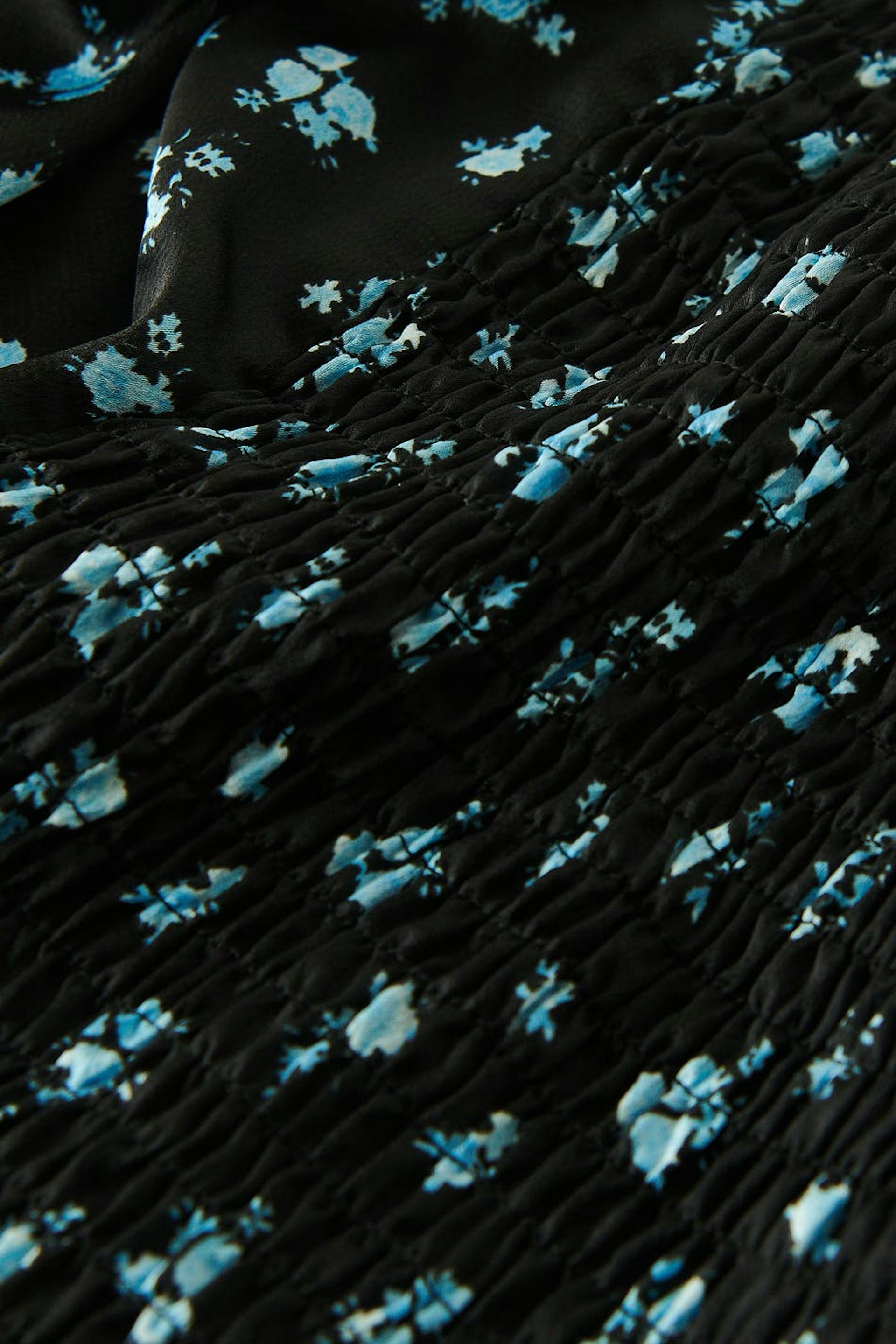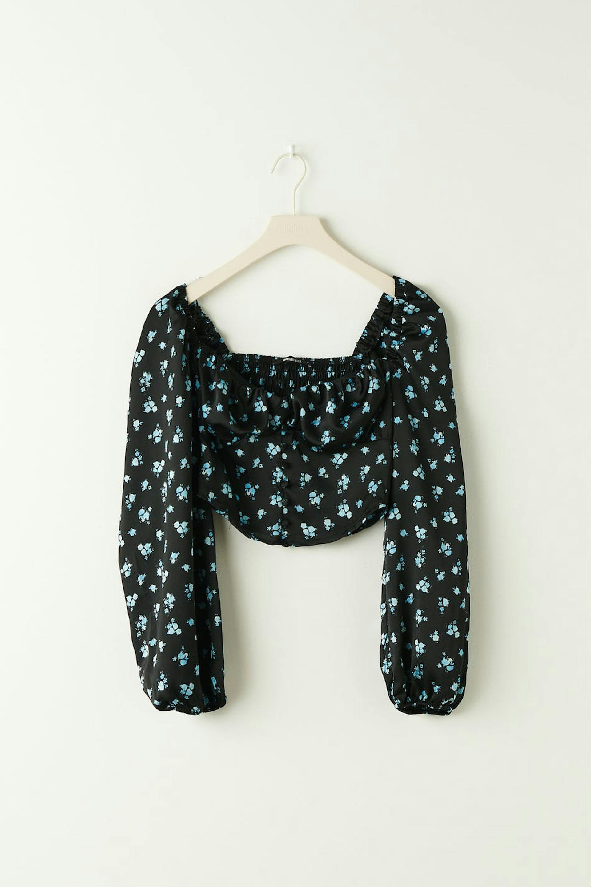 Floral top with ruched bust. The top is blue, black and cropped. It has puff sleeves with elasticized cuffs, decorative button placket in front, smocking in the back and a fitted waist.