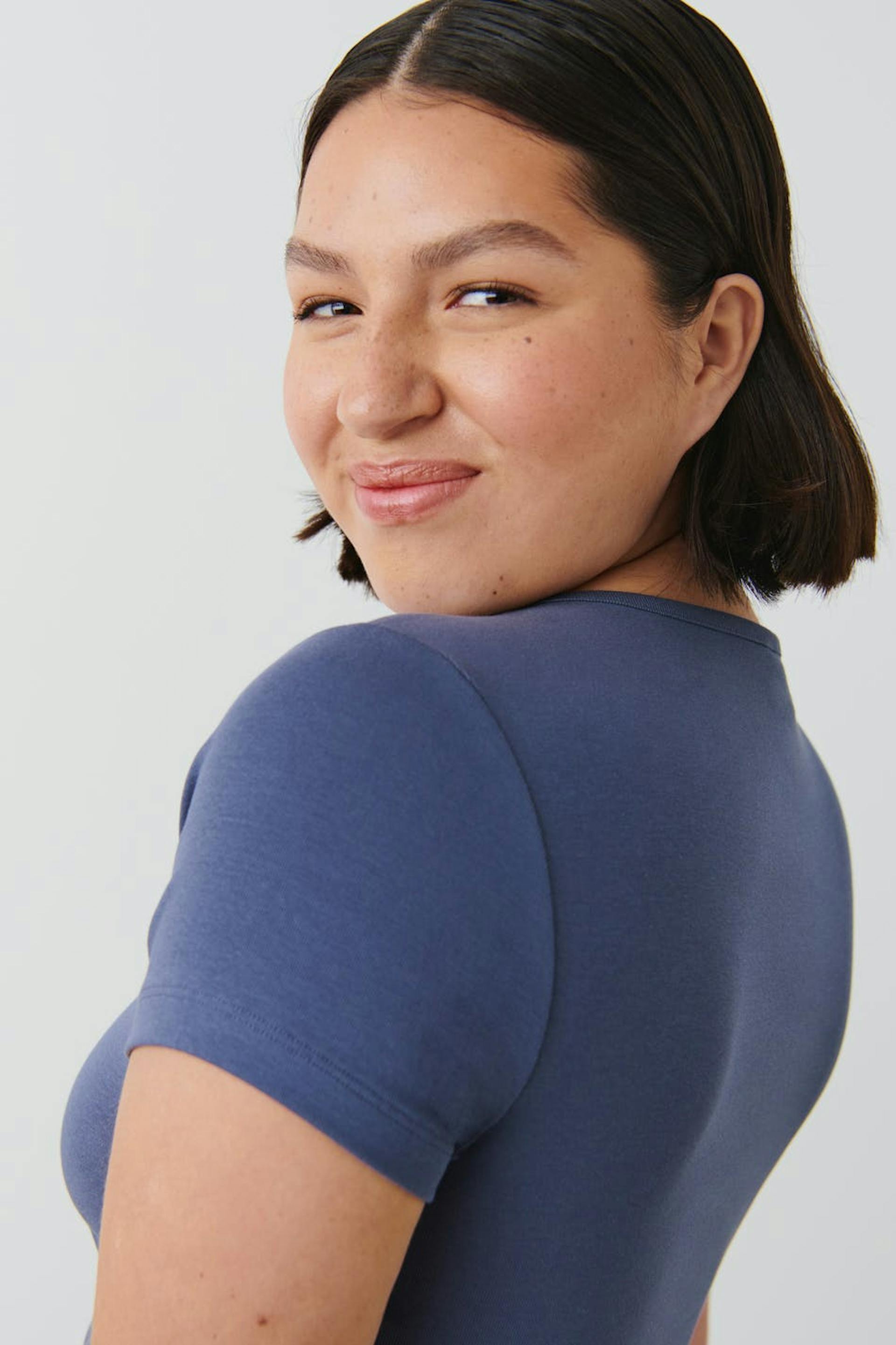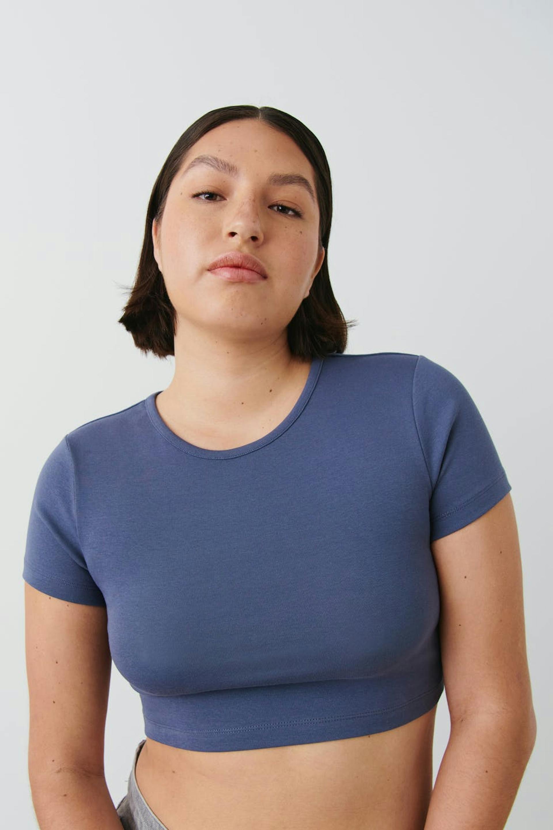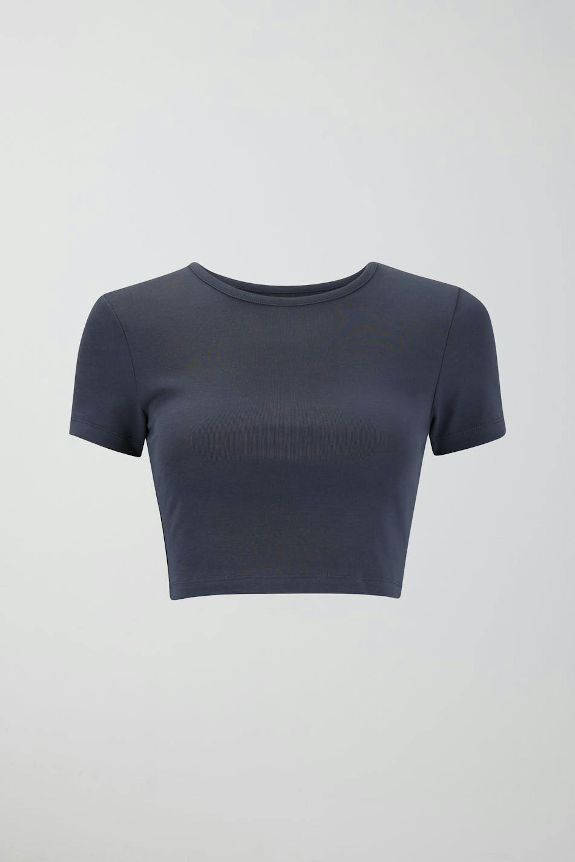 Cropped top with fitted fit. The top is grey and has a ribbed fabric with a crew neckline.