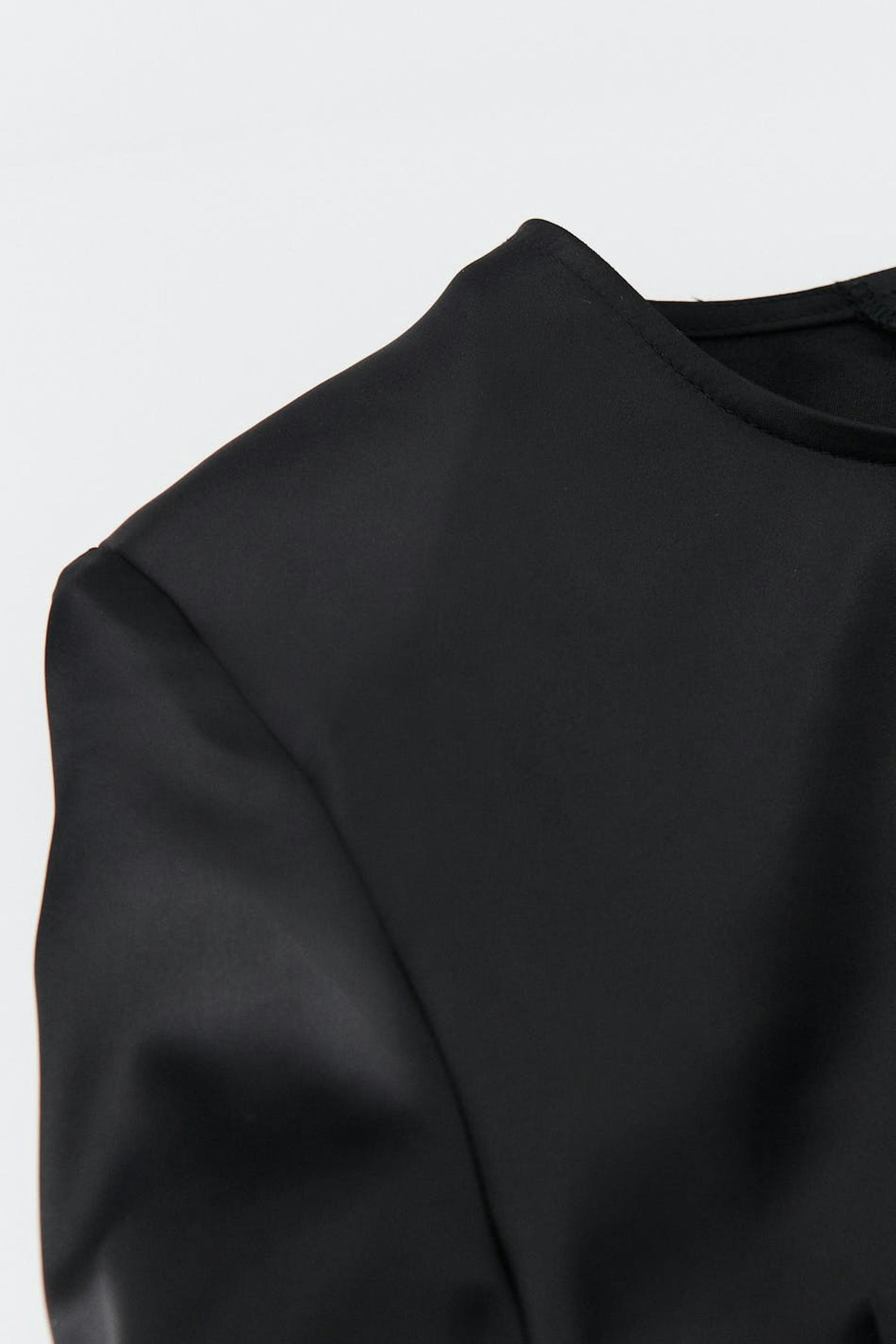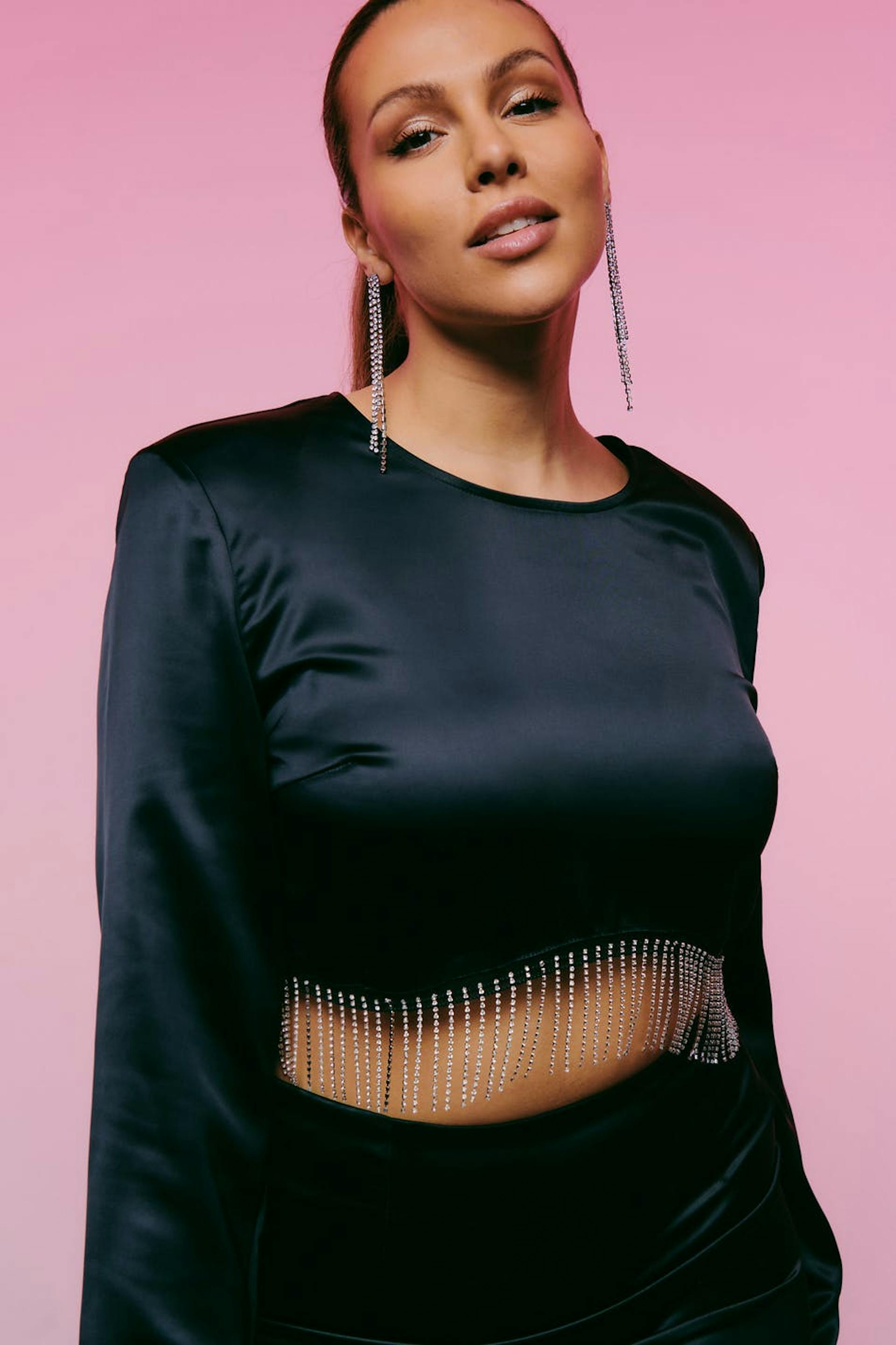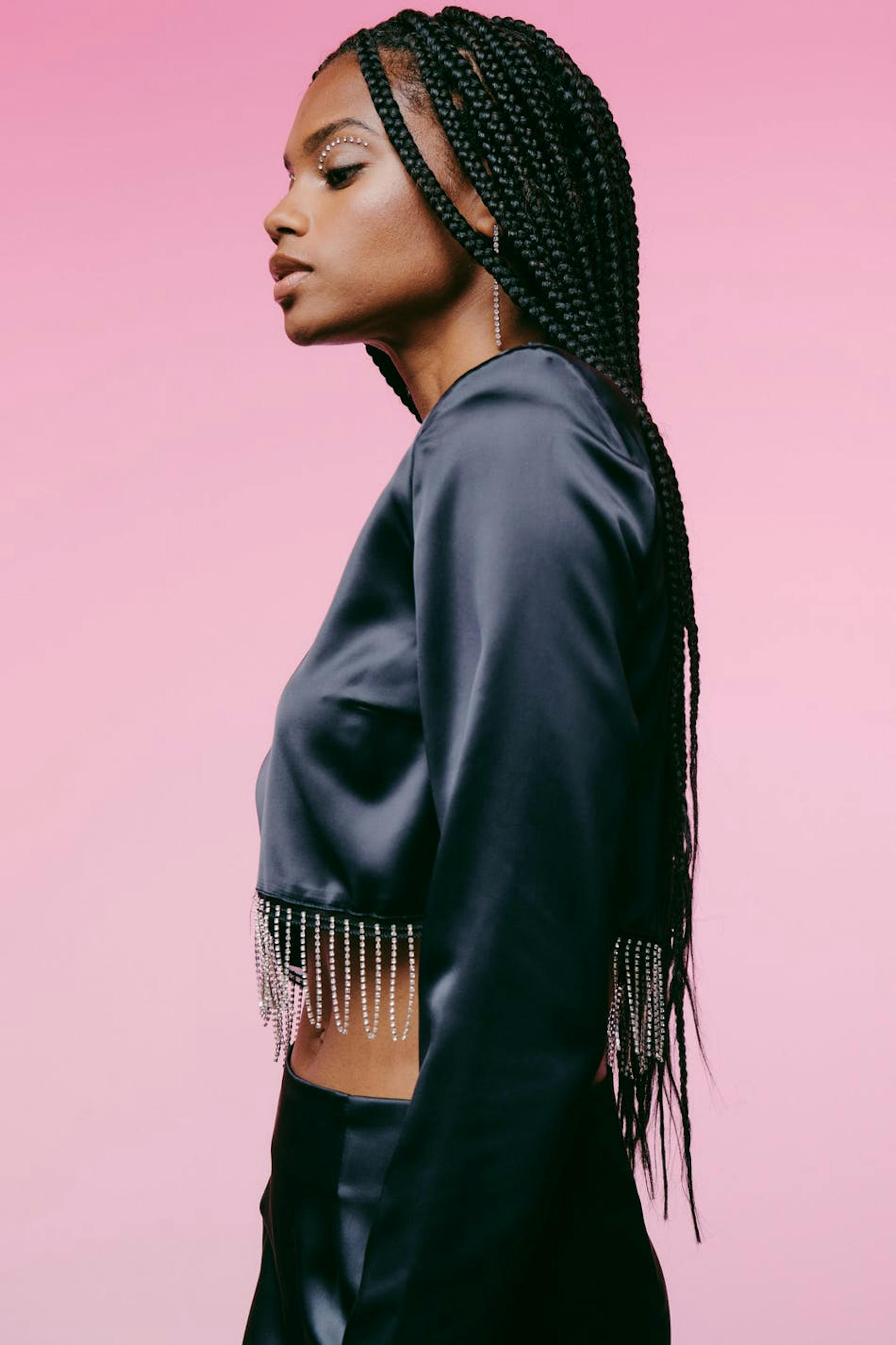 Long-sleeved blouse with shoulder pads. The blouse is black and has rhinestone fringes at hem. It has round neckline, cropped length and button placket in the back.