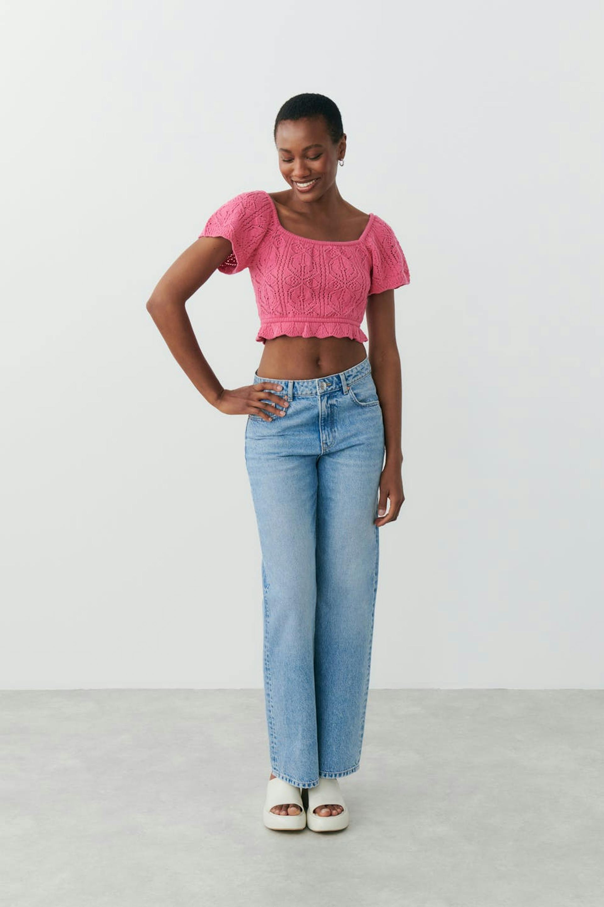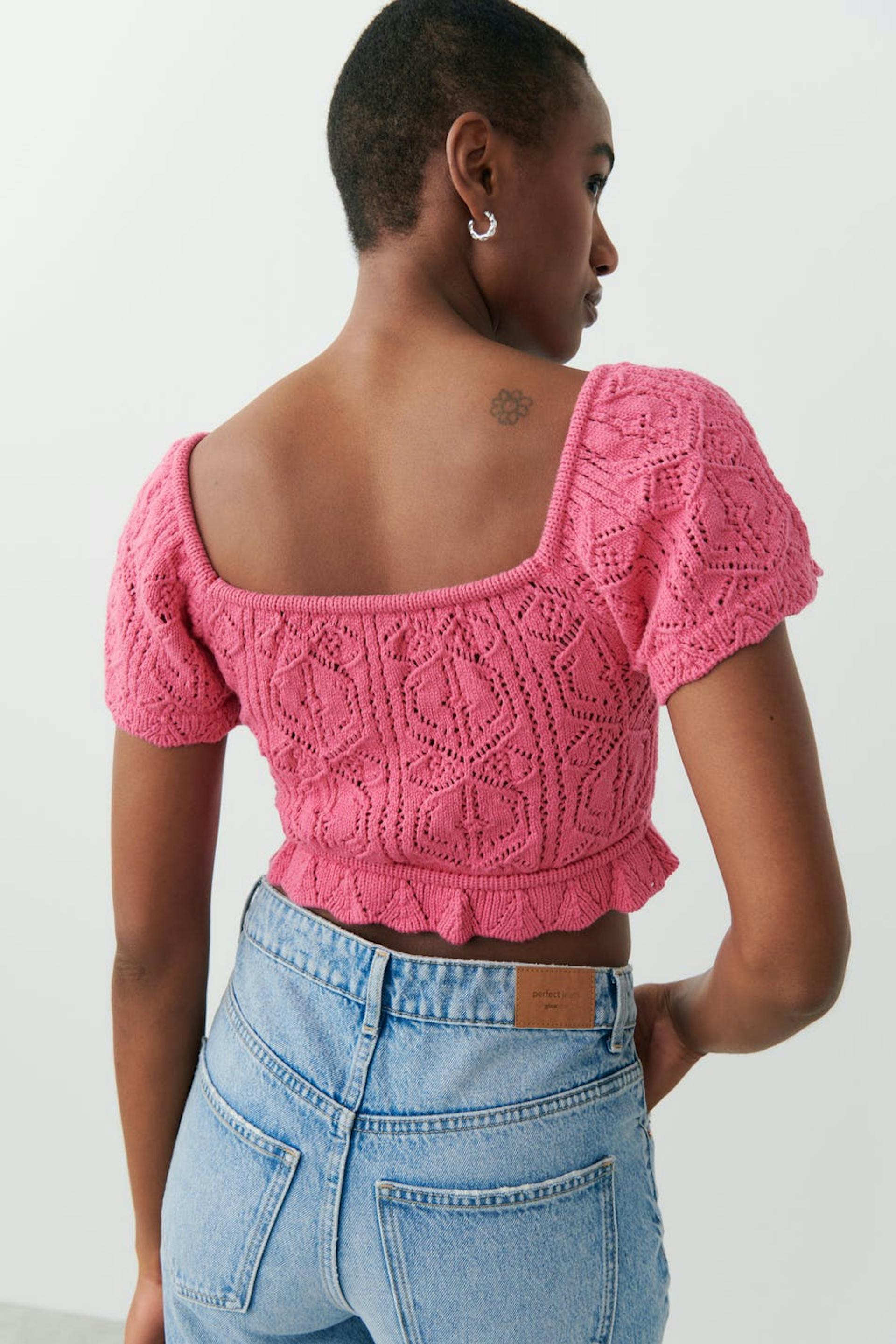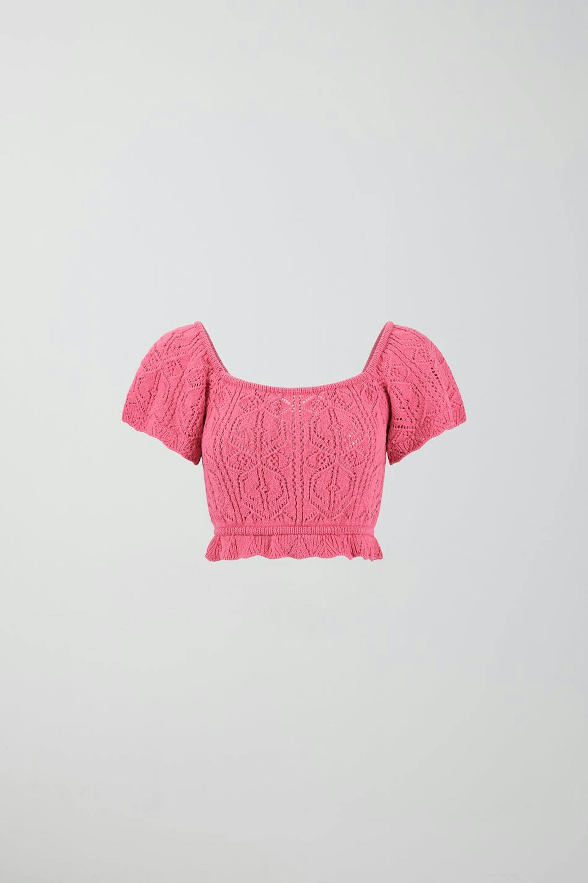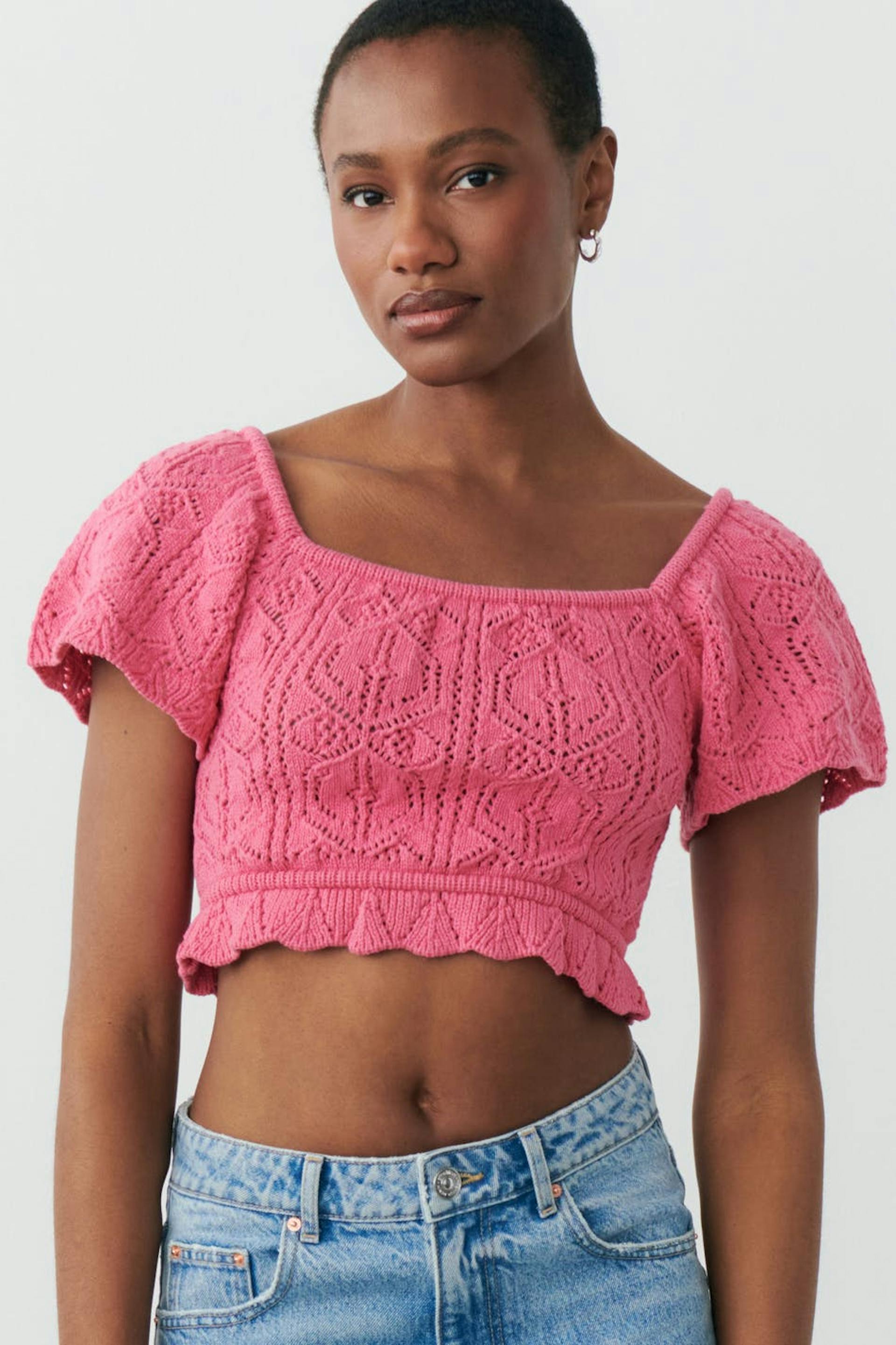 Crocheted crop top with a short sleeve. The crop top is pink and has a square neckline.