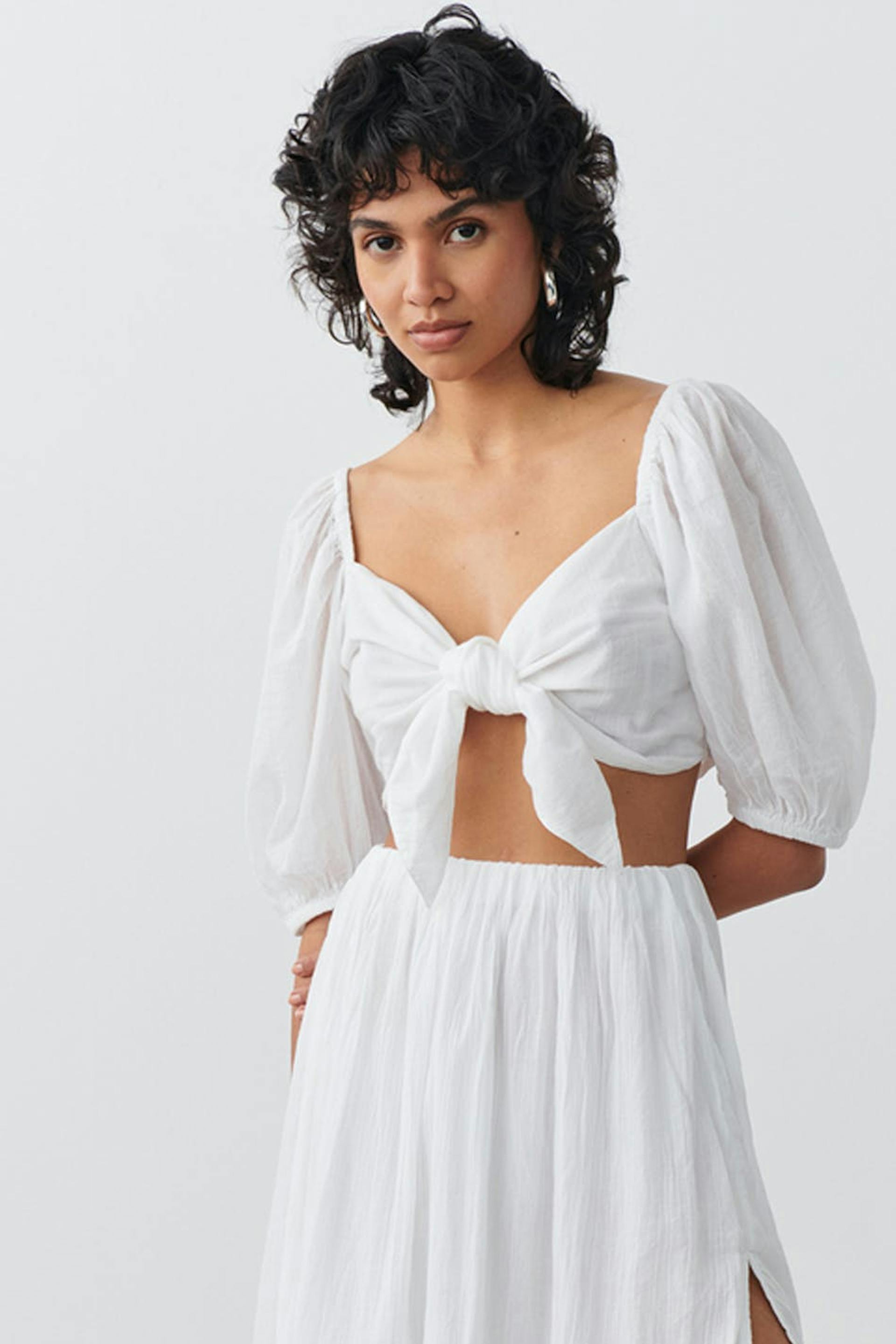 Bohemian top with knot closure at the front. The top is white, cropped and woven. It has short puff sleeve and elastic at sleeve ends and around the shoulders.