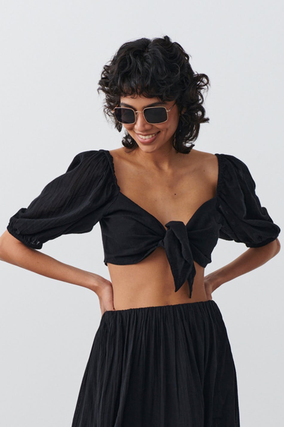 Bohemian top with knot closure at the front. The top is black, cropped and woven. It has short puff sleeve and elastic at sleeve ends and around the shoulders.