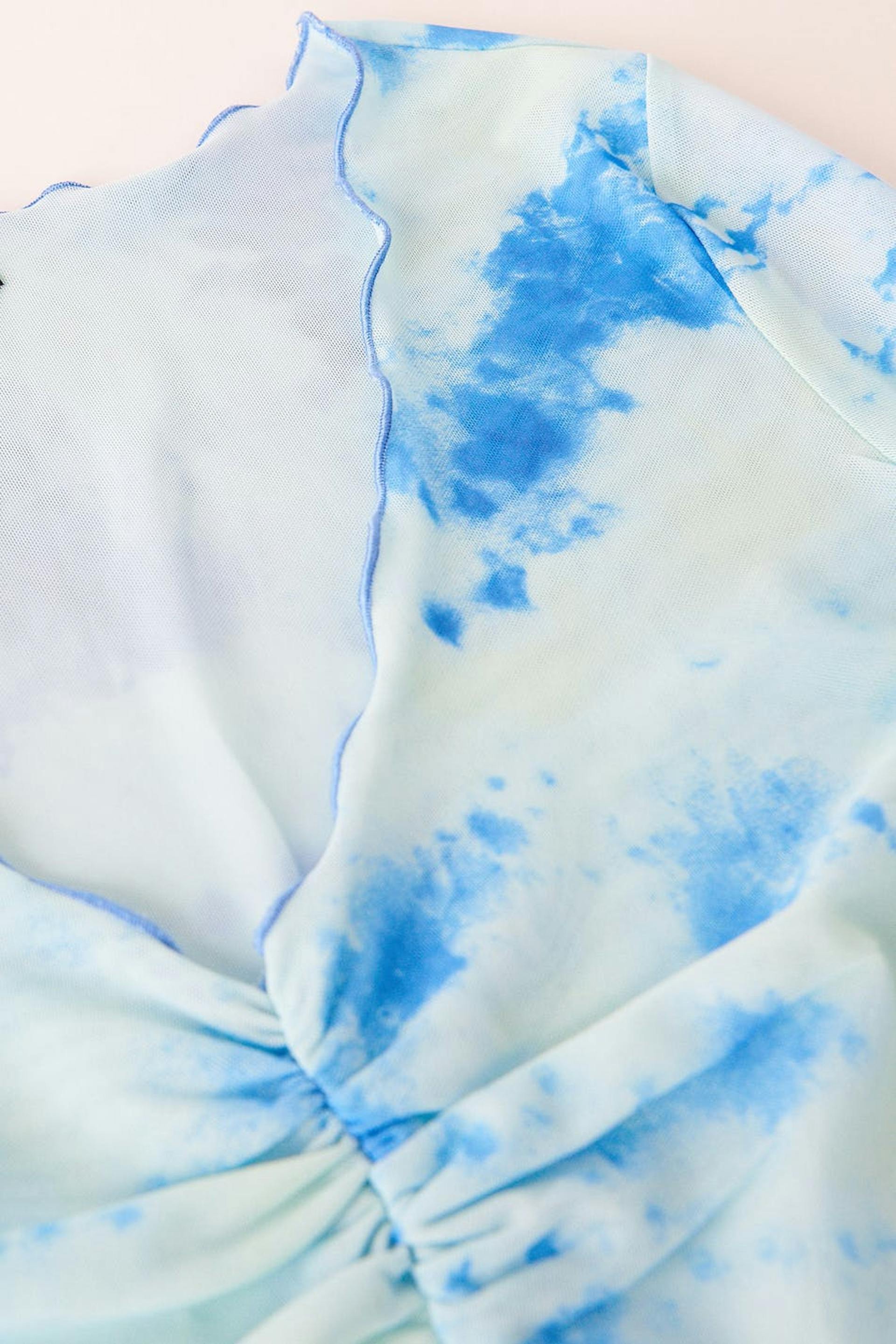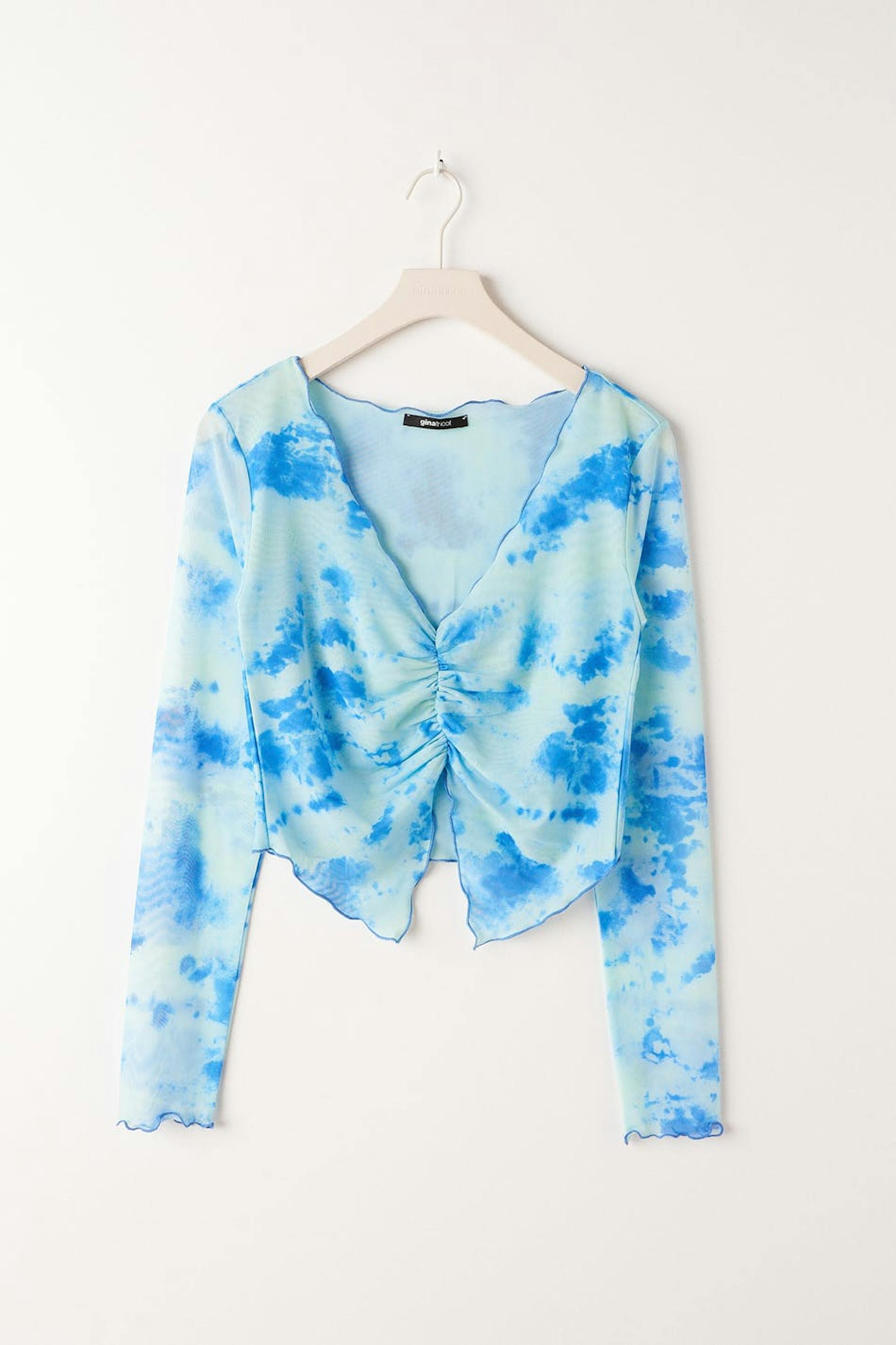 Long-sleeved mesh top with gathered effect at the front. The top is perfect for the party, blue and cropped. It has v neckline, fitted fit and a curly hemline.