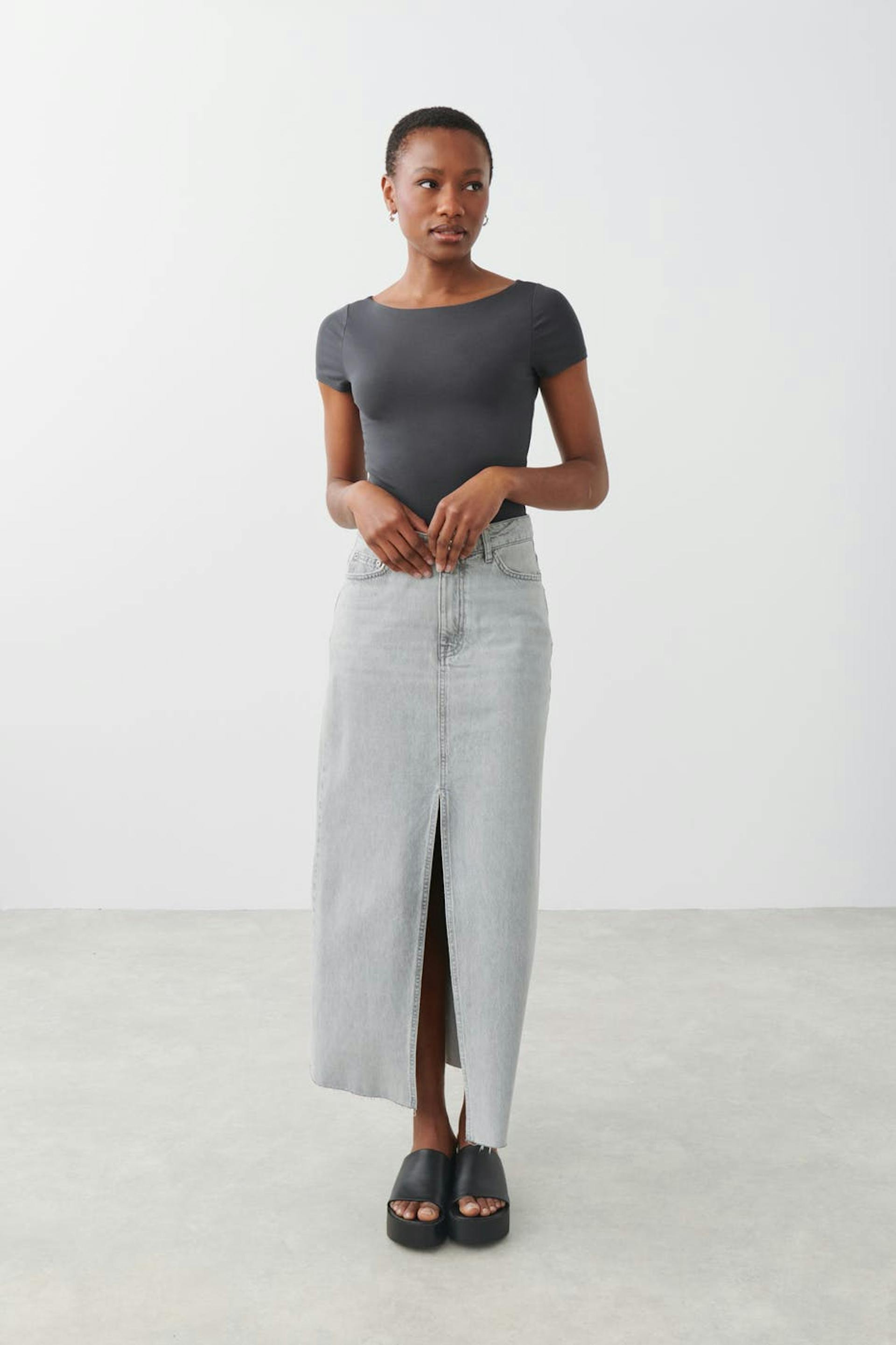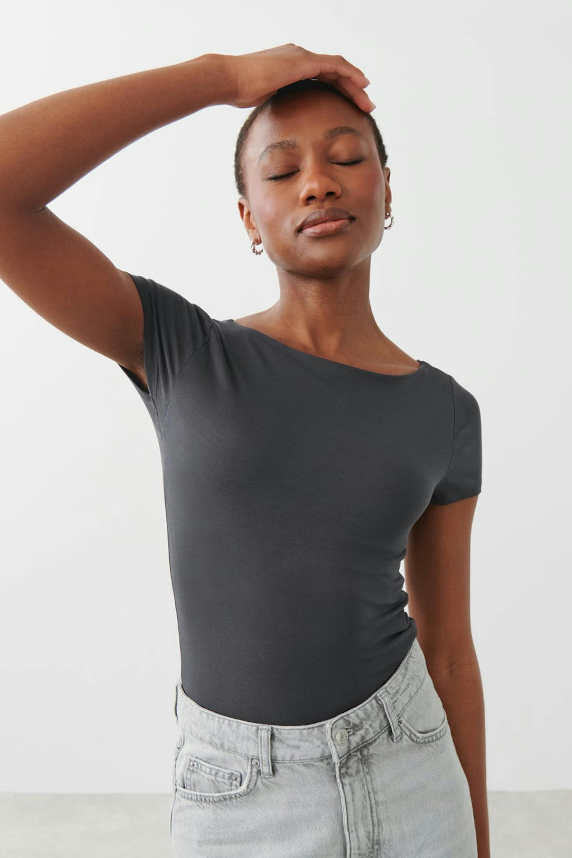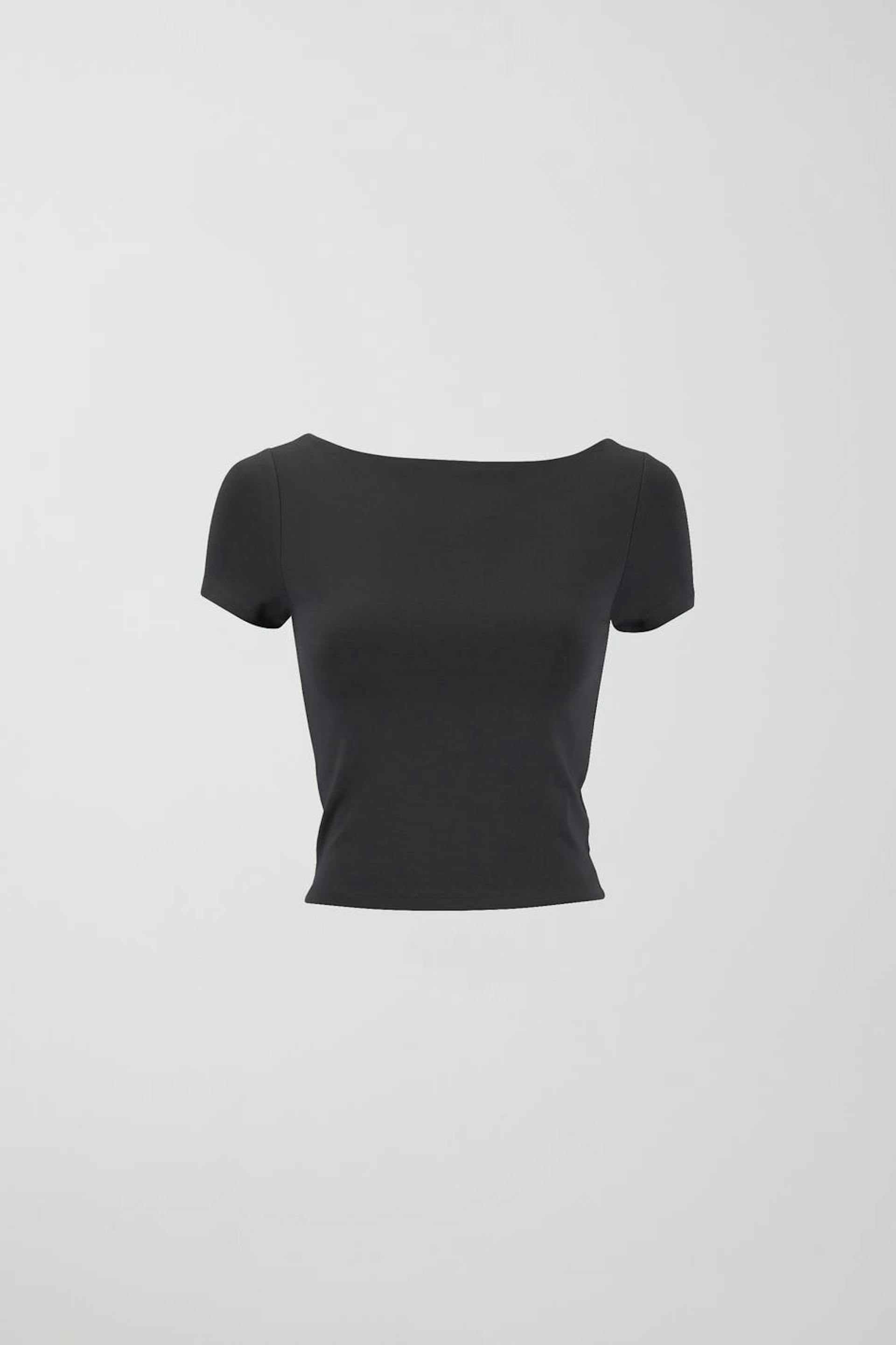 Soft touch – second skin comfort. Short-sleeved top in jersey with boat neckline. The top is grey and has figure-hugging fit with cropped length.